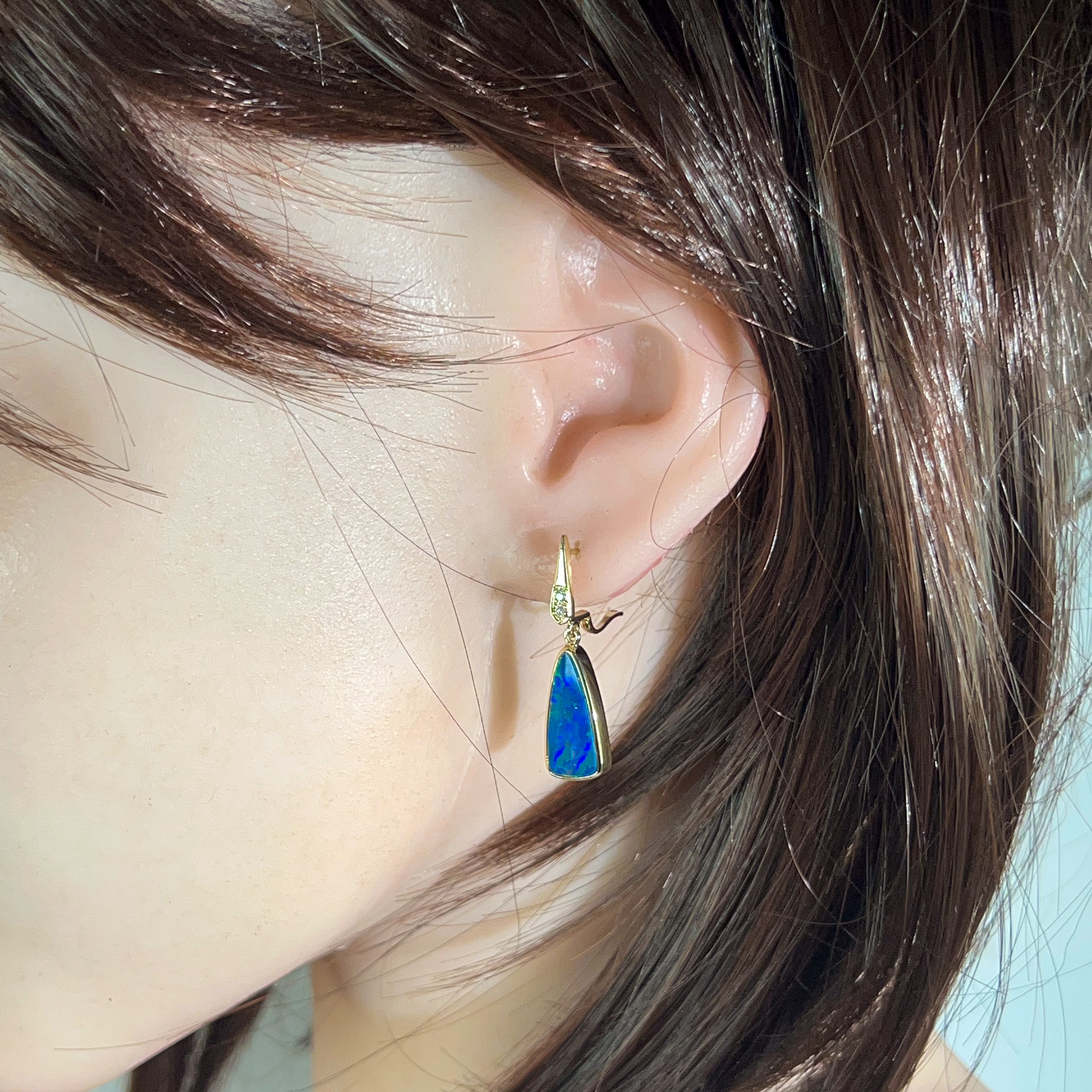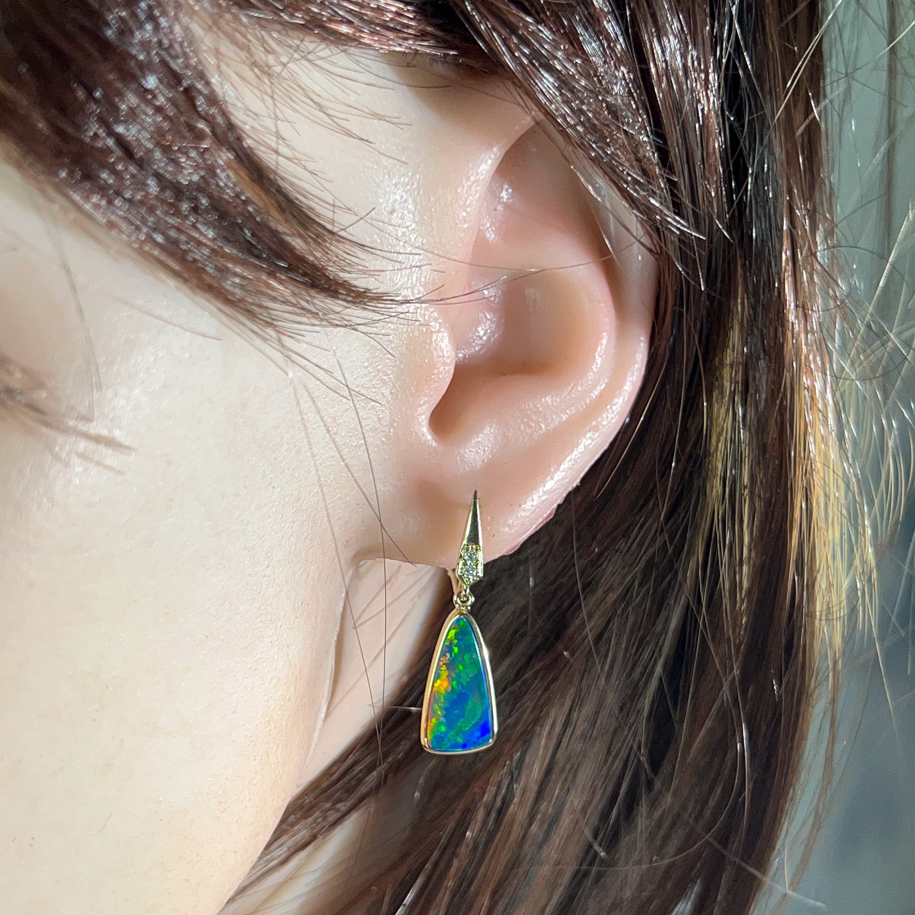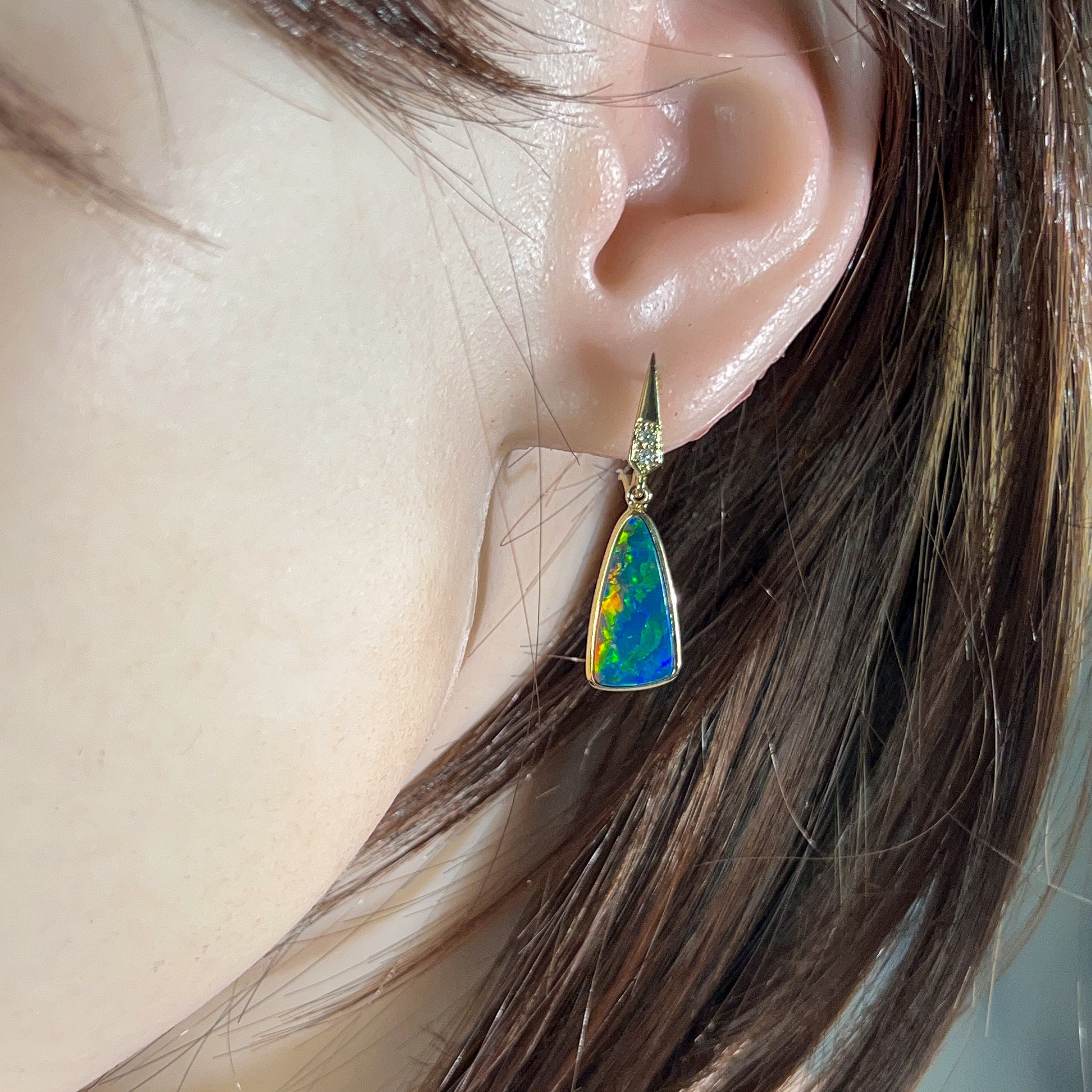 Illuminate your look with these stunning 14kt yellow gold dangling earrings, featuring vibrant opal doublets cut into striking triangular shapes. Each piece captures the full spectrum of opal's natural brilliance—dancing flashes of electric blues, fiery reds, lush greens, and golden yellows that shift and shimmer with every movement. The warm glow of 14kt yellow gold perfectly complements the stone's radiant colours, creating an eye-catching contrast that draws admiration. These lightweight dangles move gracefully, ensuring the opal's mesmerising colour play is constantly on display. Perfect for those who crave jewellery that makes a bold statement and celebrates the raw beauty of nature's most colourful gemstone. An investment piece that transforms any outfit into something truly extraordinary.
