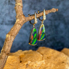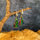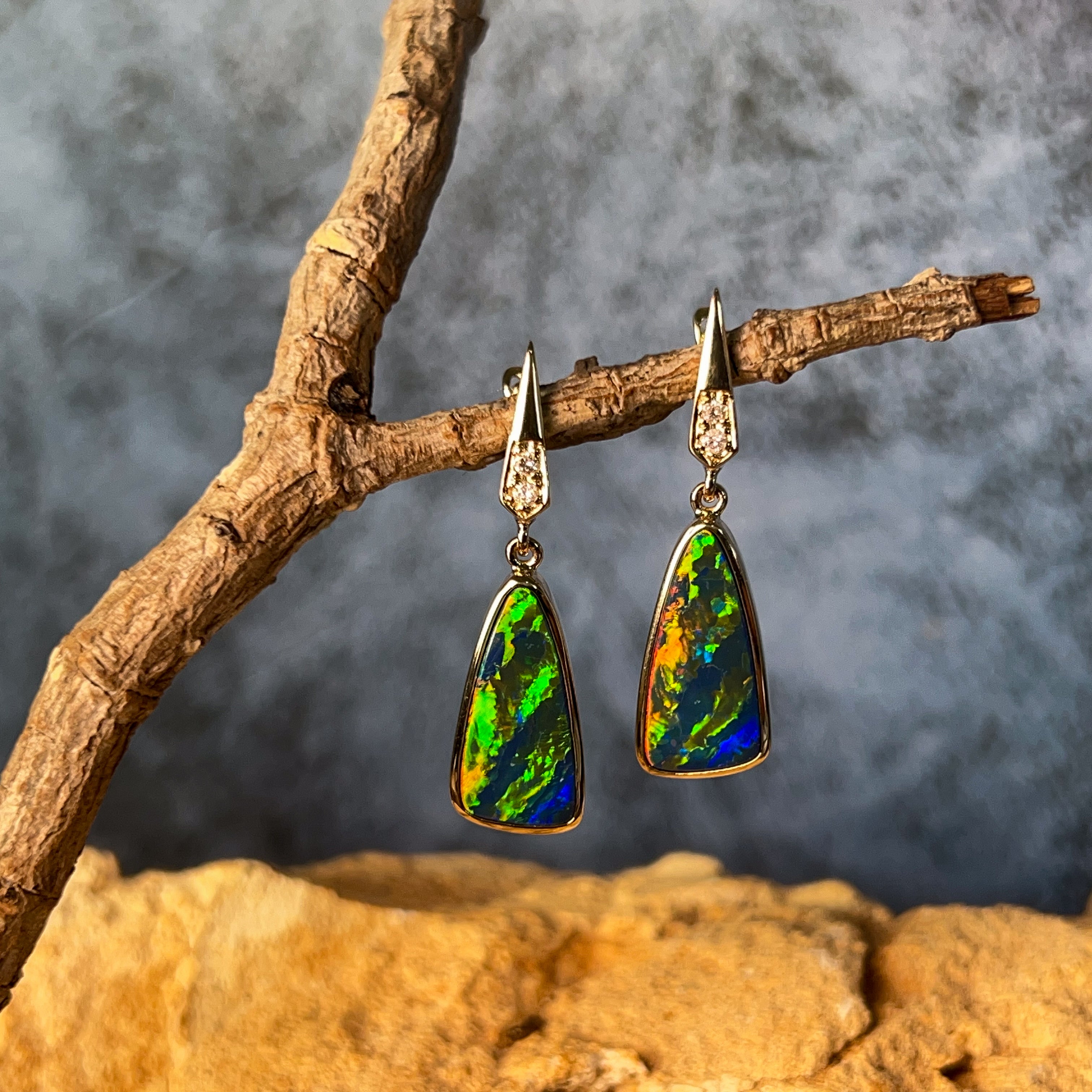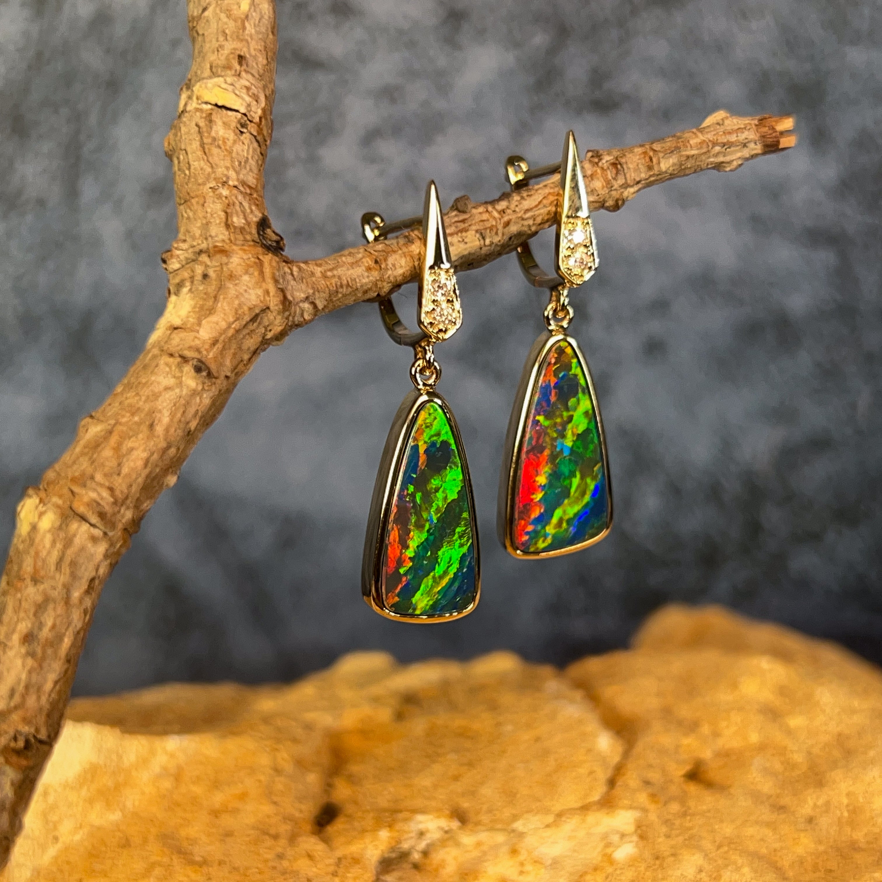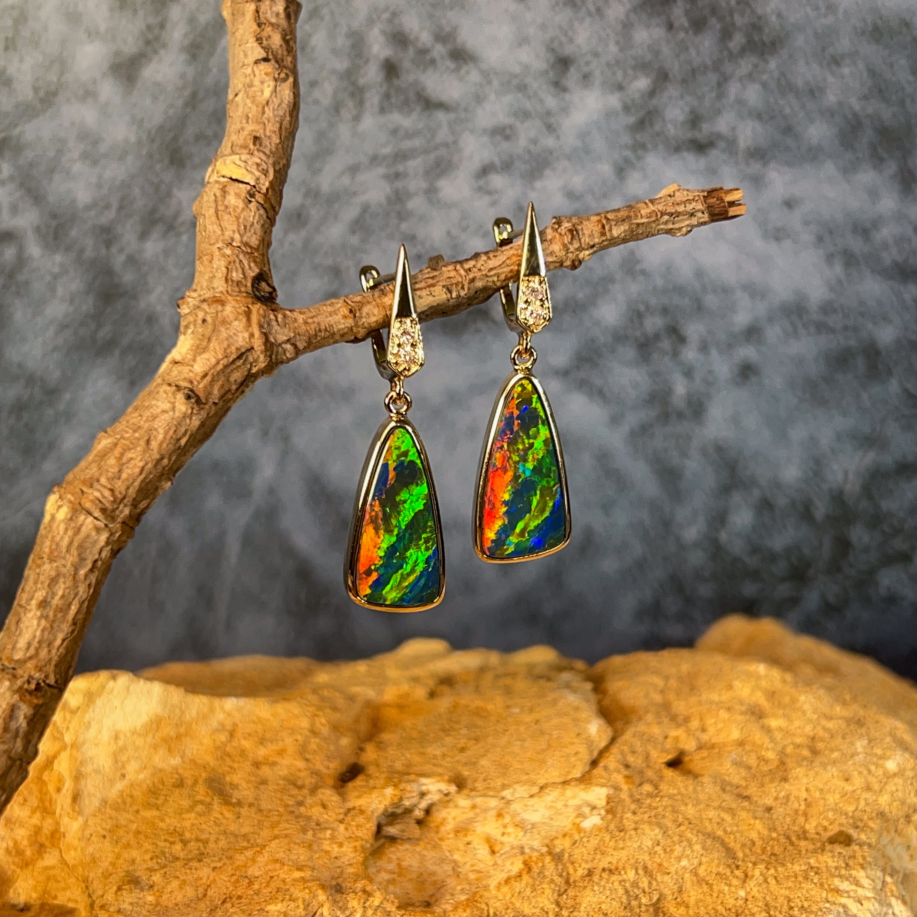 Illuminate your look with these stunning 14kt yellow gold dangling earrings, featuring vibrant opal doublets cut into striking triangular shapes. Each piece captures the full spectrum of opal's natural brilliance—dancing flashes of electric blues, fiery reds, lush greens, and golden yellows that shift and shimmer with every movement. The warm glow of 14kt yellow gold perfectly complements the stone's radiant colours, creating an eye-catching contrast that draws admiration. These lightweight dangles move gracefully, ensuring the opal's mesmerising colour play is constantly on display. Perfect for those who crave jewellery that makes a bold statement and celebrates the raw beauty of nature's most colourful gemstone. An investment piece that transforms any outfit into something truly extraordinary.