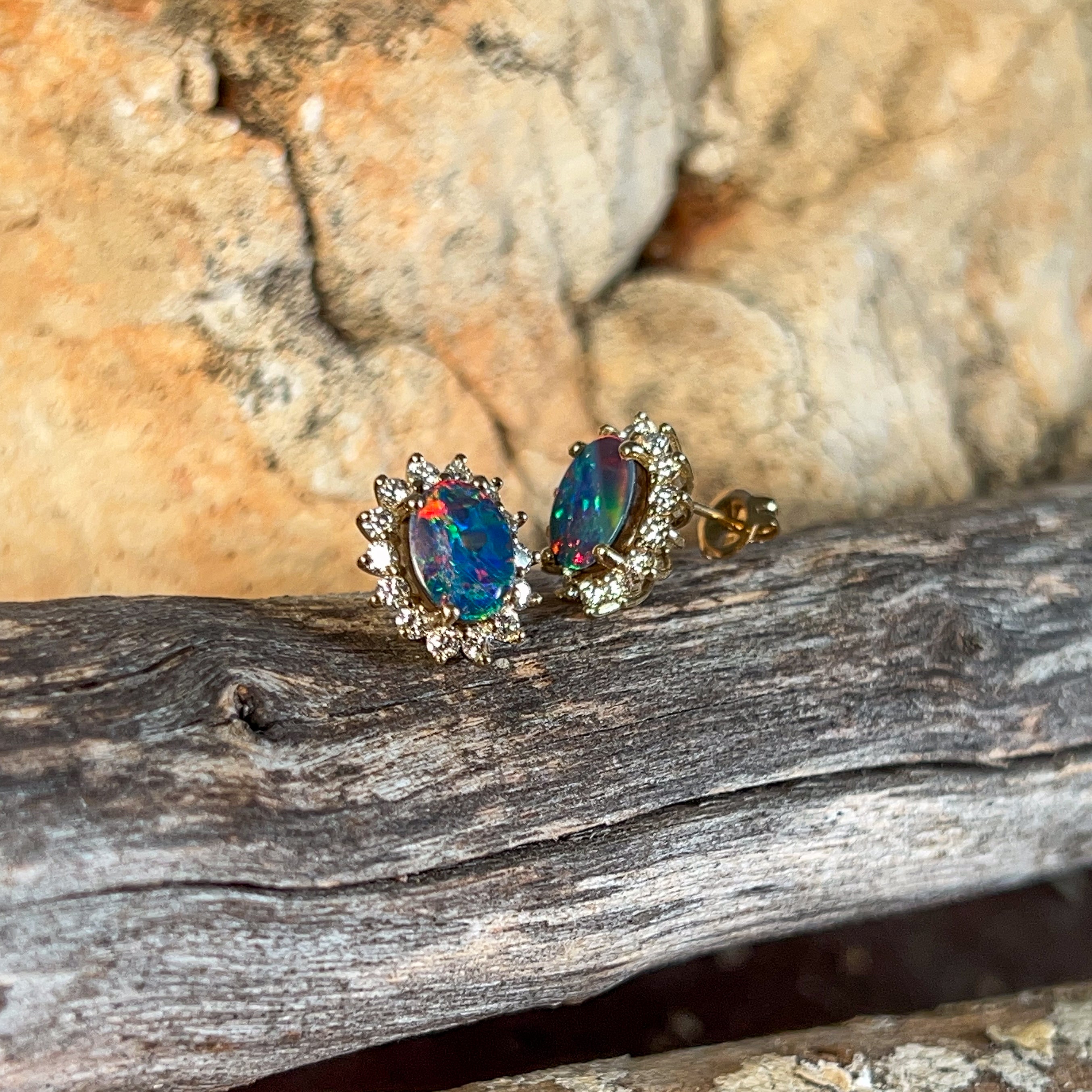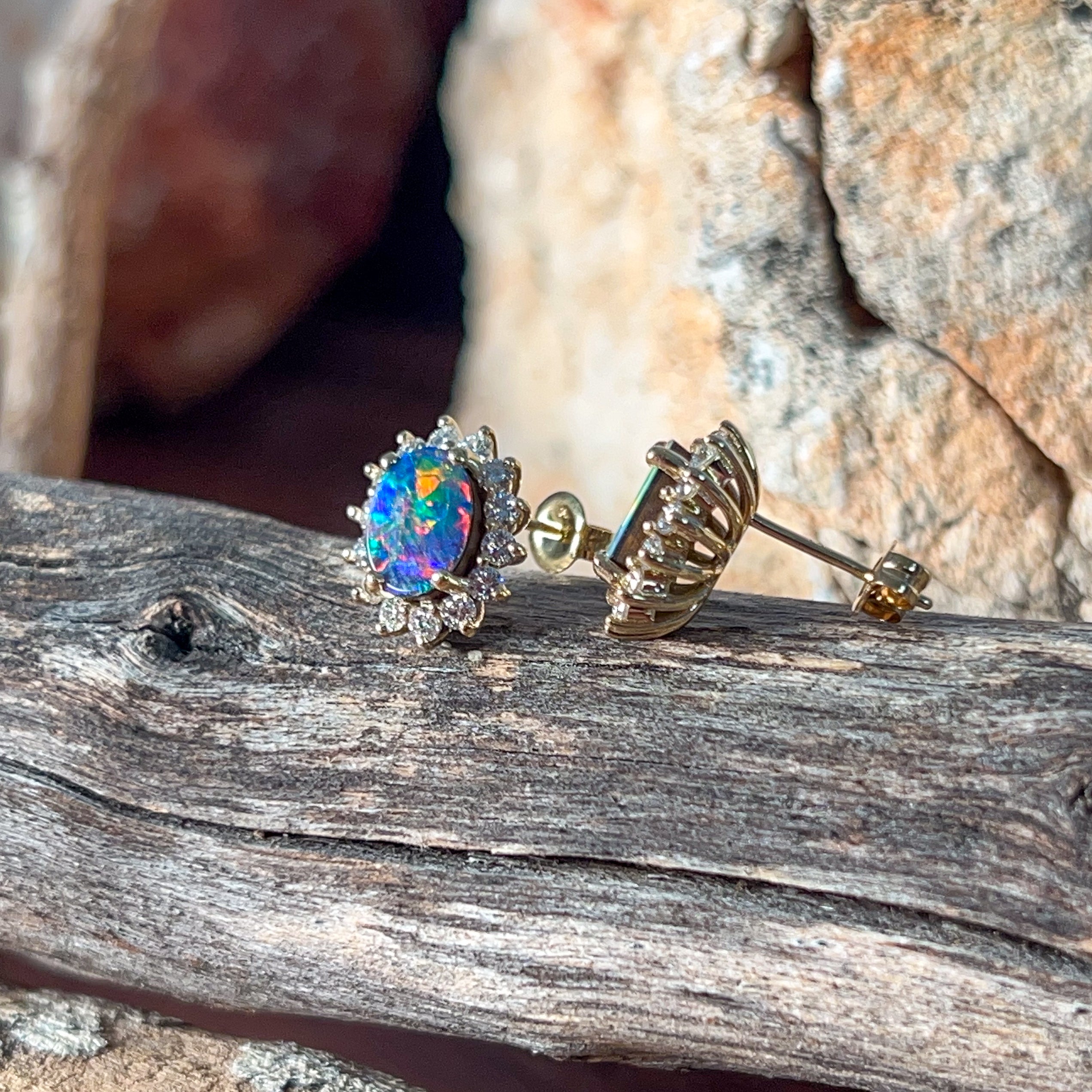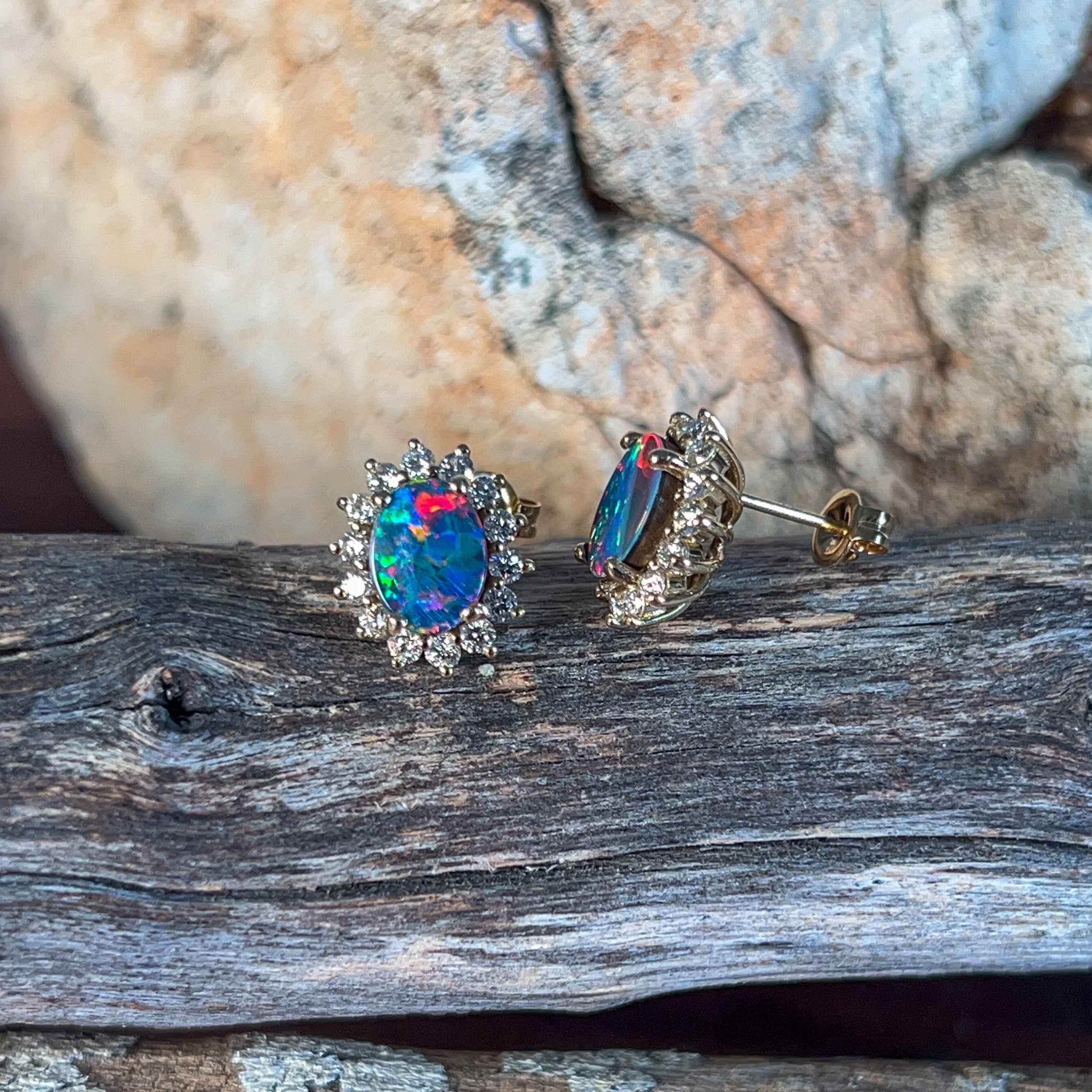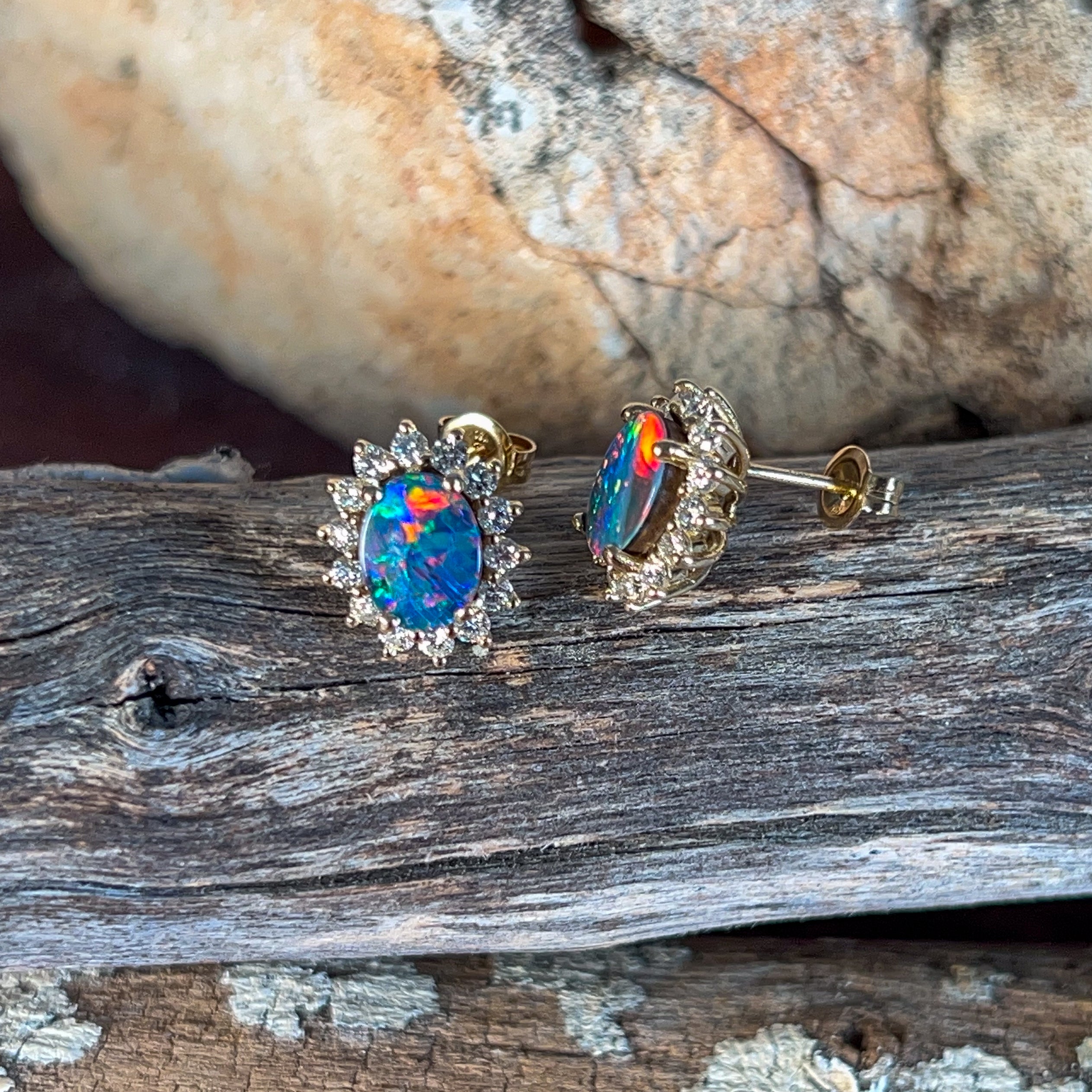 18kt Yellow Gold Opal and diamond cluster earring studs