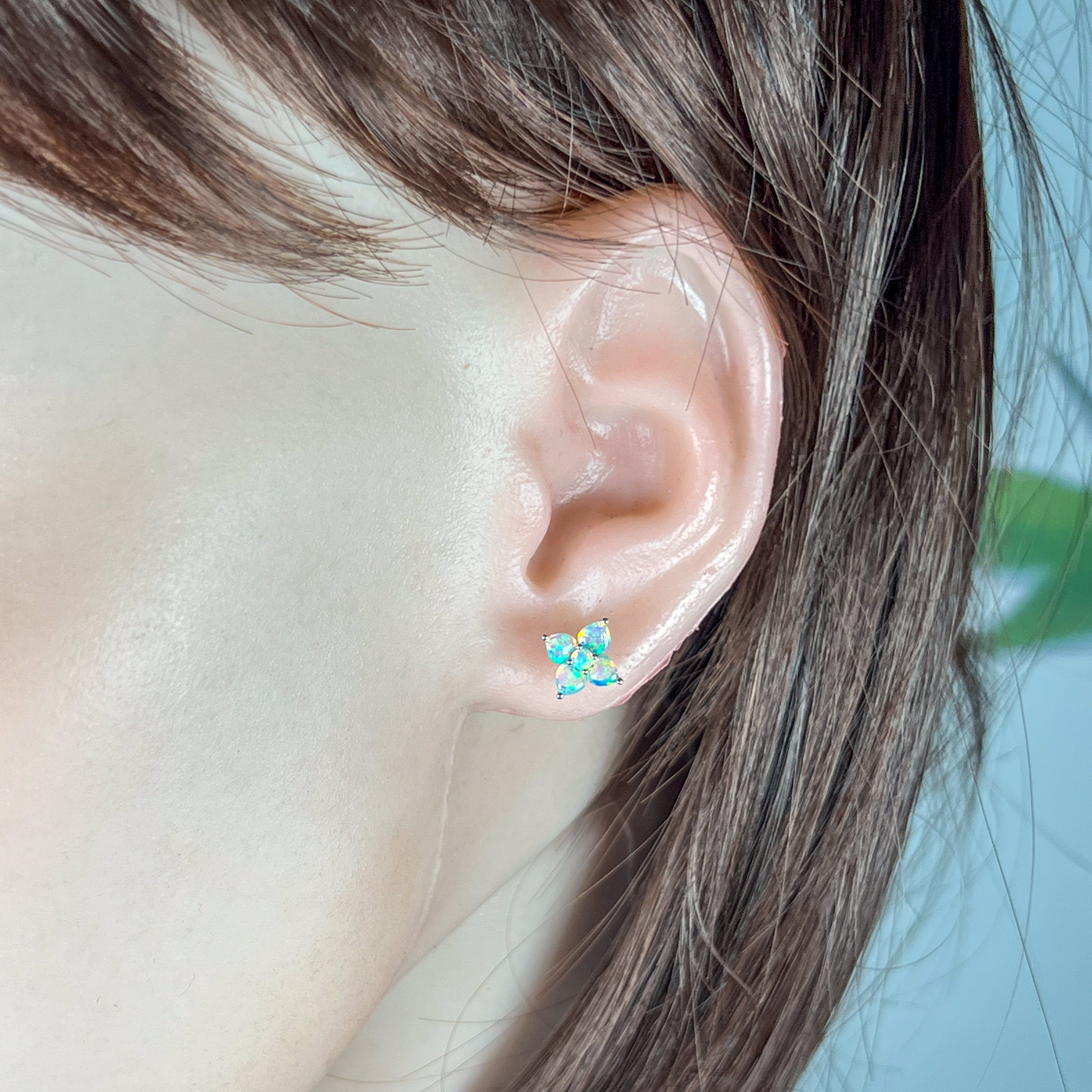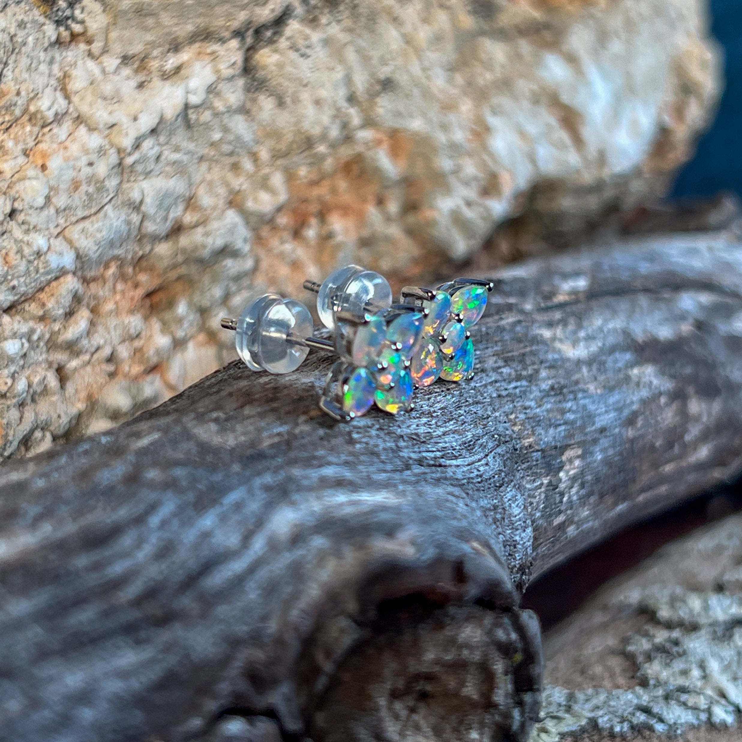Delicate white gold frames showcase the mesmerising play of colour within genuine opals, creating an understated elegance that complements any look. These dainty floral studs bring a touch of natural beauty to your everyday style, whether you're dressing up for a special occasion or adding sophistication to casual wear. Crafted in 9kt white gold, they're designed to be cherished for years to come. Perfect for opal lovers seeking jewellery that whispers rather than shouts.