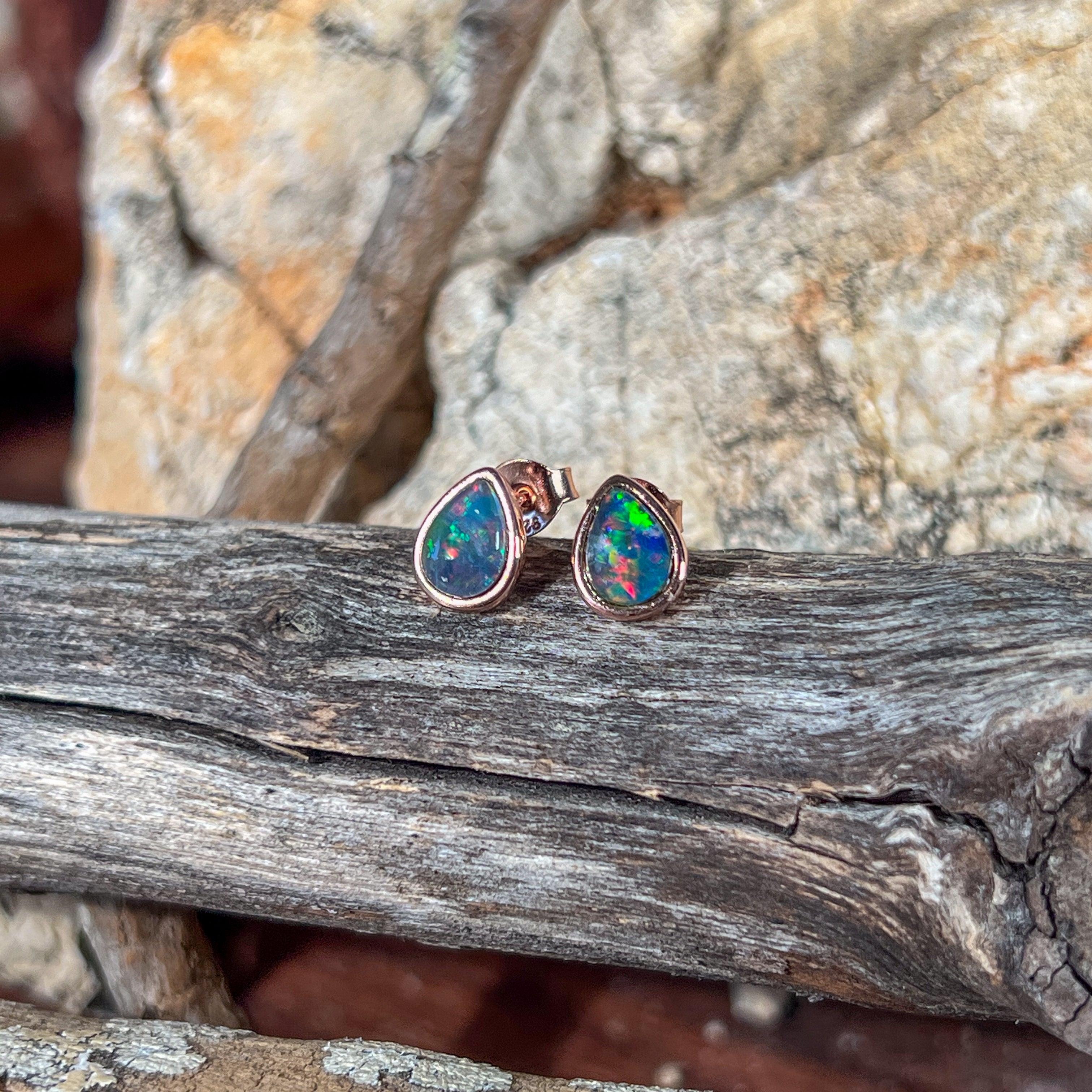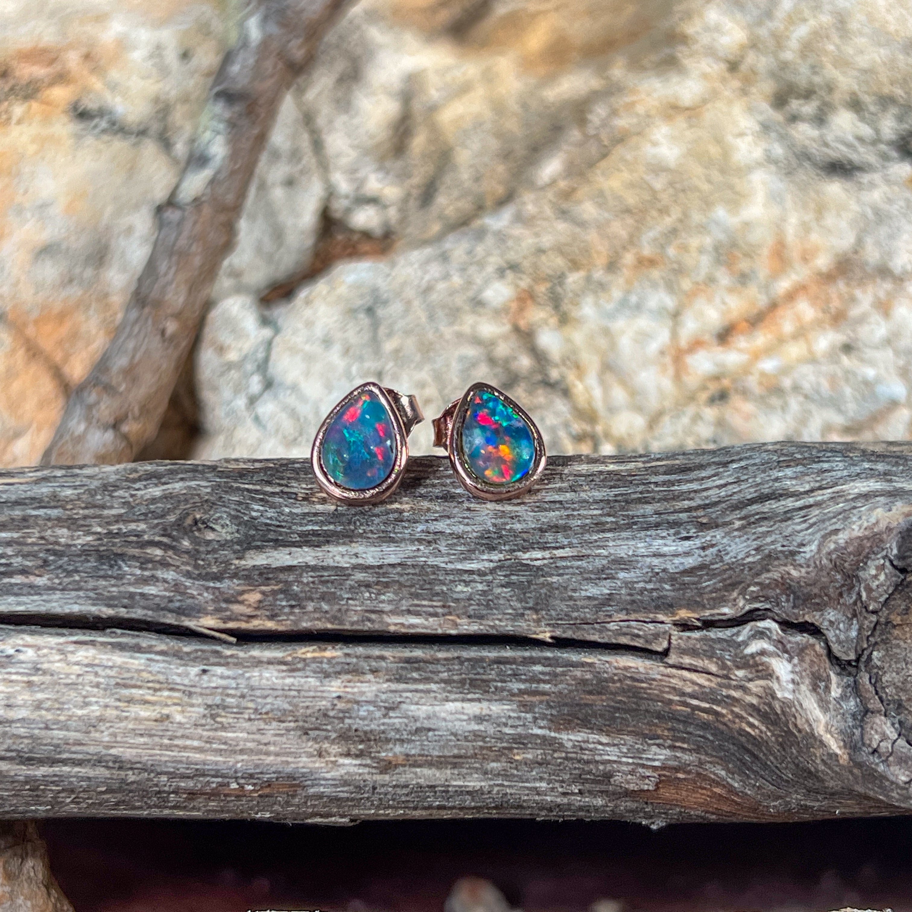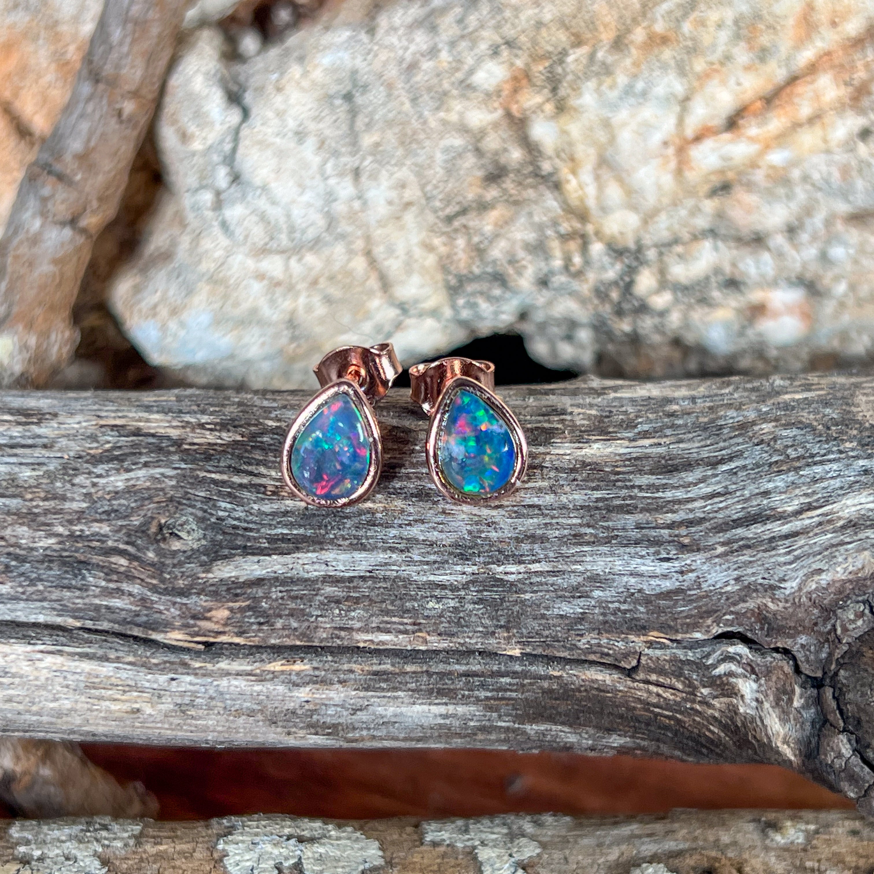 Rose Gold plated 8x5mm Opal Triplet pear shape bezel studs