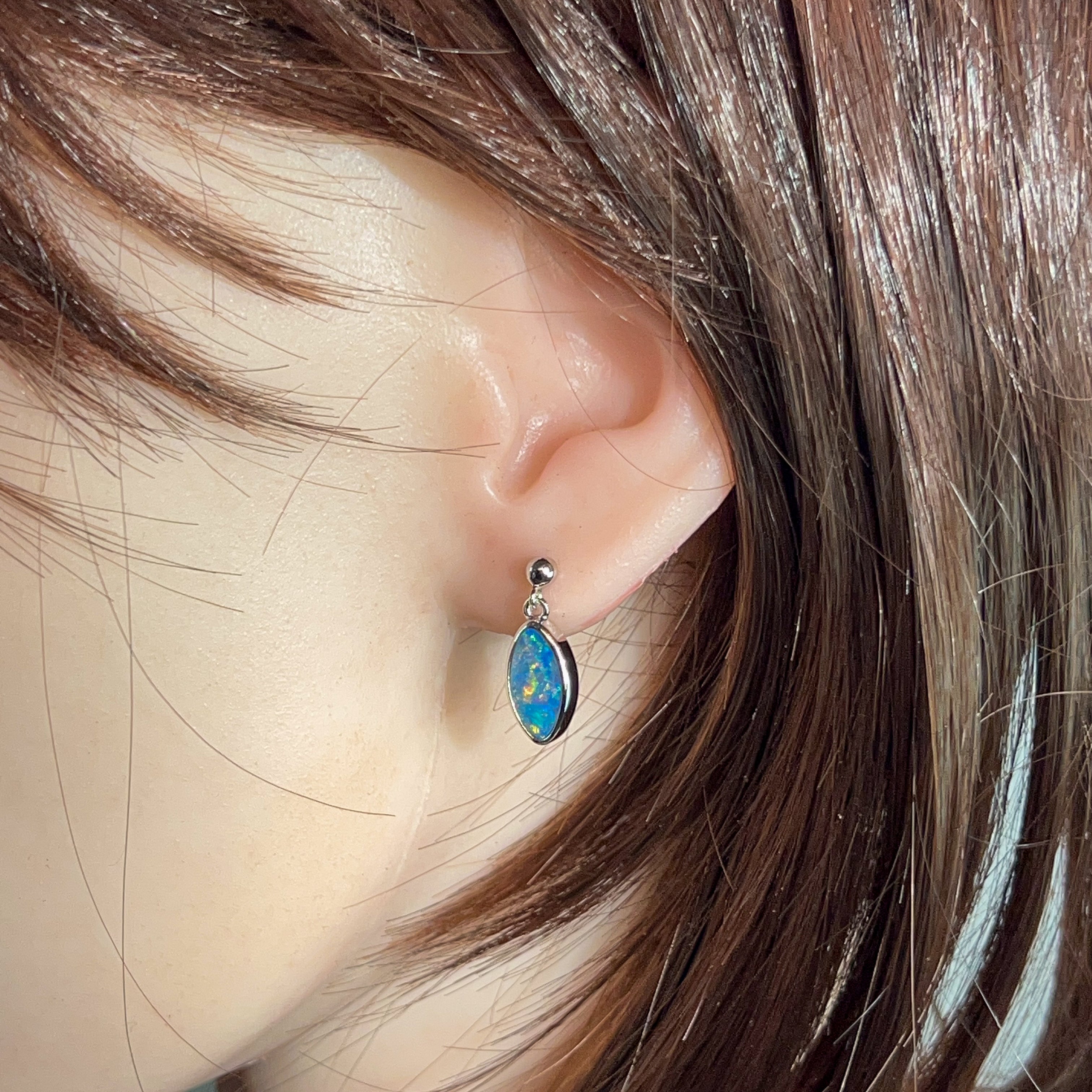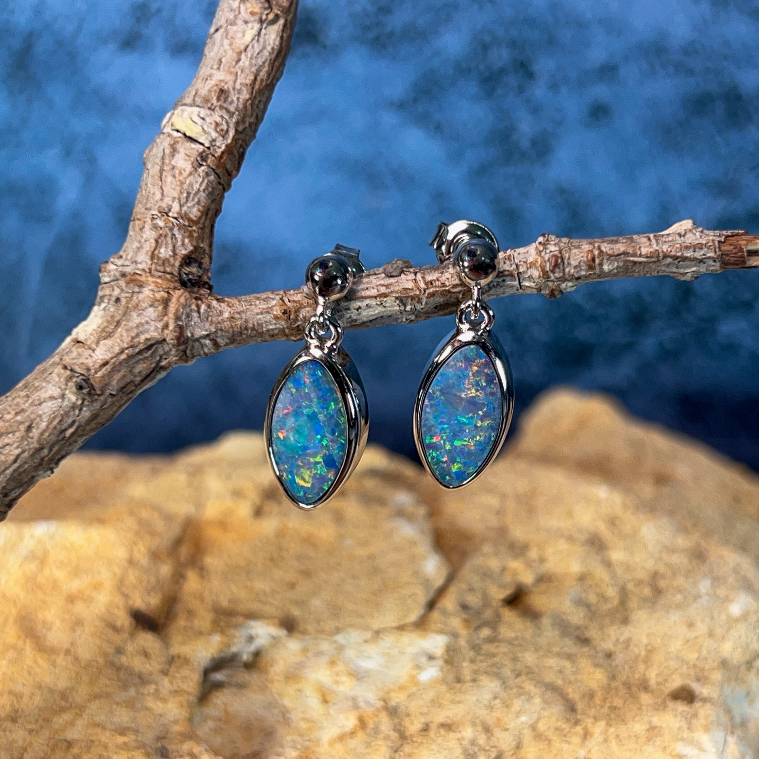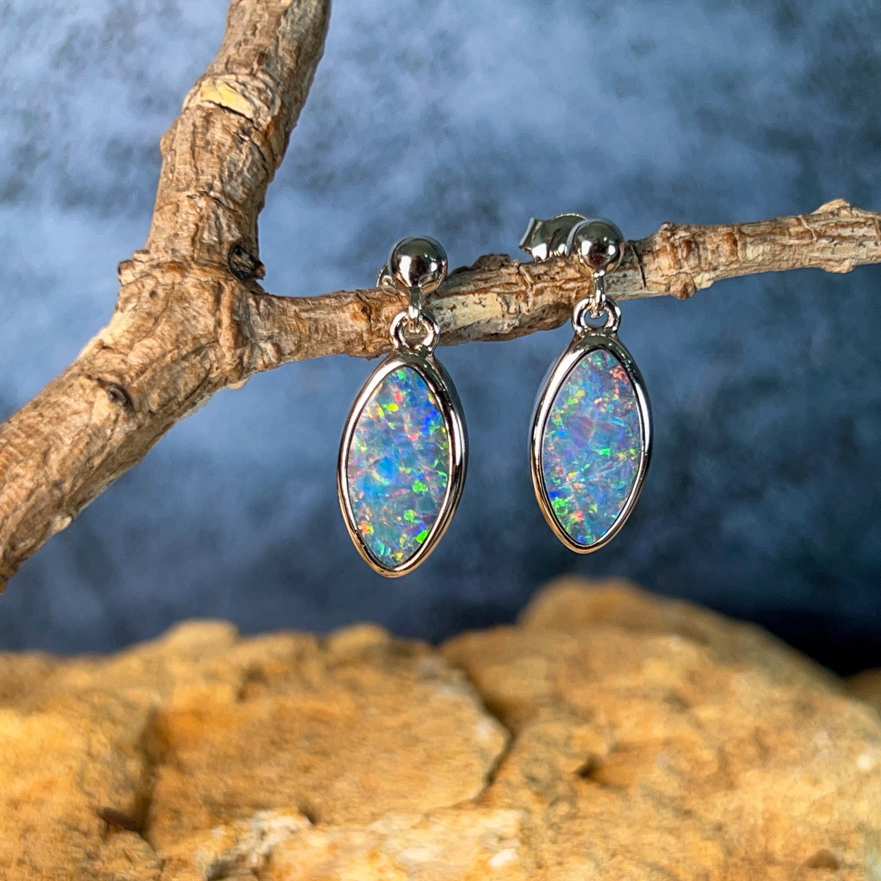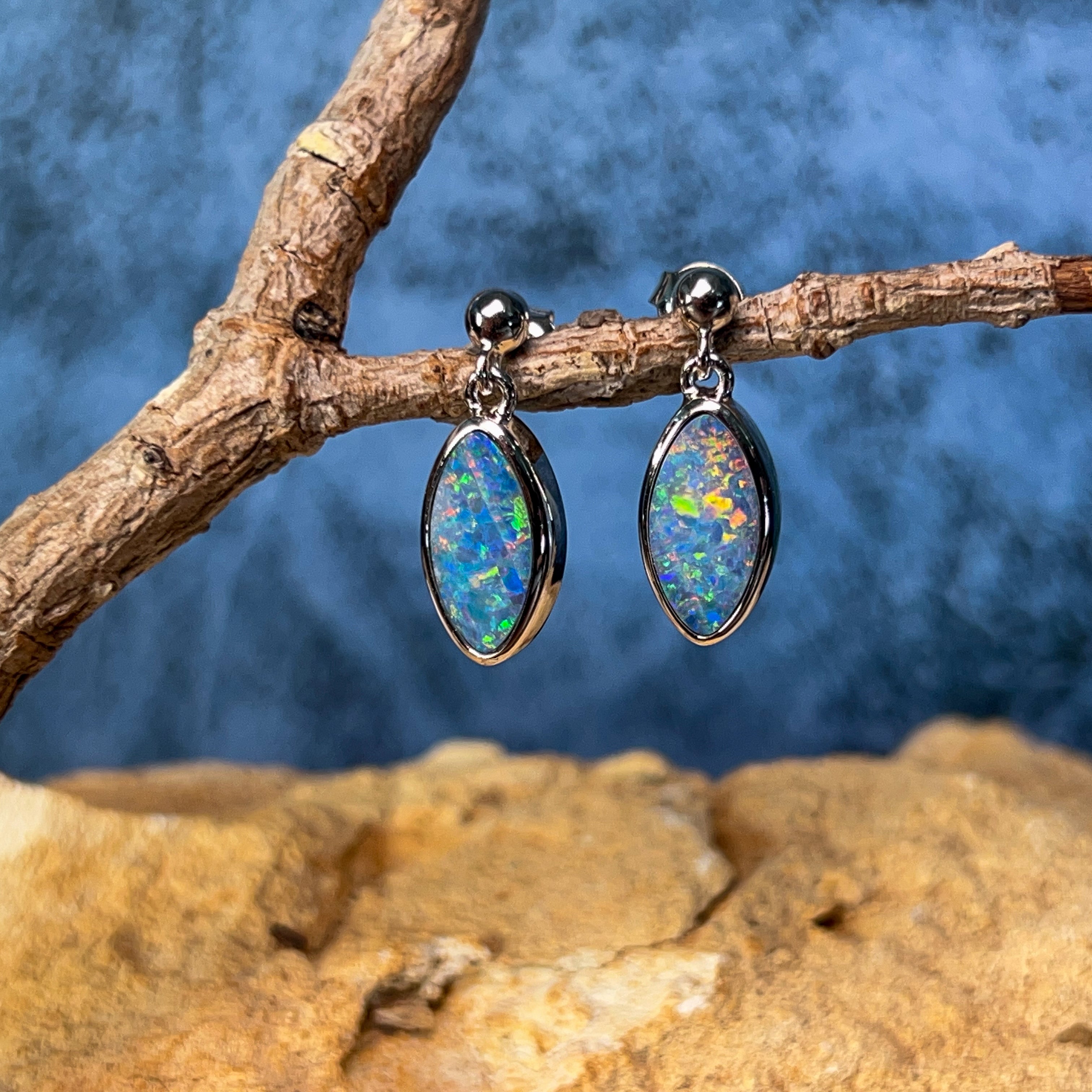 Elegant marquise-shaped opal doublets catch the light with every movement in these sterling silver dangling studs. At 3.35 carats, these earrings deliver sophisticated sparkle without overwhelming your look. The delicate drop design frames the face beautifully while remaining comfortable for everyday wear. Perfect for adding a touch of refined colour to any outfit.