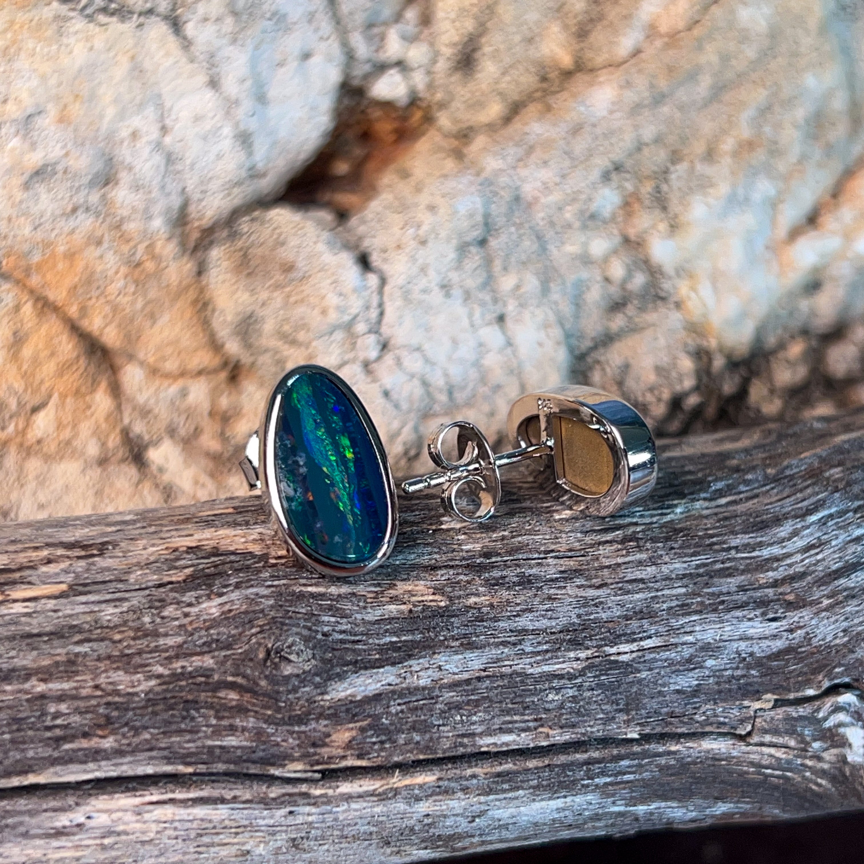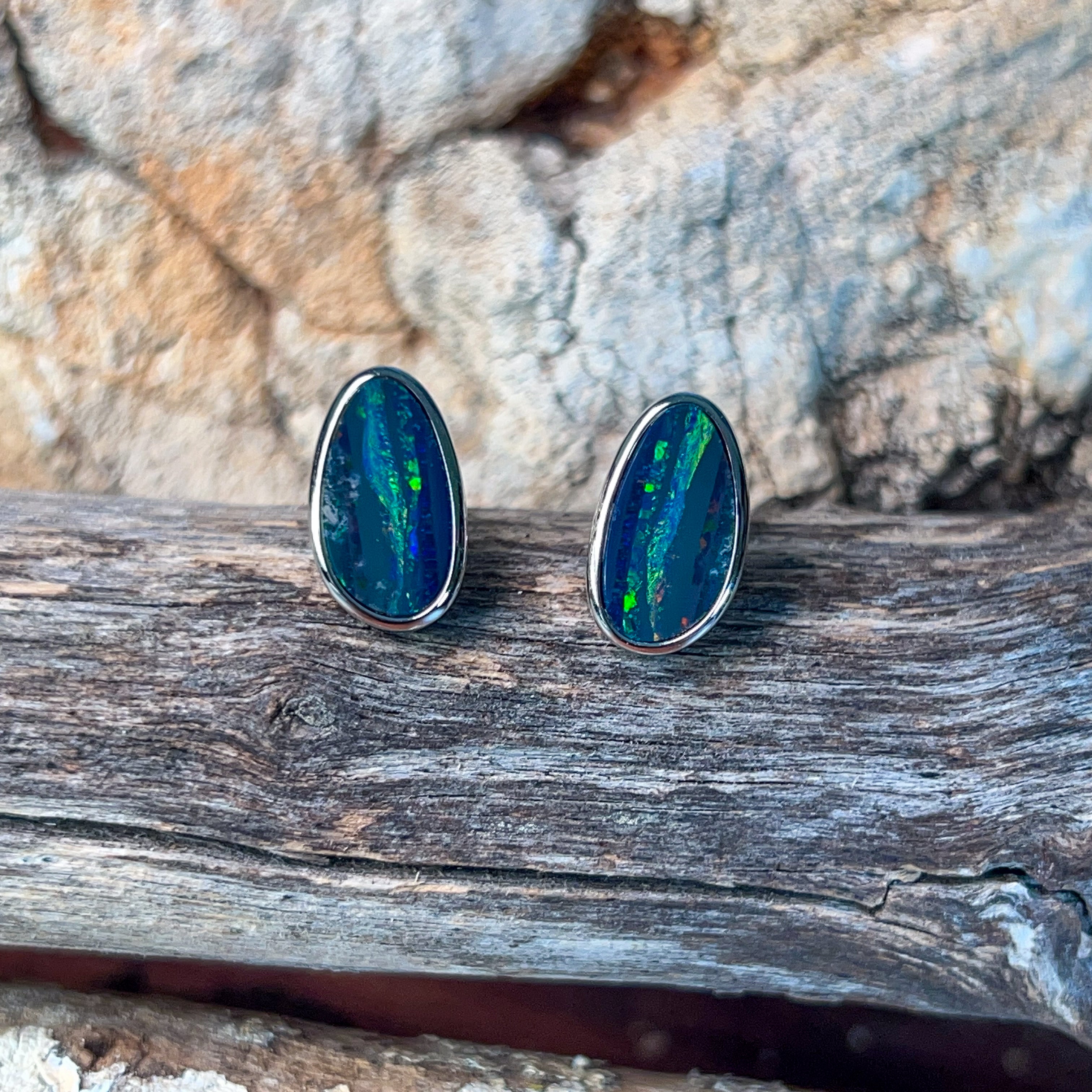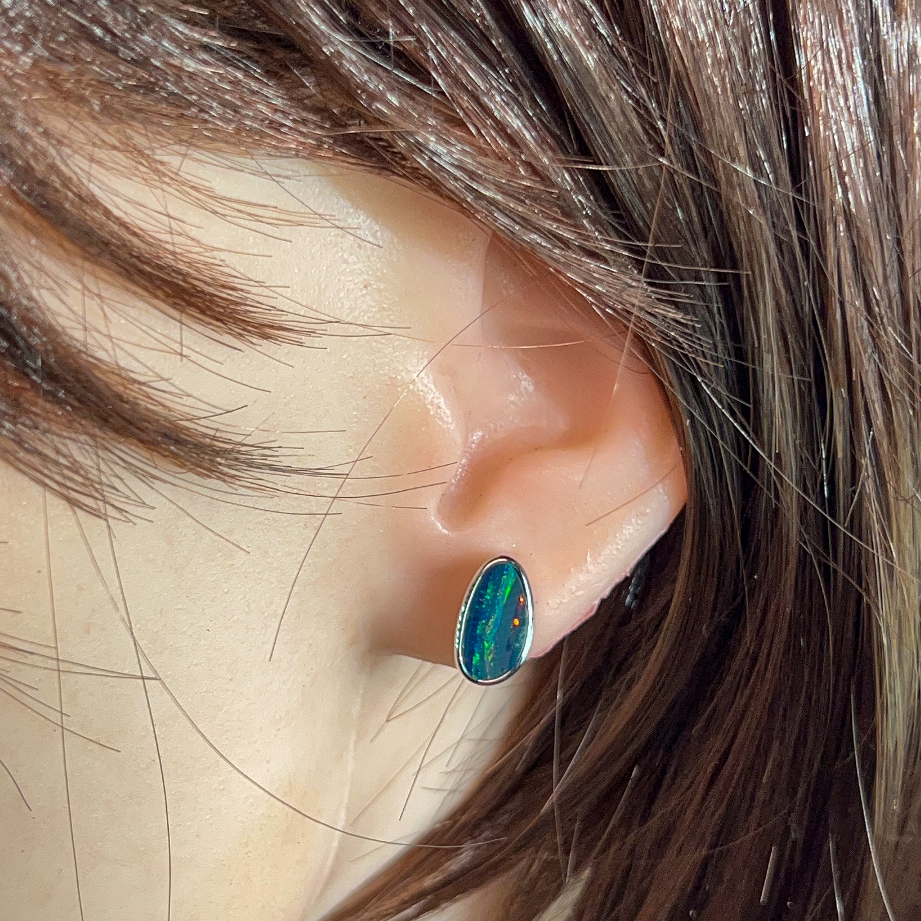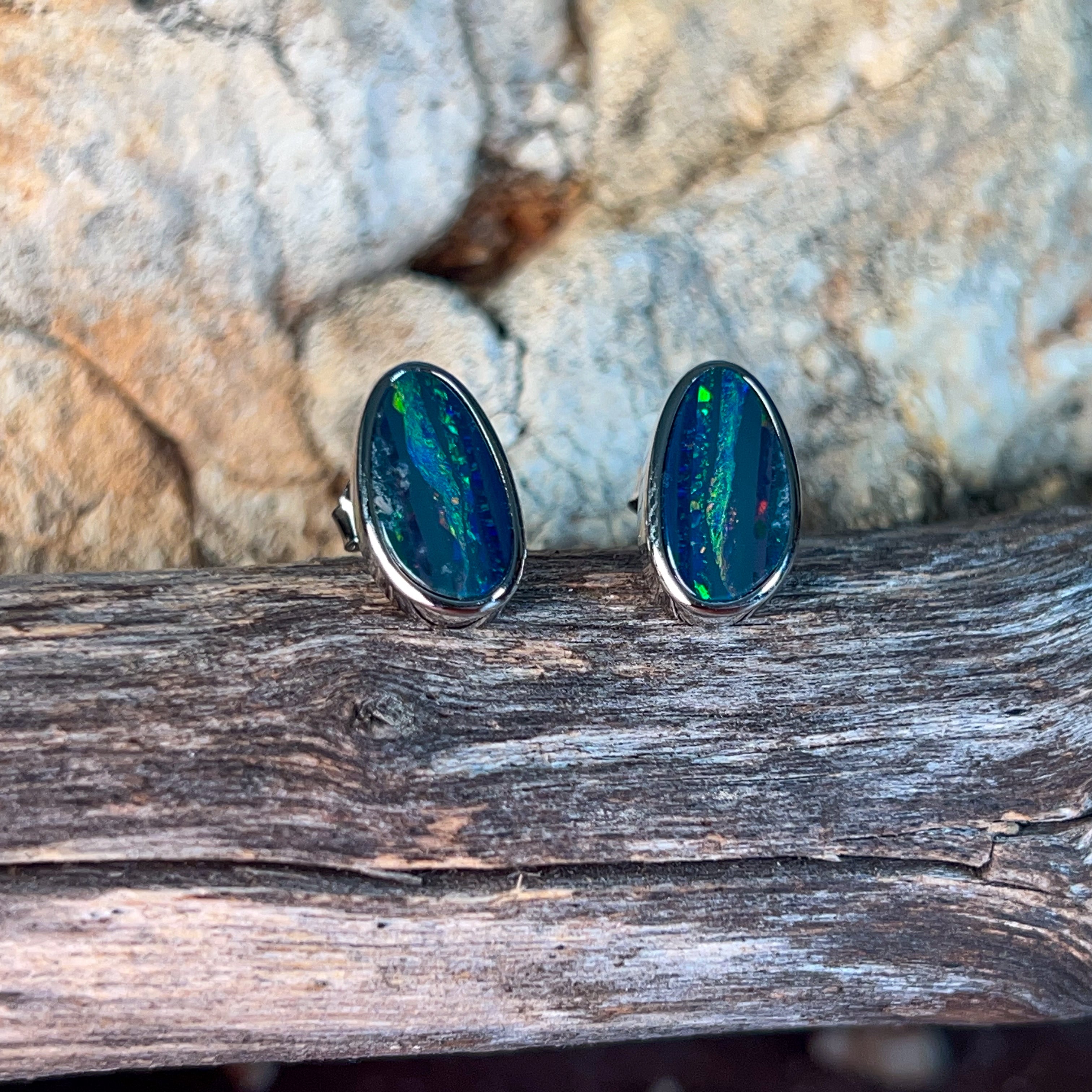 Tiny treasures that pack a punch! These sterling silver studs showcase gorgeous opal doublets with rich, saturated colours that seem to shift and dance with every movement. At 3.01 carats, they're the perfect everyday sparkle—sophisticated enough for the office, playful enough for weekend adventures. The linear pattern catches light beautifully, revealing deep hues that make these studs genuinely captivating. Slip them in and let your ears do the talking.