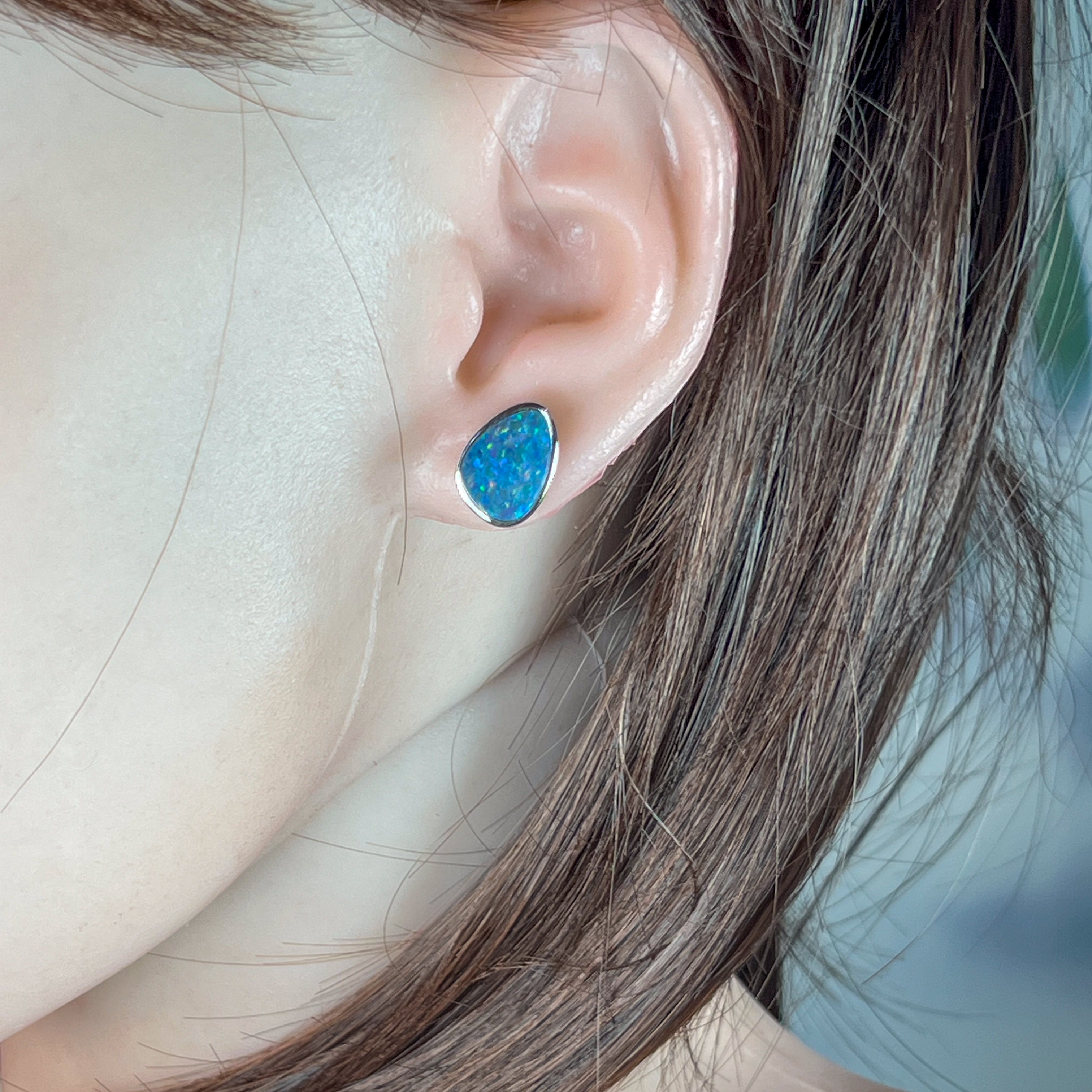 Sterling Silver Triangular Soft Blue Yellow Opal doublet studs