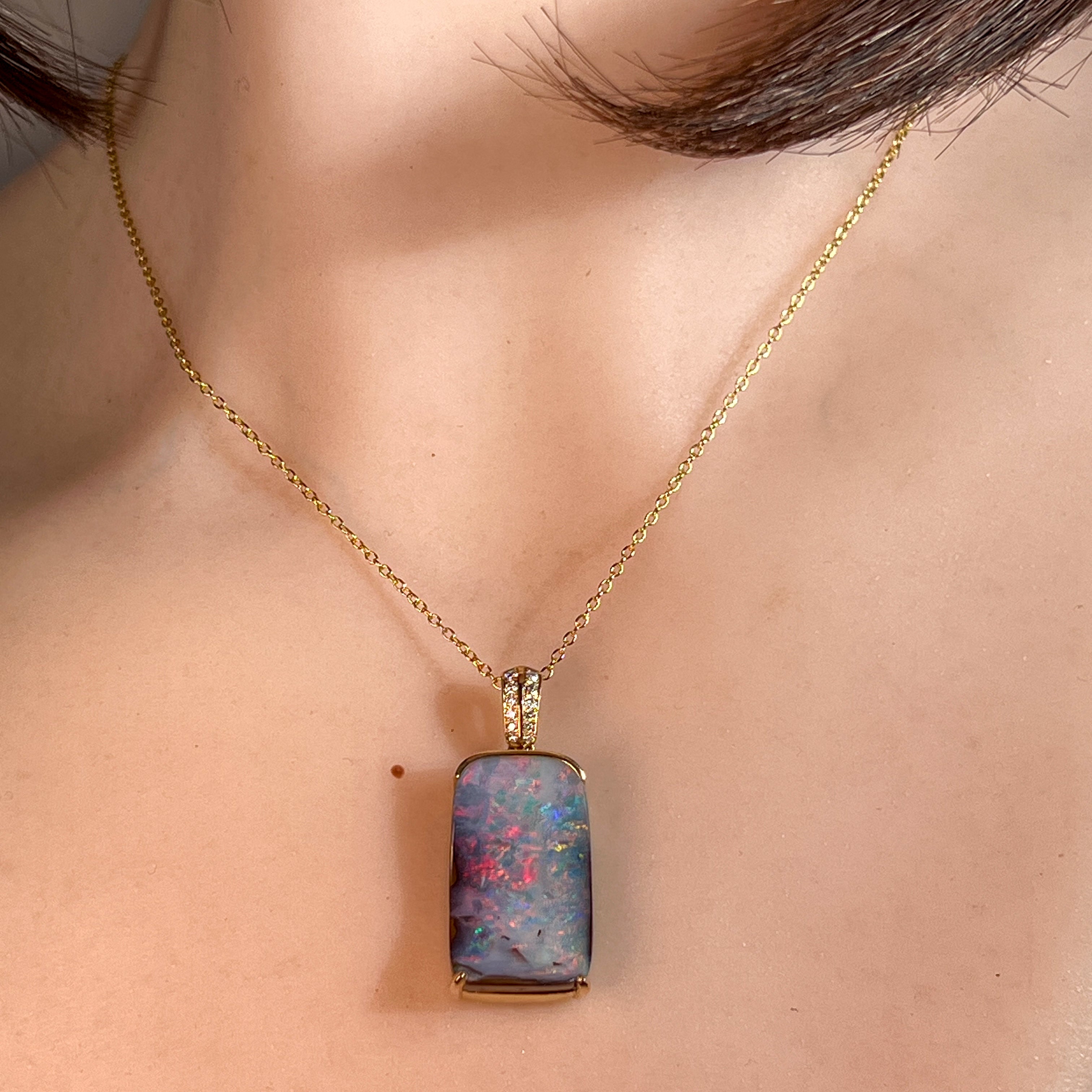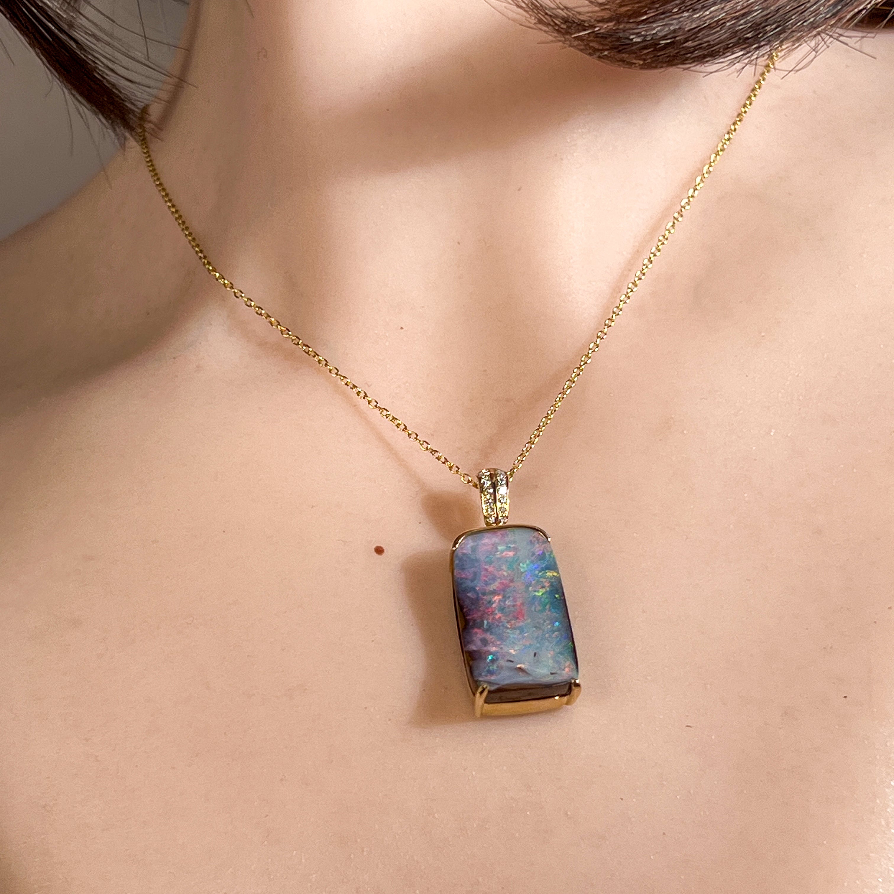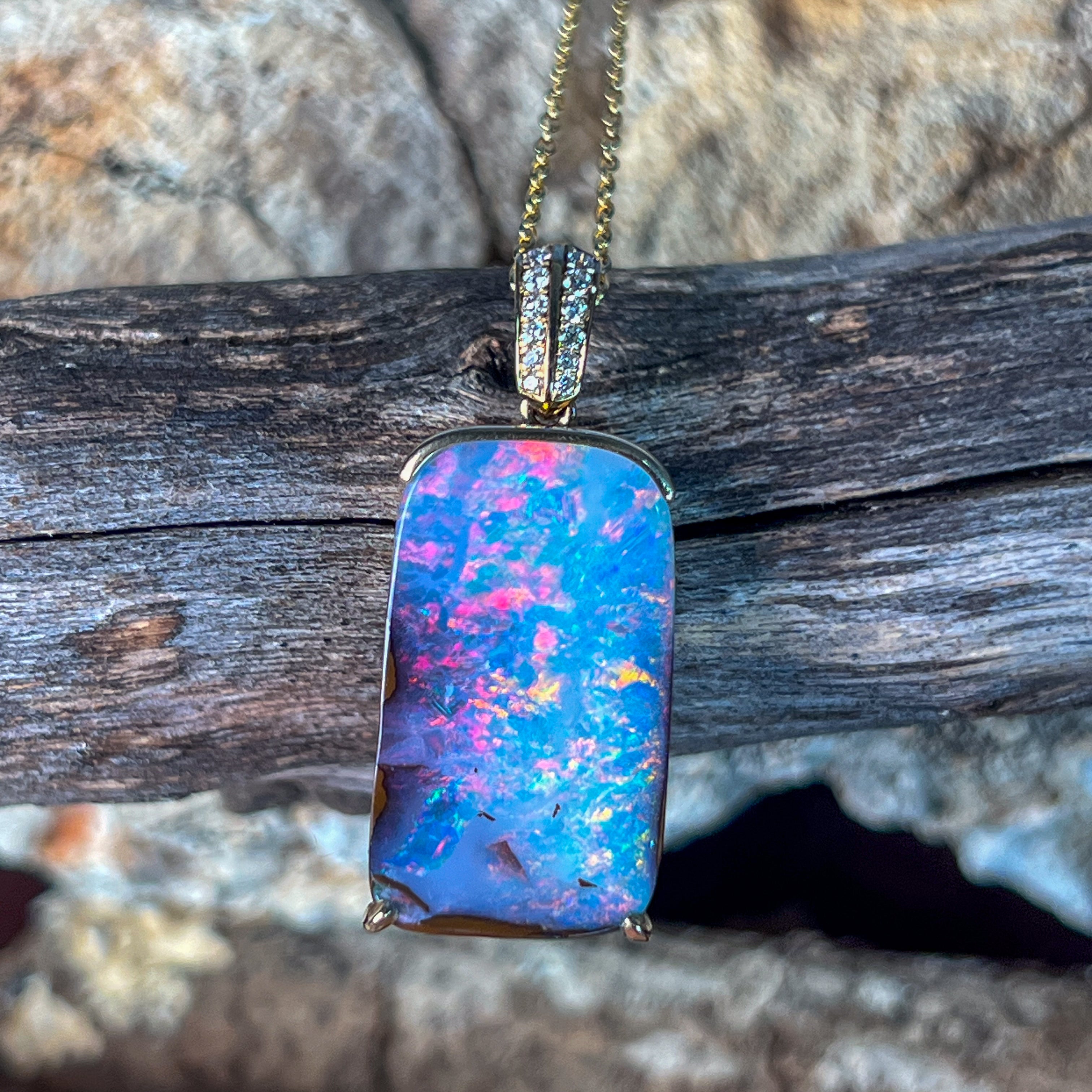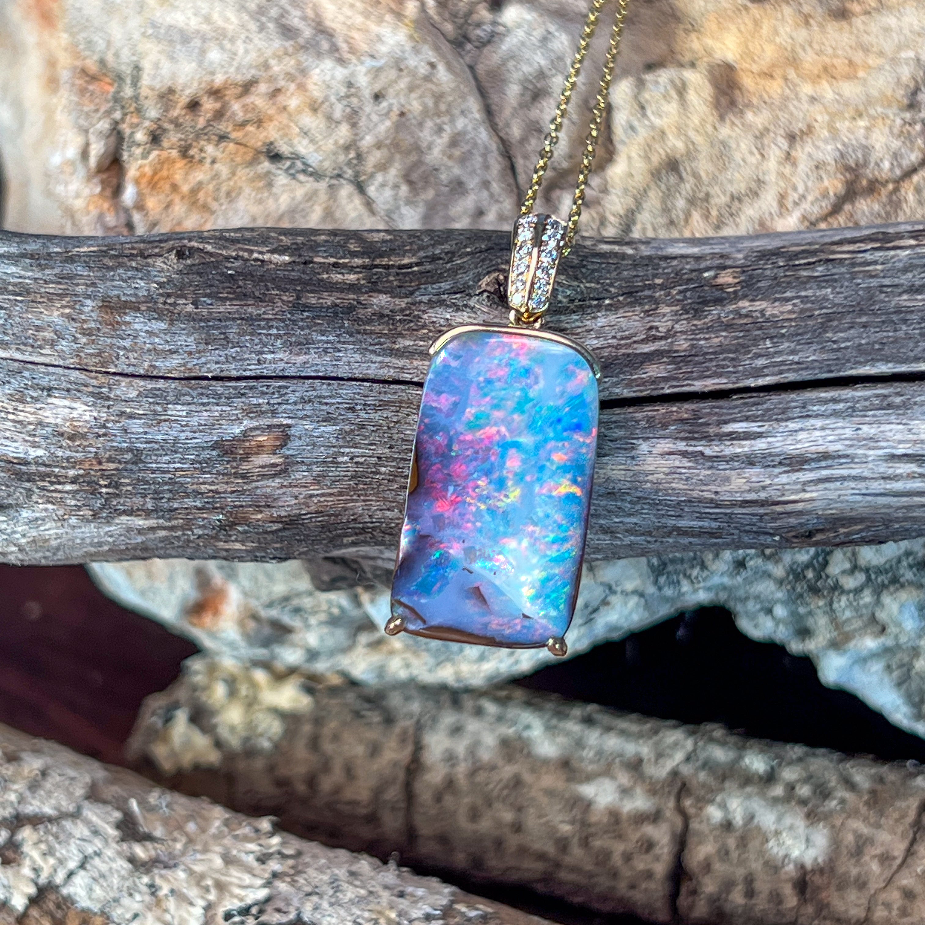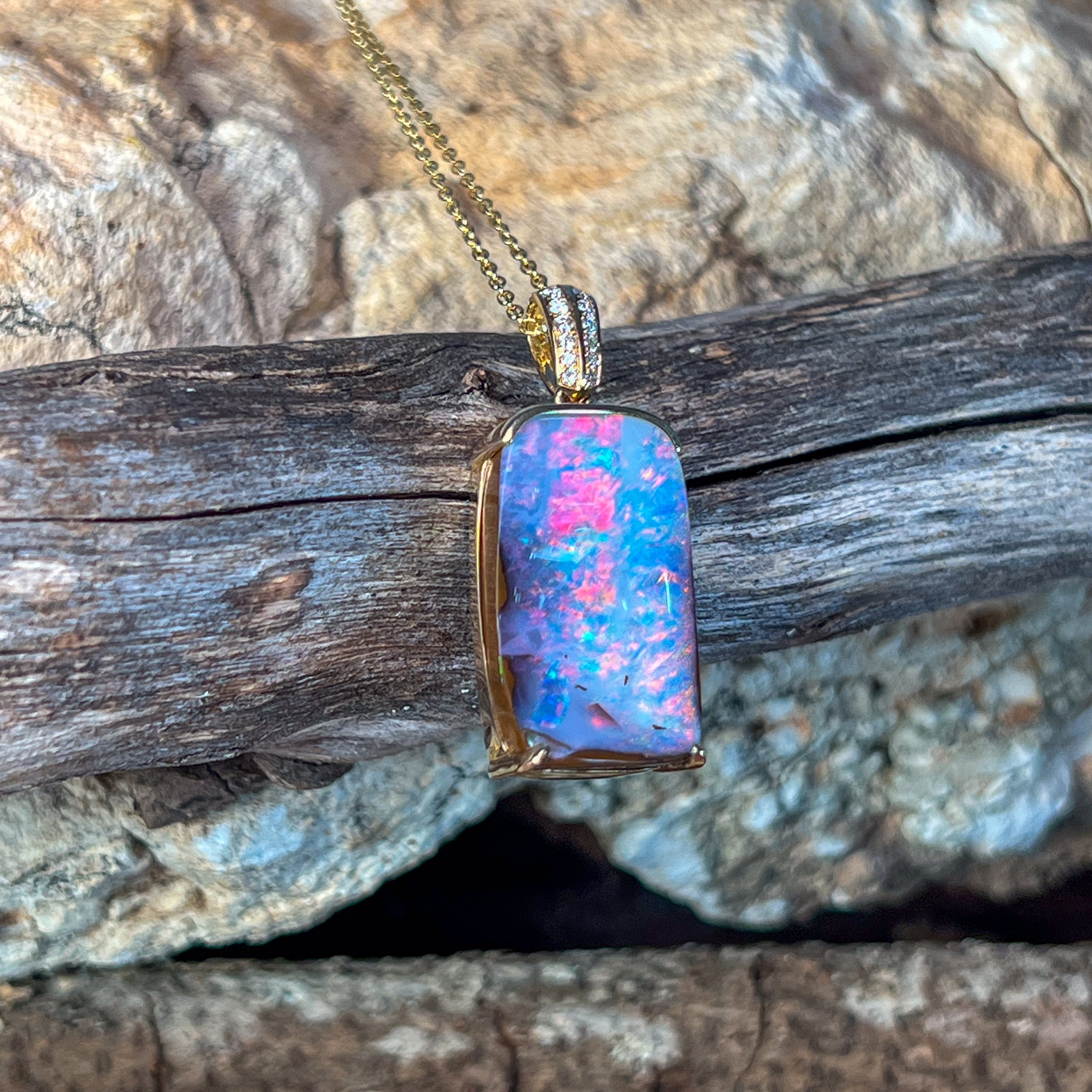 14kt Yellow Gold Boulder Opal 16.06ct Rectangular Pendant A stunning statement piece featuring a freeform rectangular Australian boulder opal set in a half bezel of 14kt yellow gold. This 16.06ct opal showcases vibrant blue, green, and red flashes that dance across its surface, creating a mesmerising display of colour. The pendant measures 32x13mm and is elegantly accented with 12 round brilliant diamonds (0.09ct total, F colour, VS clarity) that frame the opal beautifully. Weighing just 5.89g, it's substantial yet comfortable to wear. Perfect for those who appreciate the natural beauty and uniqueness of Australian boulder opal. Each stone is one-of-a-kind, making this pendant a truly individual treasure.14kt Yellow Gold Opal half bezel set pendant