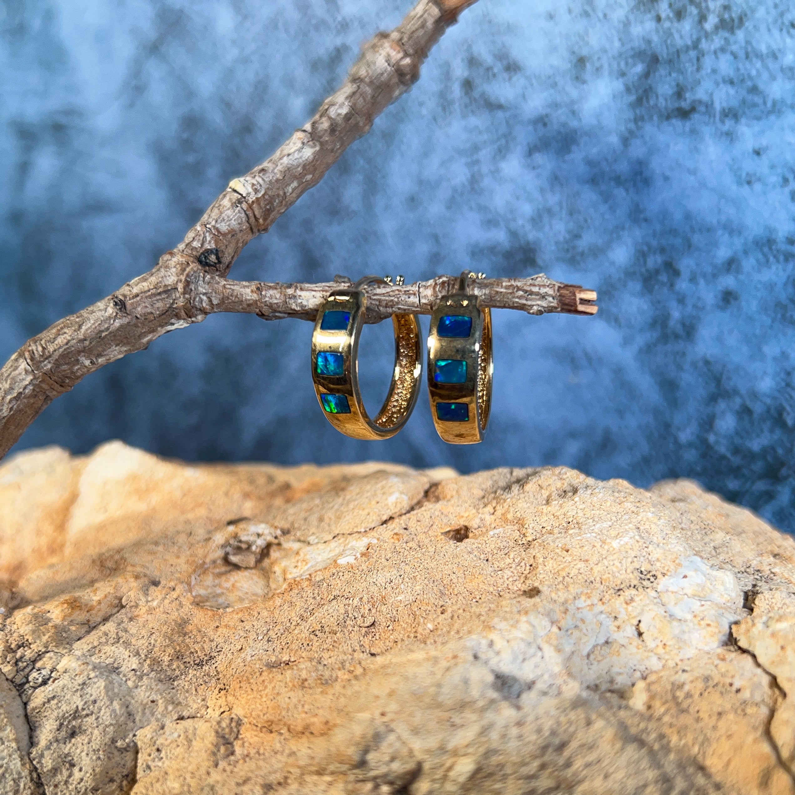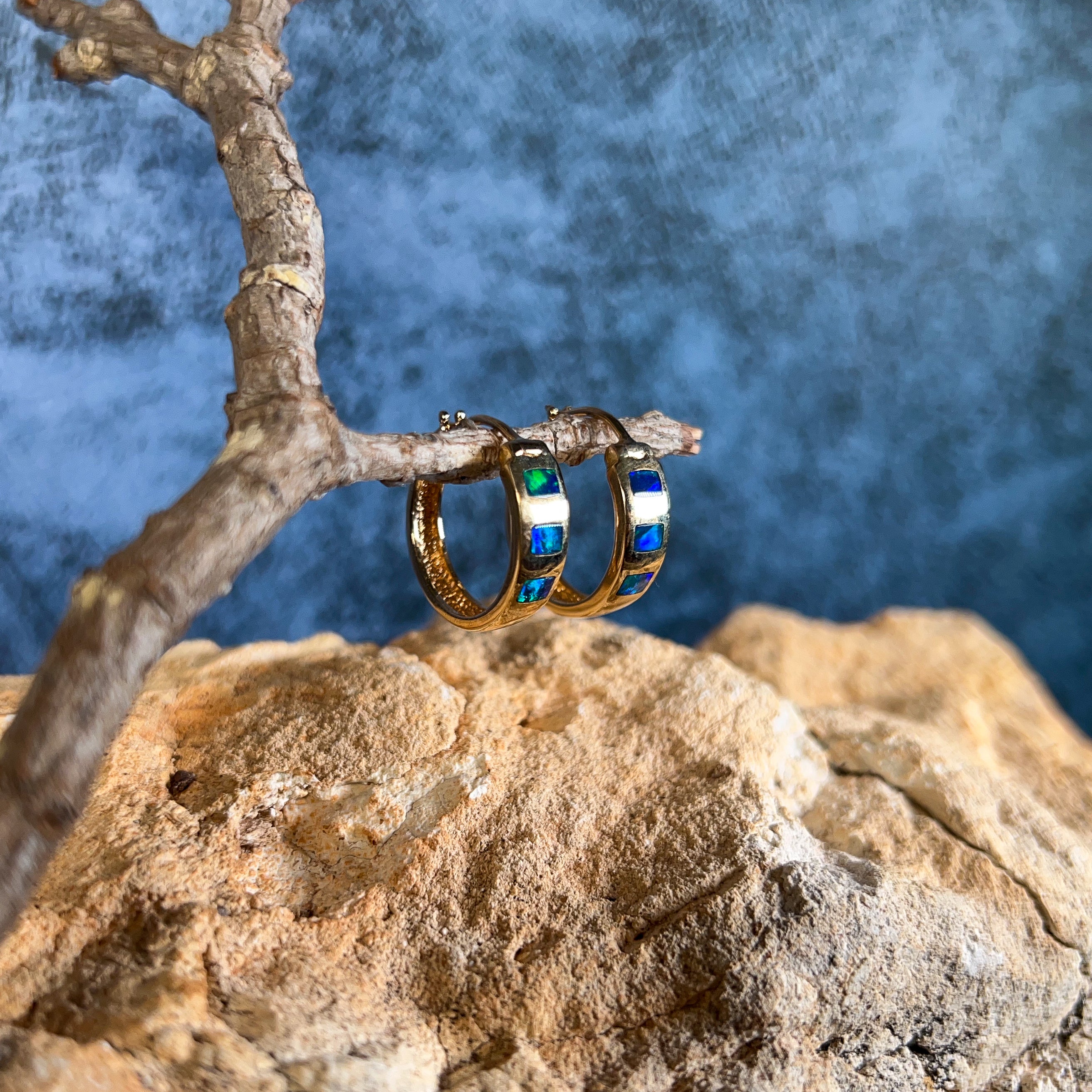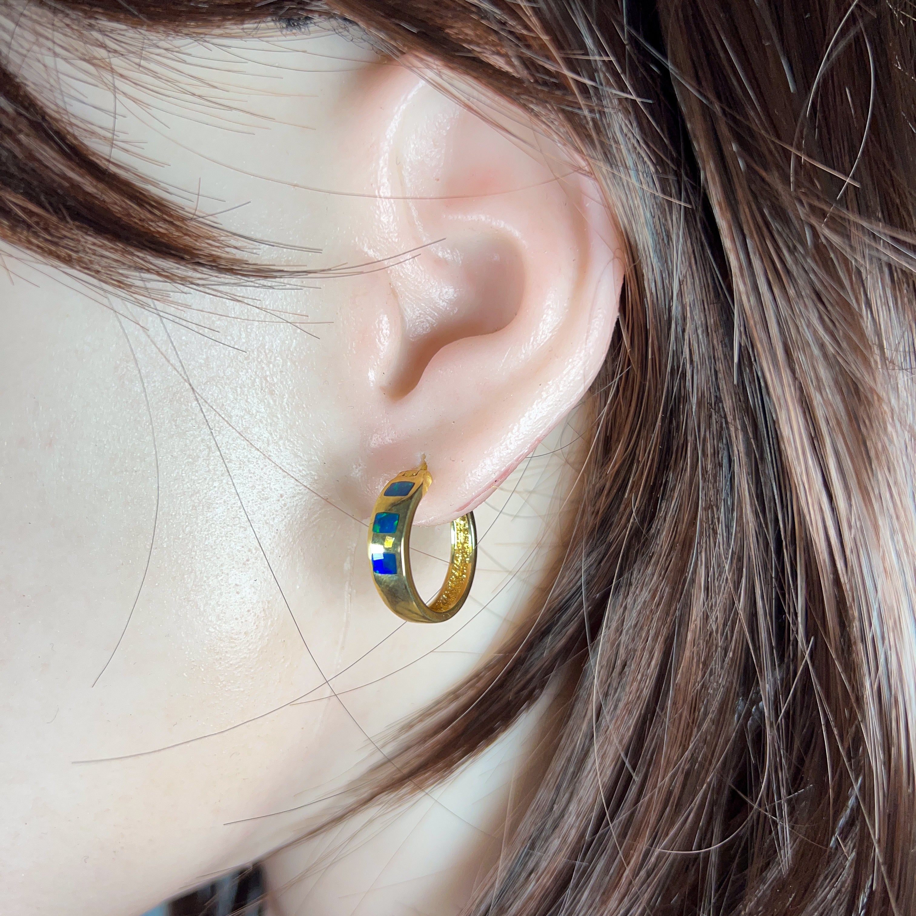 14kt Yellow Gold hoop inlay Opal earrings