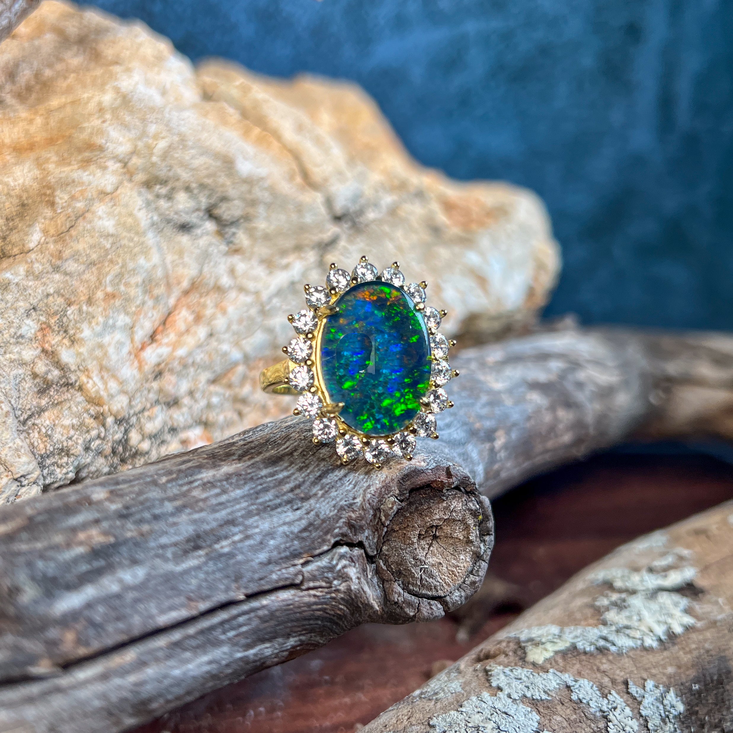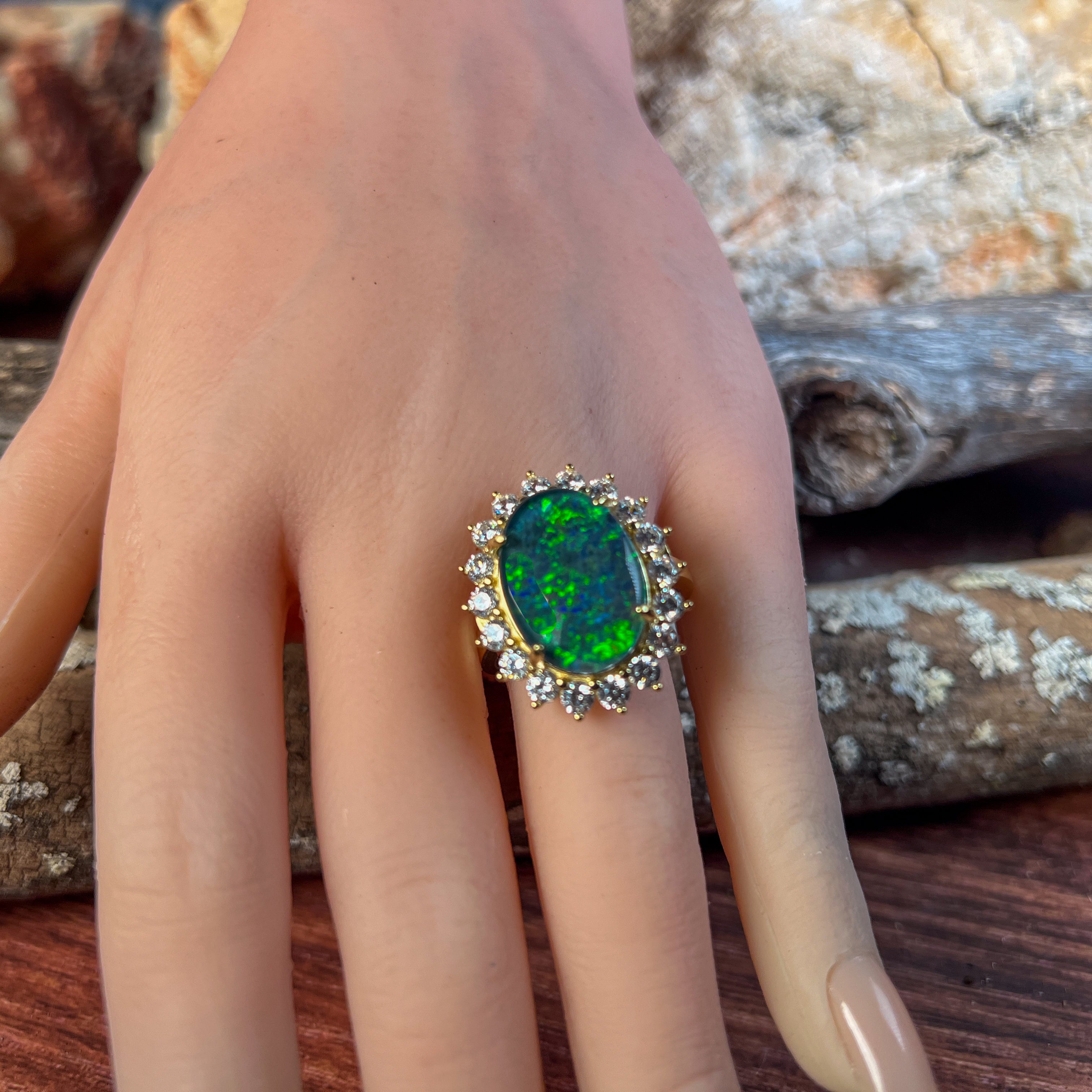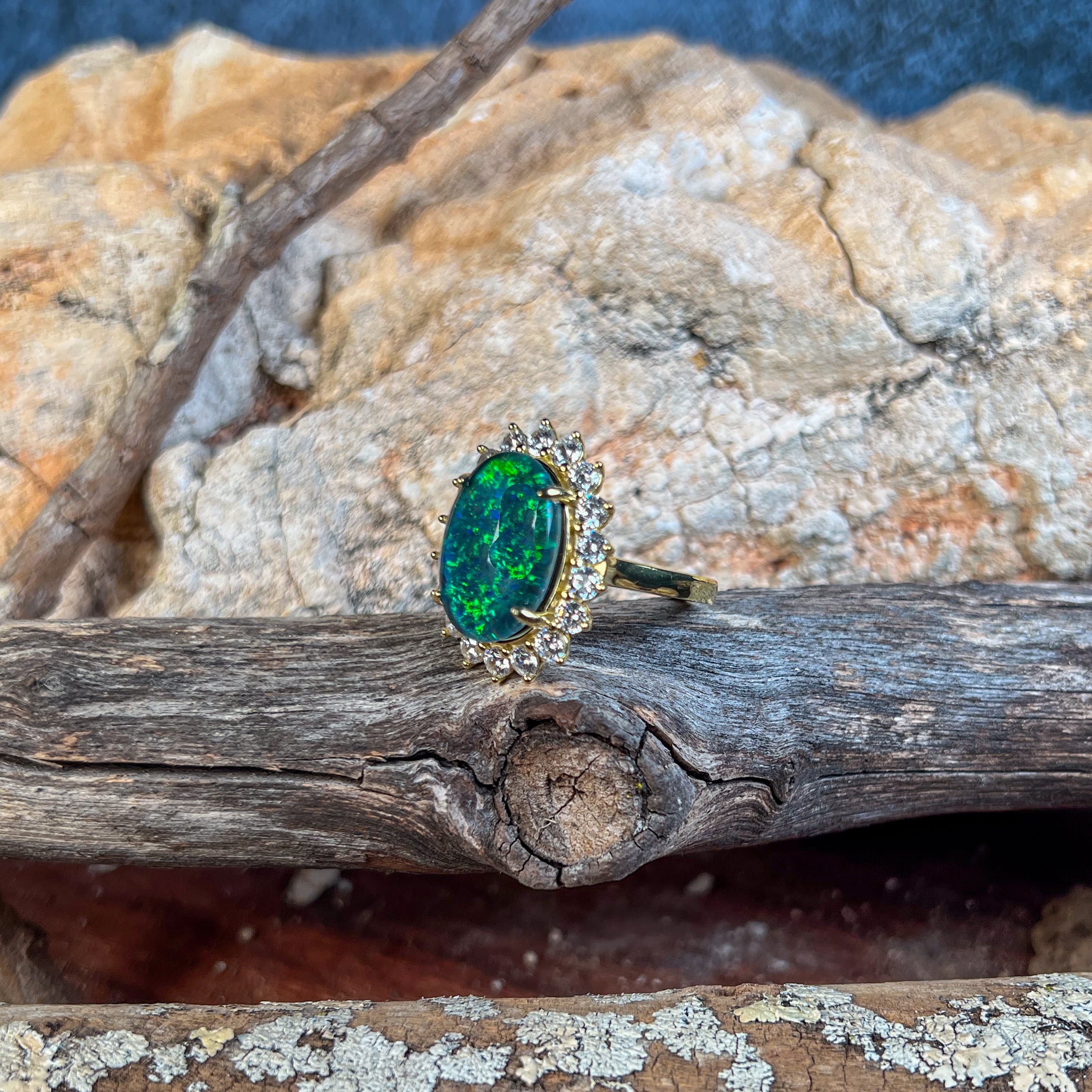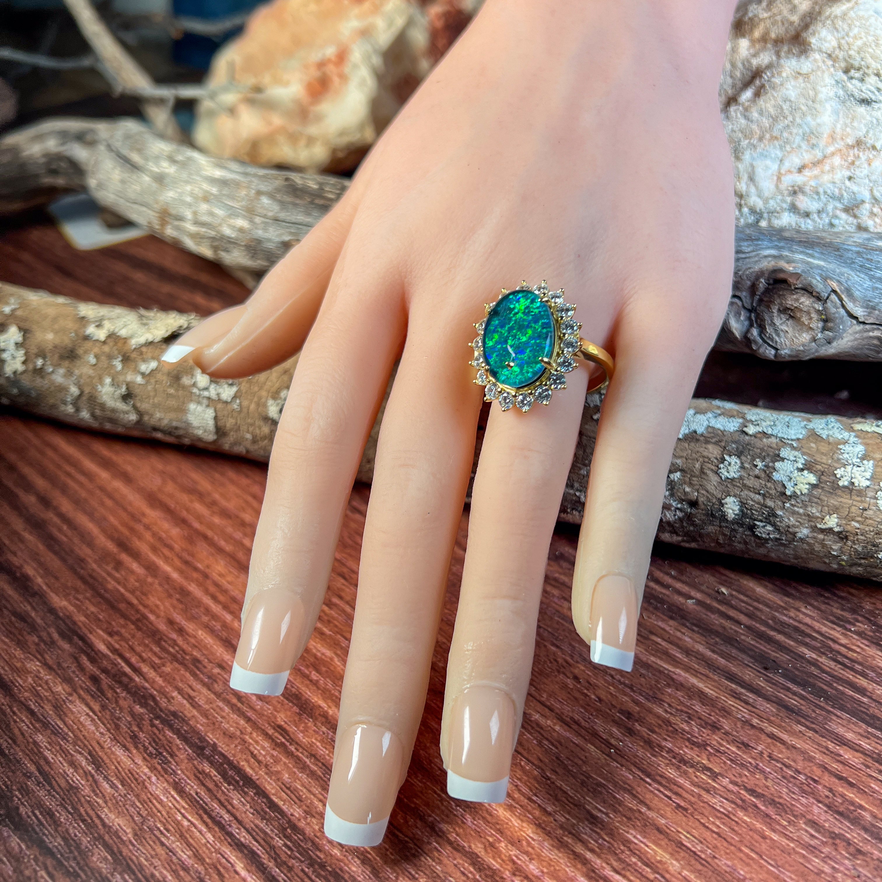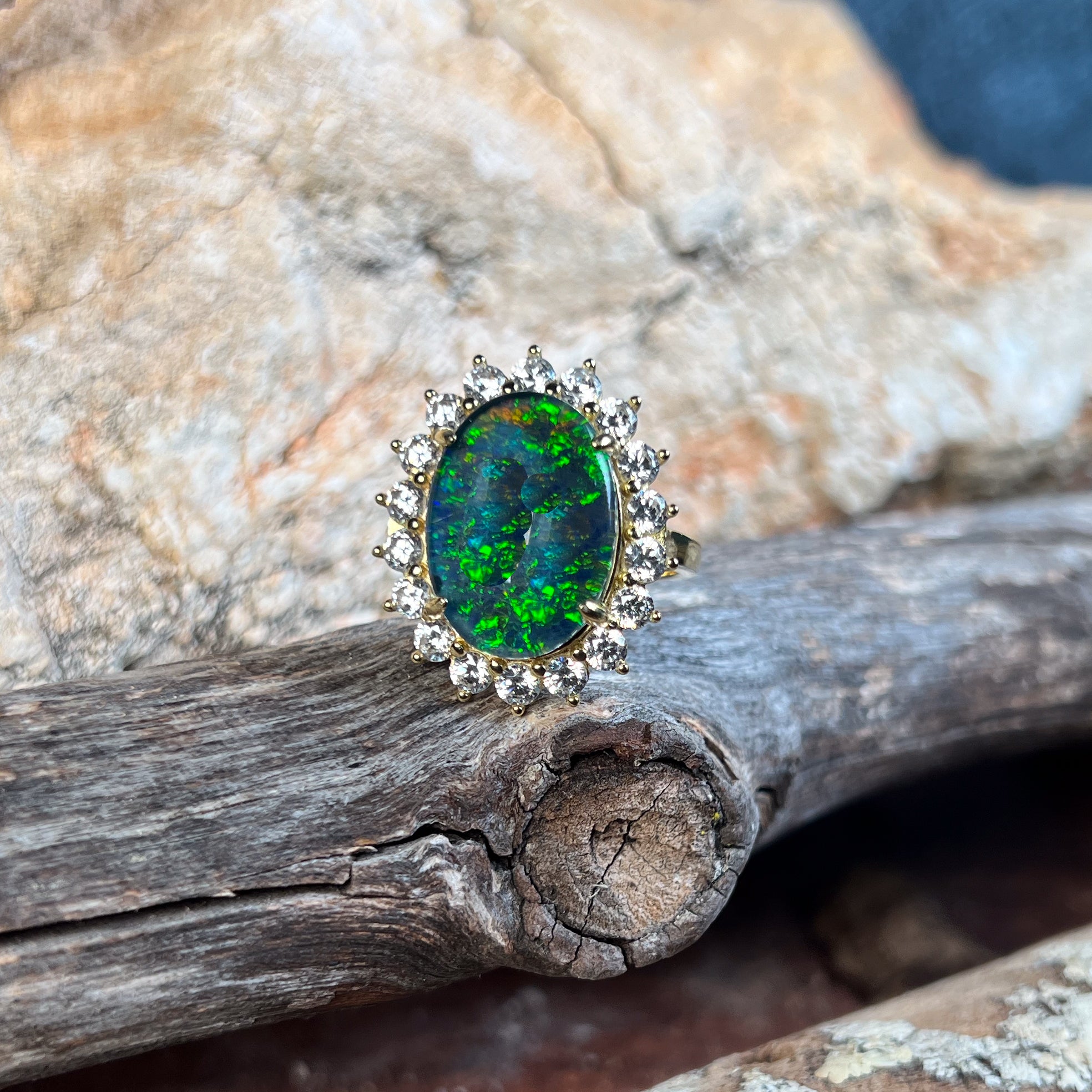 Elevate your everyday elegance with this stunning gold plated sterling silver cluster ring, featuring a magnificent 18x13mm opal triplet at its heart. The layered opal stone captures light beautifully, displaying those mesmerising colour-play flashes that make opals truly captivating. Crafted from quality sterling silver with luxurious gold plating, this piece combines durability with sophisticated style. Perfect for those seeking a statement ring that's both eye-catching and wearable, this cluster design adds dimension and visual interest to any hand. An investment in timeless beauty that celebrates the natural wonder of genuine opal.