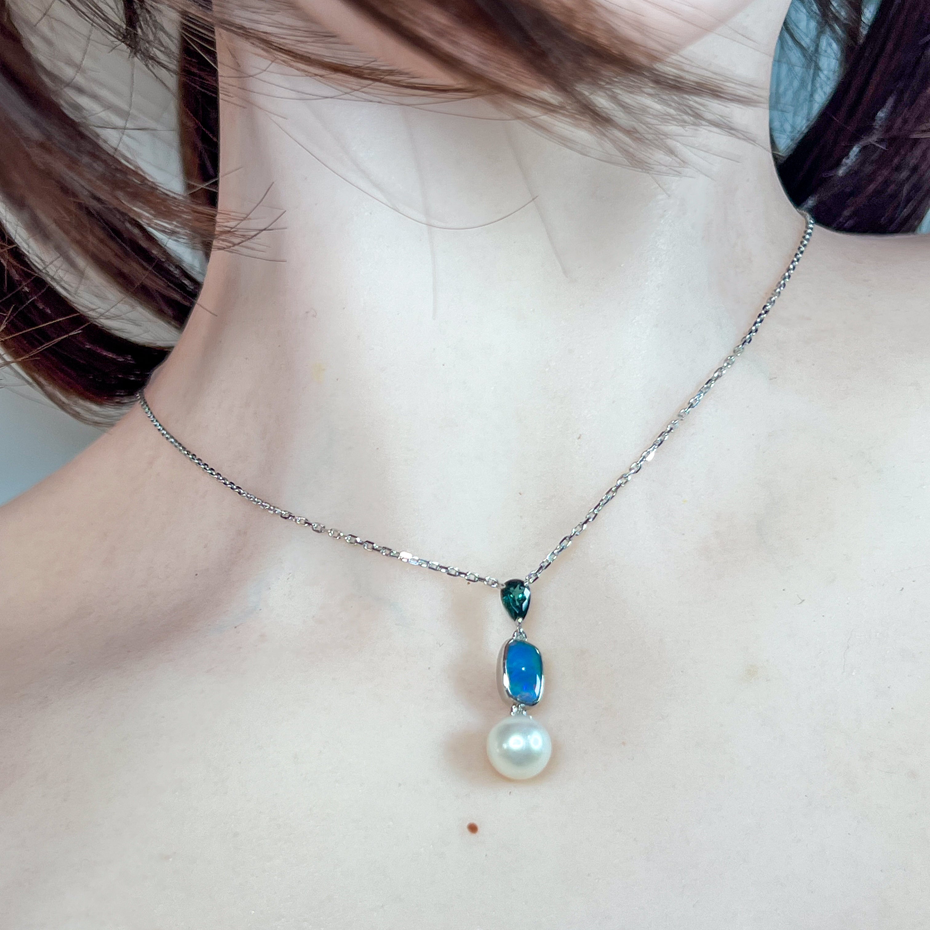 Elevate your jewellery collection with this exquisite designer necklace, where timeless elegance meets contemporary artistry. Crafted in lustrous 14kt white gold, this piece features a stunning 8.5mm South Sea pearl as its centrepiece, complemented by a vibrant opal doublet and rich tourmaline accents. The graceful drop style creates a flattering silhouette that catches light beautifully, making it perfect for both special occasions and refined everyday wear. Each element is thoughtfully selected to deliver sophistication and natural beauty that speaks to discerning tastes. A true investment piece that transcends trends.