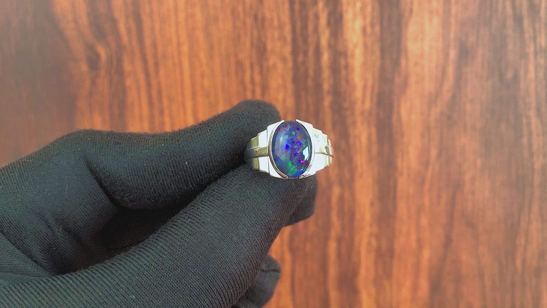 Sterling Silver ring set with one 14x10mm Opal triplet half bezel set.