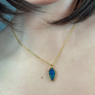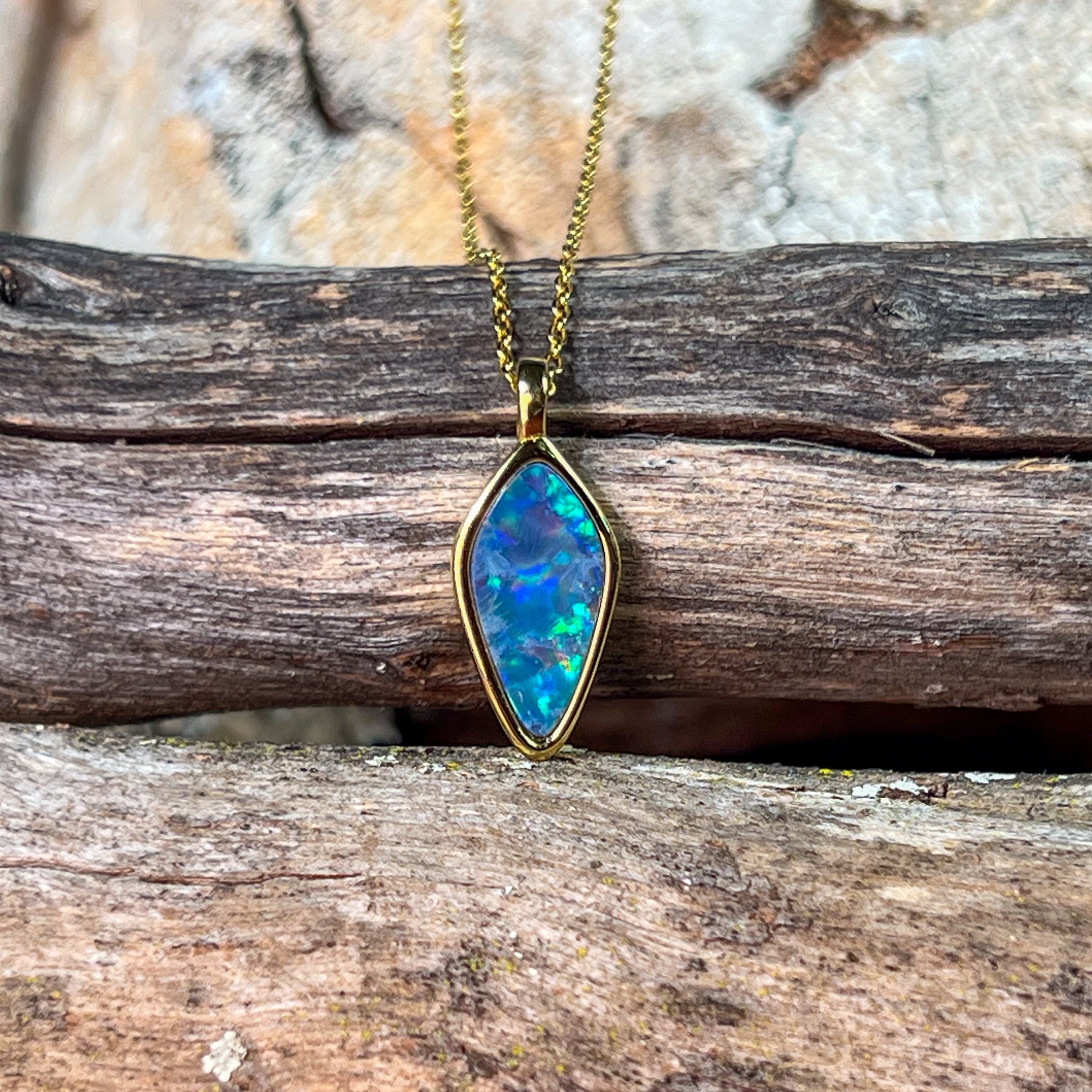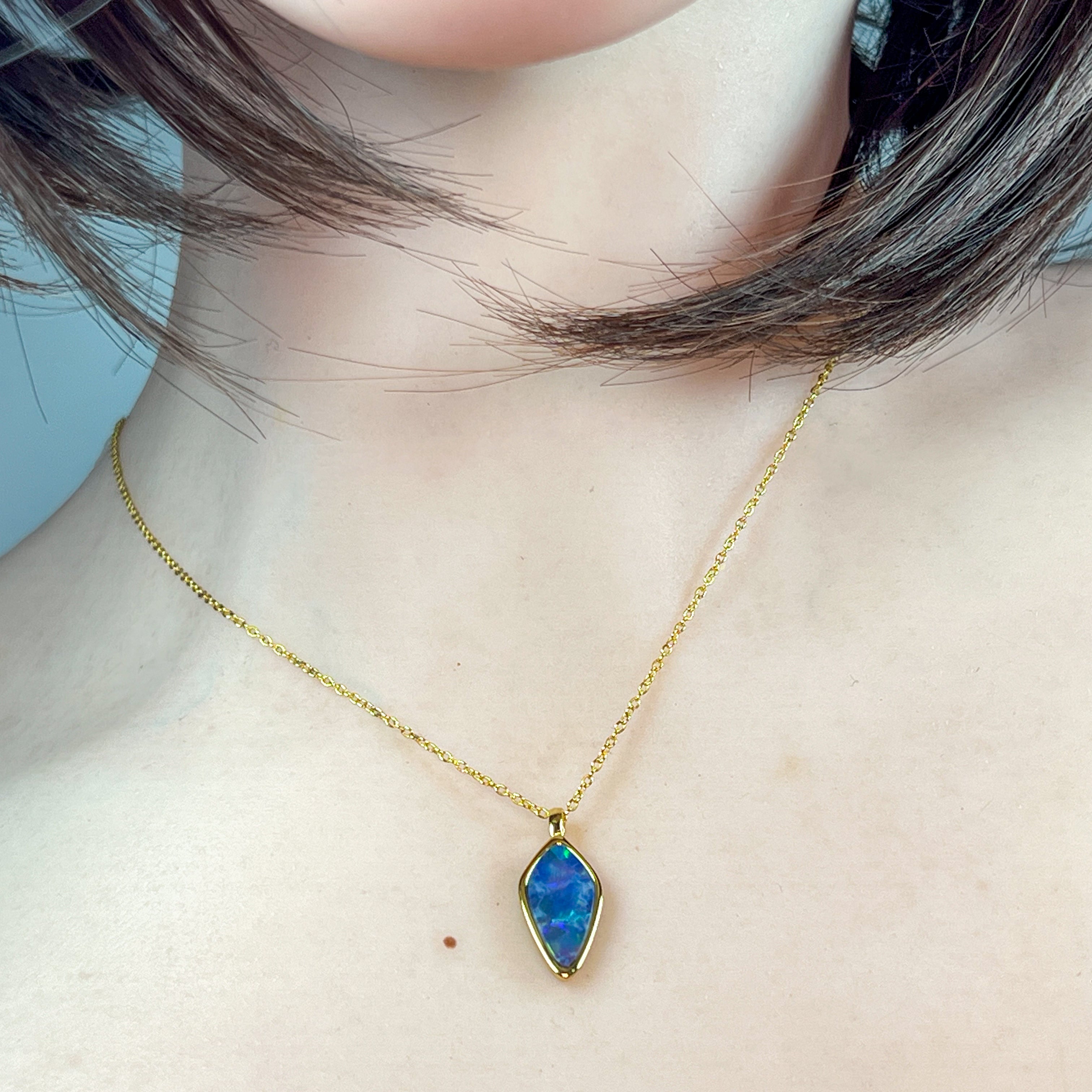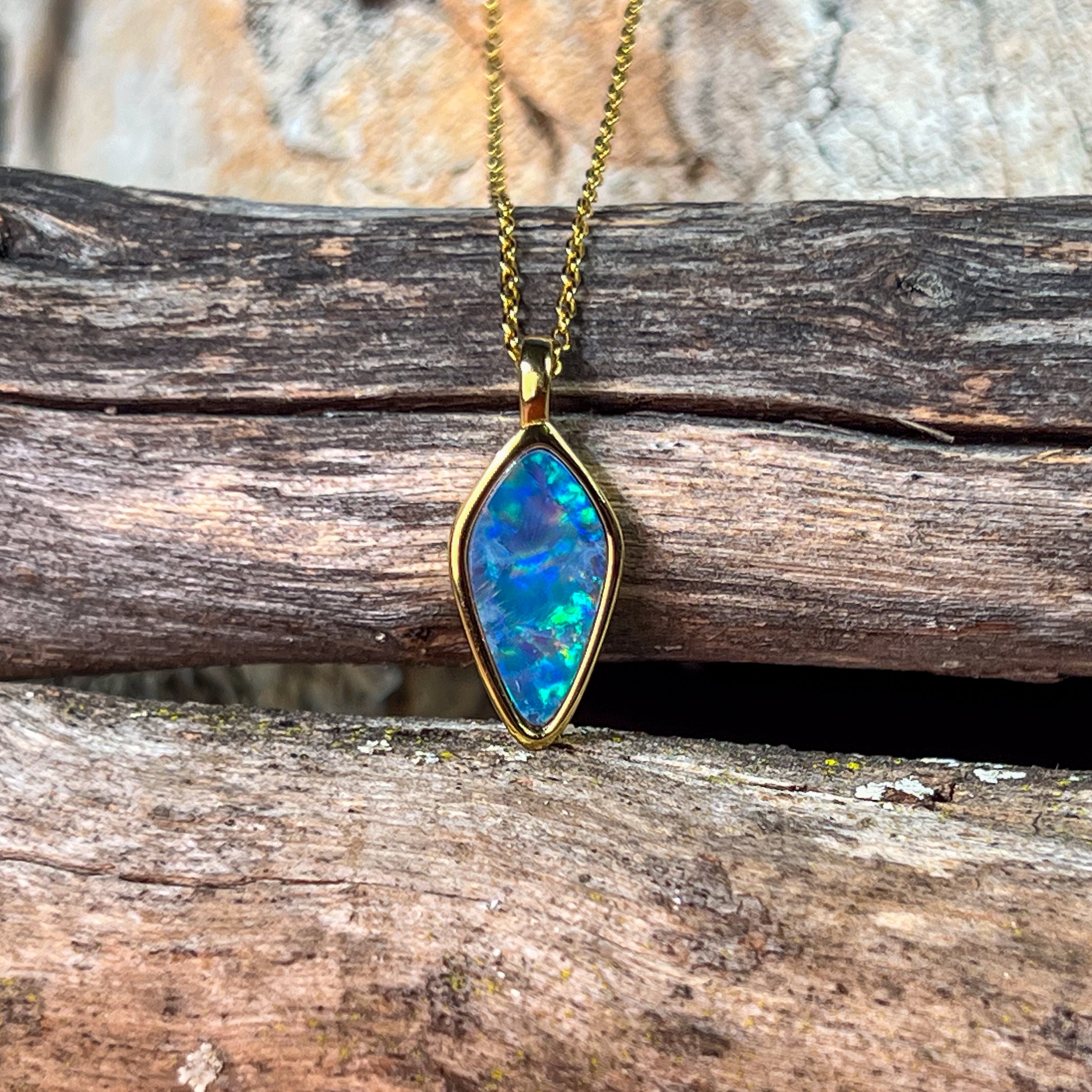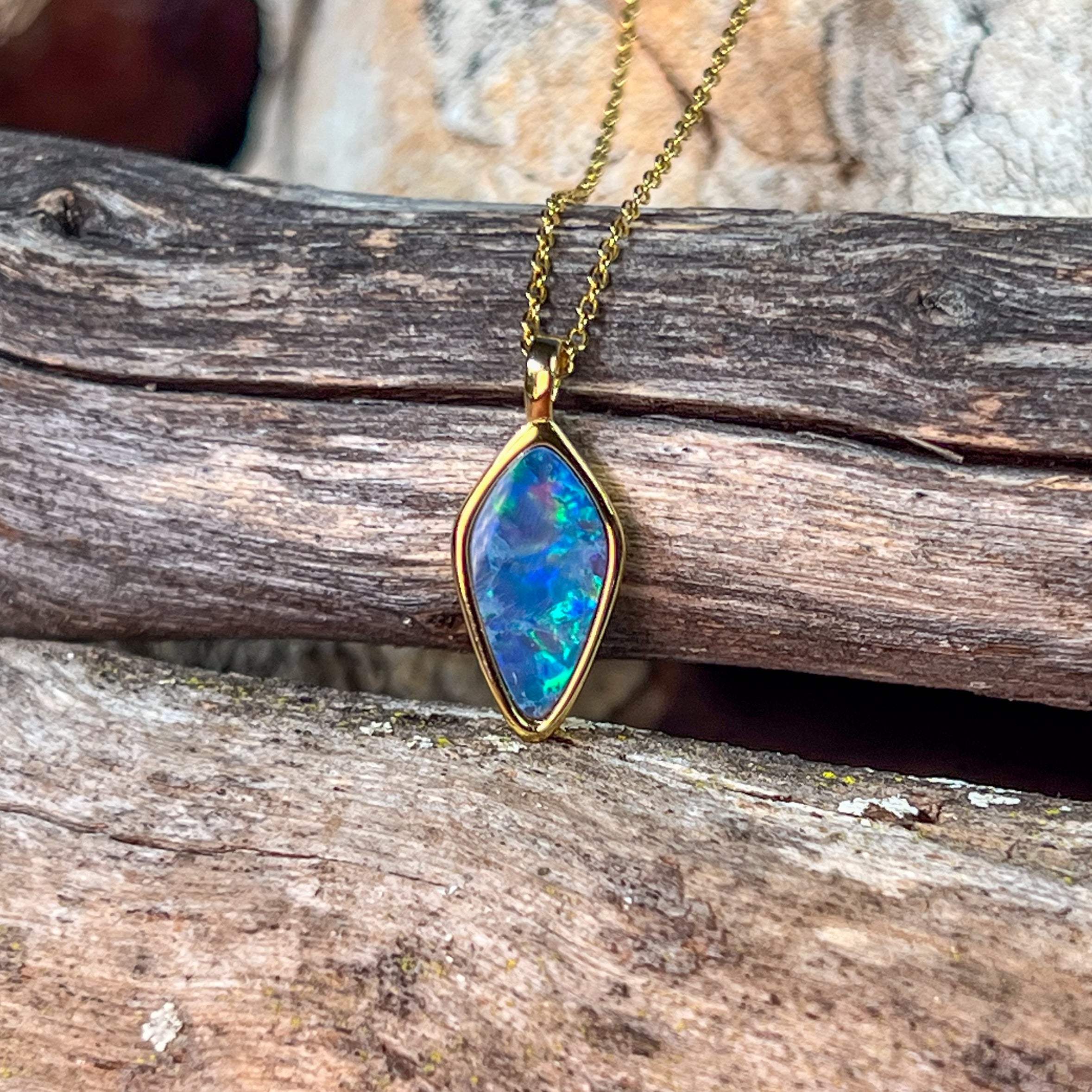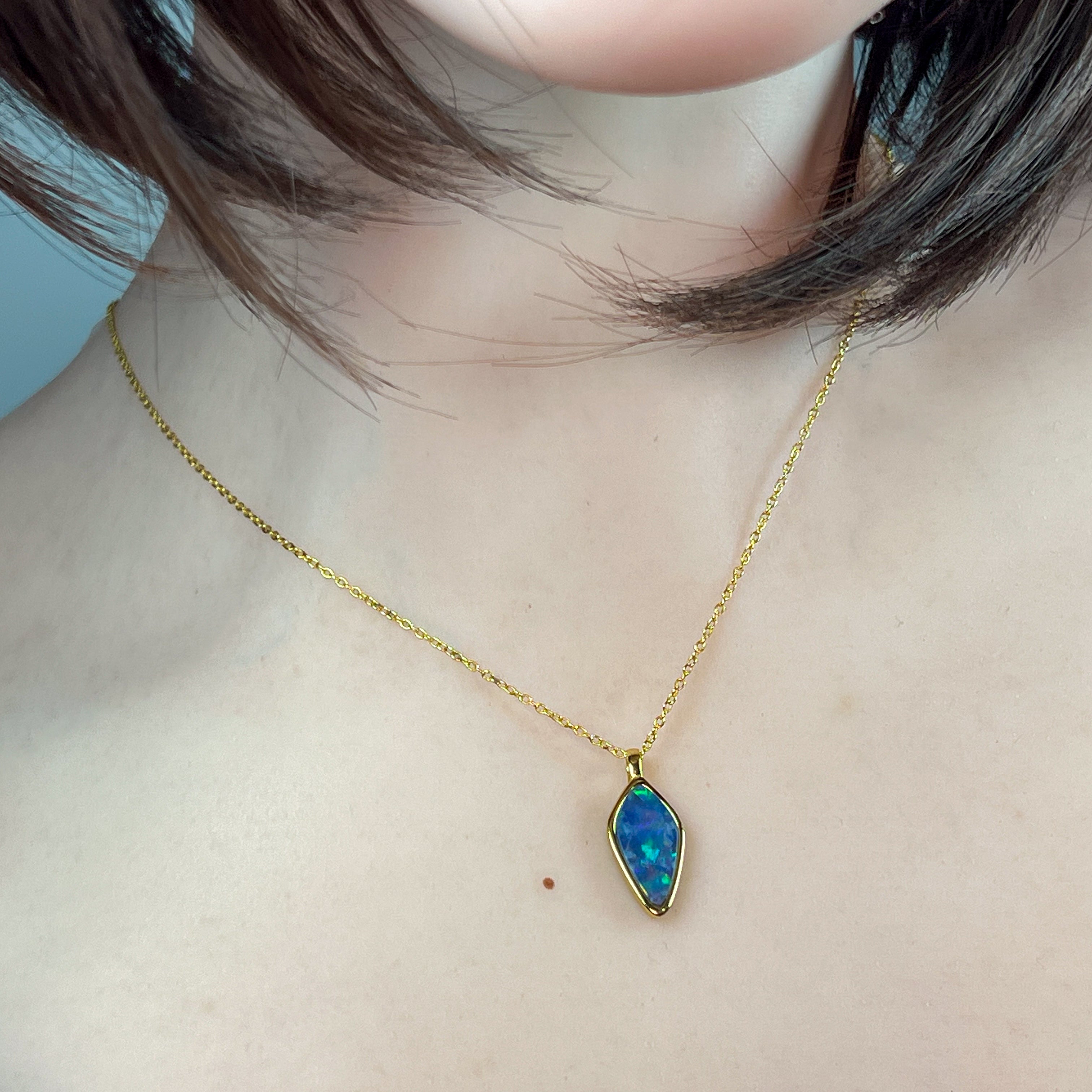 Capture the mesmerizing dance of colour with this stunning kite-shaped opal doublet pendant. Set in gleaming gold-plated silver, this exquisite piece showcases a powerful flash of vibrant hues that shift and shimmer with every movement. The bezel setting cradles the opal securely while allowing light to play across its surface, revealing brilliant blues, greens, and fiery oranges. Perfect for those who crave jewellery that commands attention and sparks conversation, this pendant transforms any outfit into something truly extraordinary.
