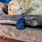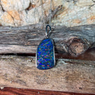 This sterling silver pendant features a stunning 28x17mm opal triplet that dazzles with vibrant multi-colours. Its unique freeform shape adds an artistic touch, making it a captivating statement piece. Perfect for enhancing any outfit, this pendant combines elegant craftsmanship with eye-catching brilliance to elevate your jewelry collection.