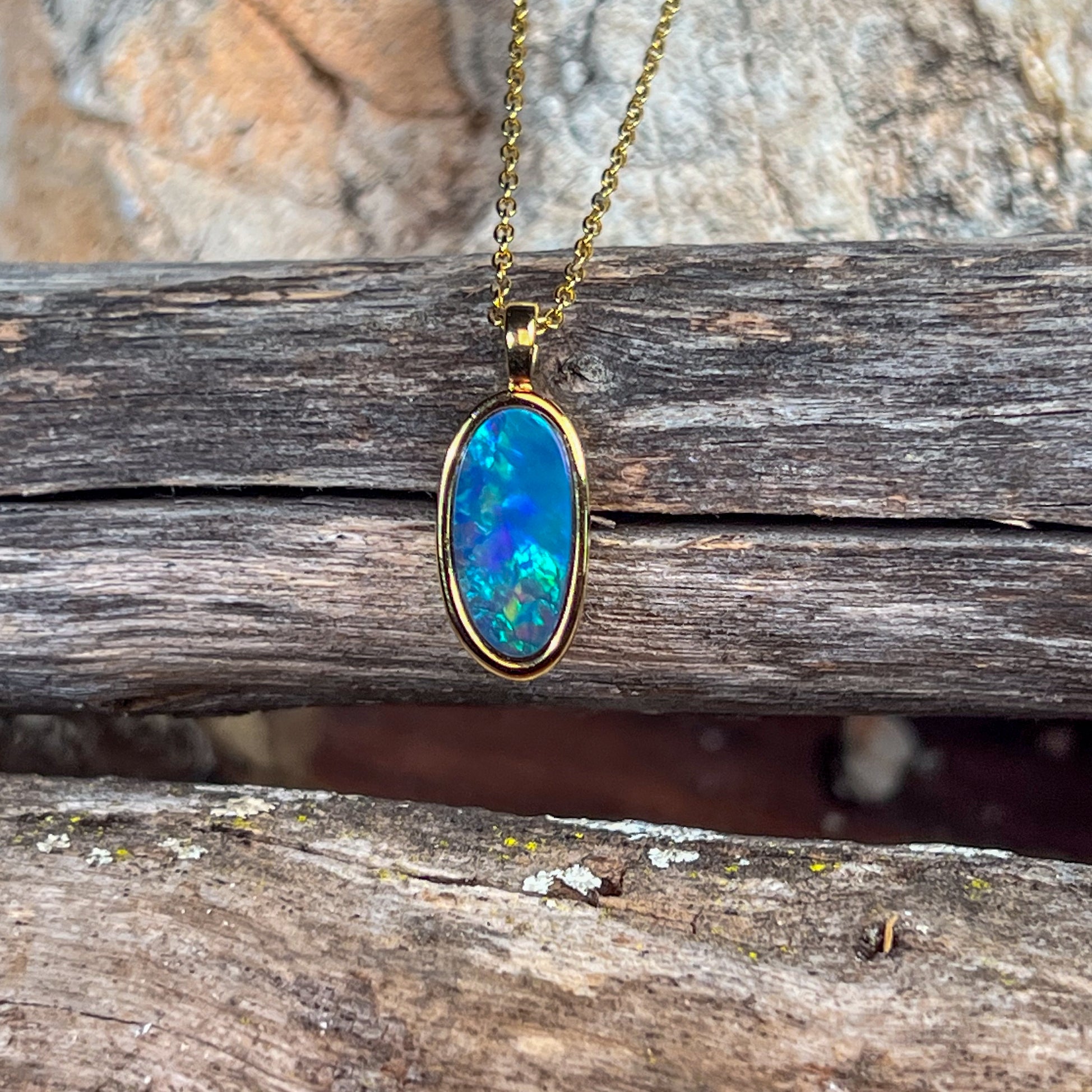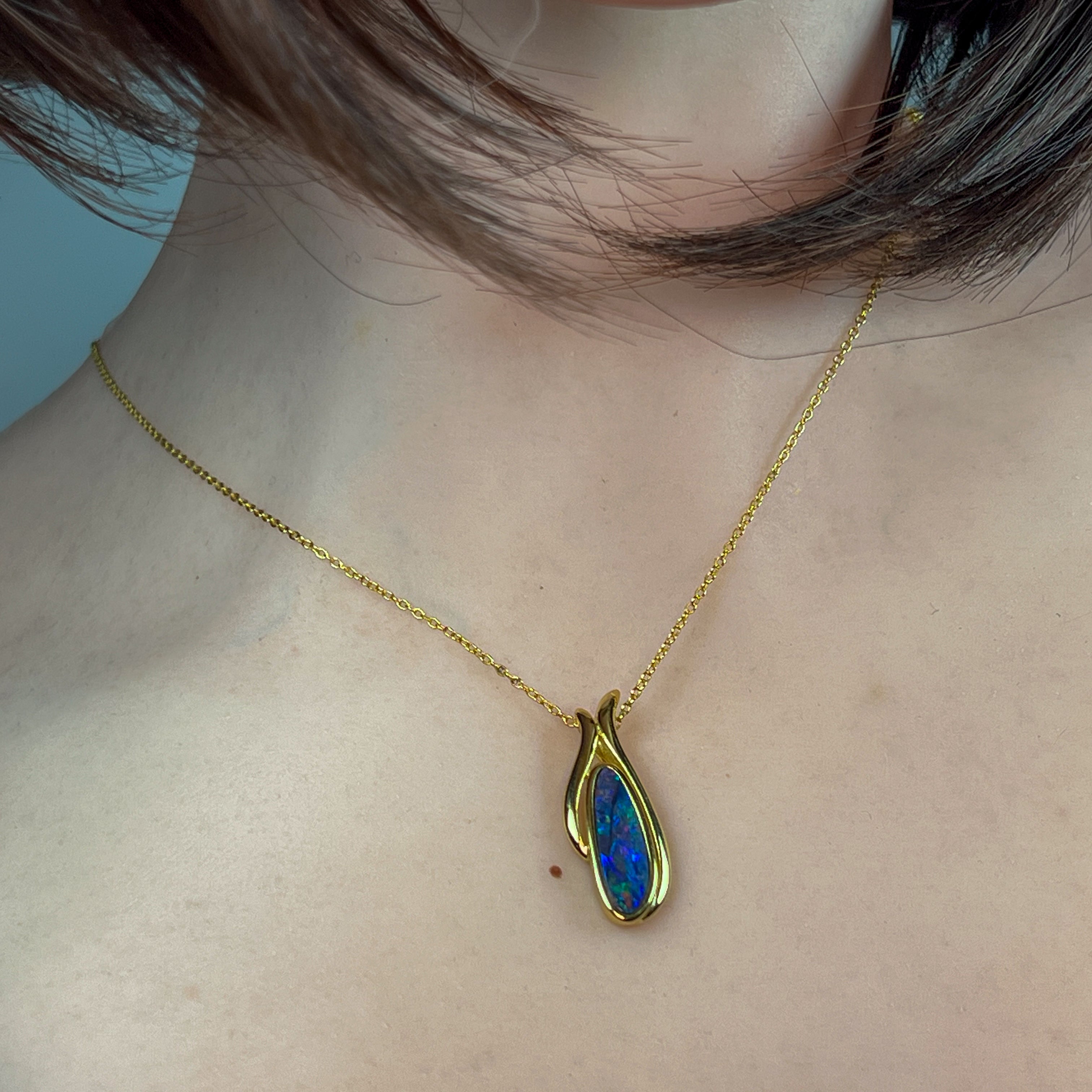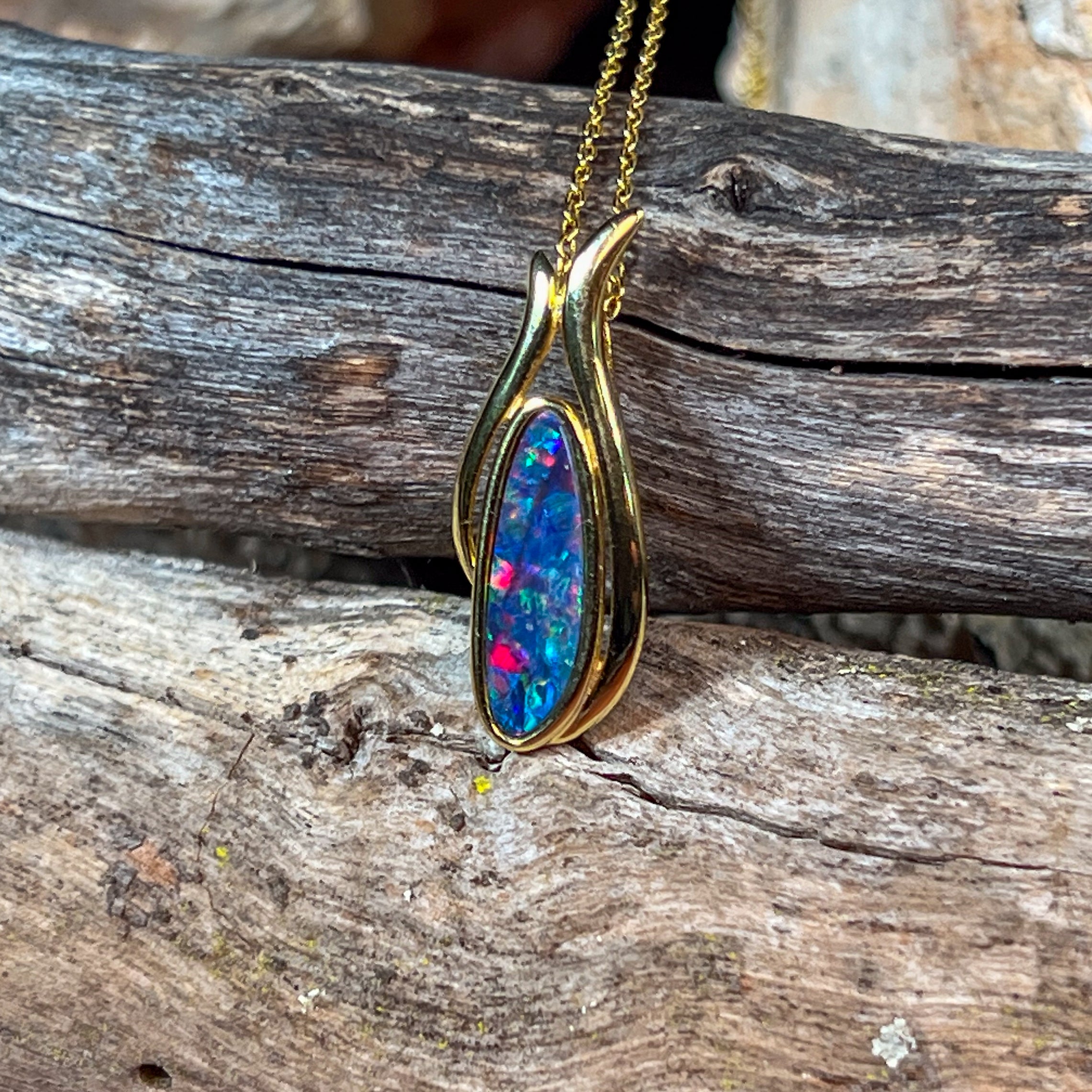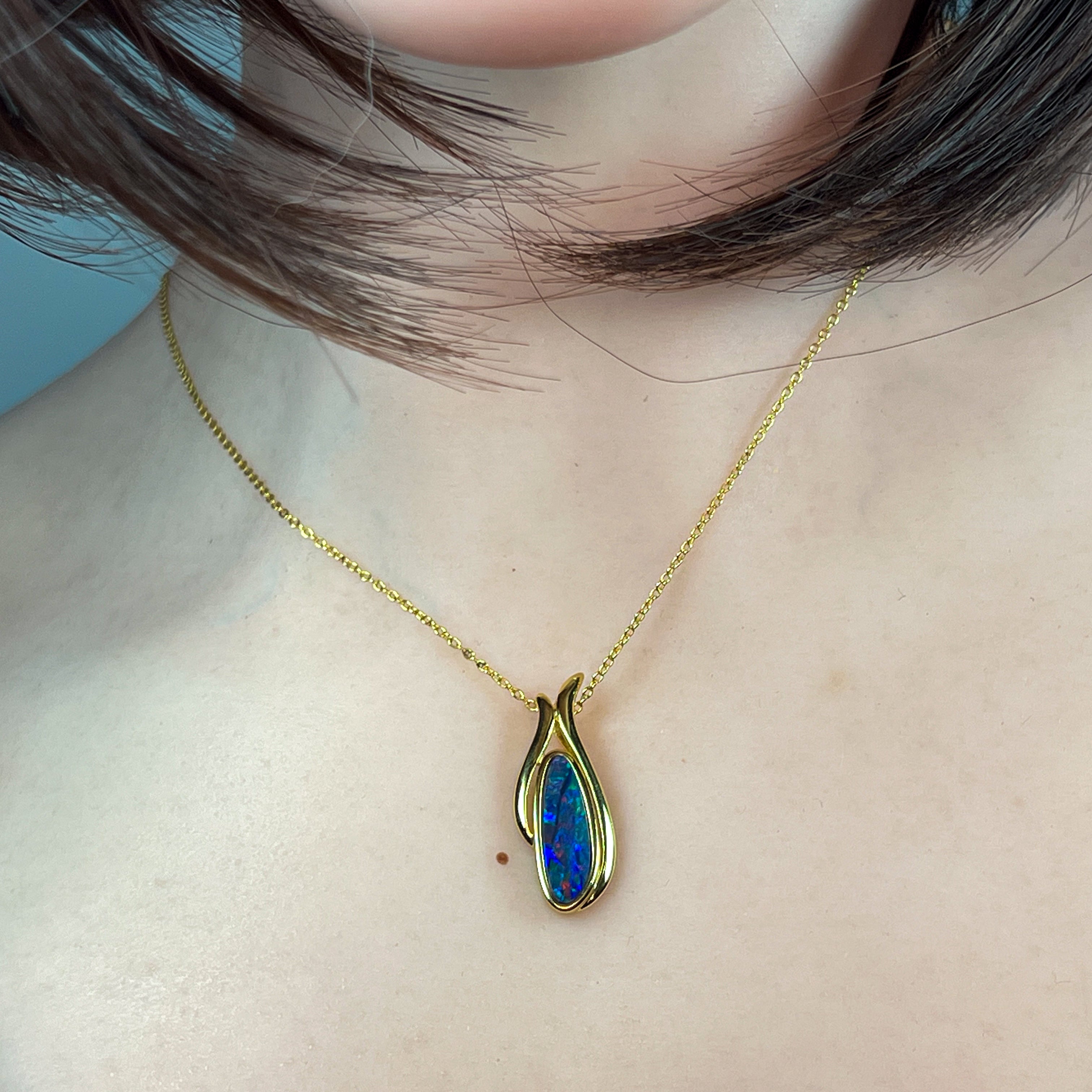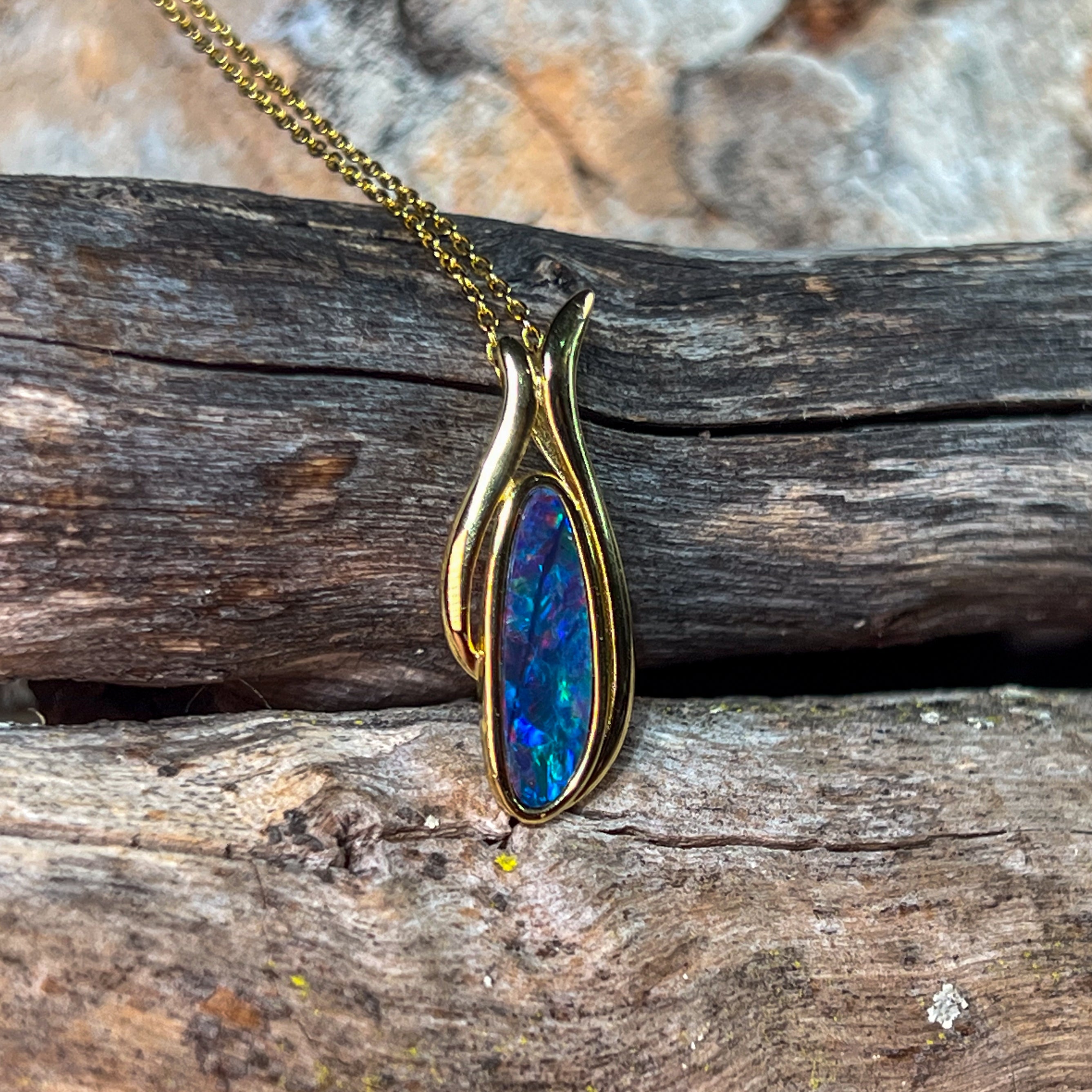 Gold Plated Silver freeform long shaped Opal doublet pendant