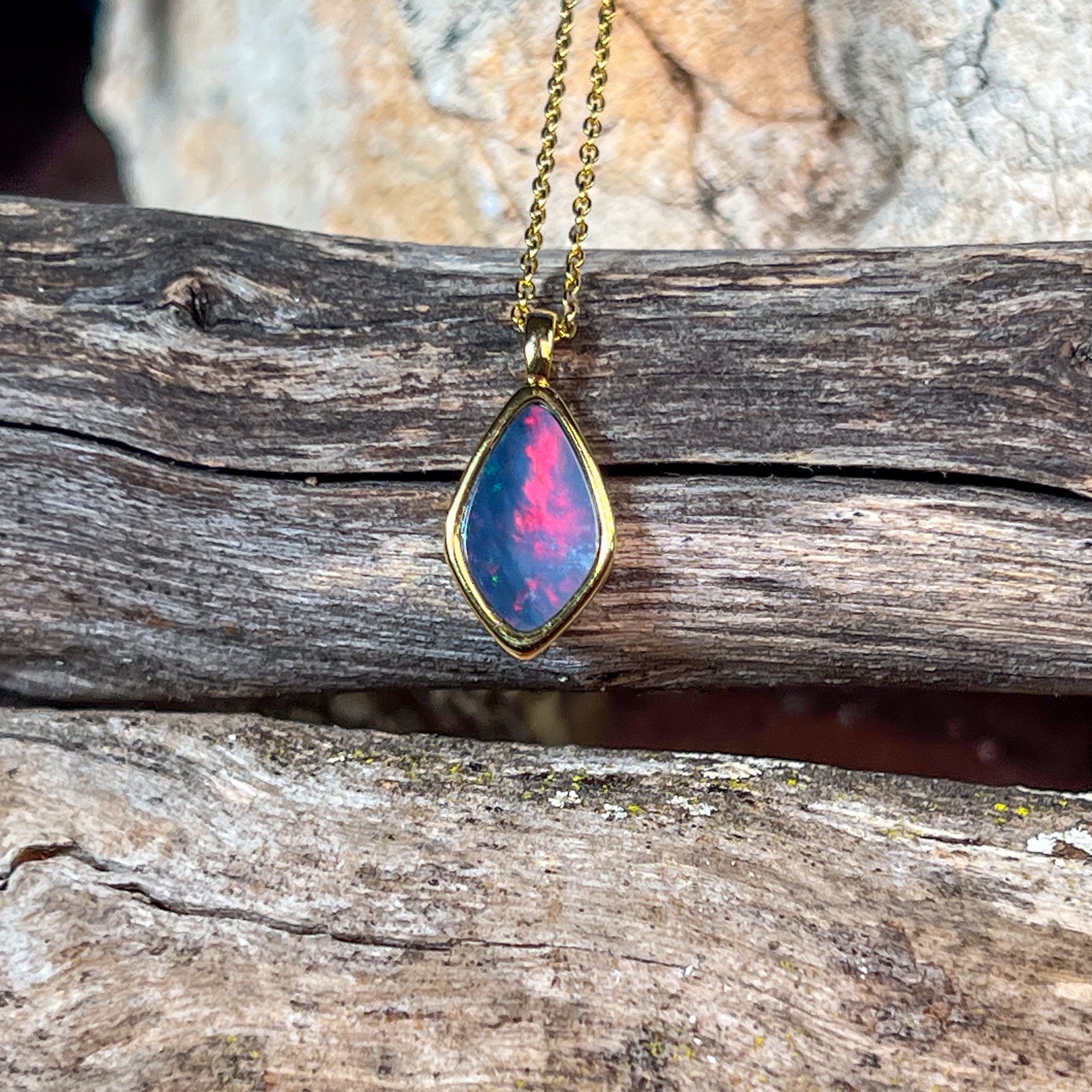 Gold plated silver kite shape Red Black Opal doublet pendant