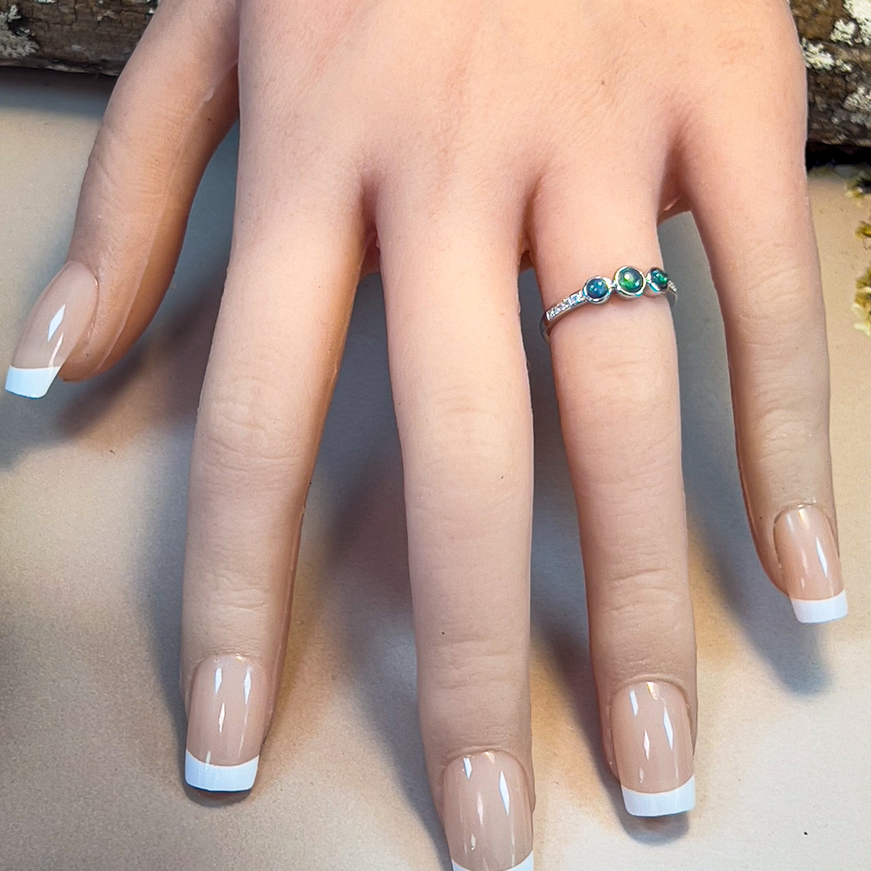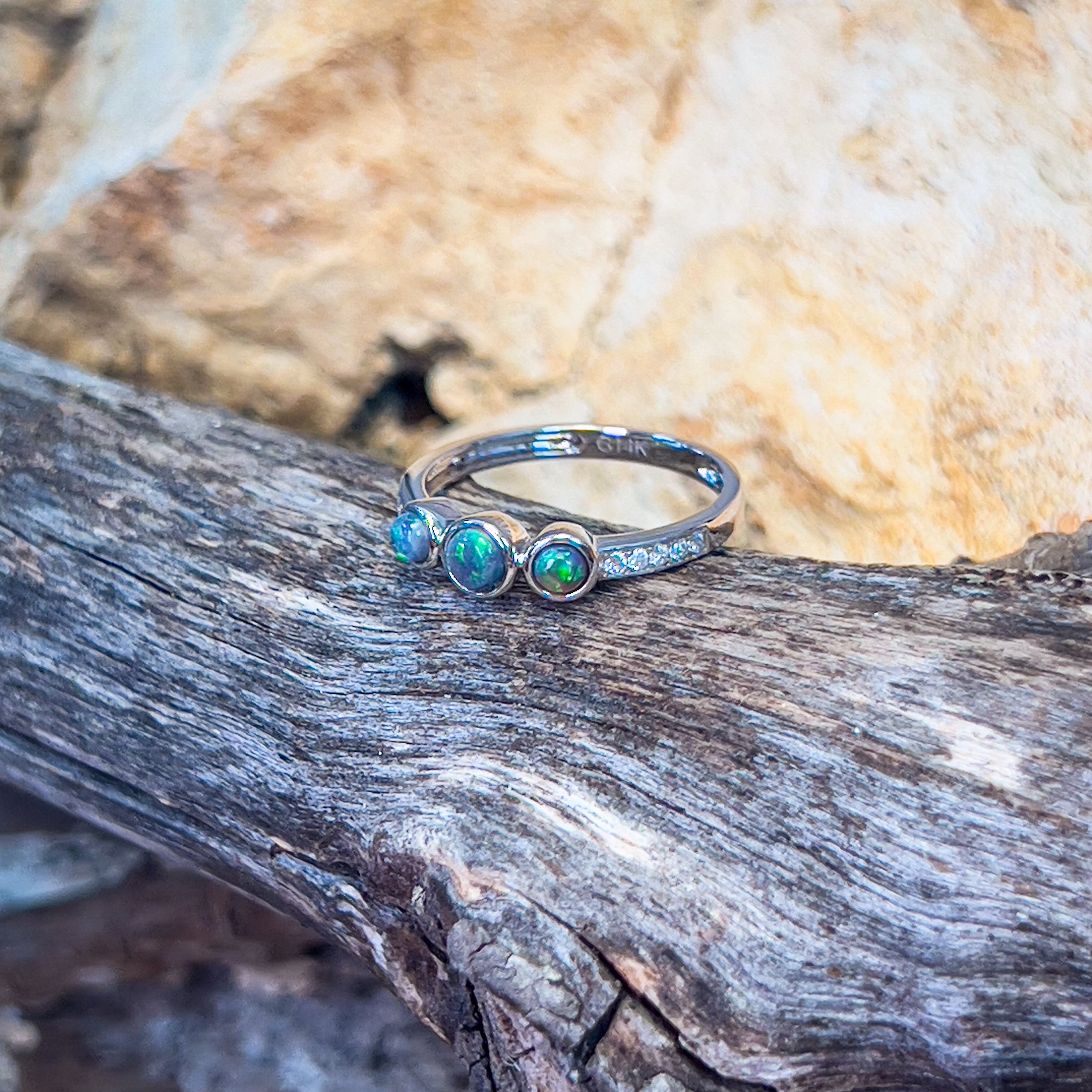 Shine bright with our 14kt White Gold 3 Black Opal and Diamond Ring. This dainty ring features stunning black opals and sparkling diamonds, sure to catch the eye. Stand out in style with this unique piece.