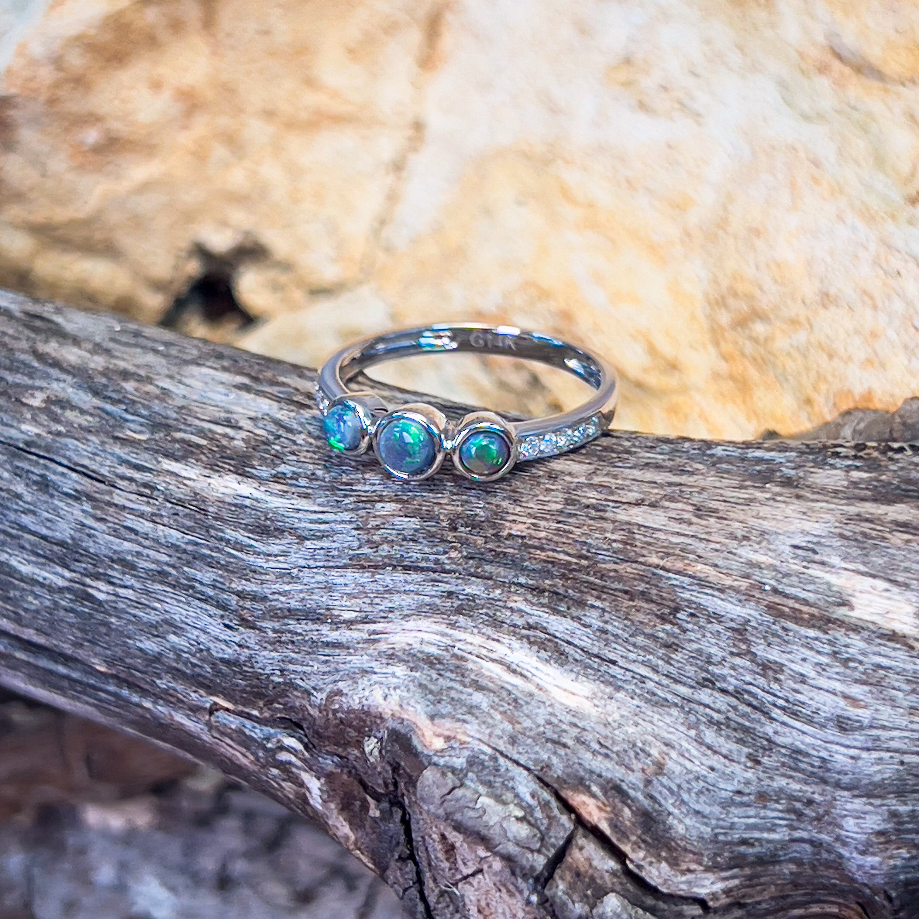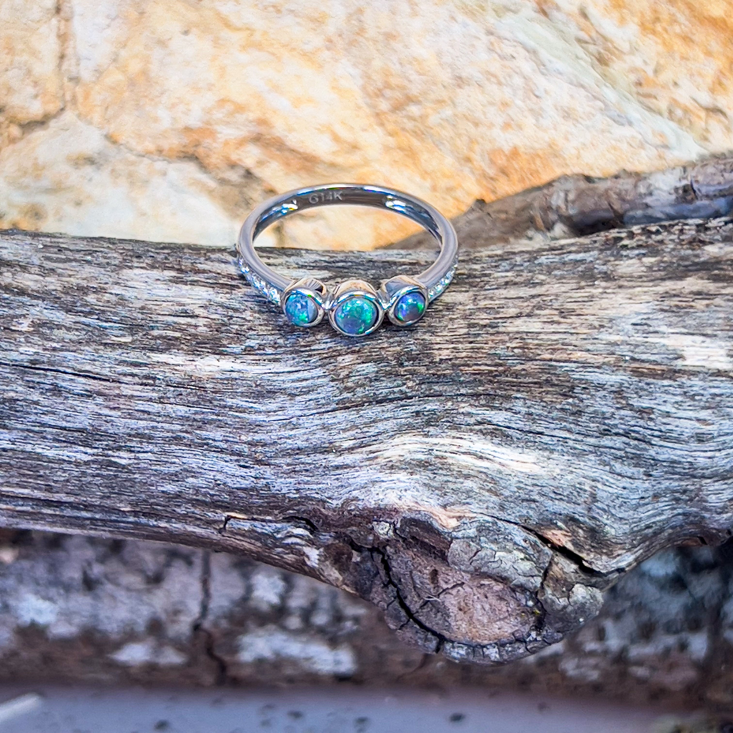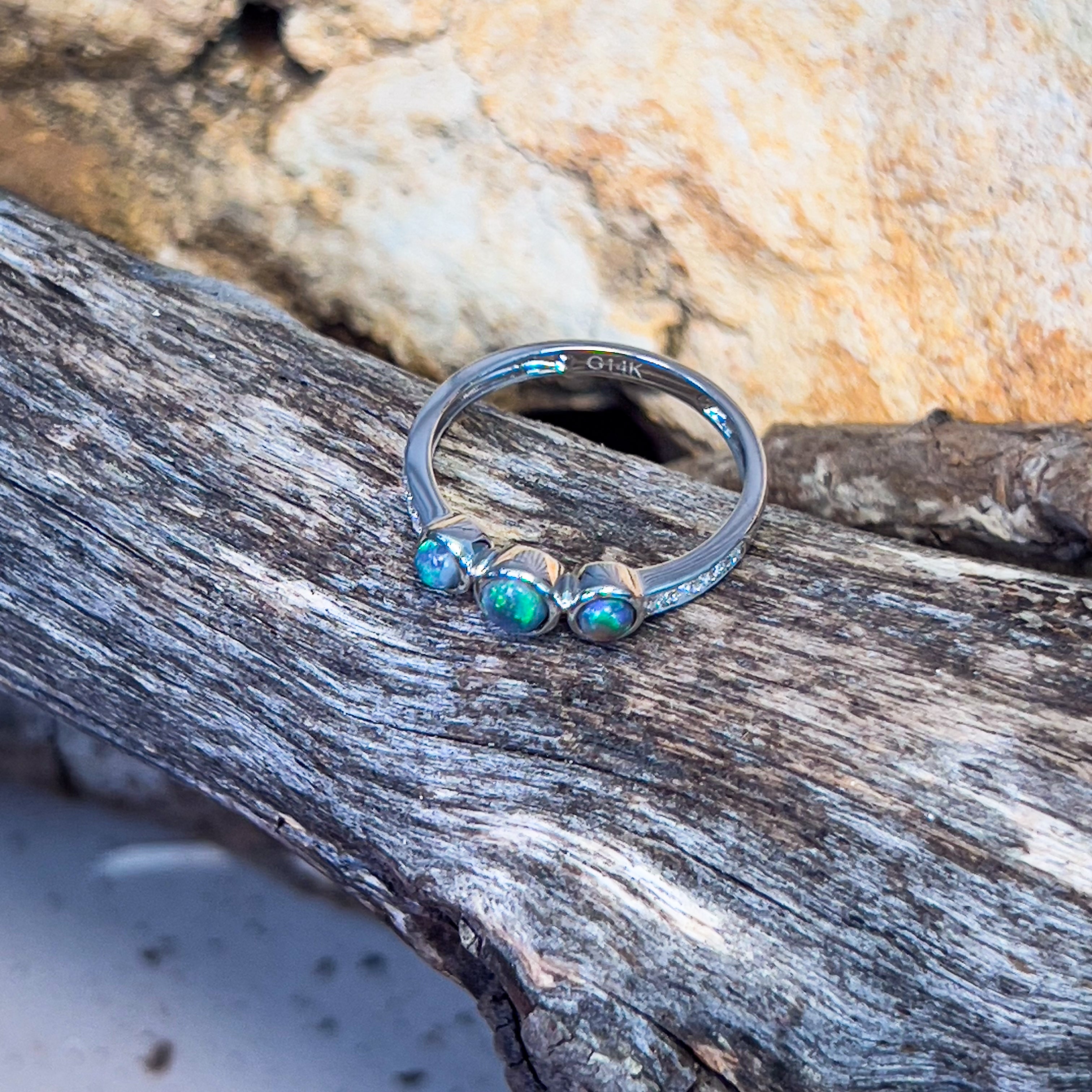 14kt White Gold 3 Black Opal and diamond ring