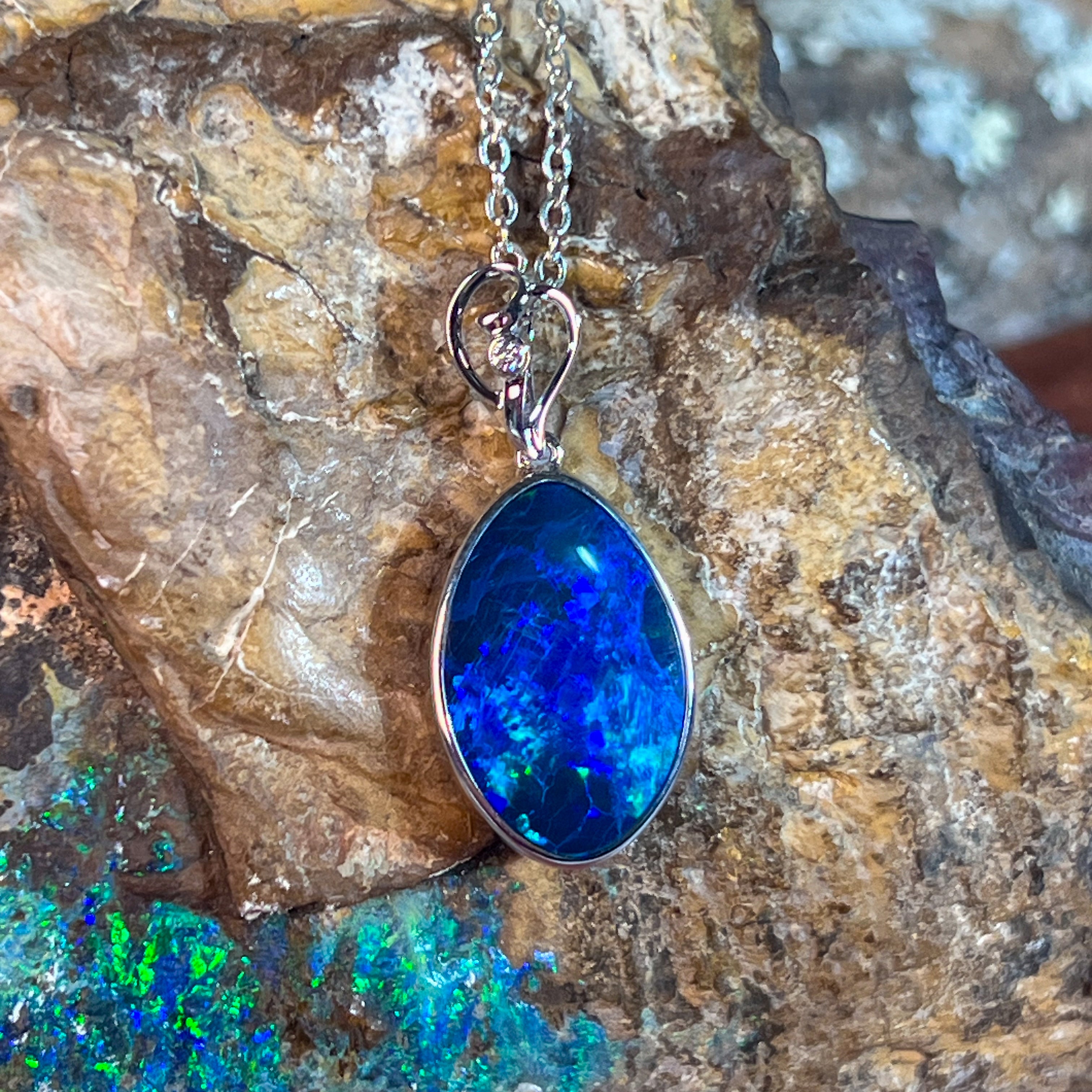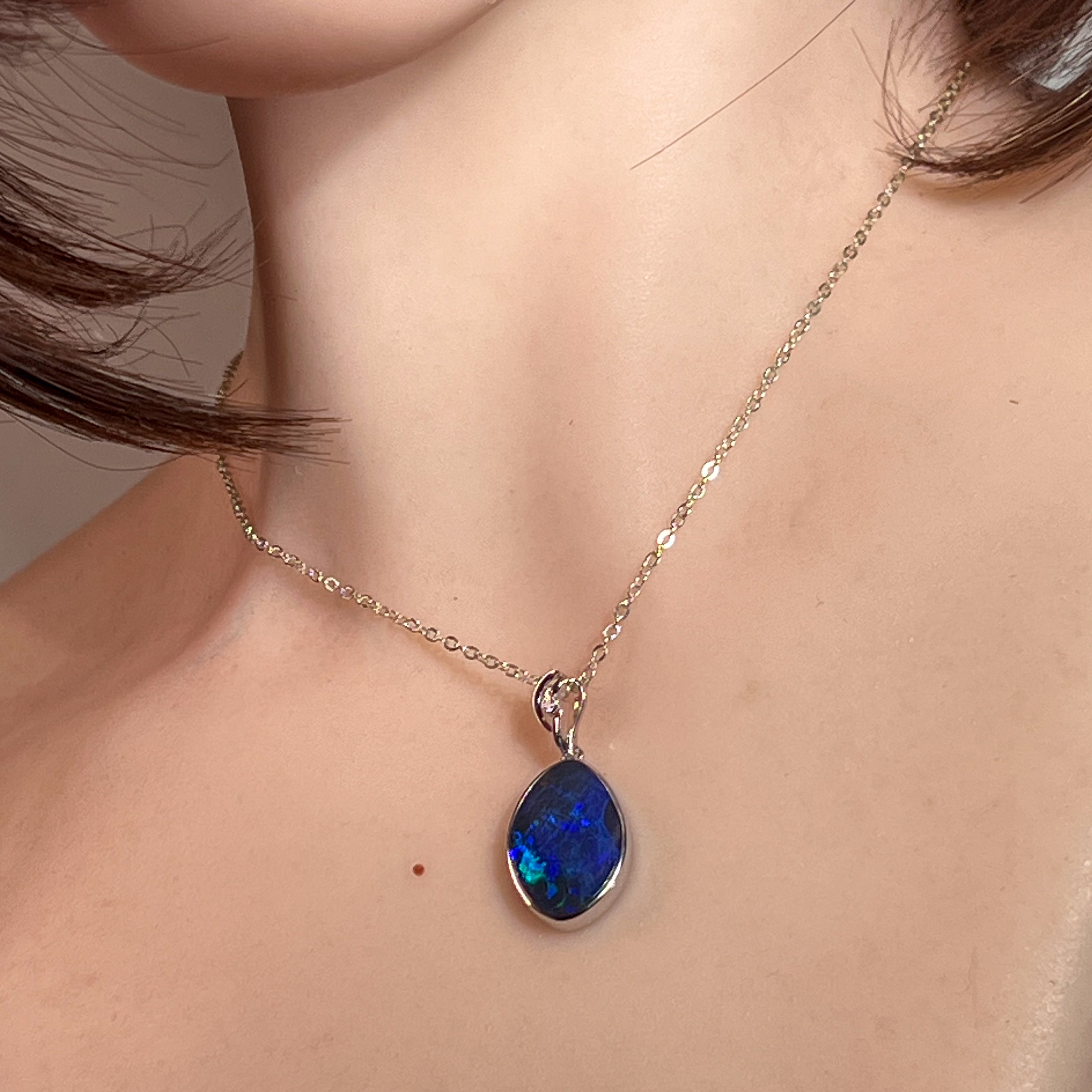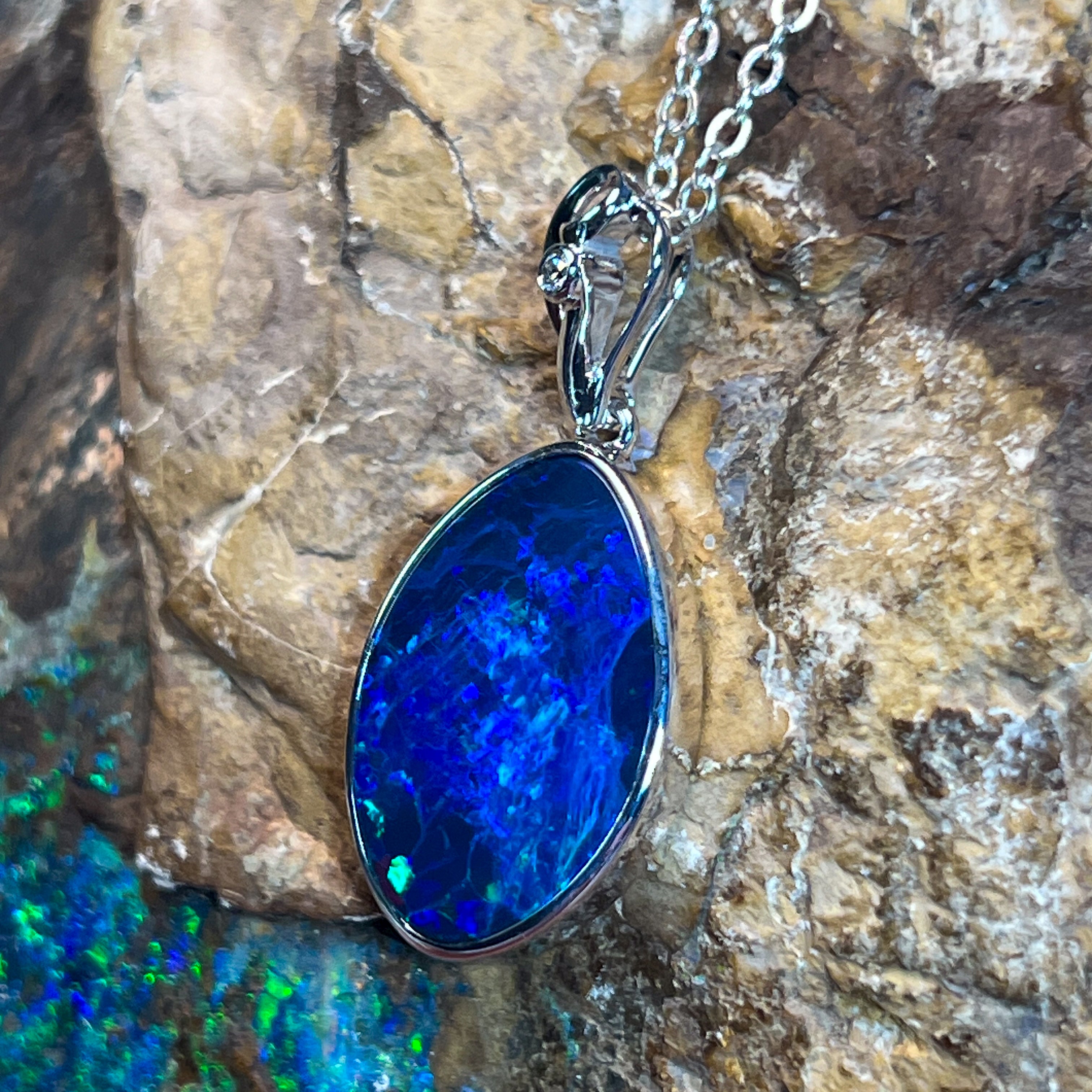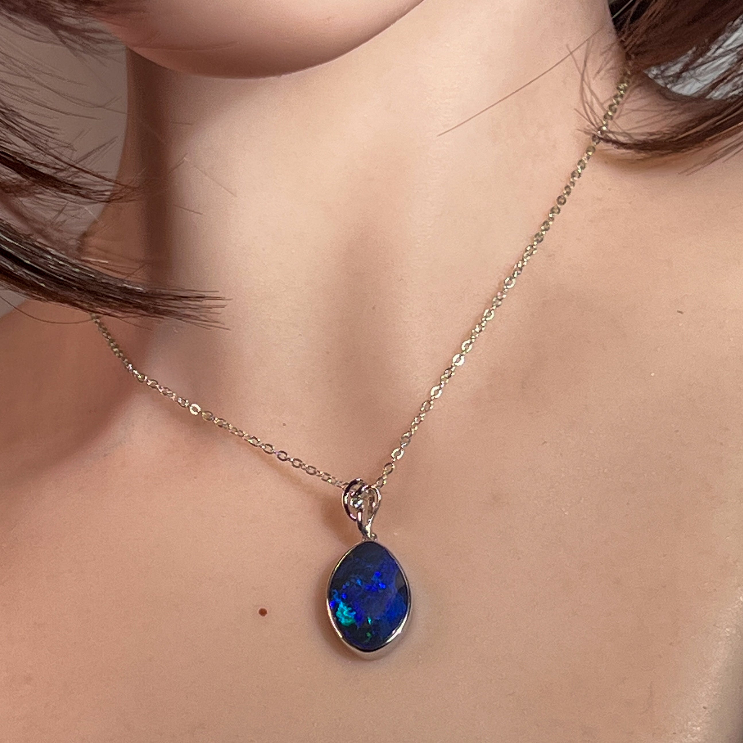 Elevate your style with this stunning 14kt white gold pendant featuring a large blue-green opal, bezel set for a sleek, secure finish. Its deep blue hues shimmer with every movement, making it a captivating centerpiece for any outfit. Perfect for those who appreciate bold elegance and timeless beauty.