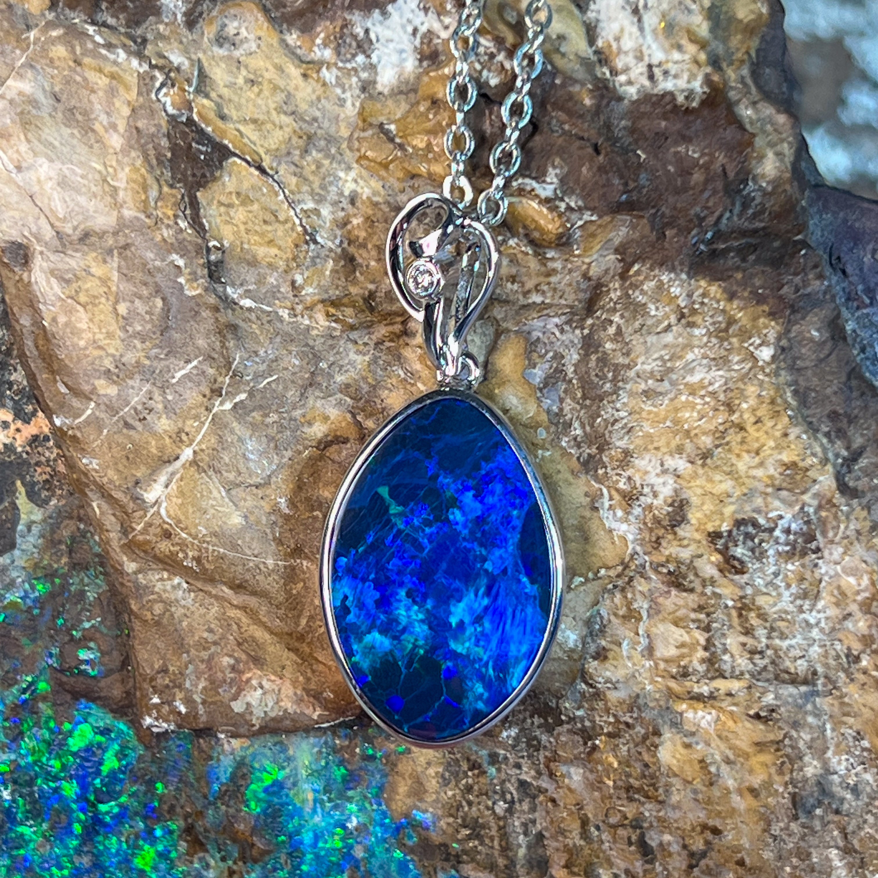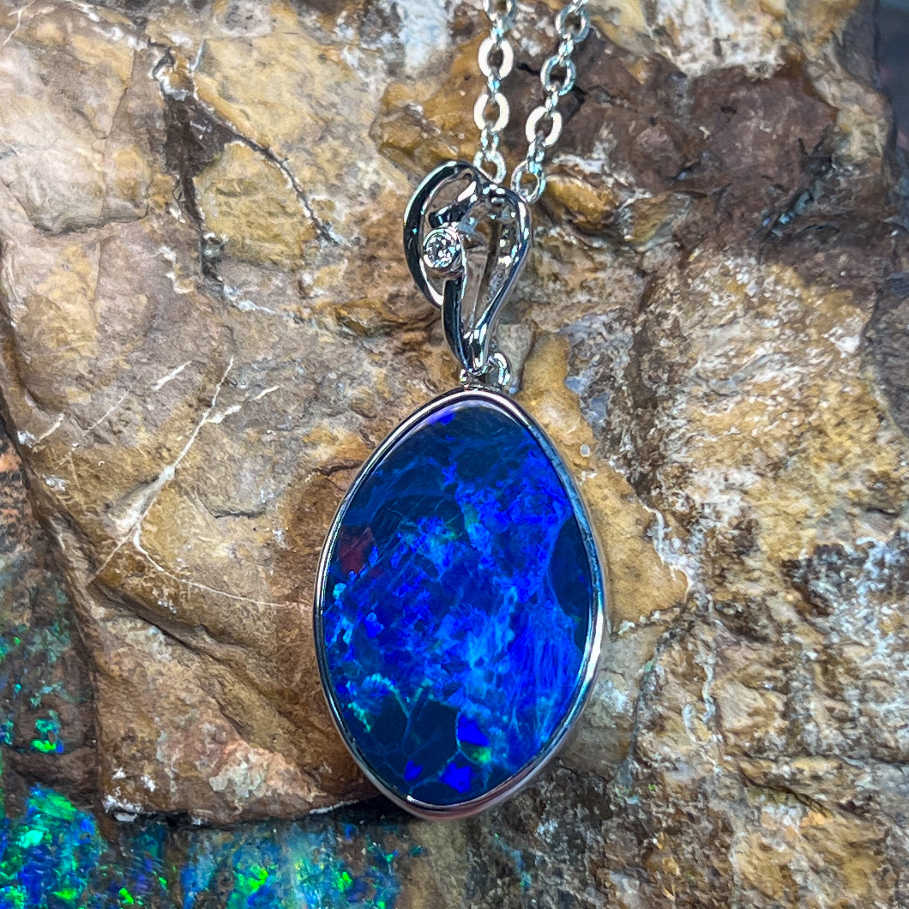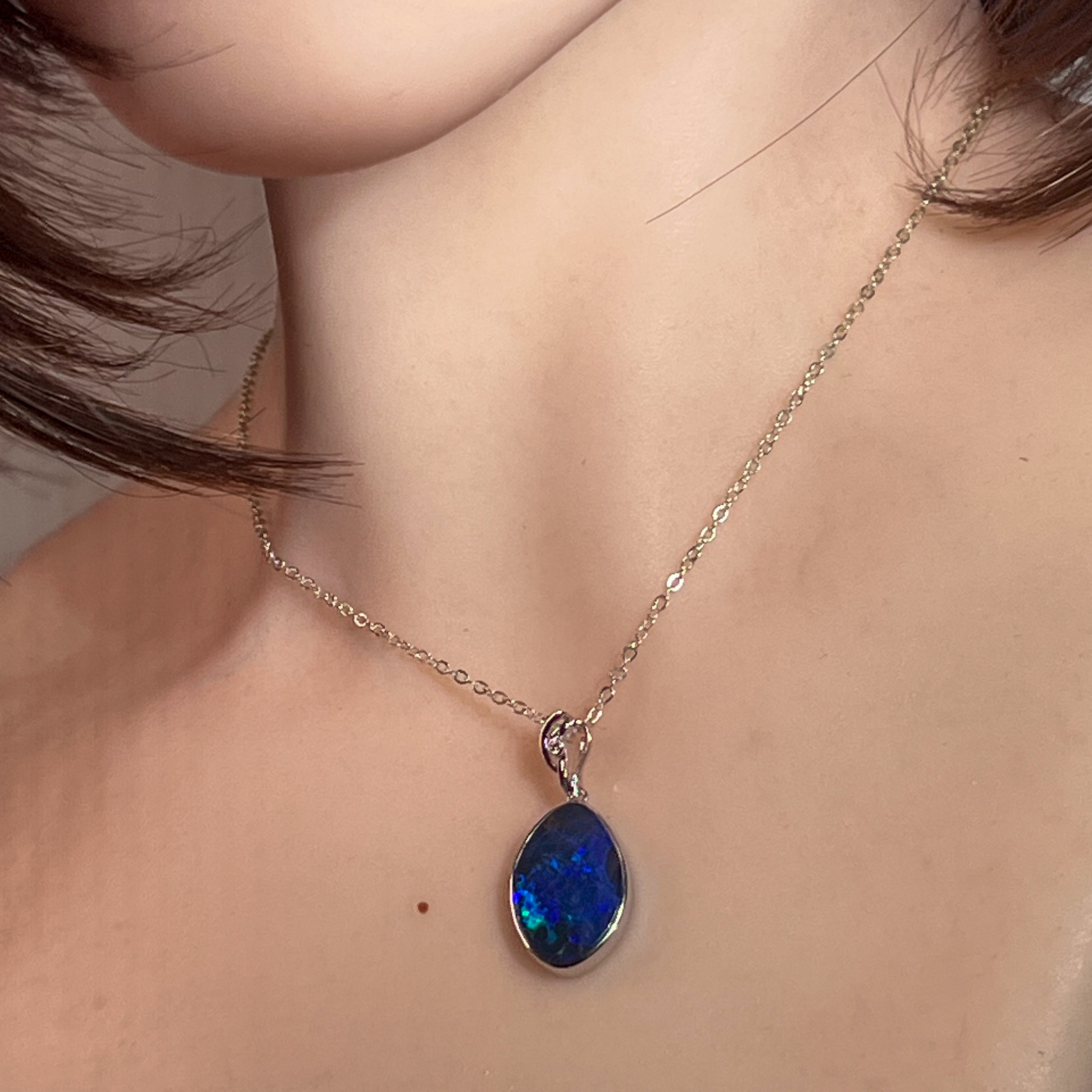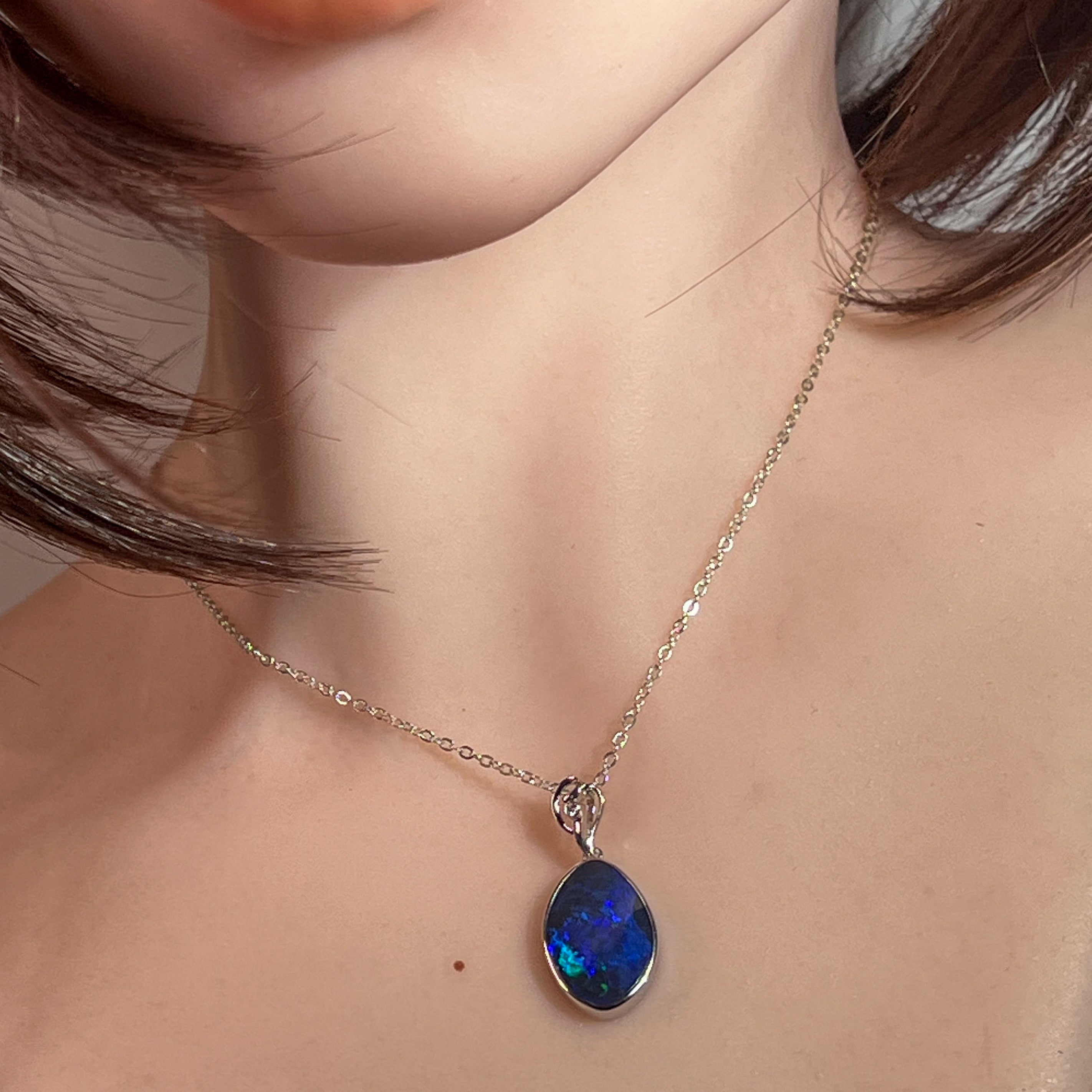Elevate your style with this stunning 14kt white gold pendant featuring a large blue-green opal, bezel set for a sleek, secure finish. Its deep blue hues shimmer with every movement, making it a captivating centerpiece for any outfit. Perfect for those who appreciate bold elegance and timeless beauty.