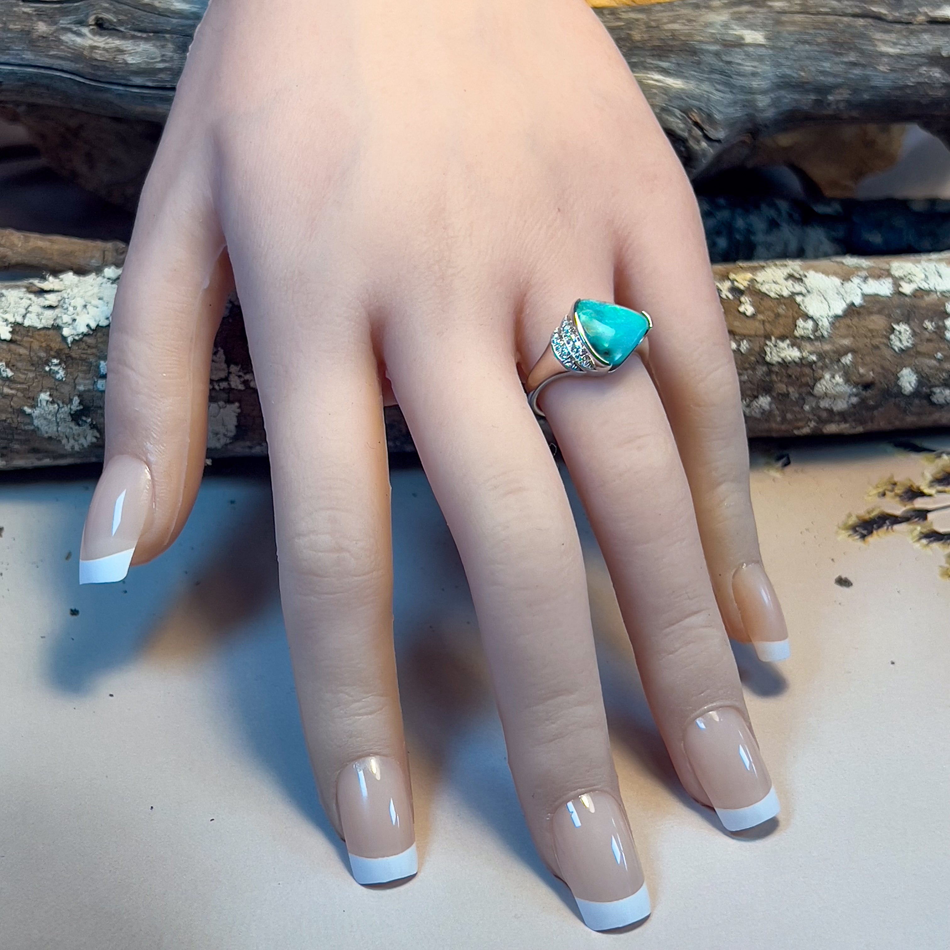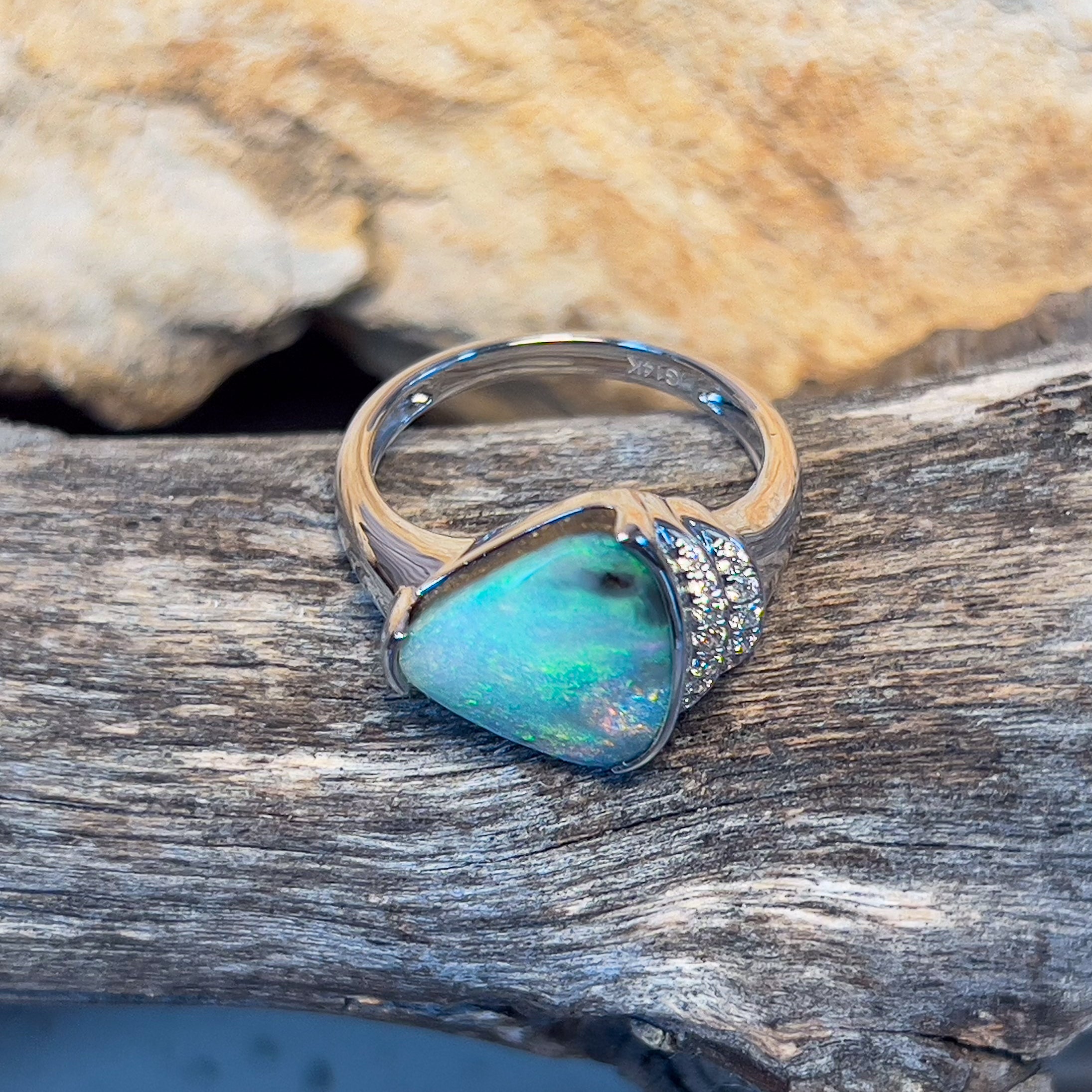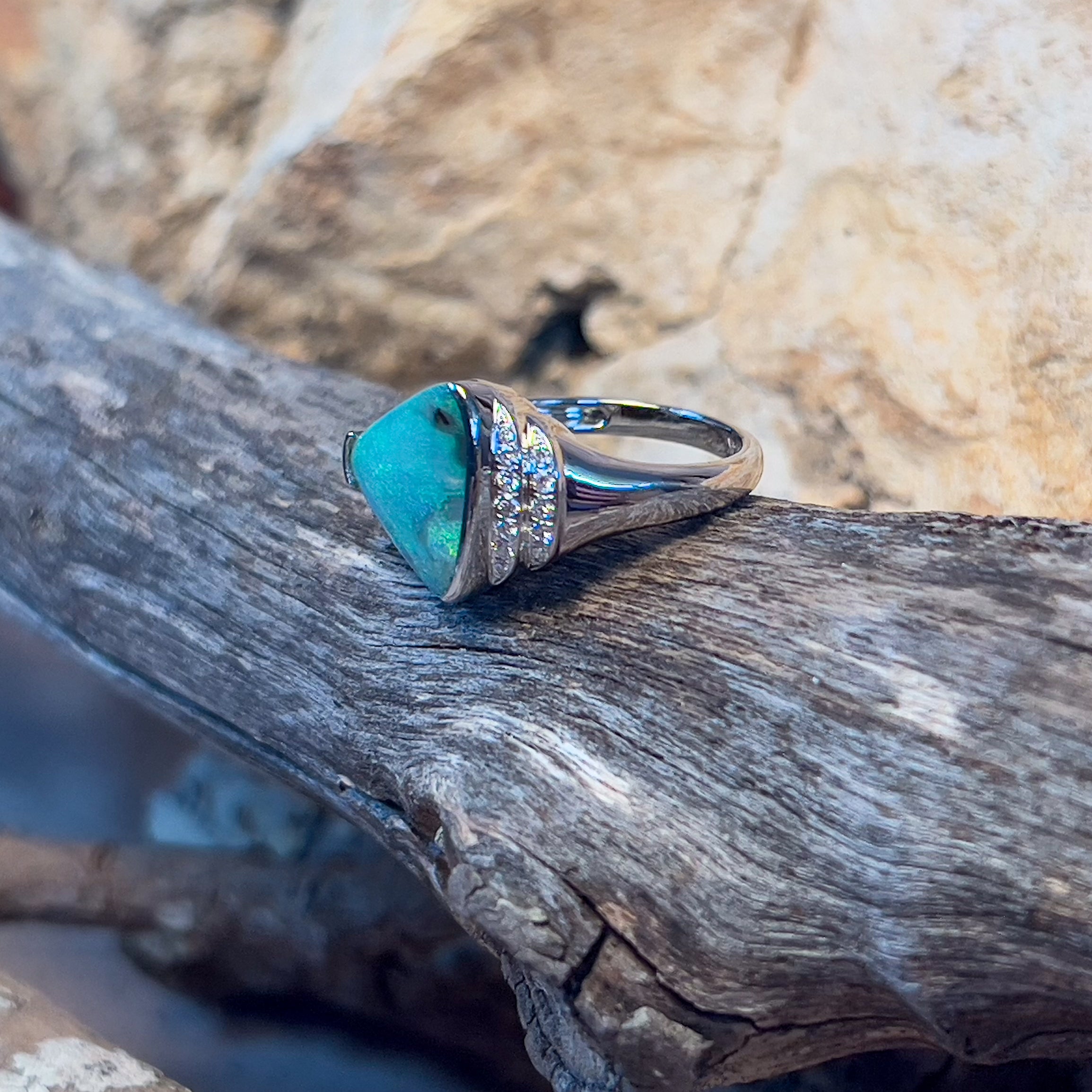 Experience the captivating beauty of our 14kt White Gold Boulder Opal Ring, featuring a stunning 3.9ct aqua blue Queensland Boulder opal. Surrounded by sparkling diamonds, this opal jewellery piece exudes elegance and charm. Elevate any outfit with the mesmerizing colors of this unique gemstone.