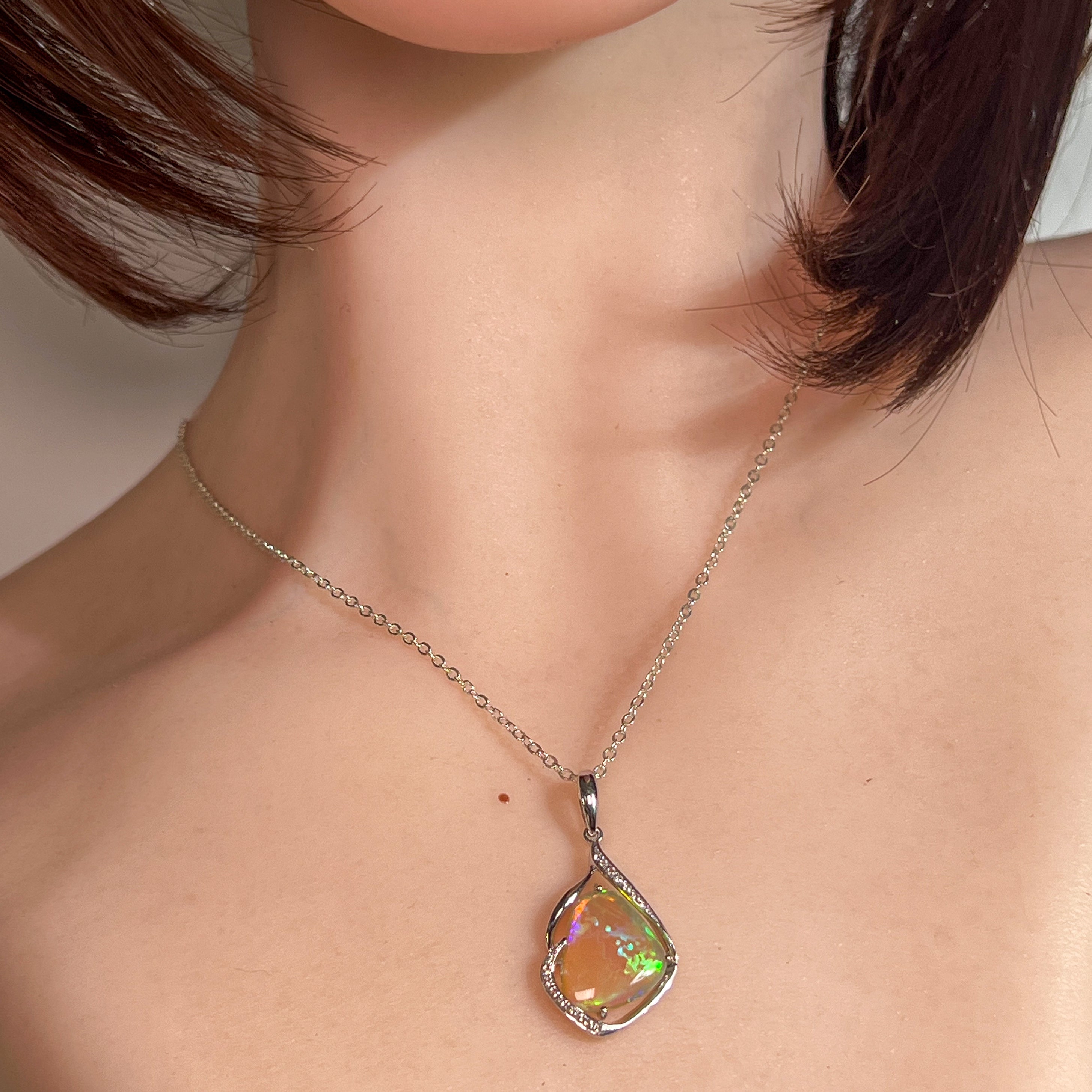 Indulge in fine jewellery with our 14kt White Gold Crystal Opal 2.77ct and White Sapphires 0.10ct pendant. This opulent necklace is the perfect addition to any woman's collection. The mesmerizing crystal opal shines with 2.77 carats of brilliance, complimented by 0.10 carats of sparkling white sapphires. A luxurious choice for any occasion.