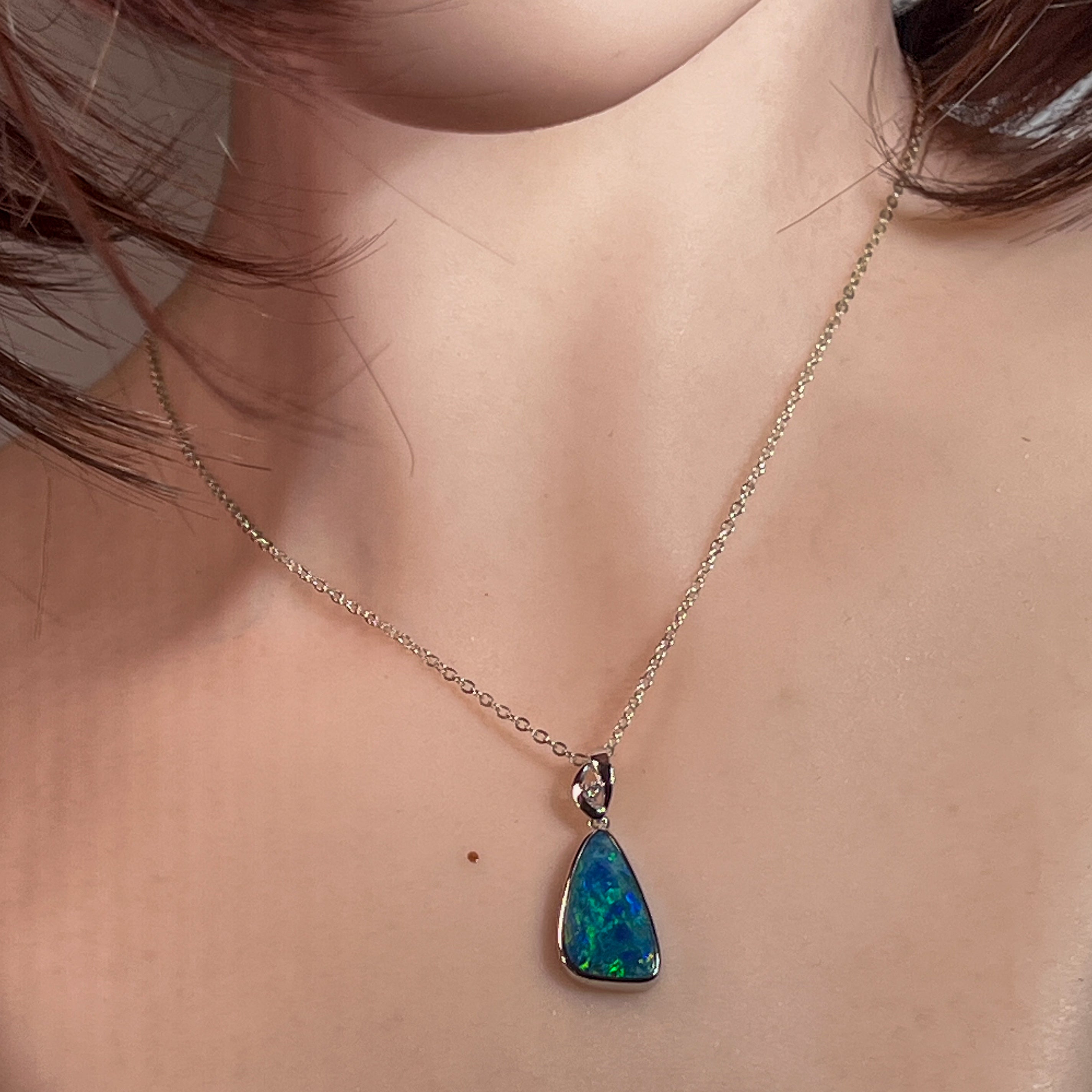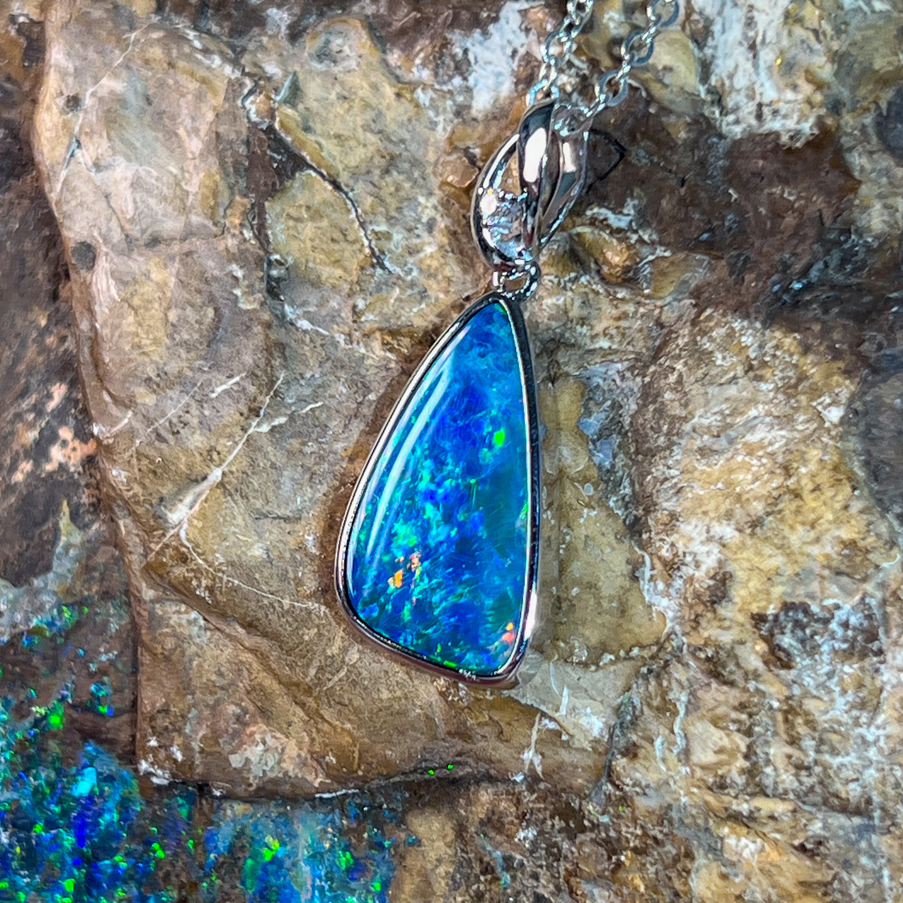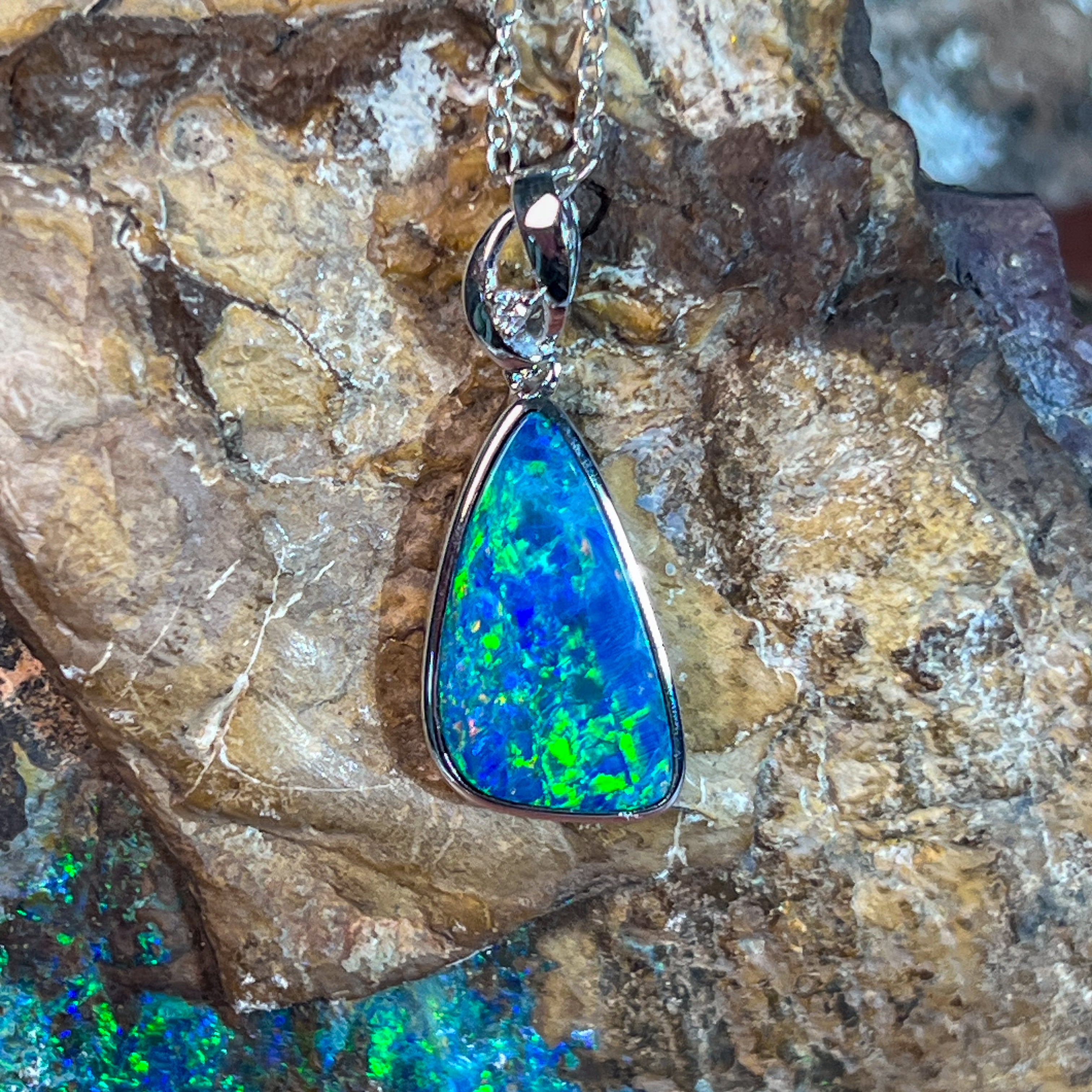 This stunning 14kt white gold pendant features a striking drop style design with a large triangular opal doublet weighing 4.95 carats. Its sharp, vibrant colors captivate the eye, enhanced by sparkling diamonds that add brilliance and elegance. Perfect for making a bold statement, this pendant combines unique artistry with timeless sophistication.