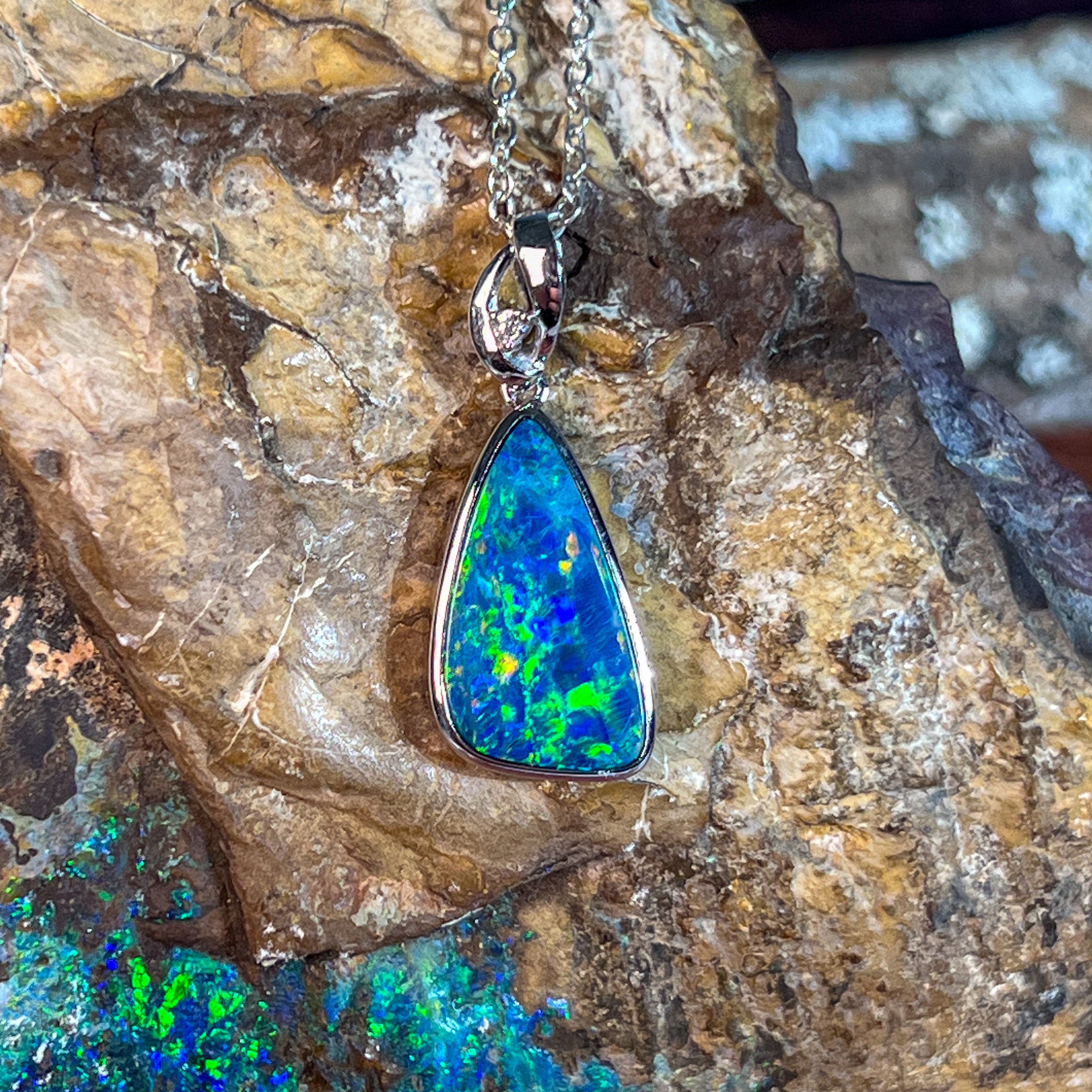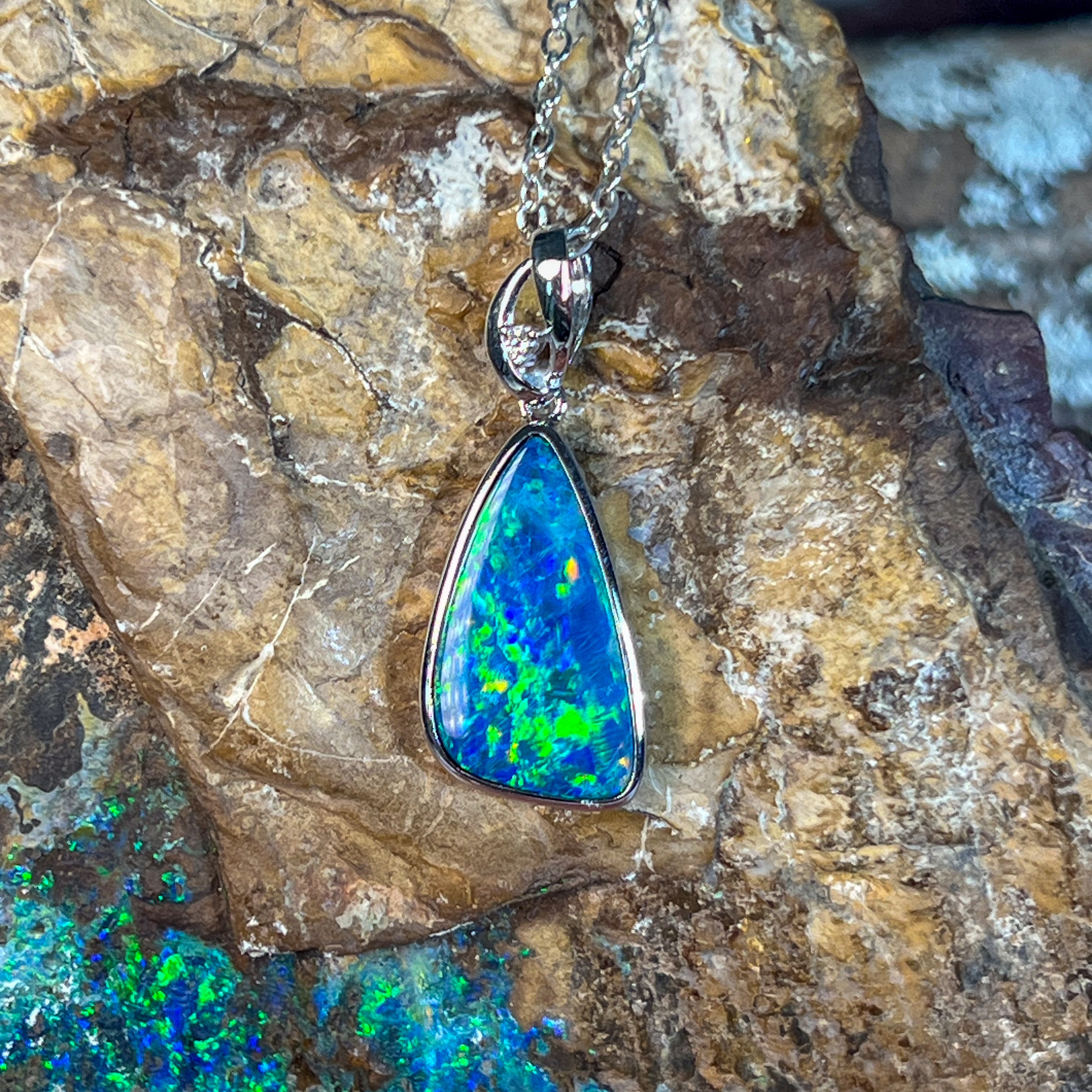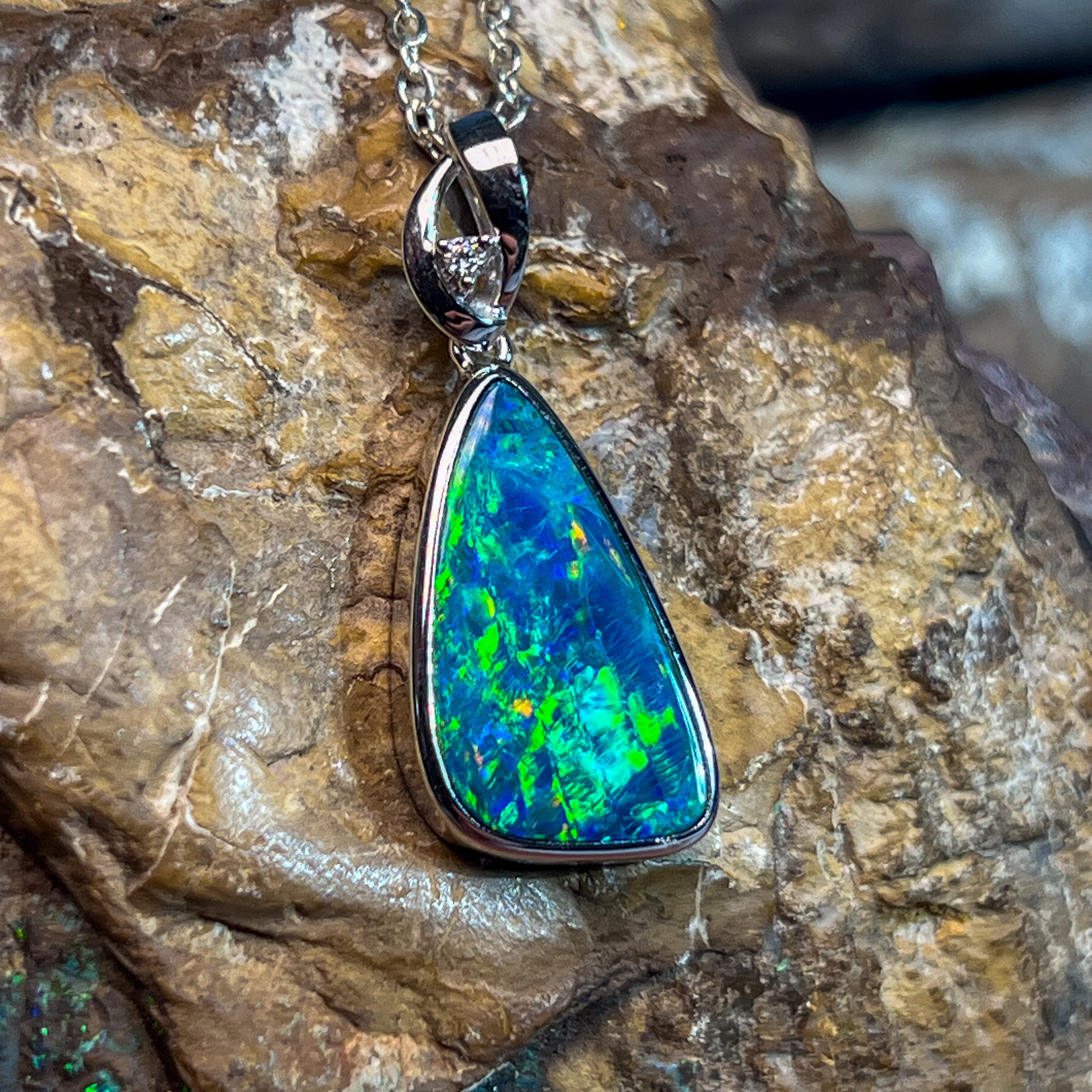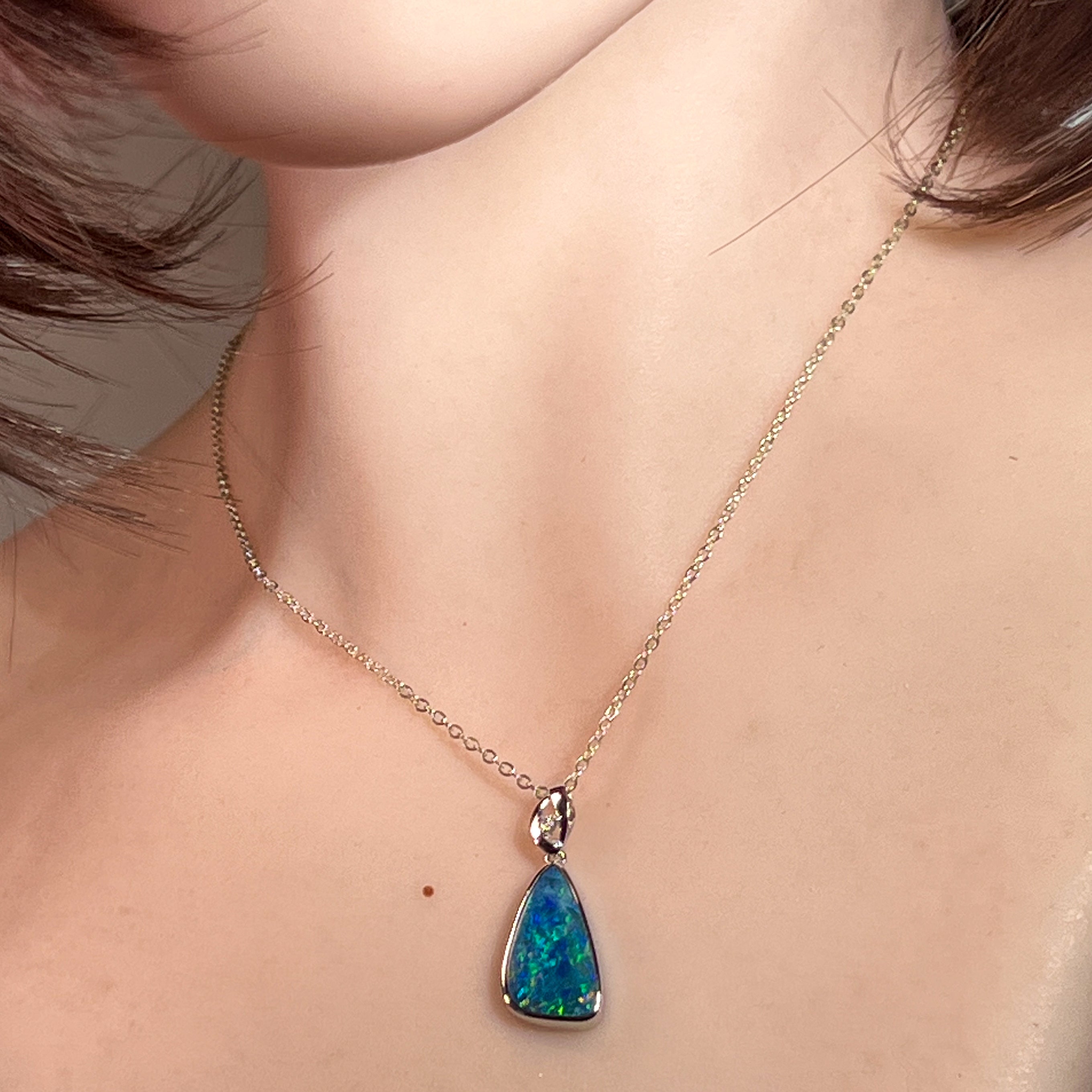 This stunning 14kt white gold pendant features a striking drop style design with a large triangular opal doublet weighing 4.95 carats. Its sharp, vibrant colors captivate the eye, enhanced by sparkling diamonds that add brilliance and elegance. Perfect for making a bold statement, this pendant combines unique artistry with timeless sophistication.