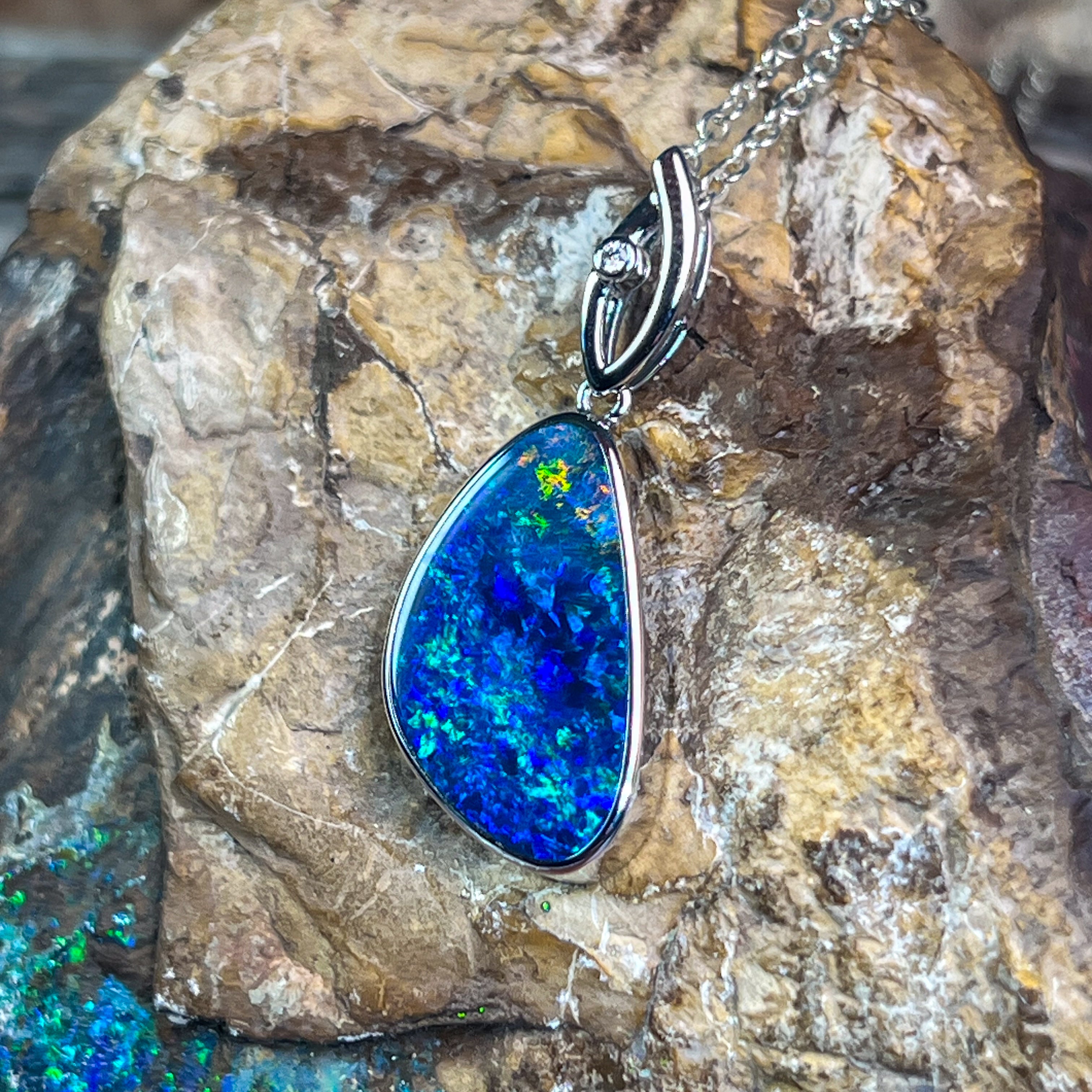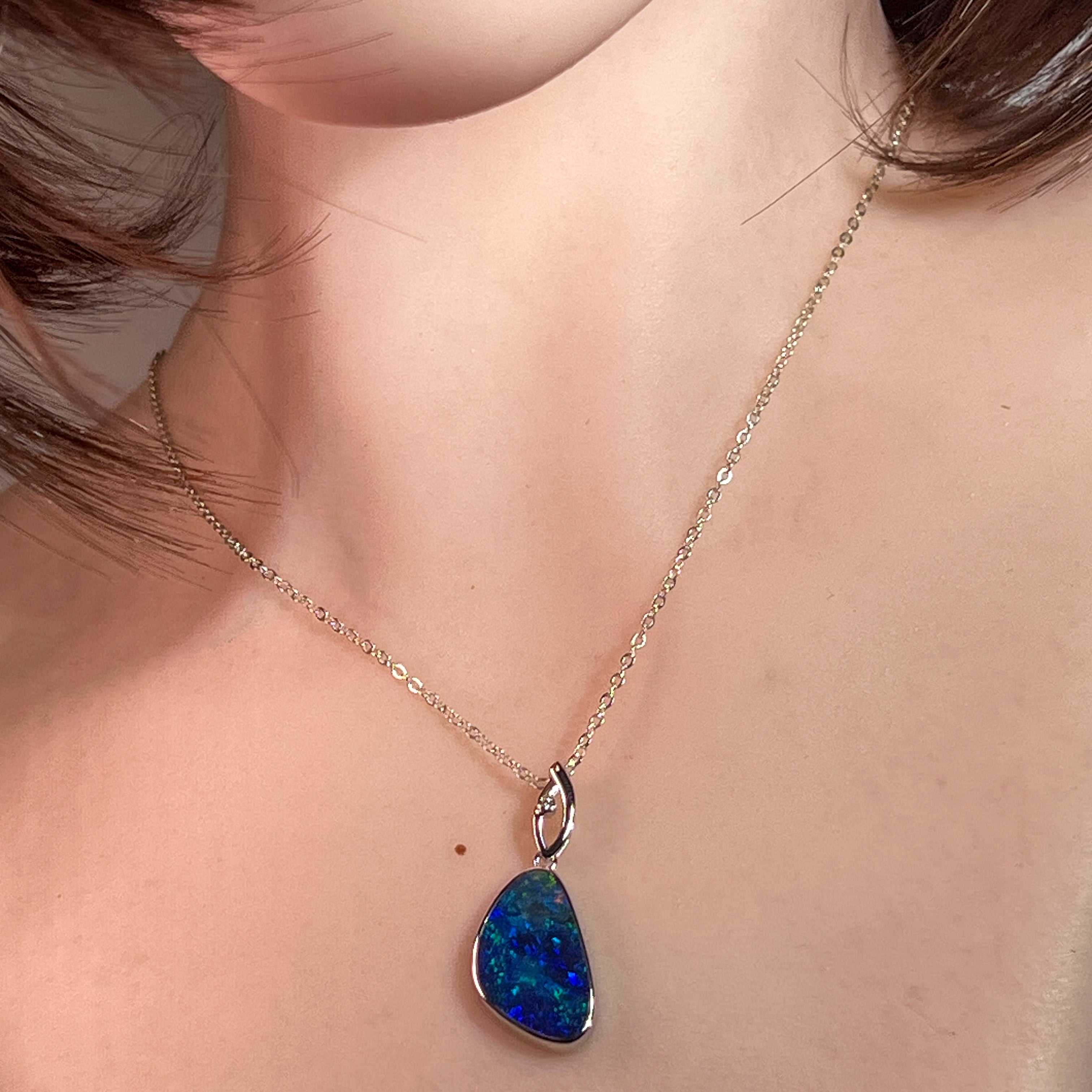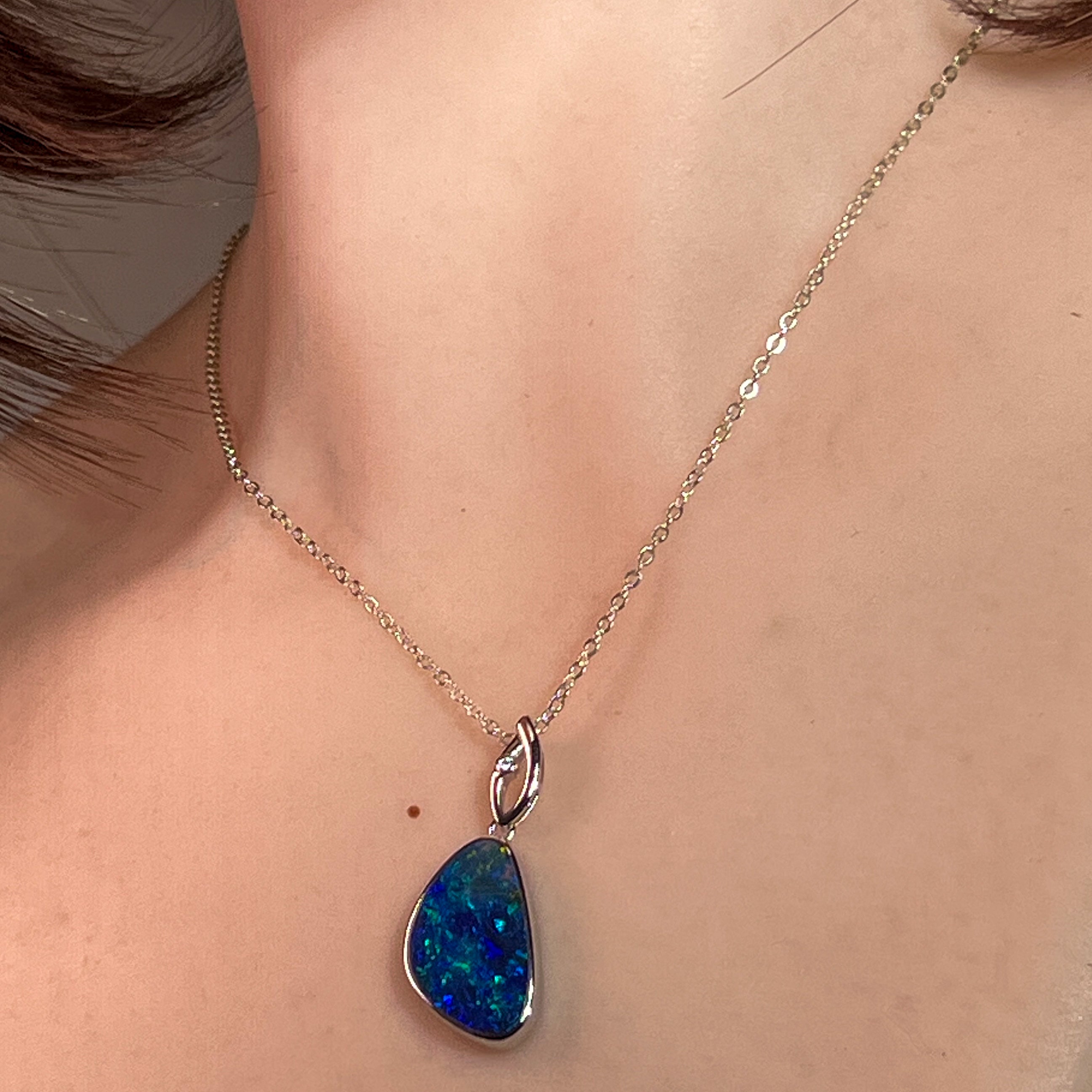 Elevate your style with this stunning 14kt white gold pendant featuring a large, blue-green opal doublet in a unique triangle shape. Its vibrant colors catch the light beautifully, making it a captivating centerpiece for any outfit. Crafted with quality and elegance, this pendant offers a timeless accessory that enhances your look with a touch of sophistication and natural beauty. Perfect for those who appreciate distinctive, eye-catching jewelry.