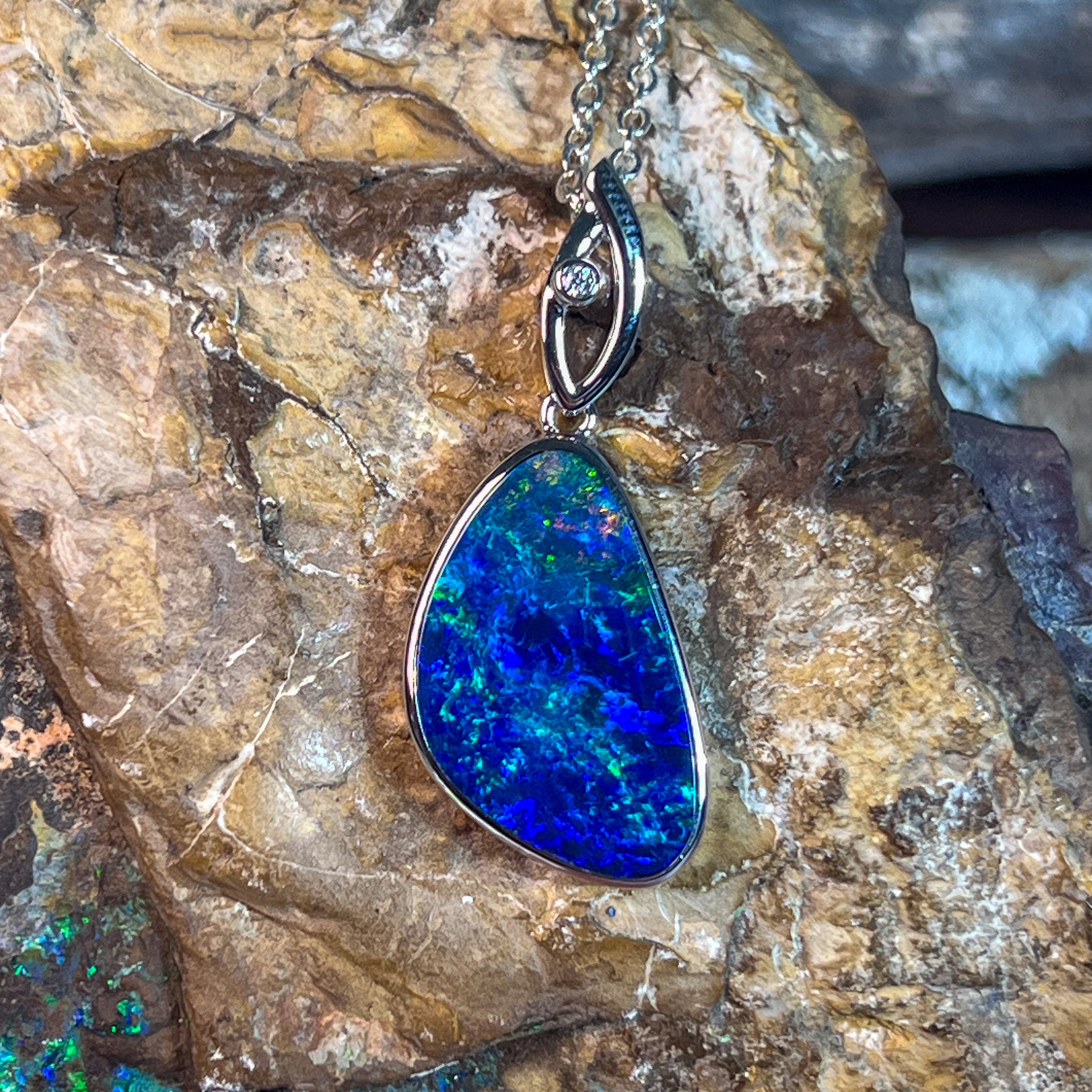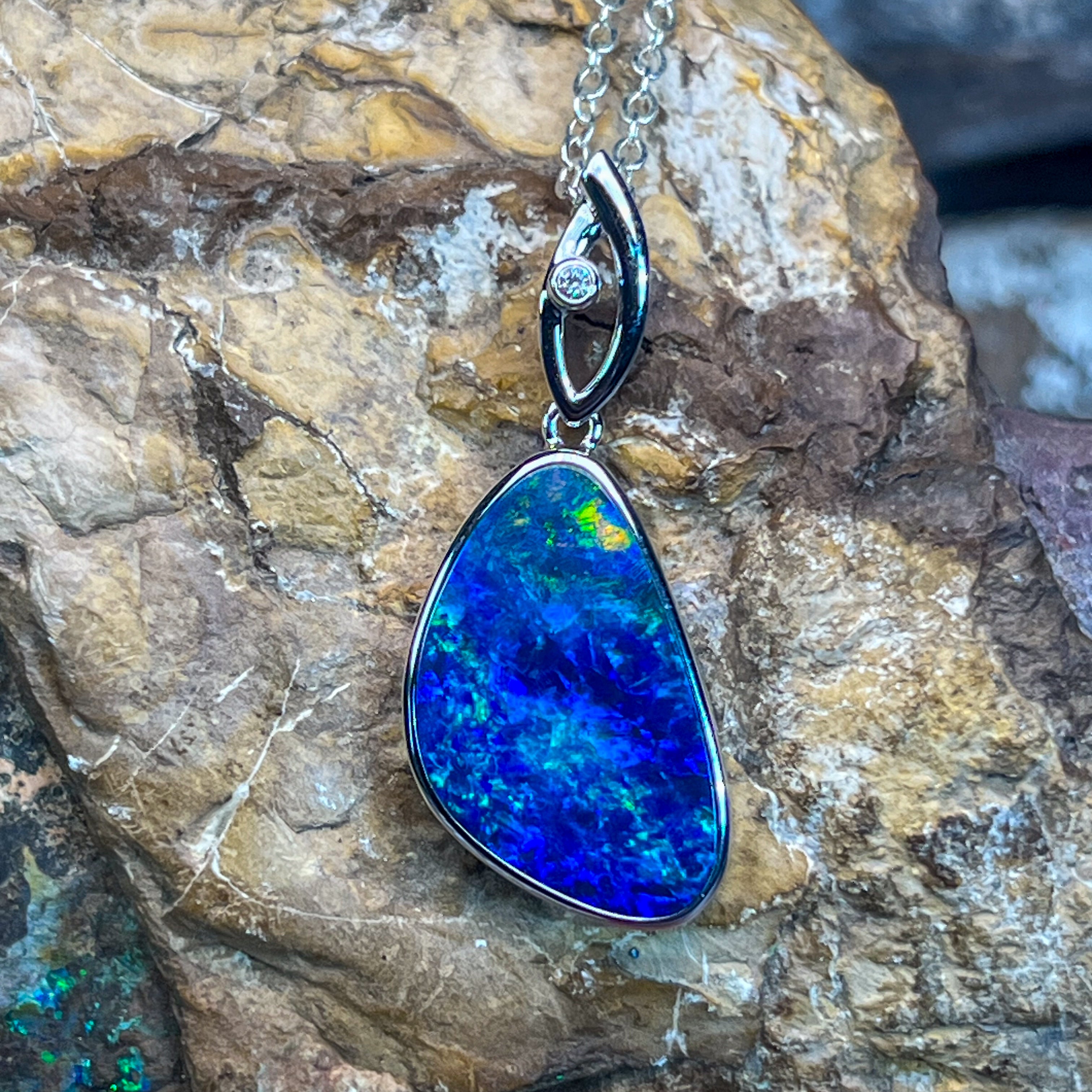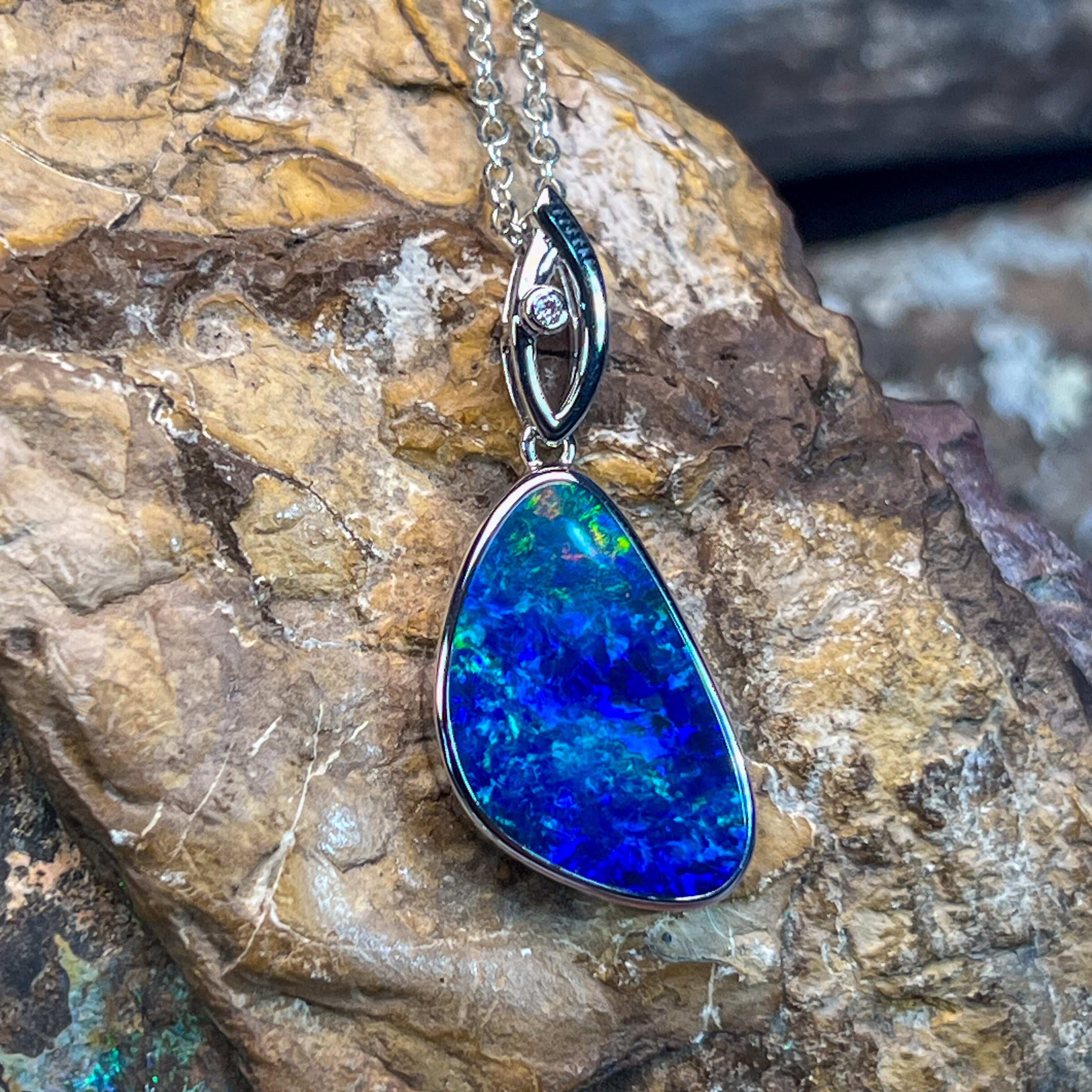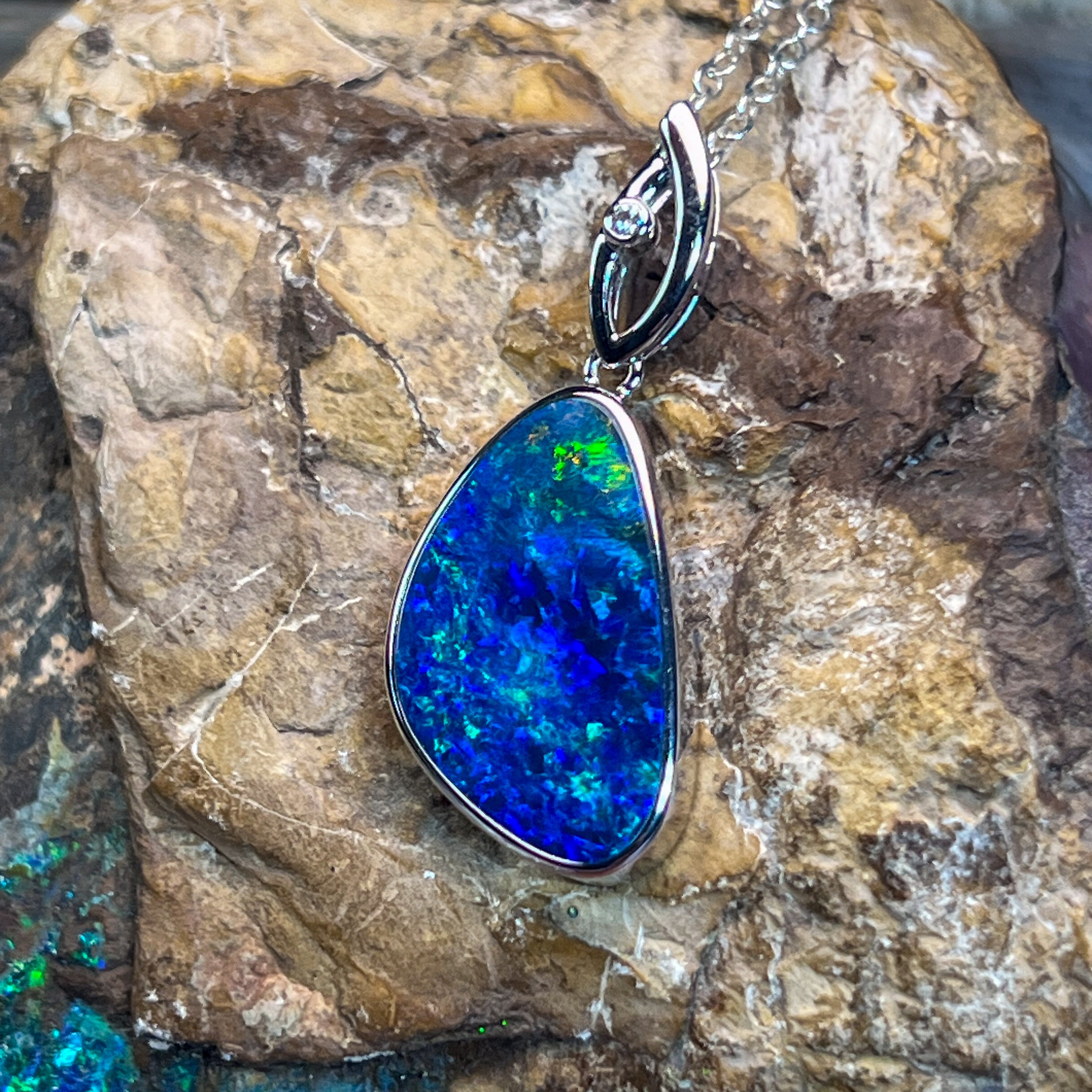 Elevate your style with this stunning 14kt white gold pendant featuring a large, blue-green opal doublet in a unique triangle shape. Its vibrant colors catch the light beautifully, making it a captivating centerpiece for any outfit. Crafted with quality and elegance, this pendant offers a timeless accessory that enhances your look with a touch of sophistication and natural beauty. Perfect for those who appreciate distinctive, eye-catching jewelry.