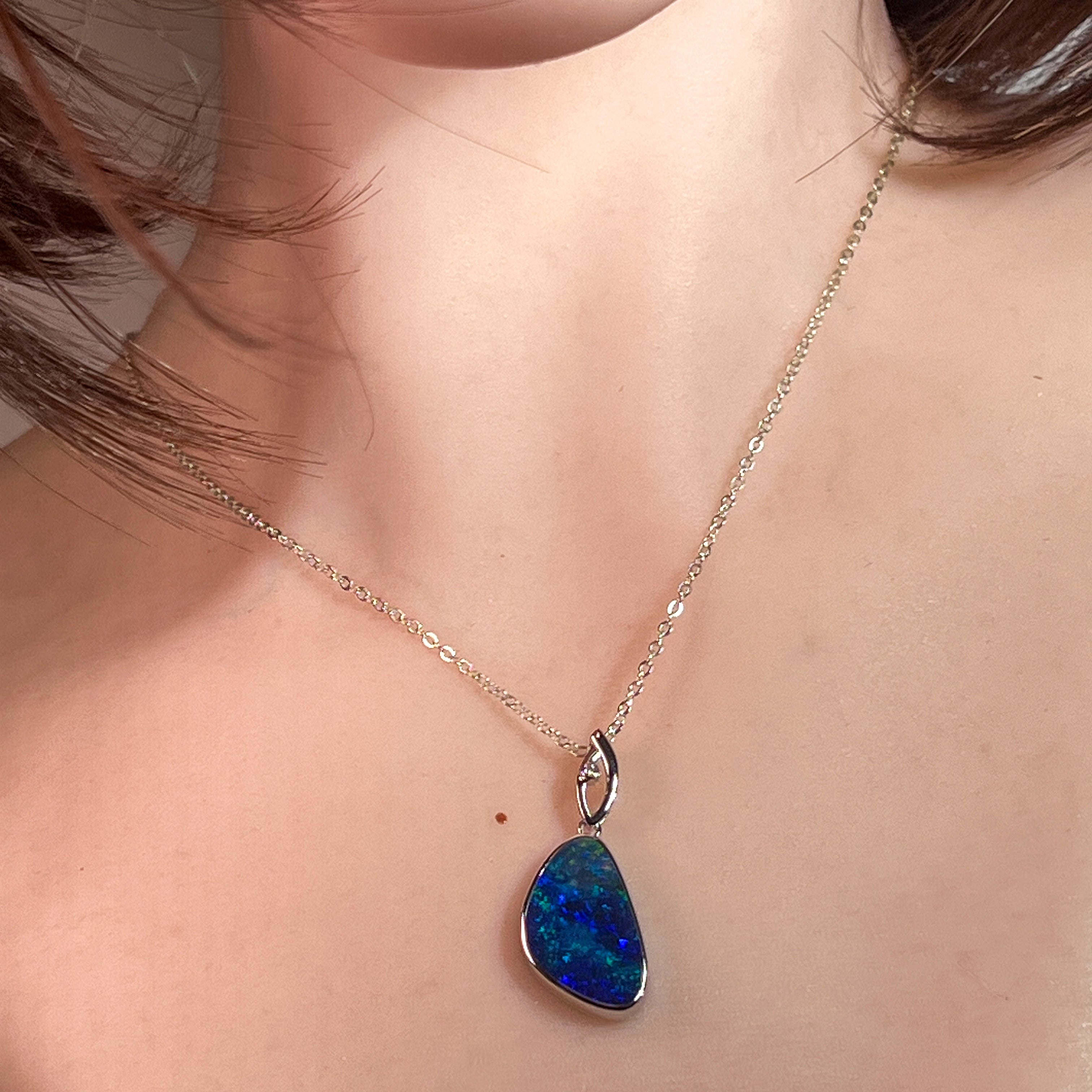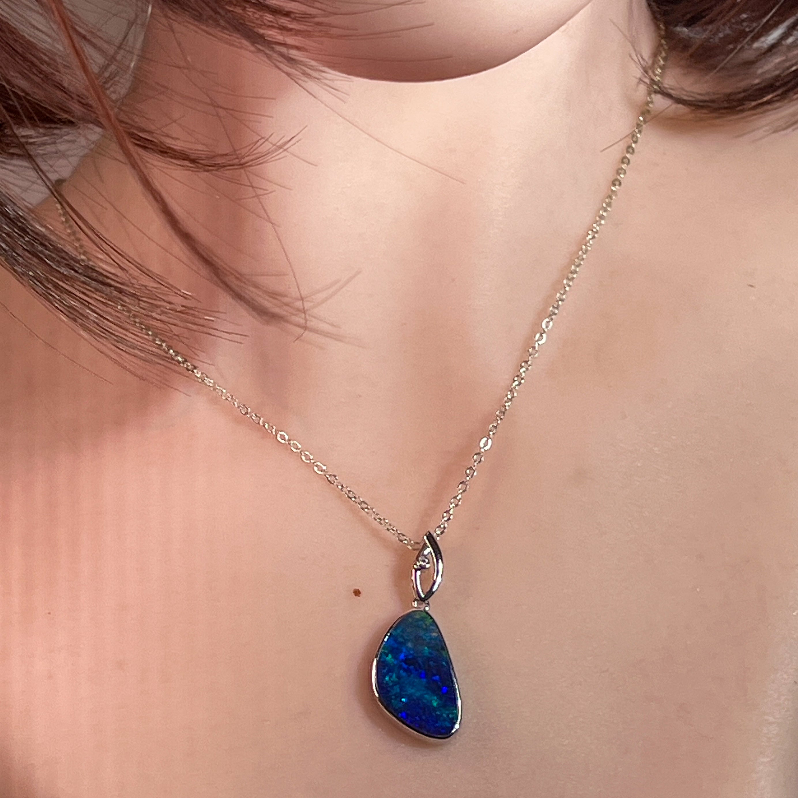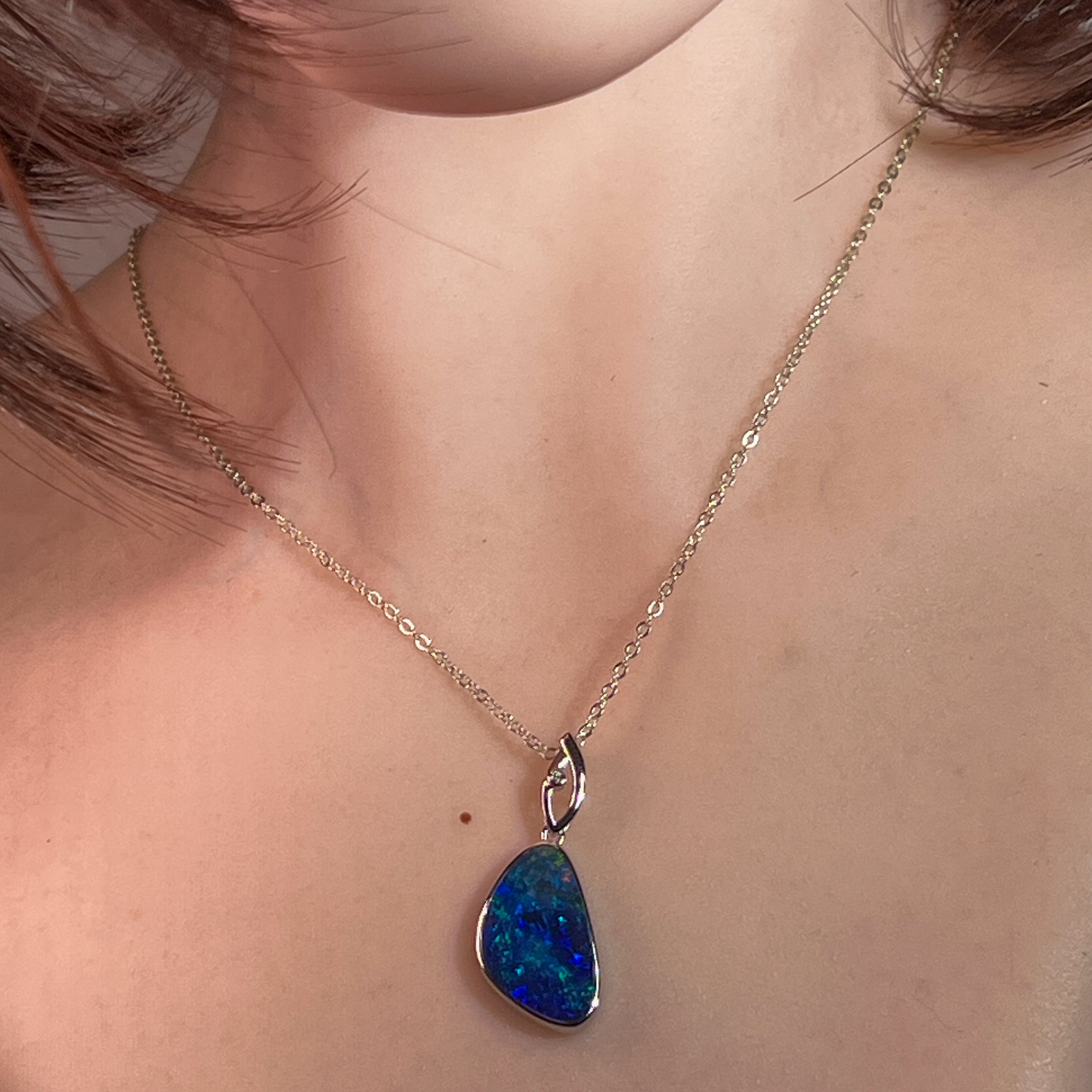 14kt White Gold large Opal doublet Blue Green traingle shape pendant