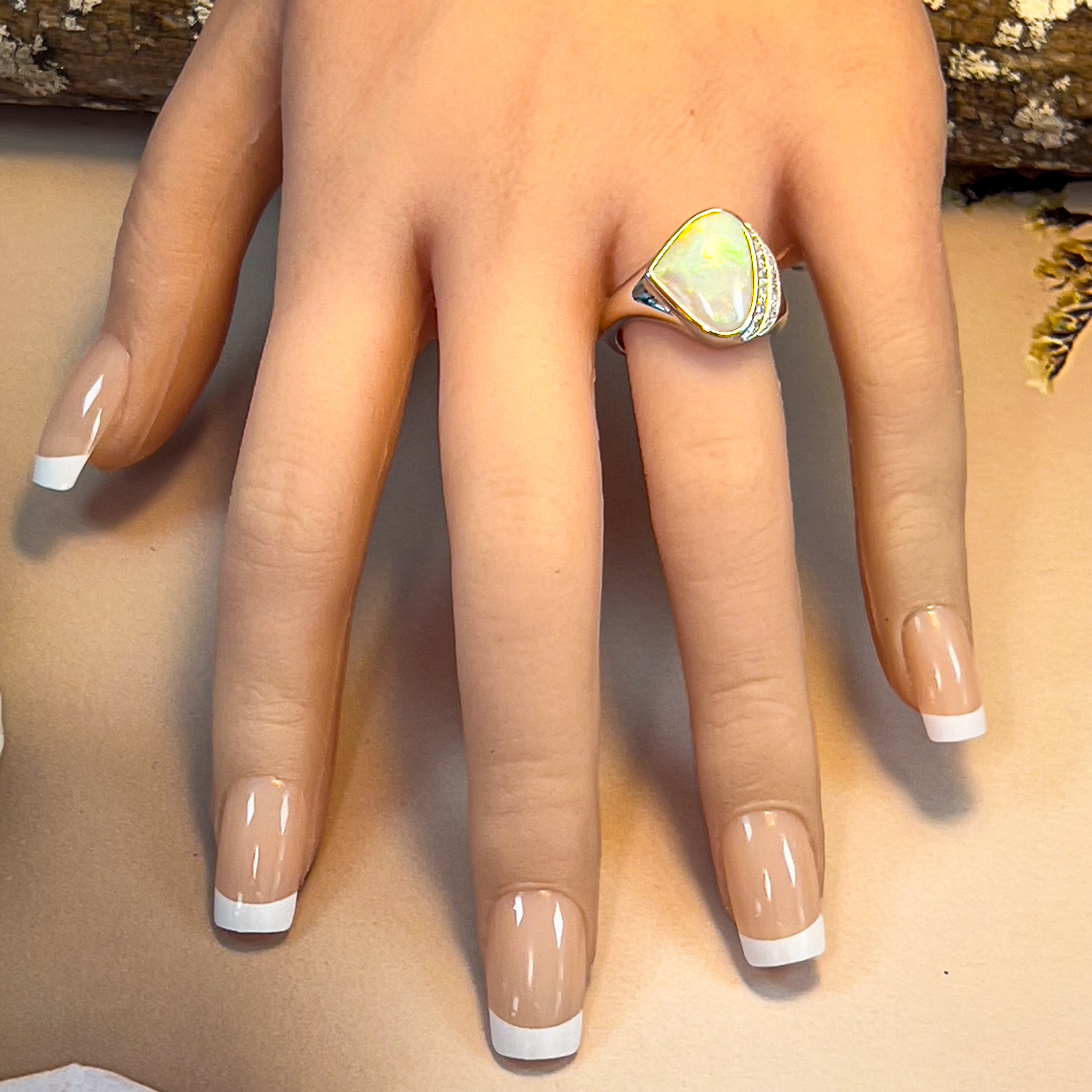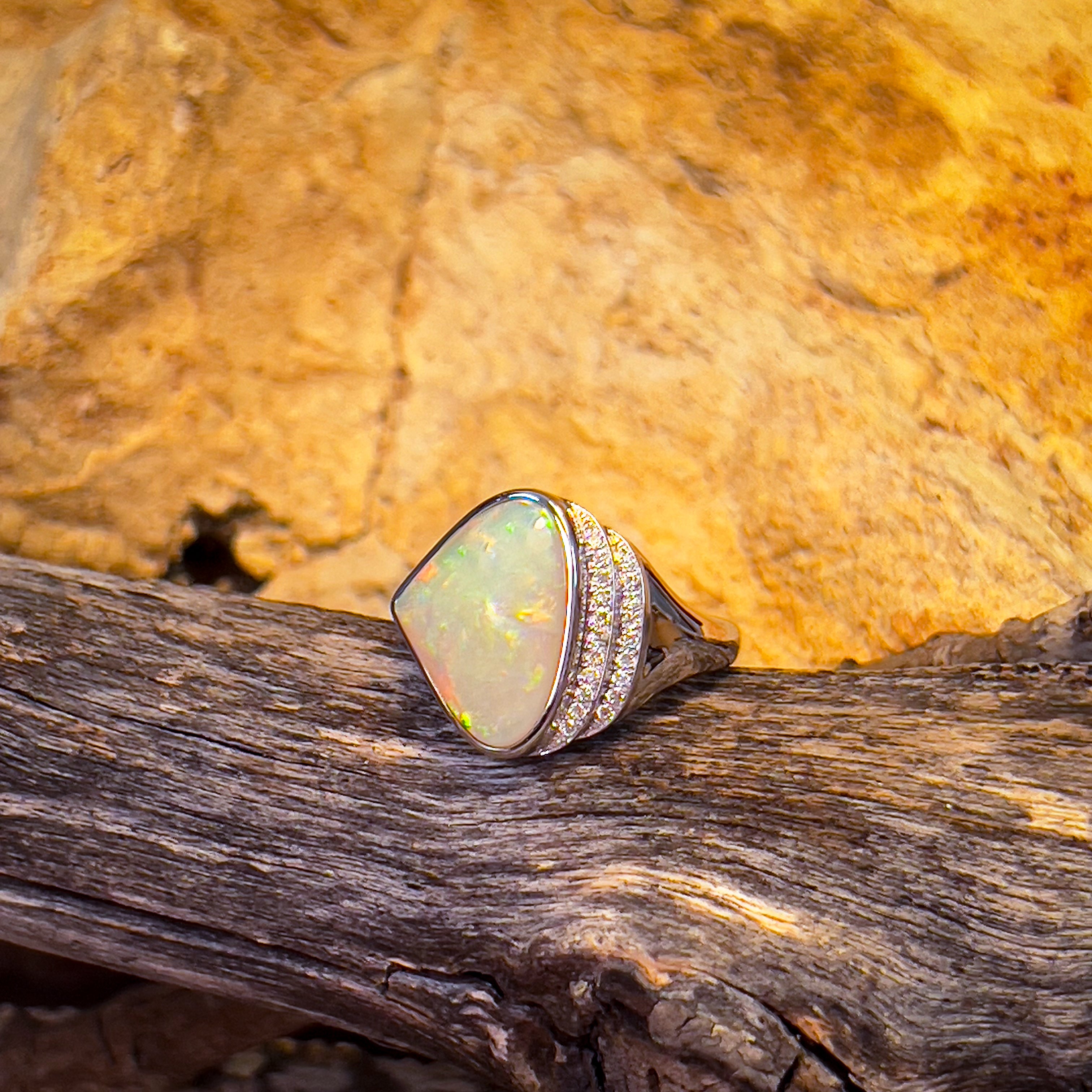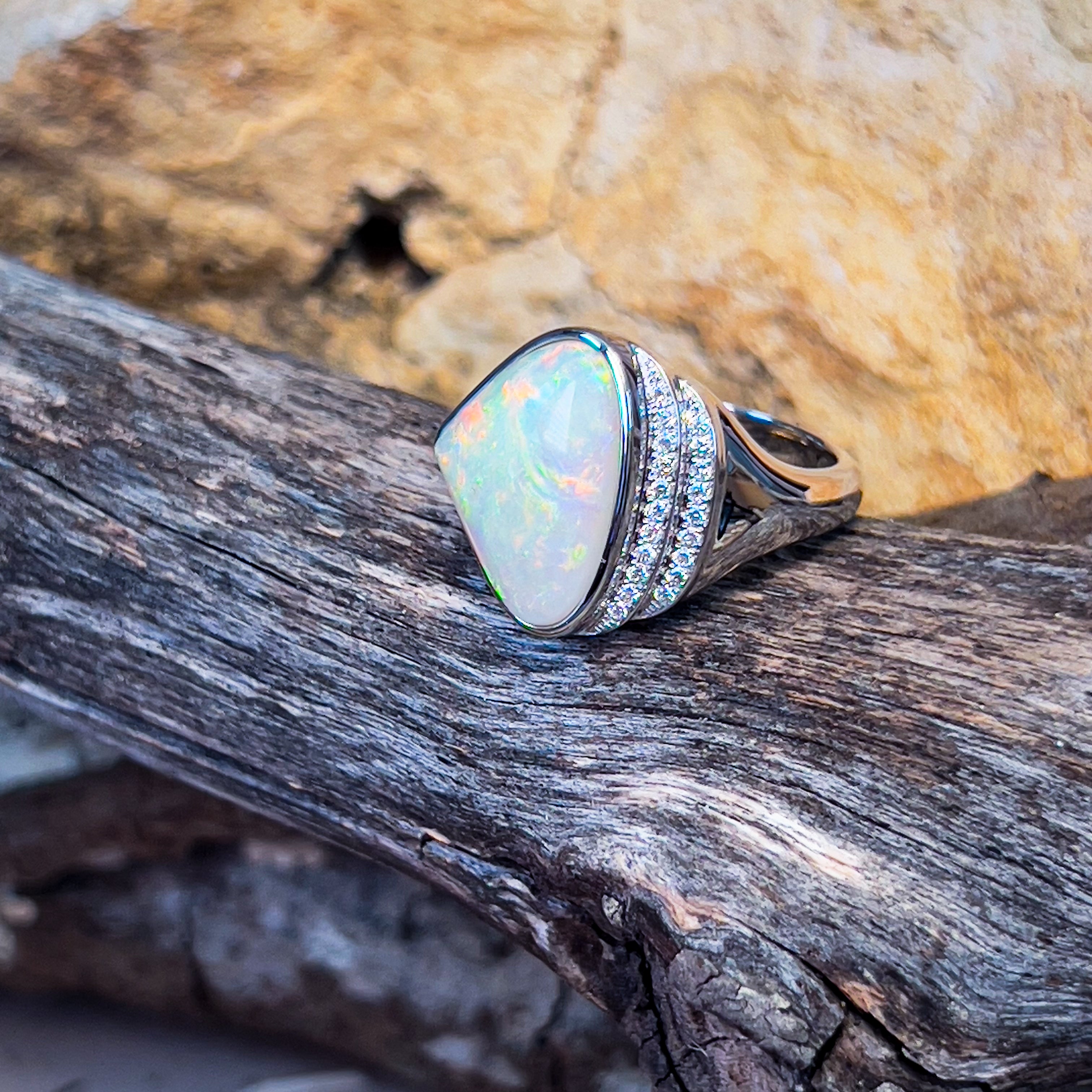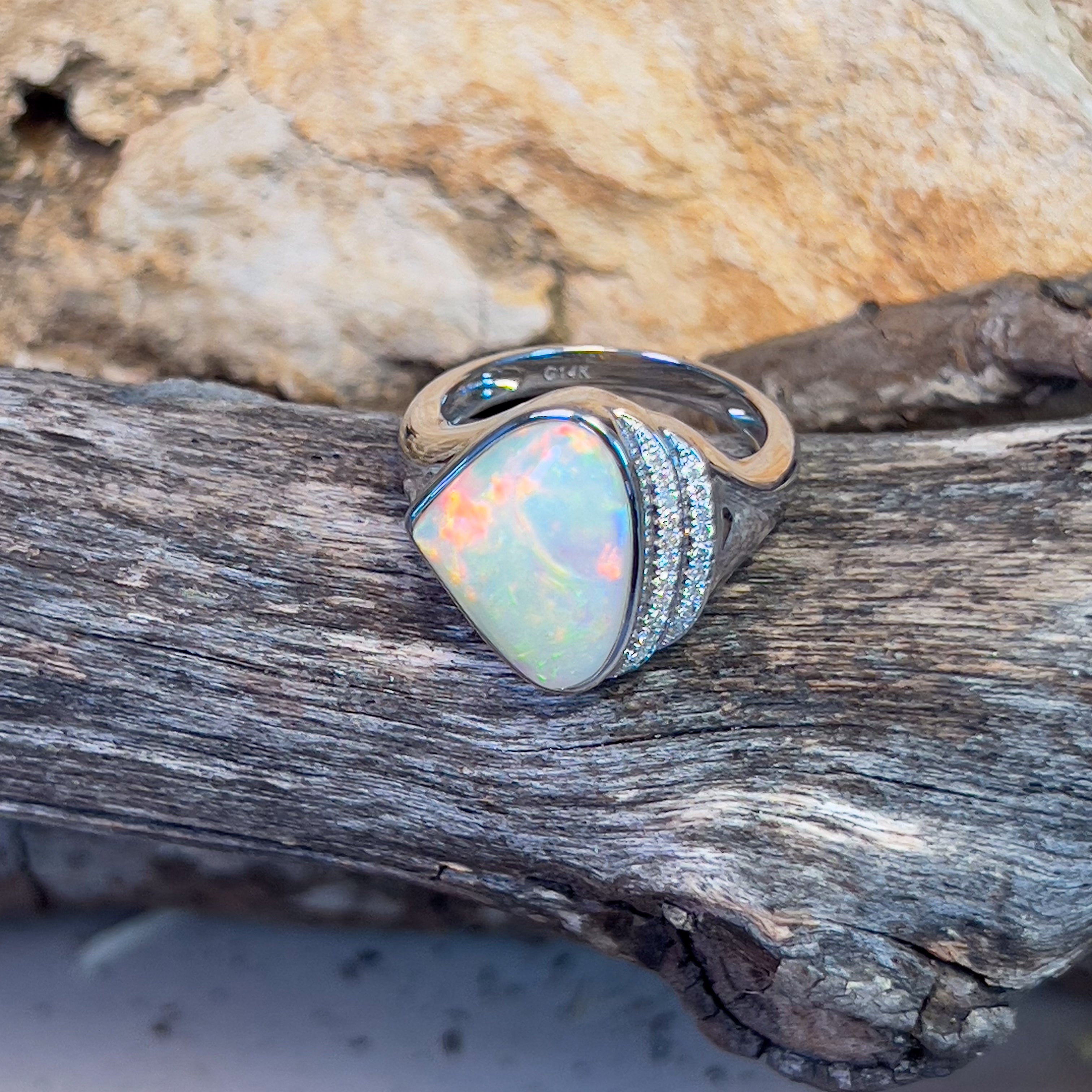 Indulge in luxury with our 14kt White Gold Light Opal ring, adorned with a unique triangular design and double row of diamonds. Perfect for any occasion, this ring makes a stunning gift for her.