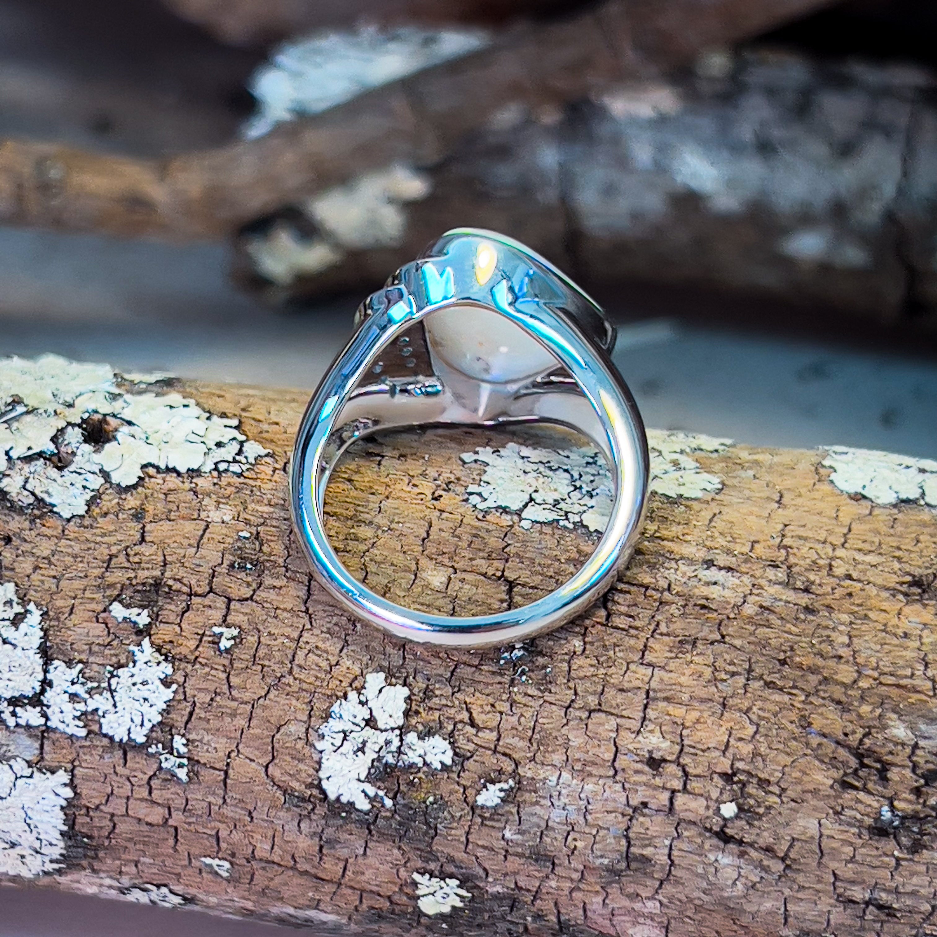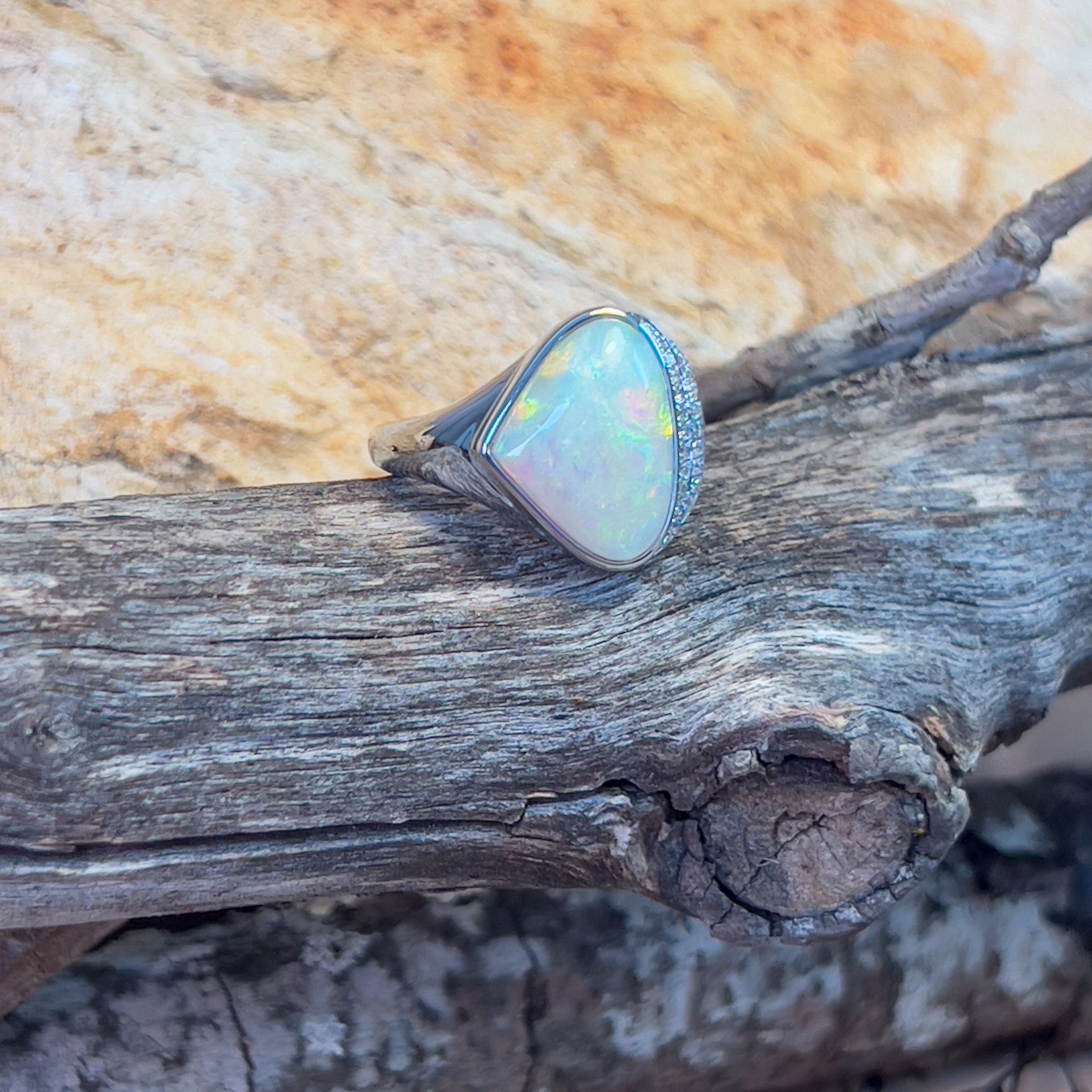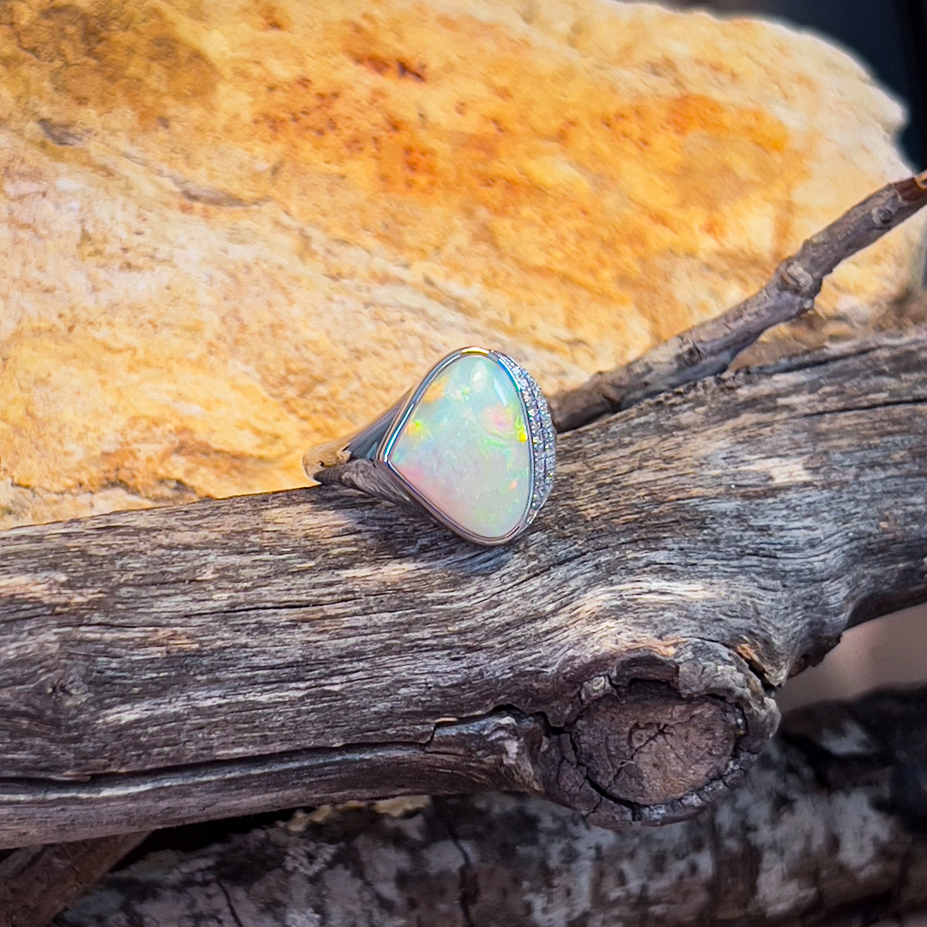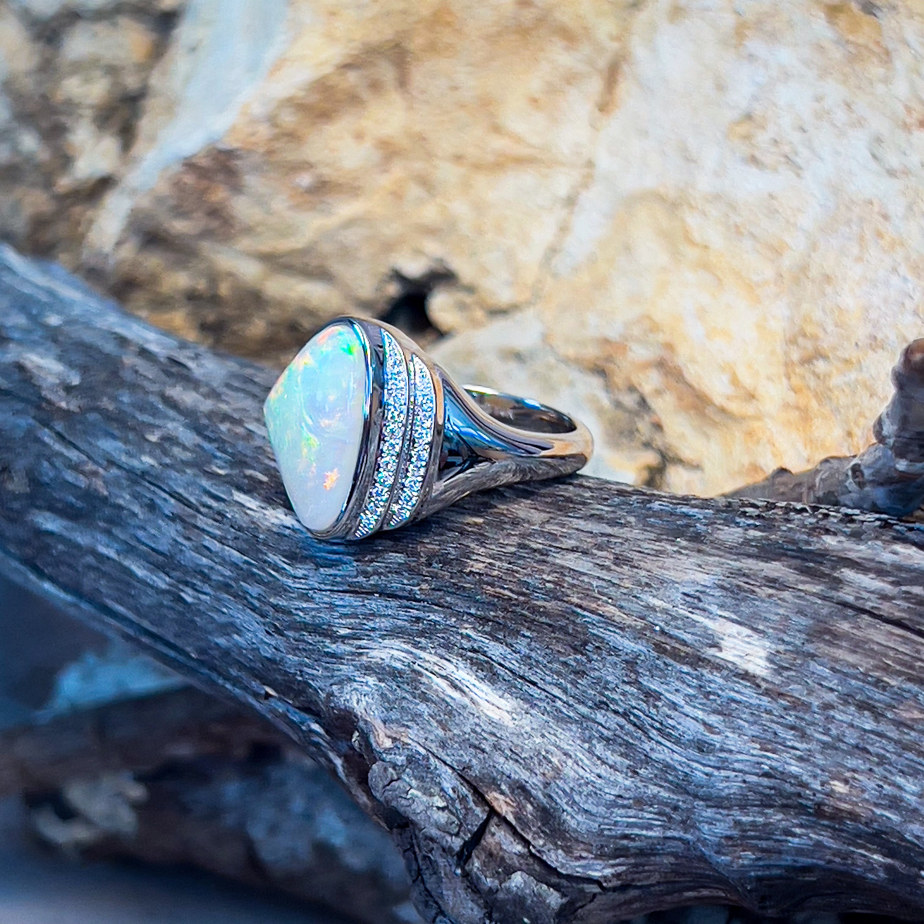 Indulge in luxury with our 14kt White Gold Light Opal ring, adorned with a unique triangular design and double row of diamonds. Perfect for any occasion, this ring makes a stunning gift for her.