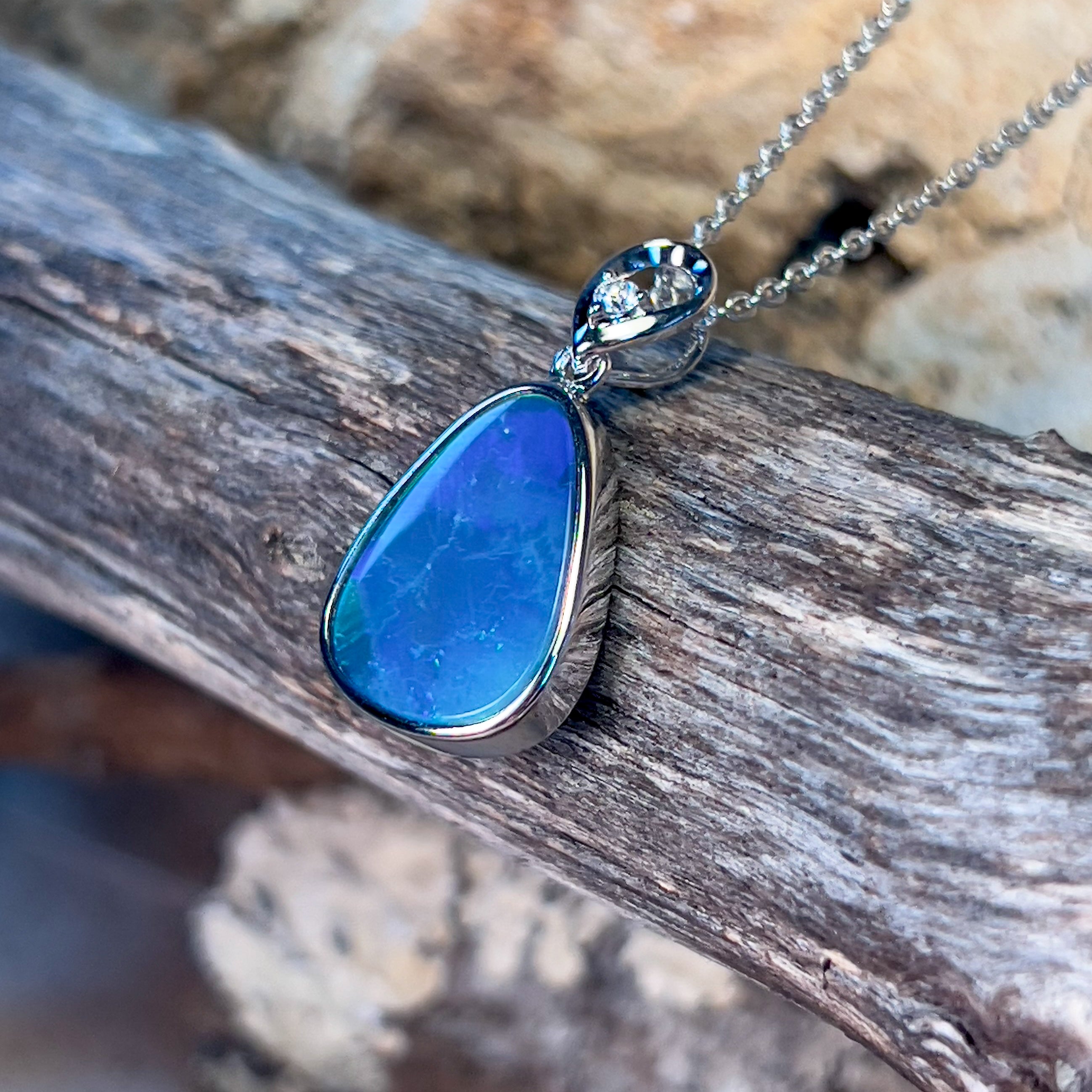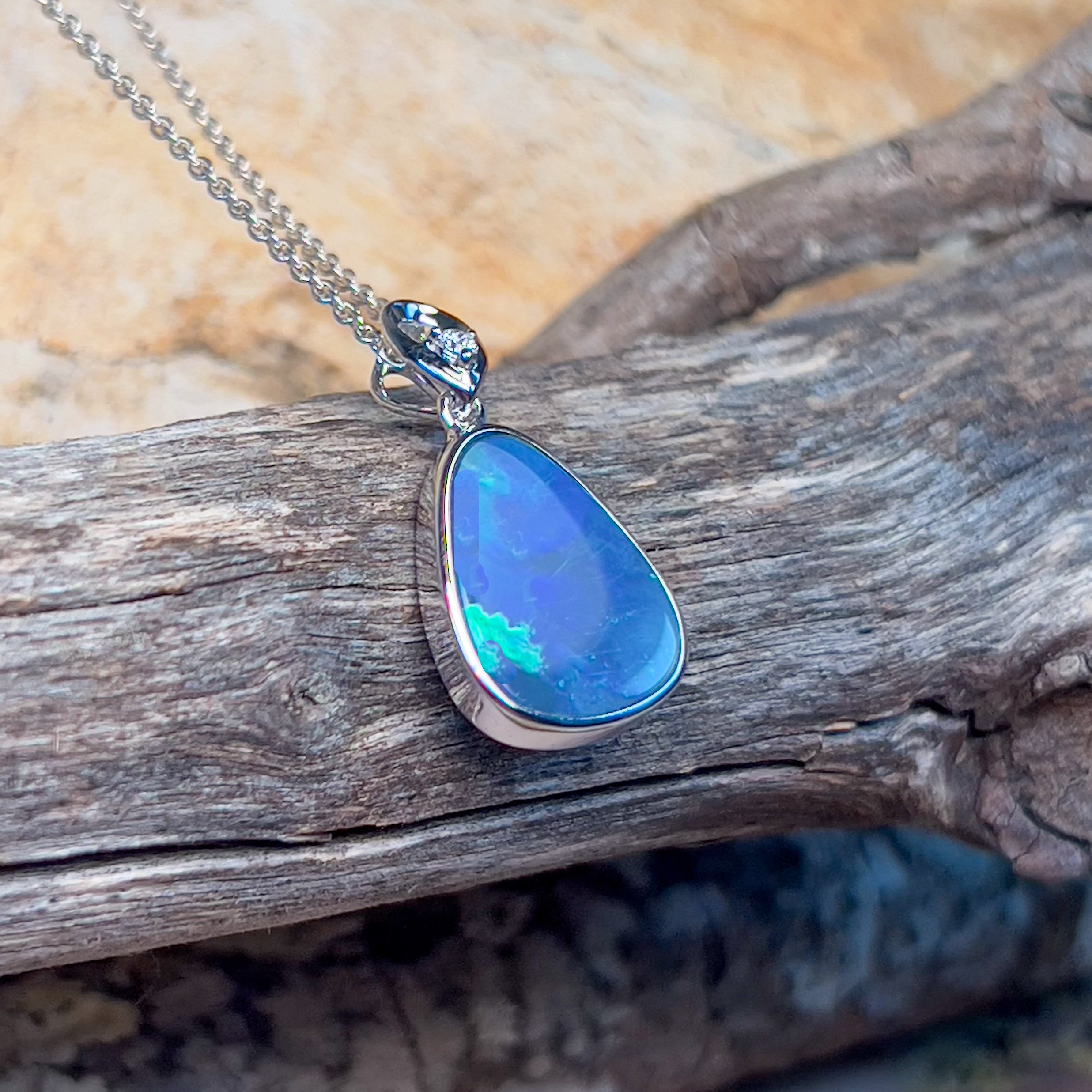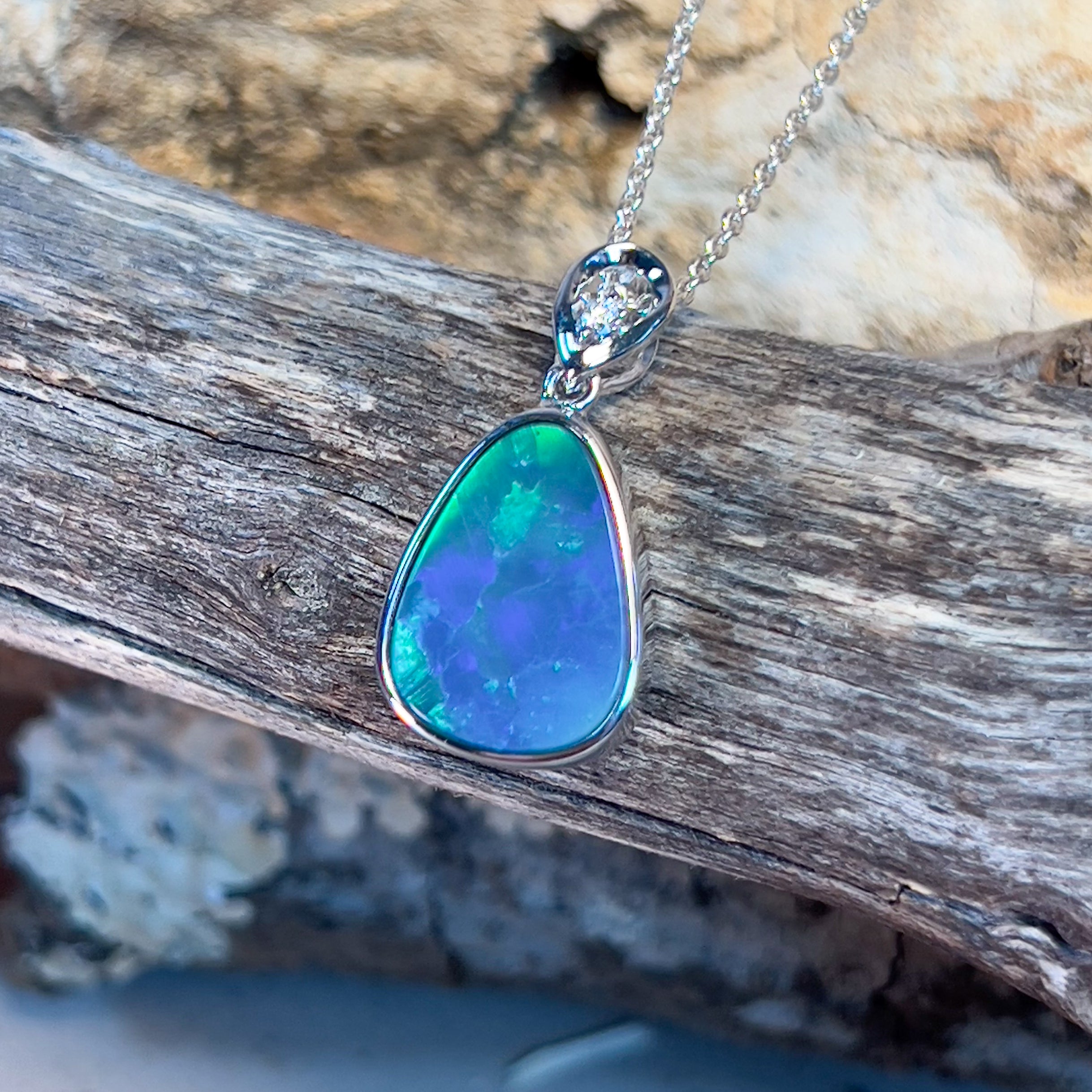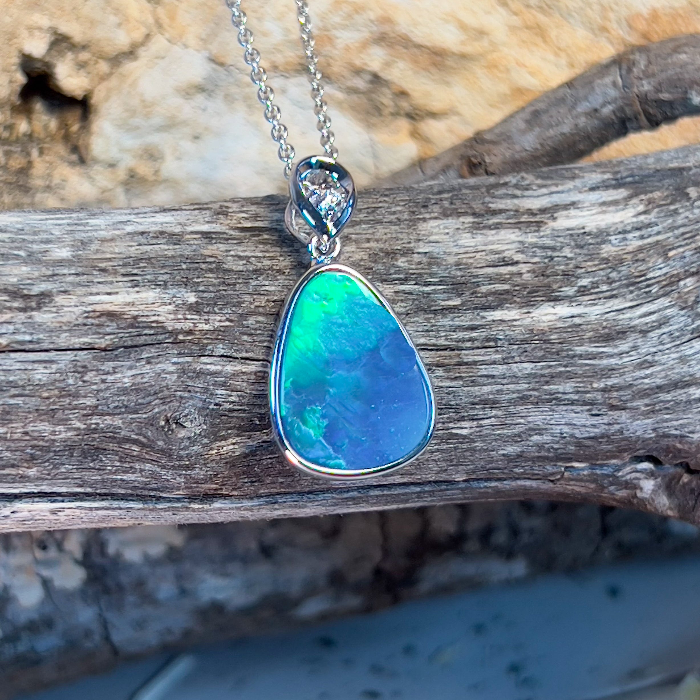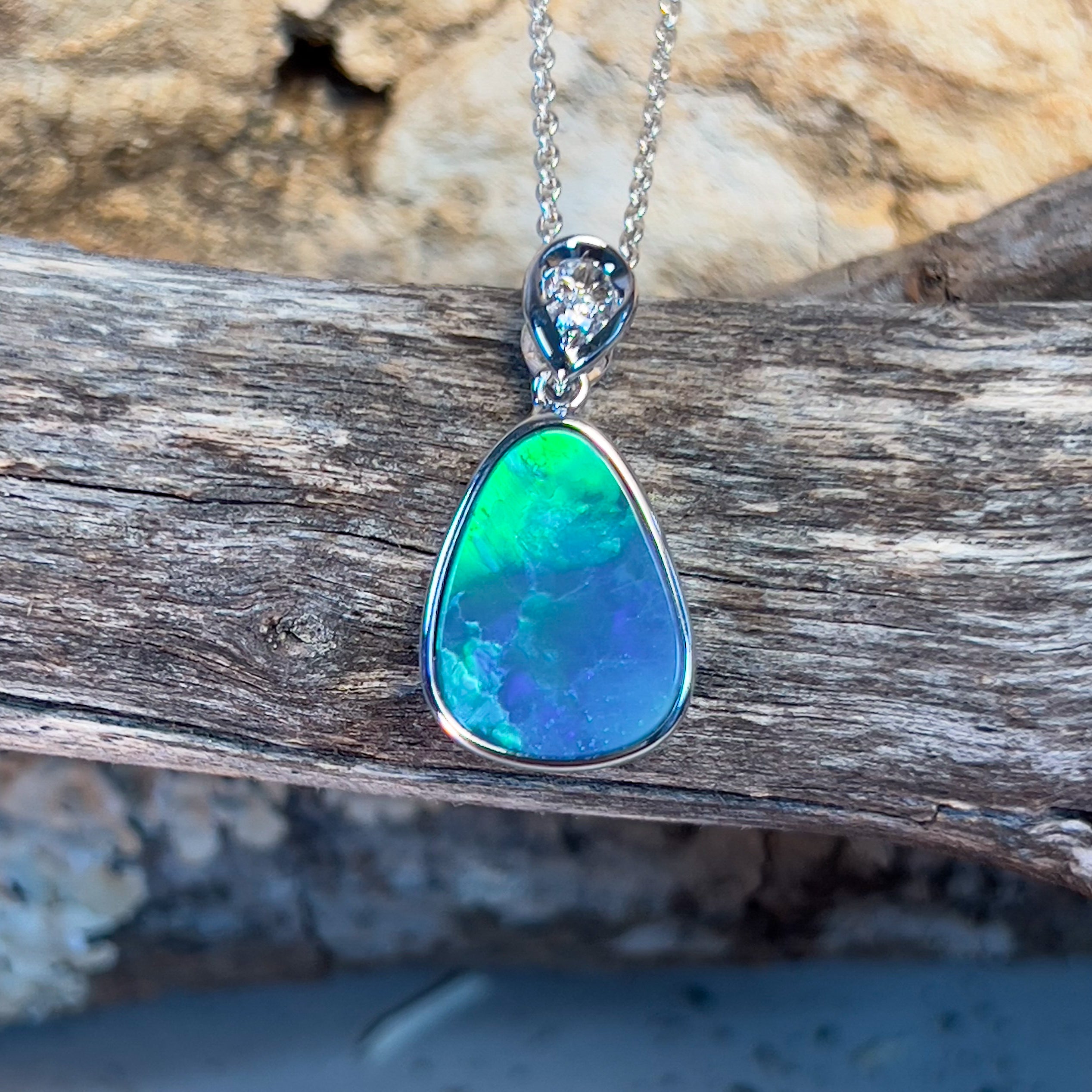 14kt White gold pearshape Opal doublet Blue Green 3.65ct and diamond pendant
