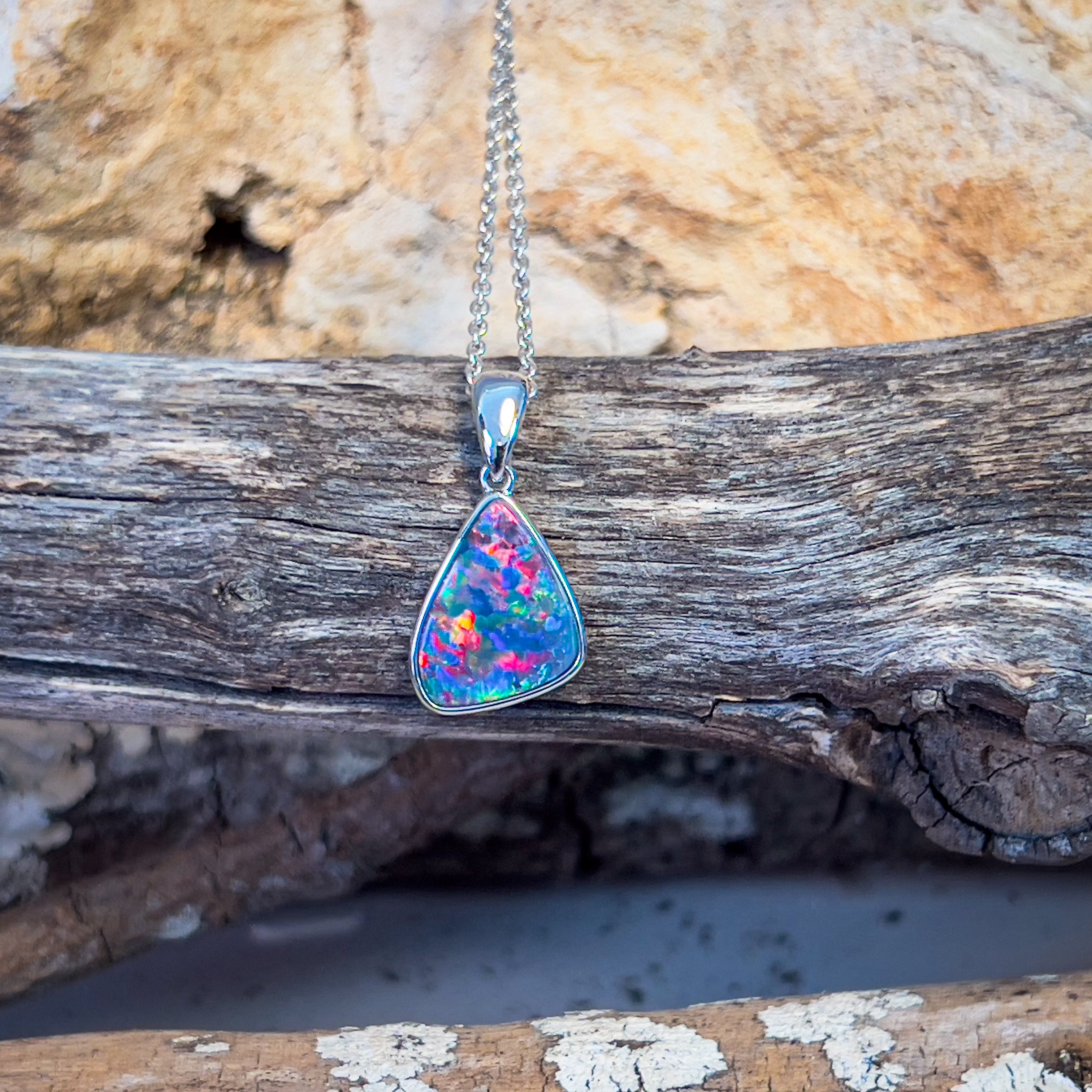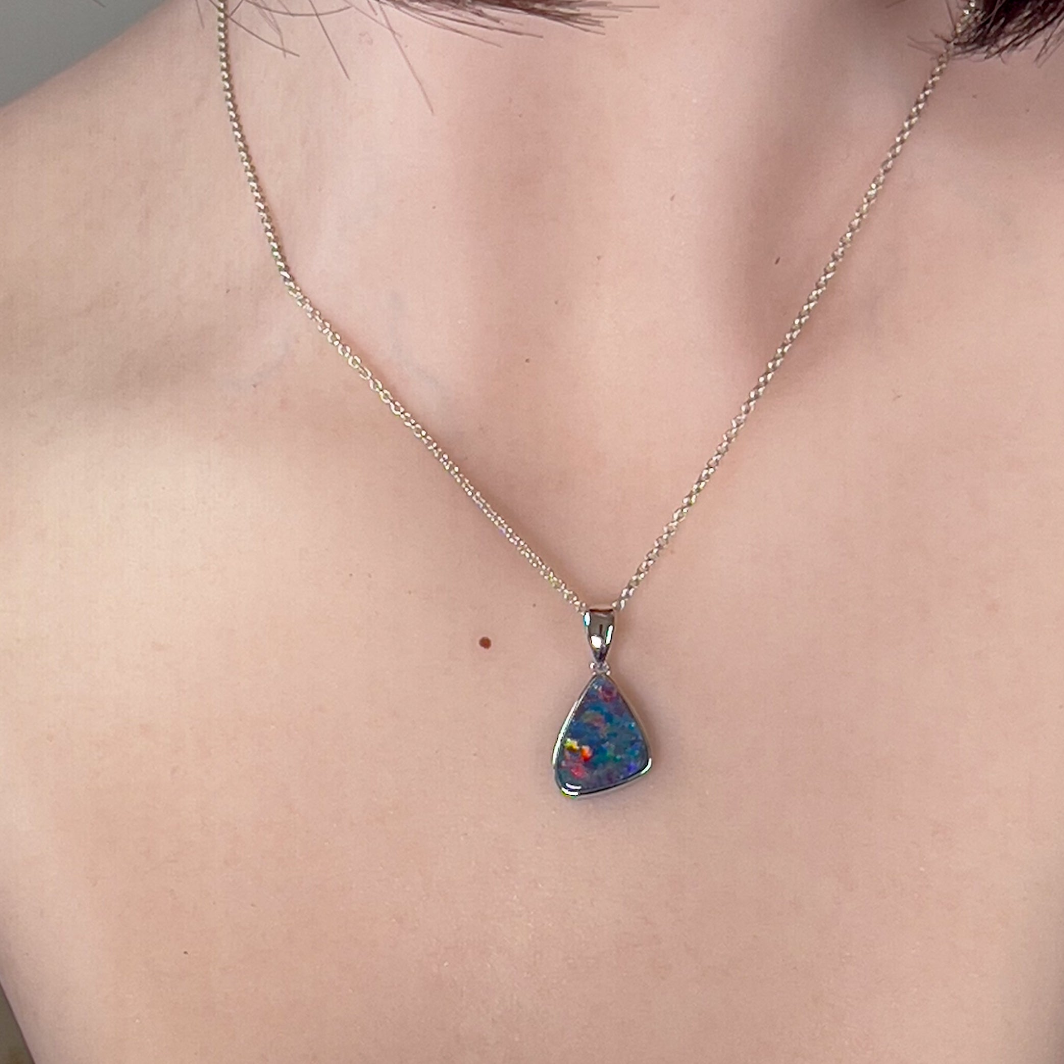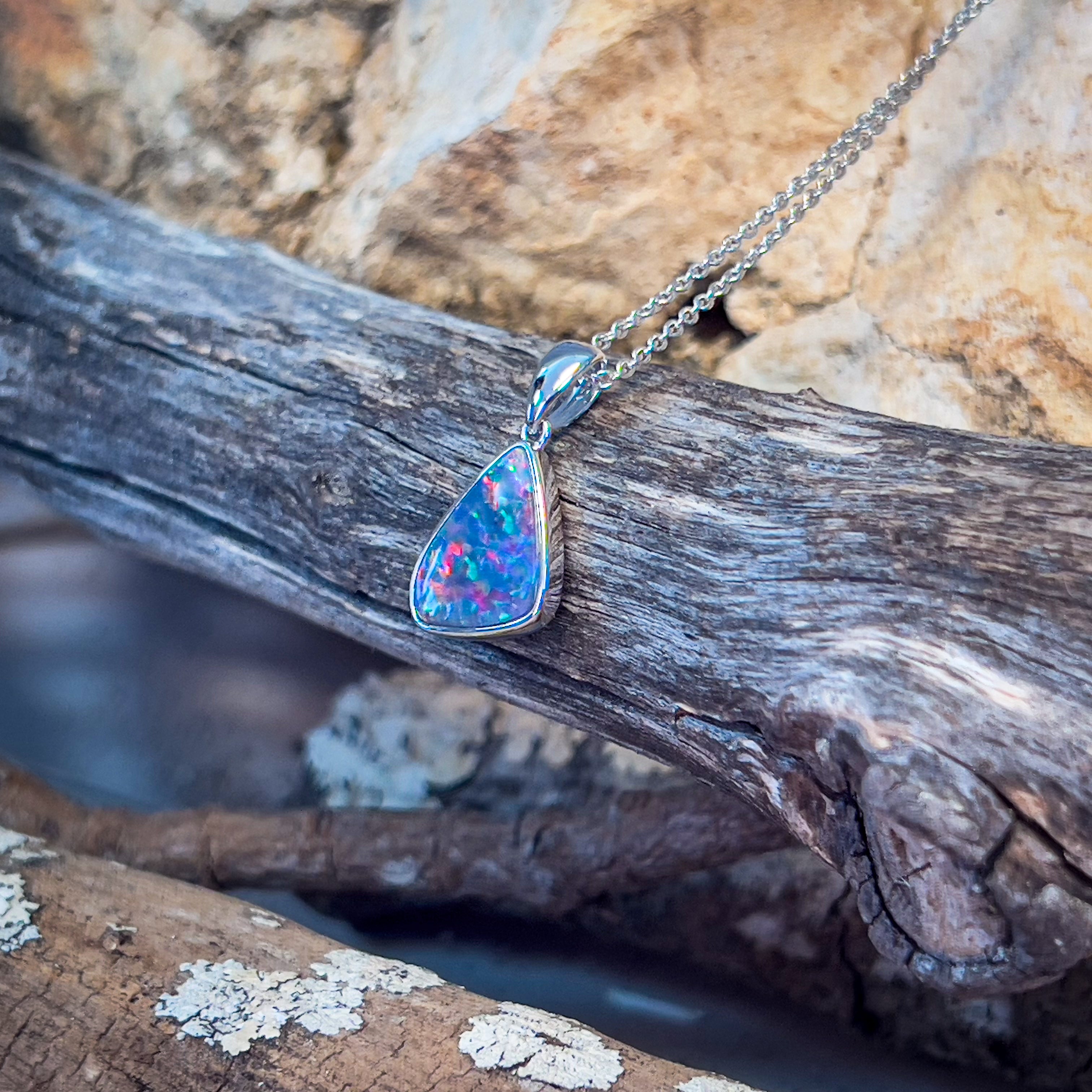 Indulge in the vibrant colors and unique design of our 14kt White Gold Opal Necklace. Crafted with a bezel set triangular shape doublet, this necklace features a beautiful red multicolour opal that will surely be a standout piece in your jewelry collection. Perfect as a birthstone gift or to add a pop of color to any outfit.