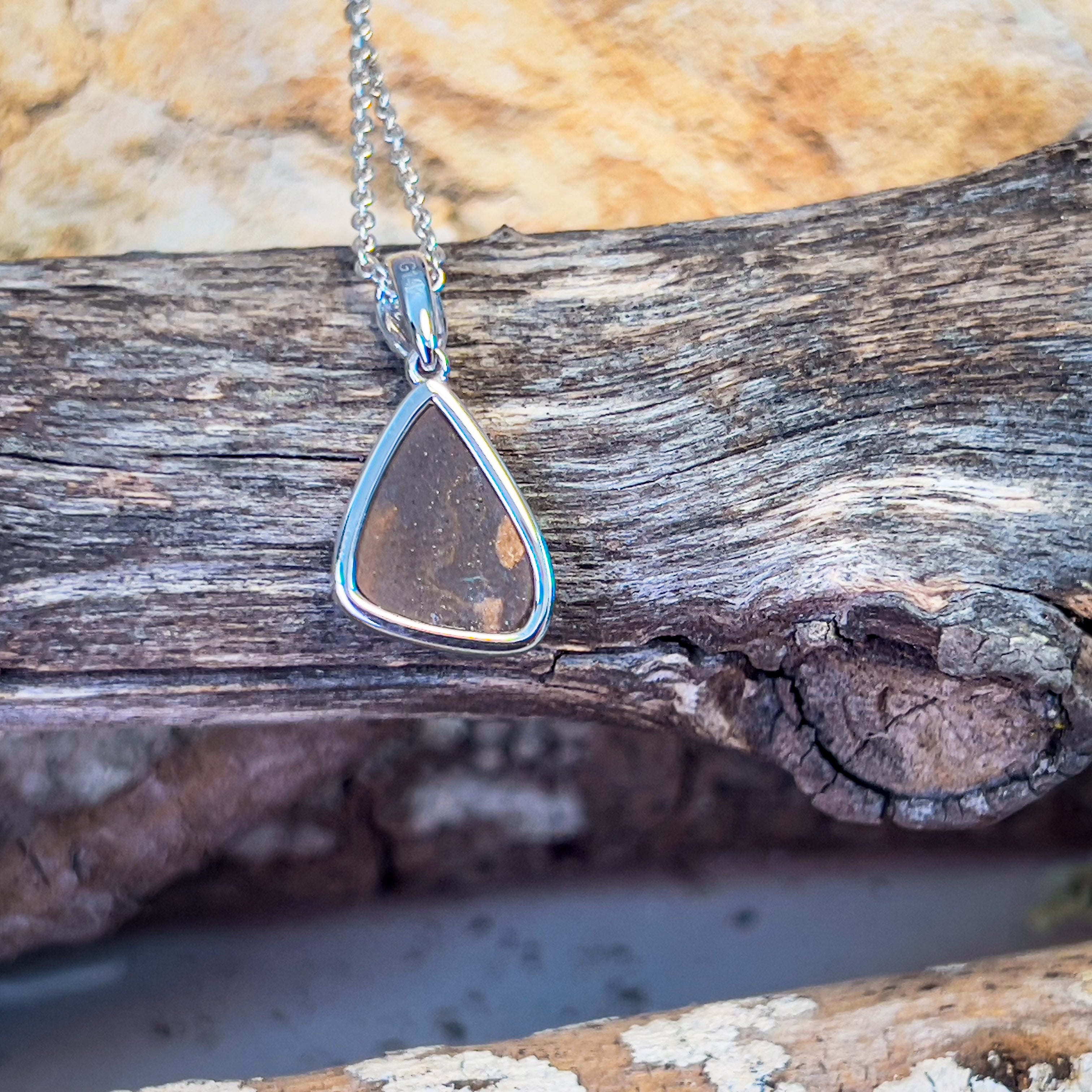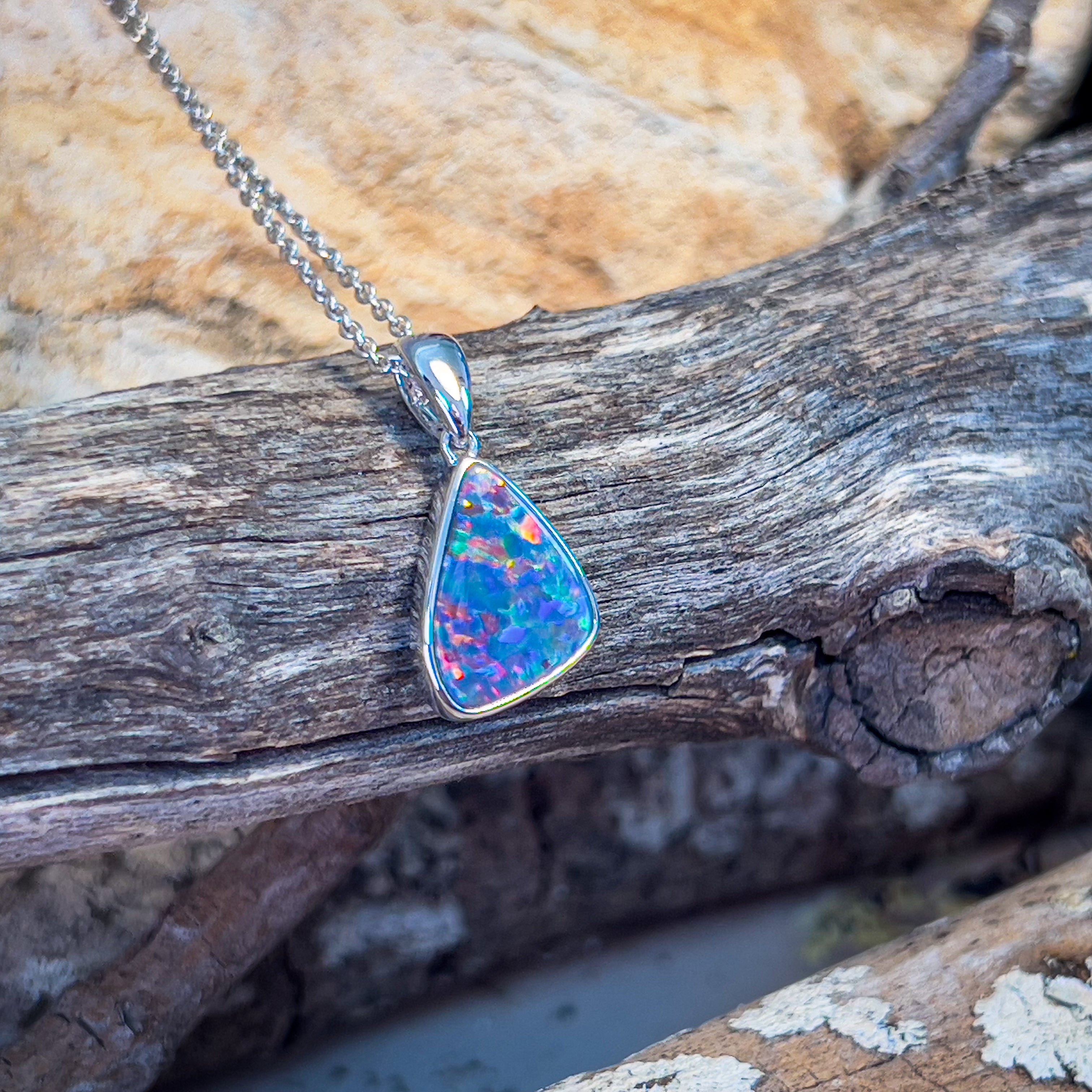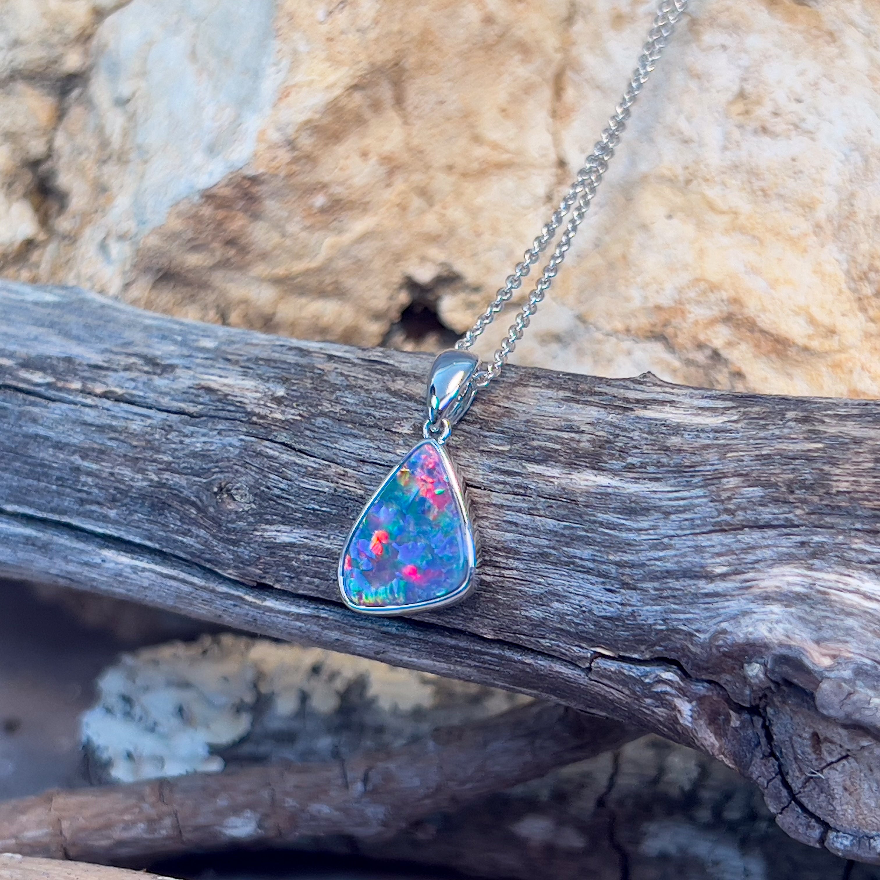 Indulge in the vibrant colors and unique design of our 14kt White Gold Opal Necklace. Crafted with a bezel set triangular shape doublet, this necklace features a beautiful red multicolour opal that will surely be a standout piece in your jewelry collection. Perfect as a birthstone gift or to add a pop of color to any outfit.