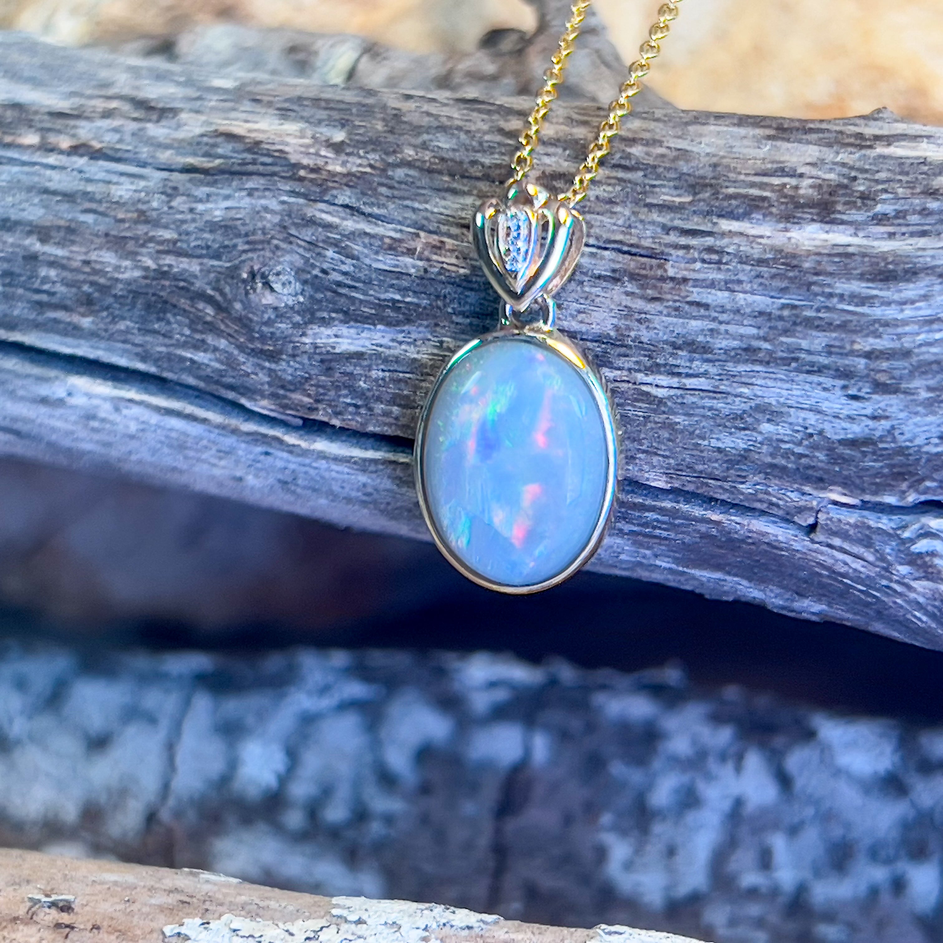 Get ready to make a statement with this playful 14kt Yellow Gold Black Opal and Diamond pendant. The classic oval dark black opal is sure to catch eyes and add a touch of uniqueness to any outfit. Why be ordinary when you can add a touch of quirky elegance with this stunning pendant?