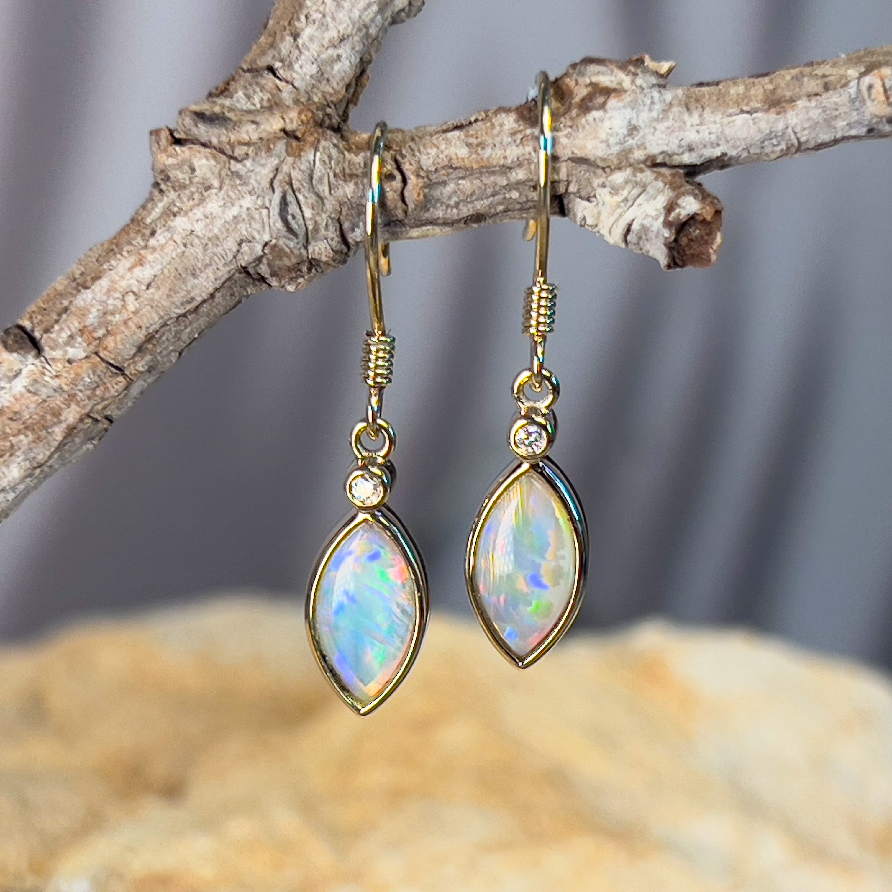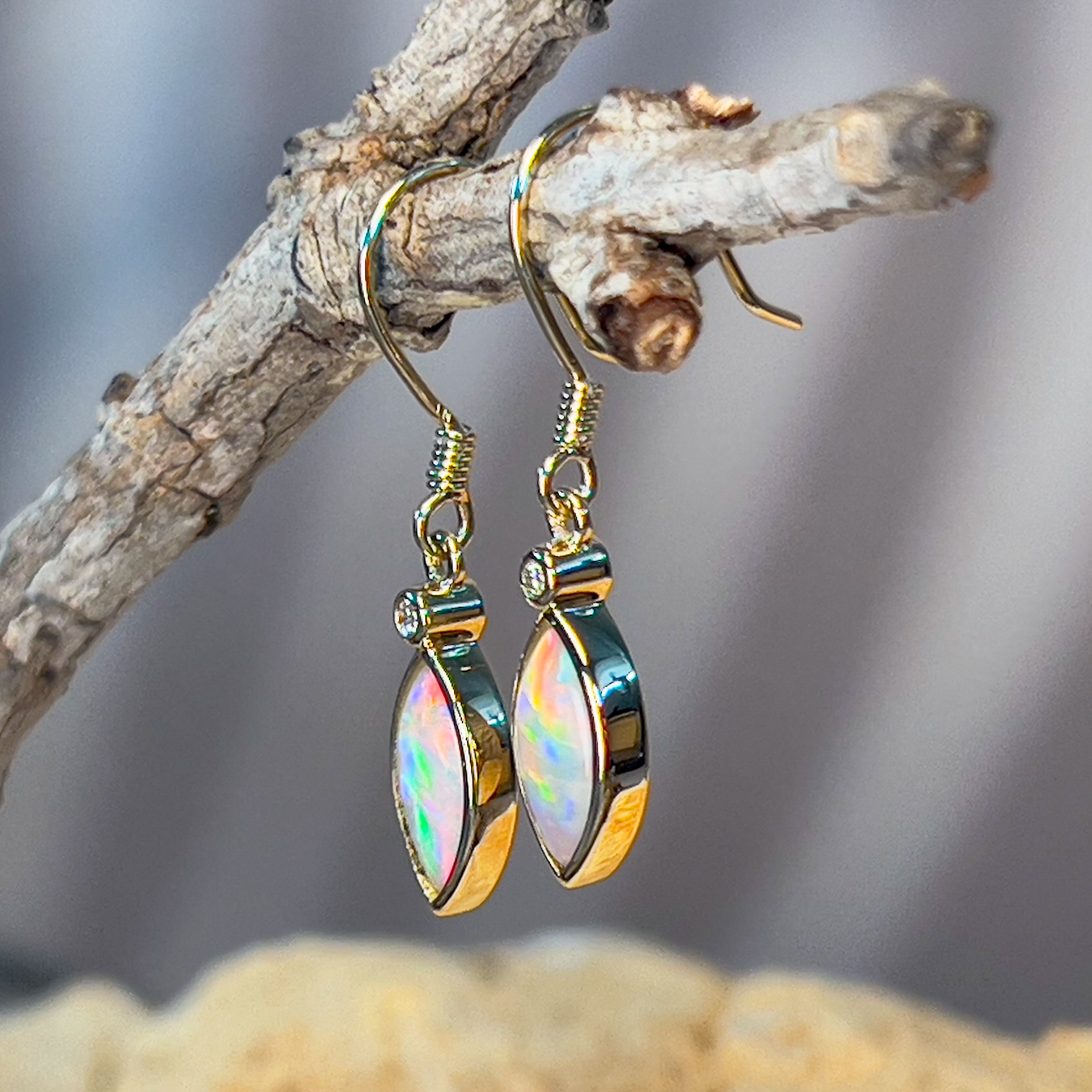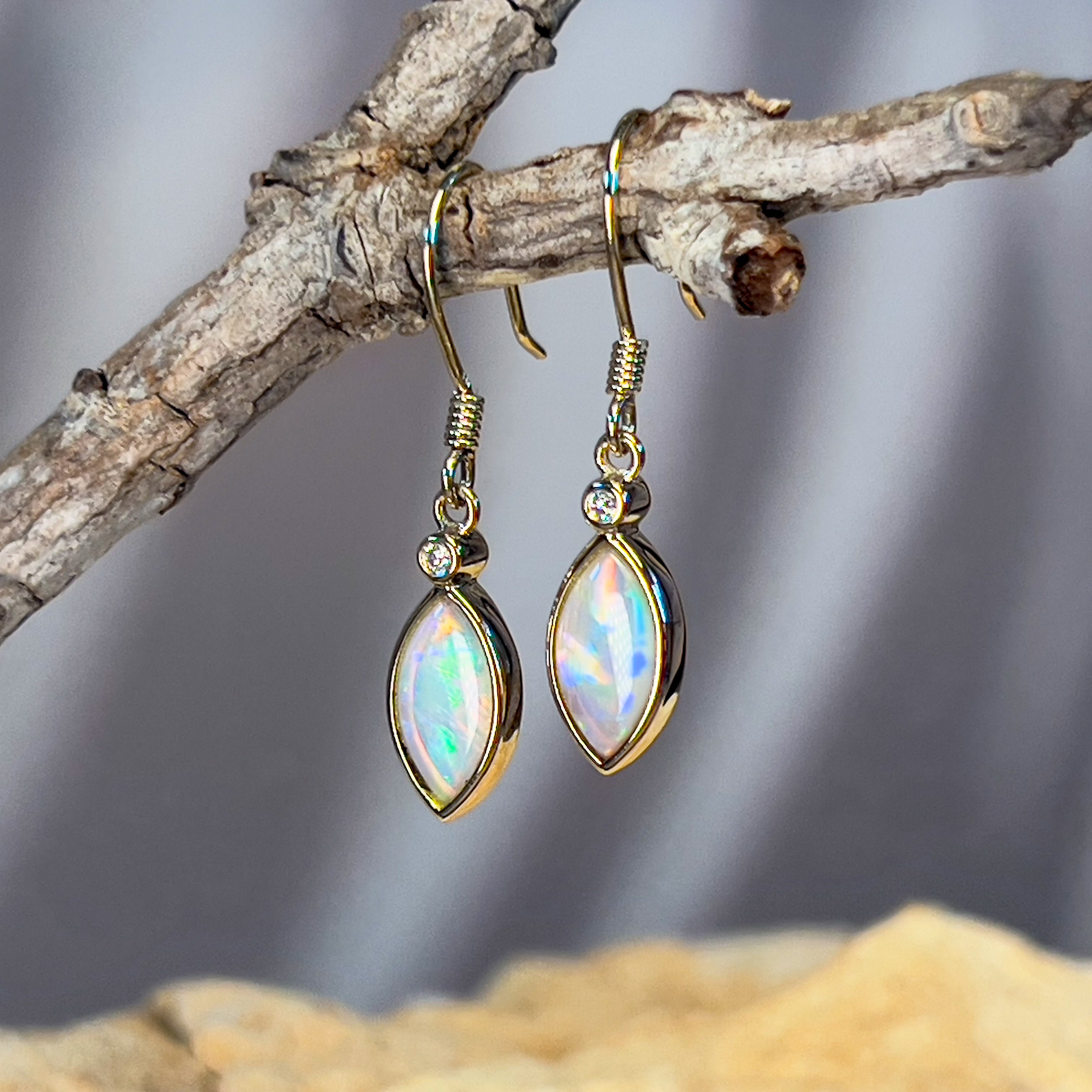 14kt Yellow Gold dangling Marquise shape Crystal Opal earrings