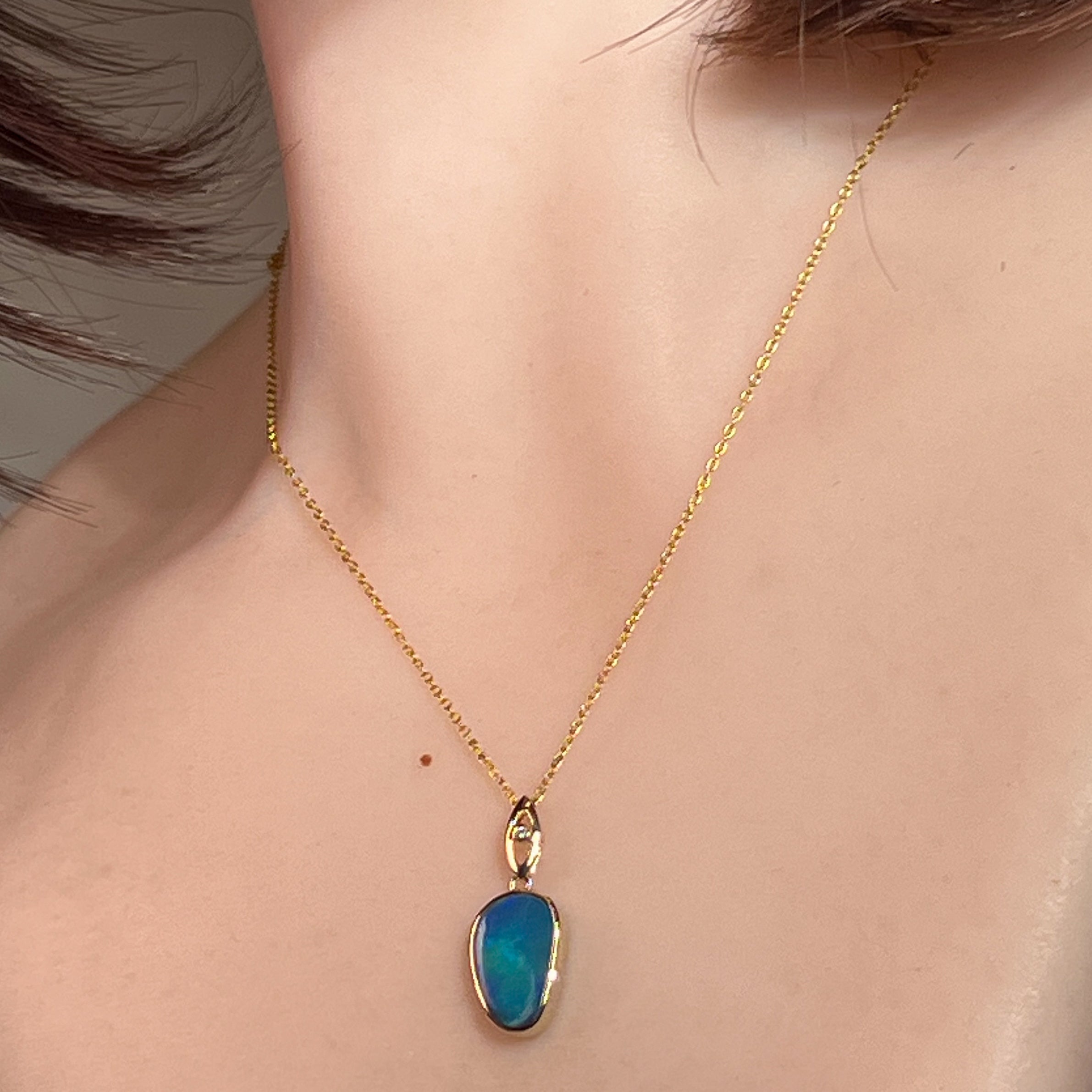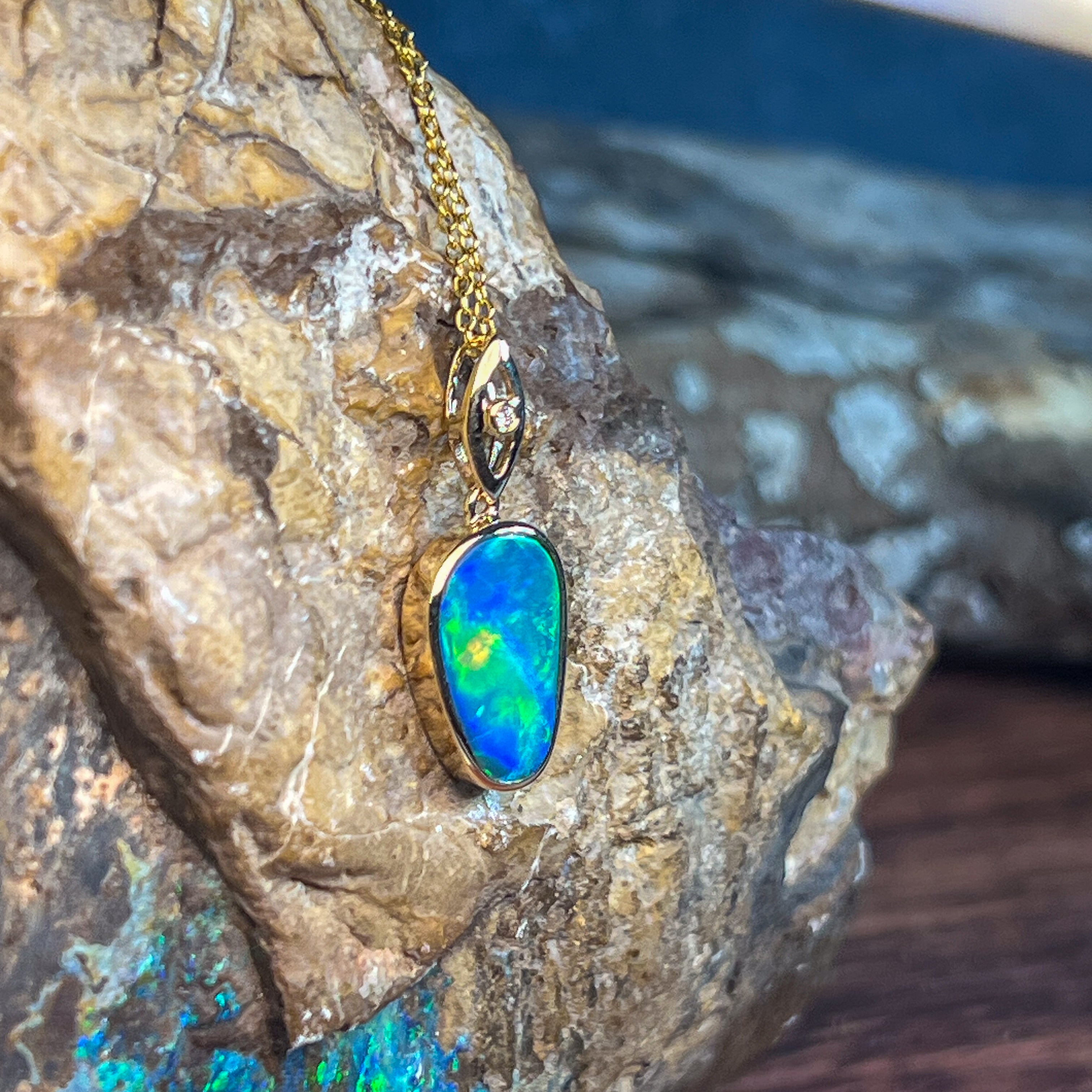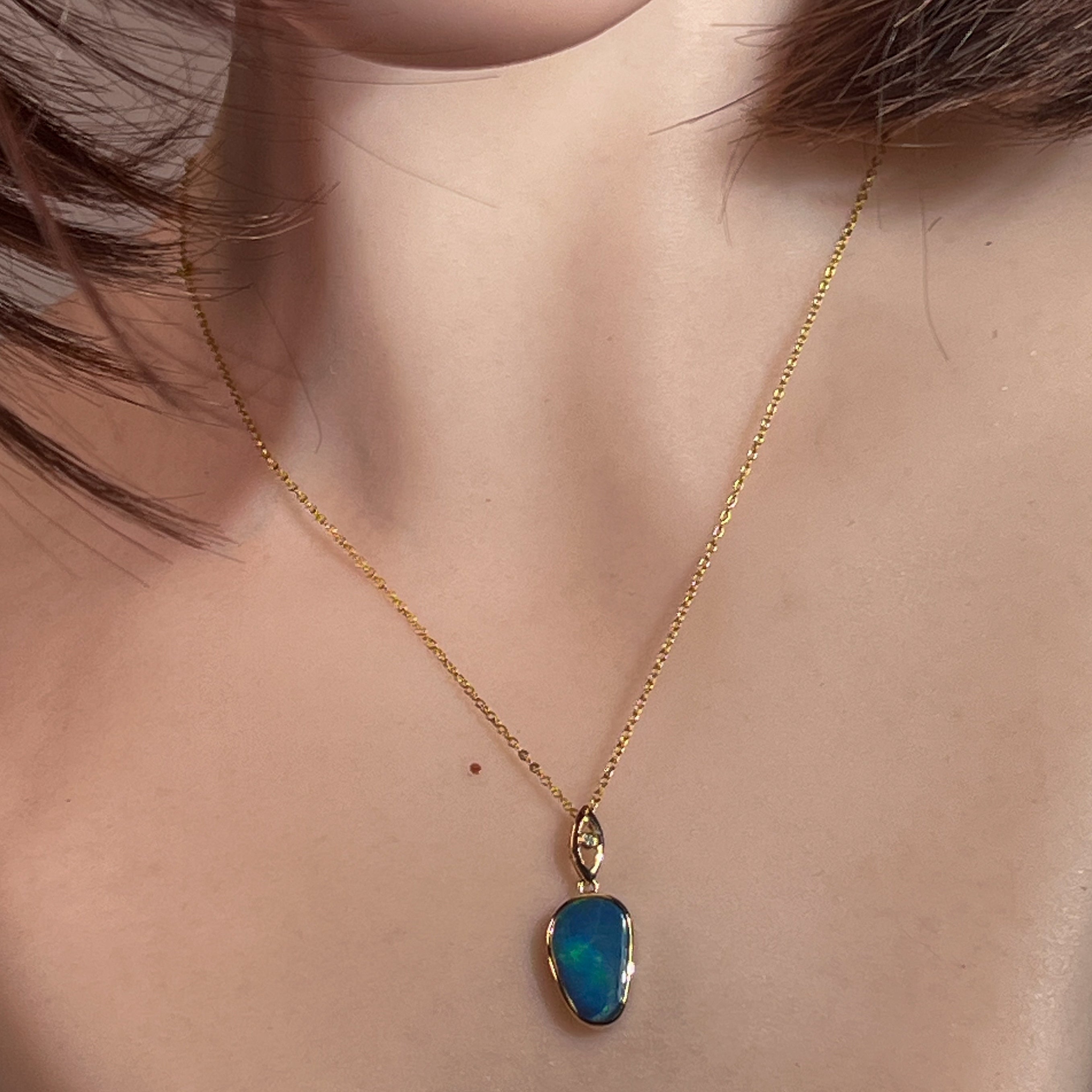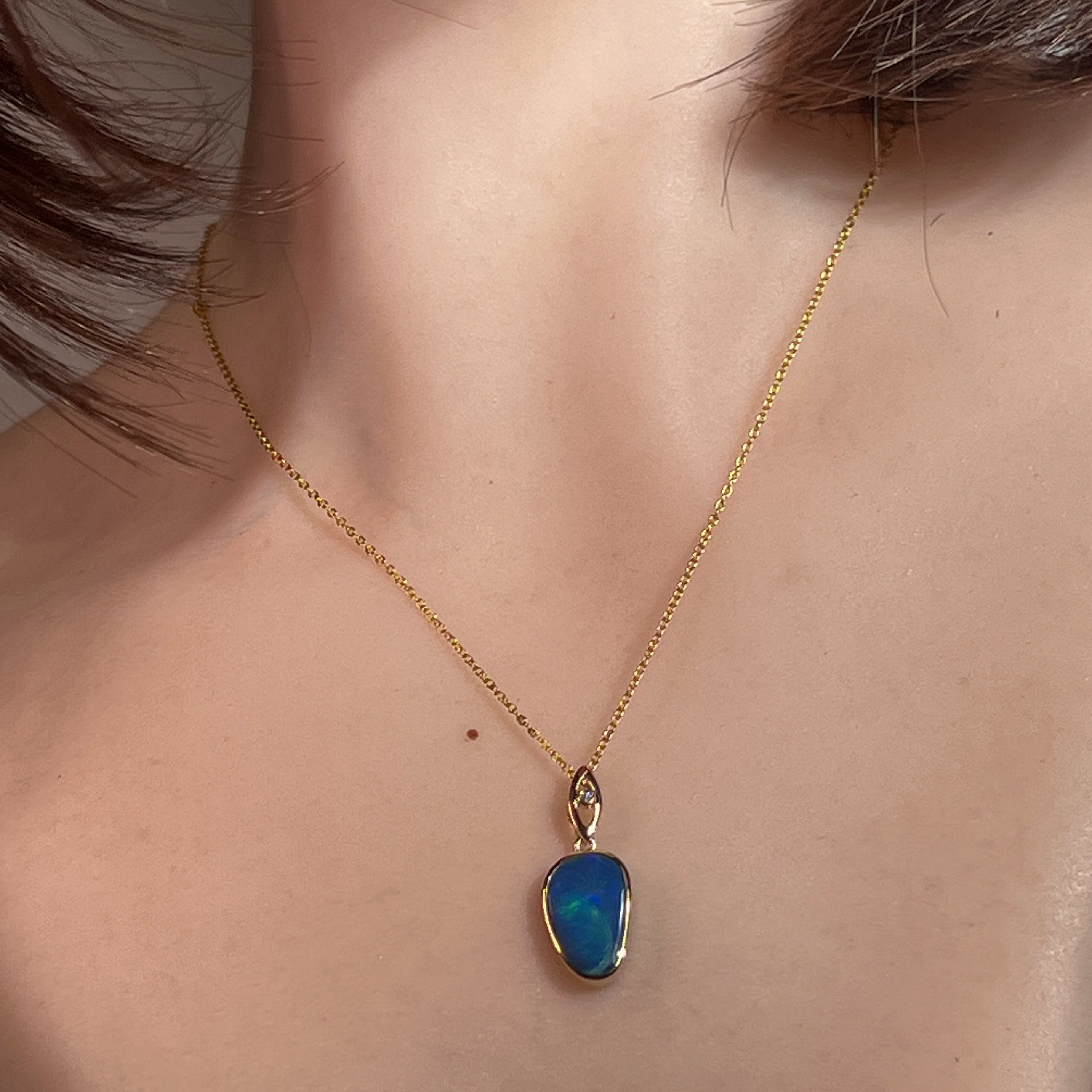 Elevate your elegance with this 14kt Yellow Gold drop style Opal doublet pendant, showcasing a strong flash of colour that captivates at every angle. Its refined design pairs timeless gold with the vibrant play of opal, making it a stunning statement piece perfect for any occasion. Experience the allure of radiant hues and sophisticated craftsmanship in one exquisite pendant.