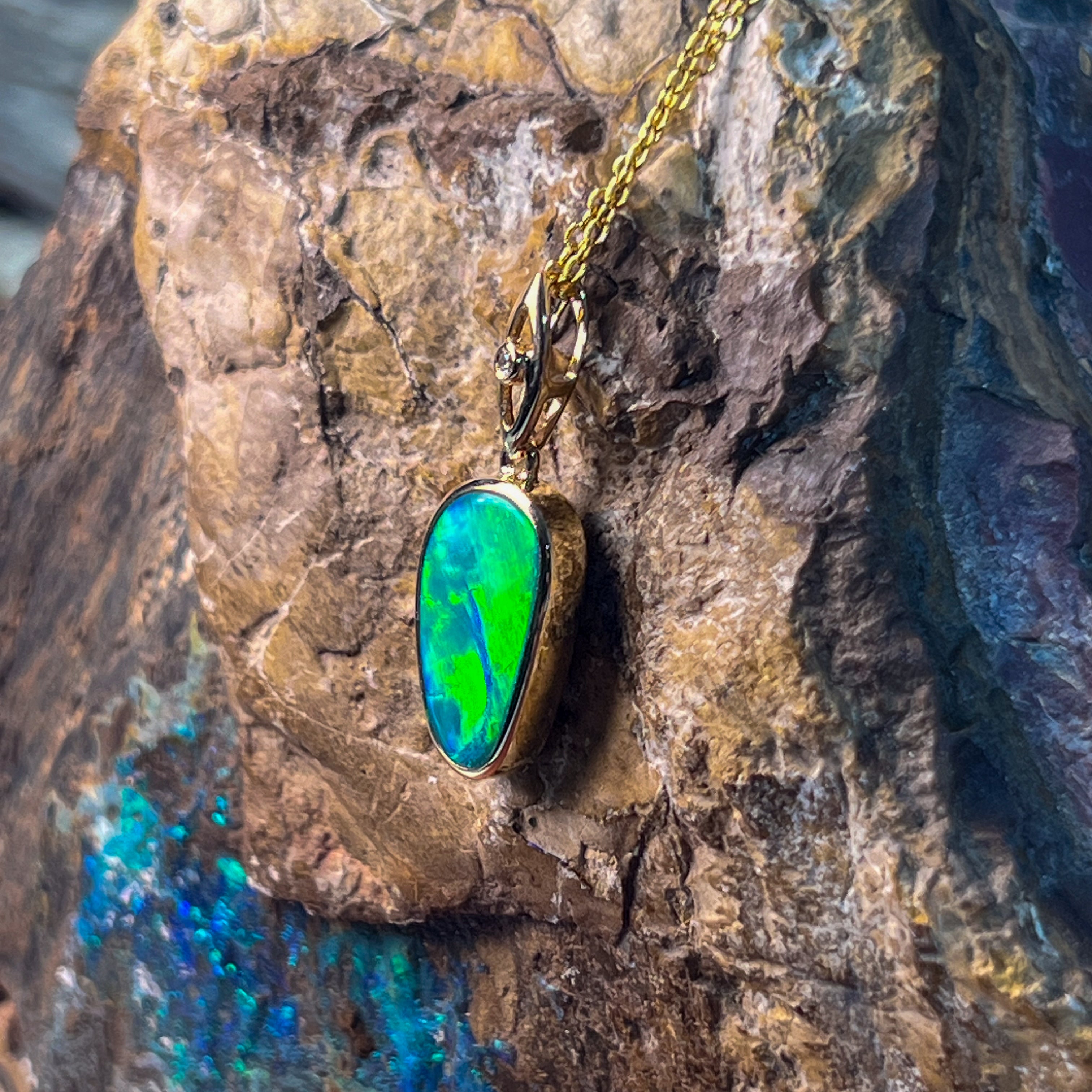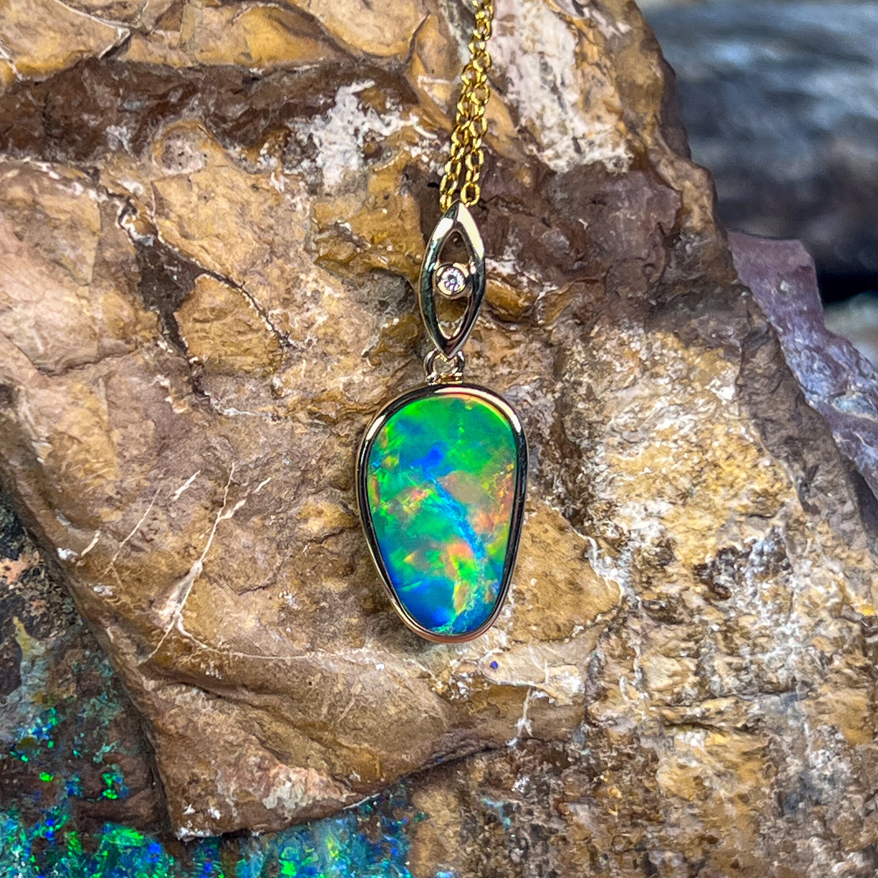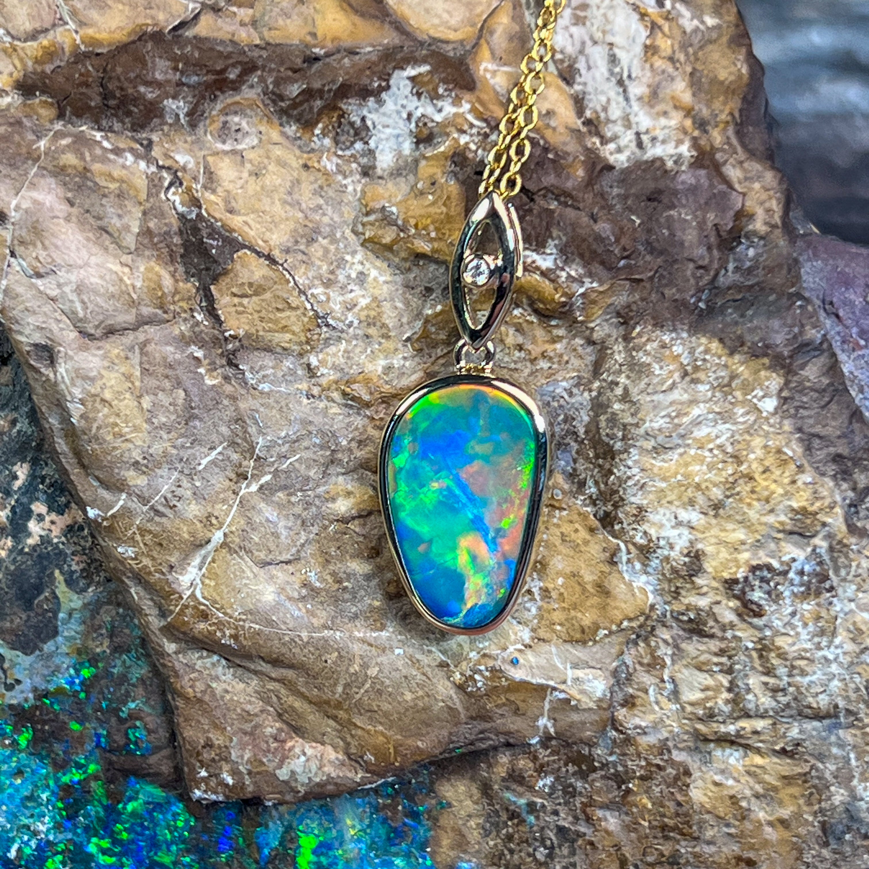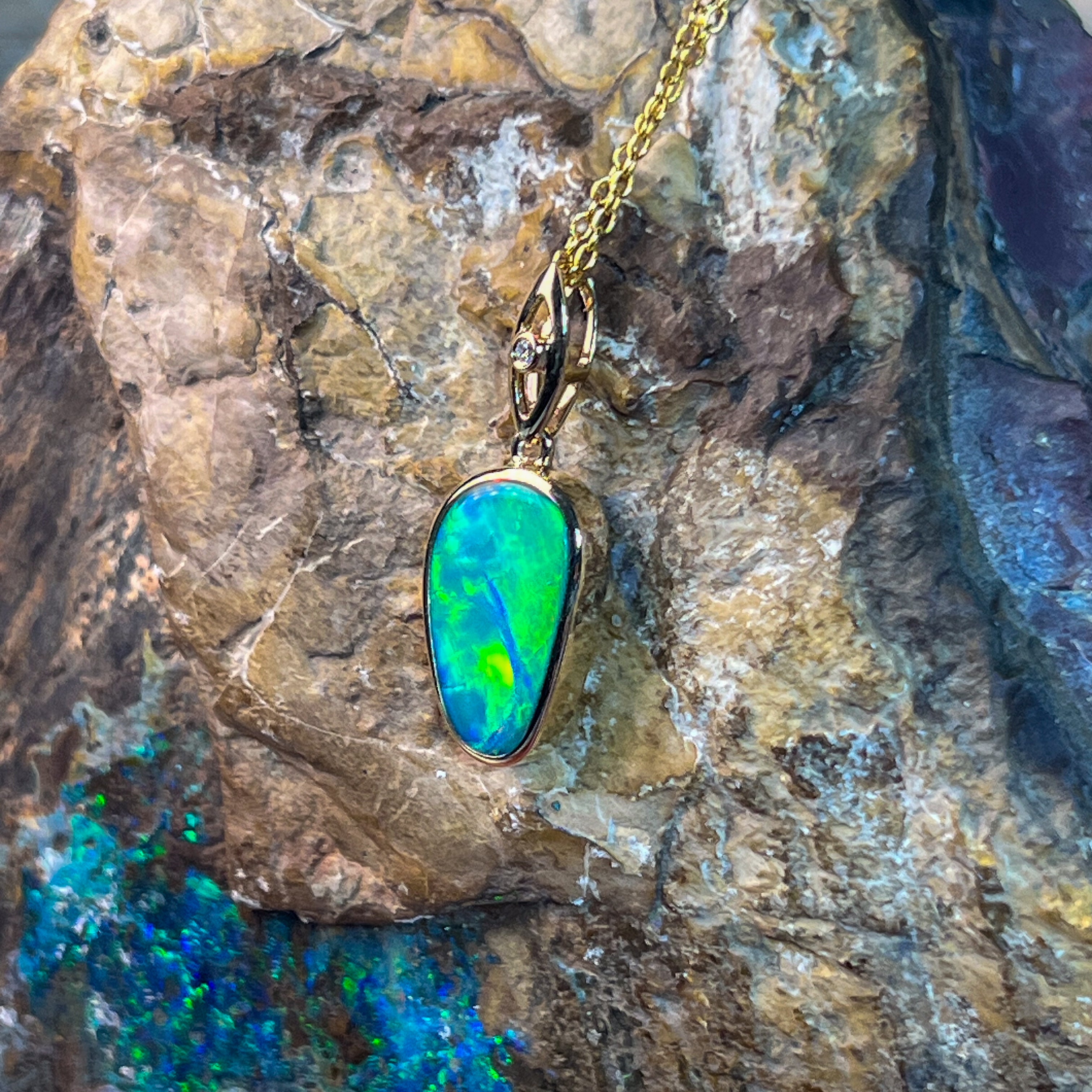 Elevate your elegance with this 14kt Yellow Gold drop style Opal doublet pendant, showcasing a strong flash of colour that captivates at every angle. Its refined design pairs timeless gold with the vibrant play of opal, making it a stunning statement piece perfect for any occasion. Experience the allure of radiant hues and sophisticated craftsmanship in one exquisite pendant.