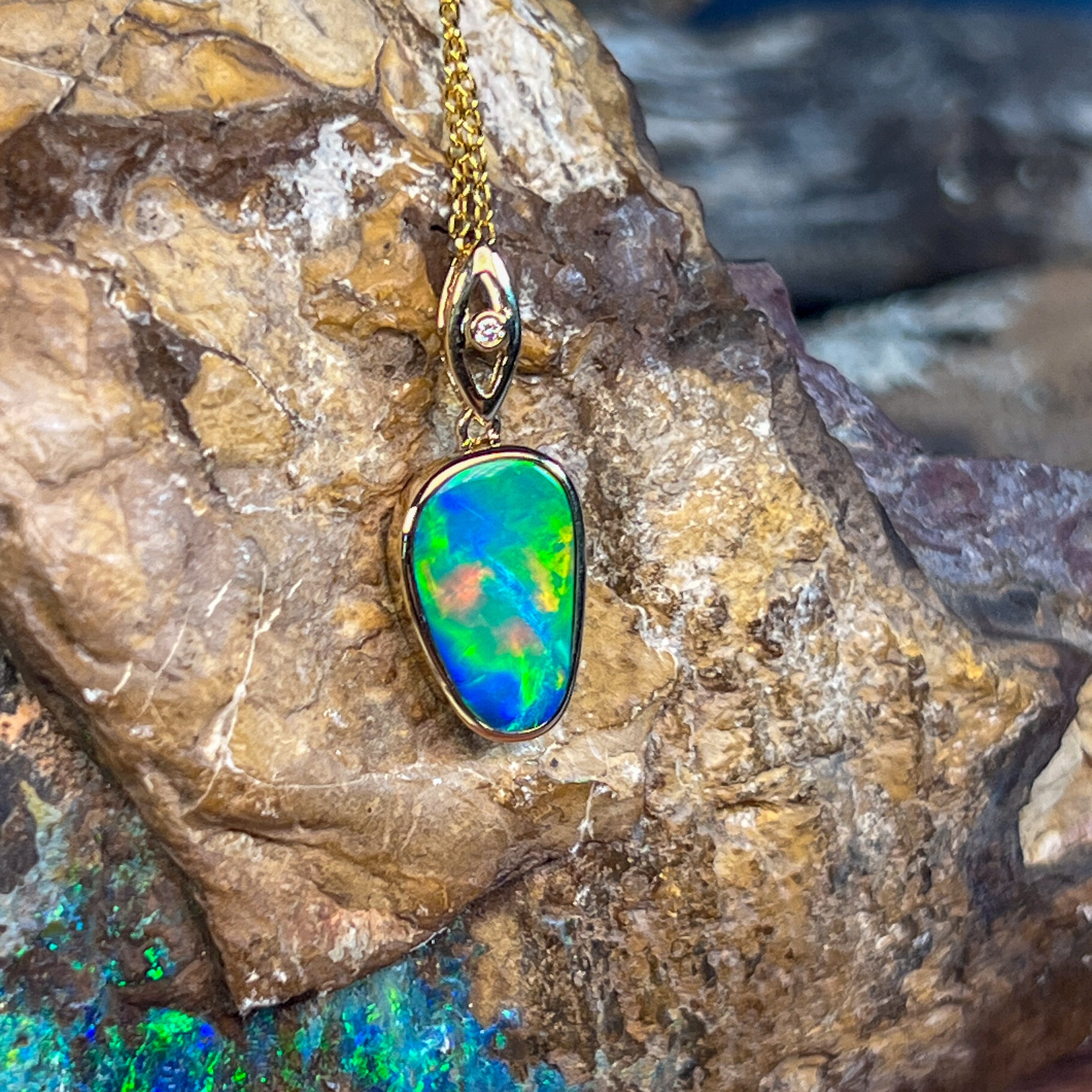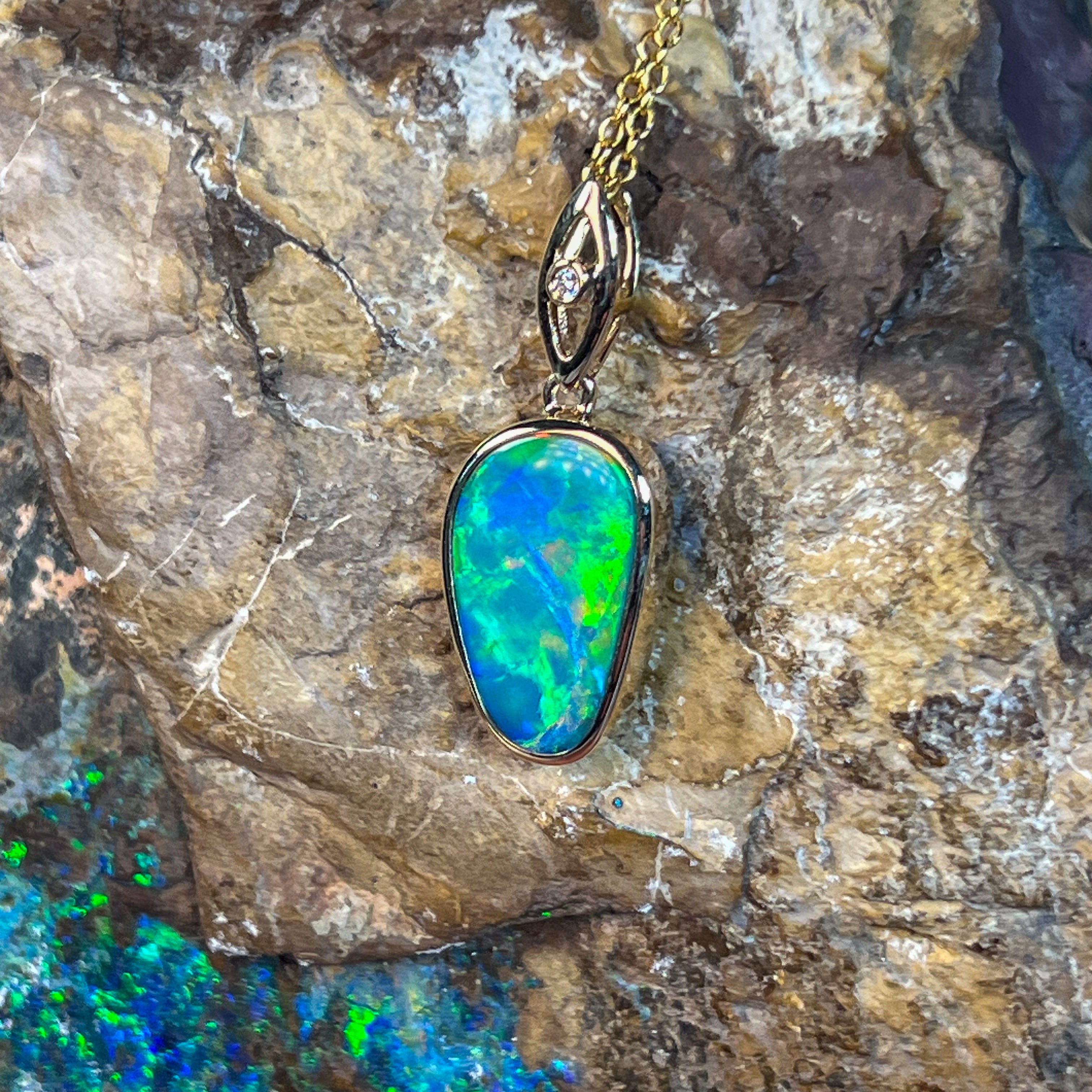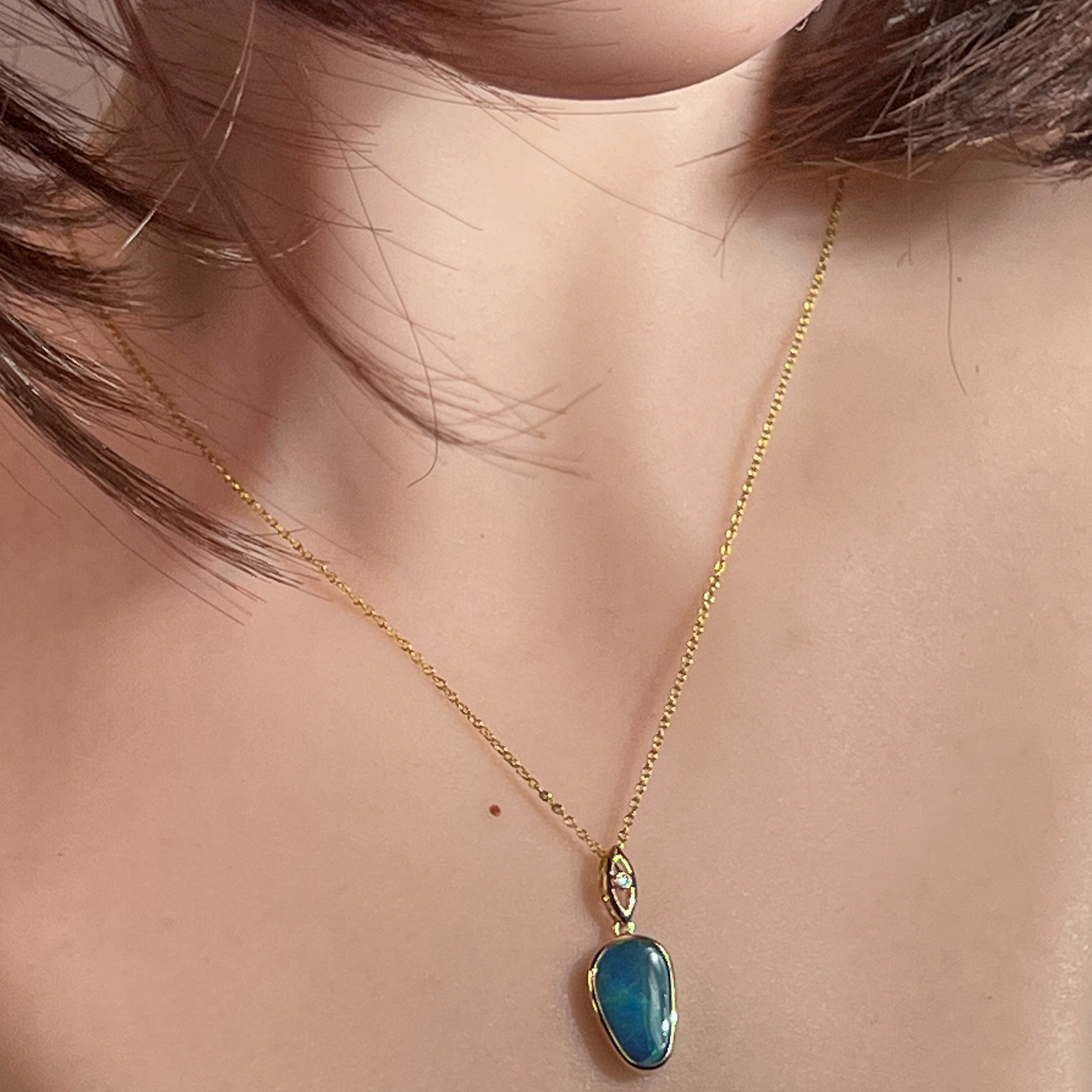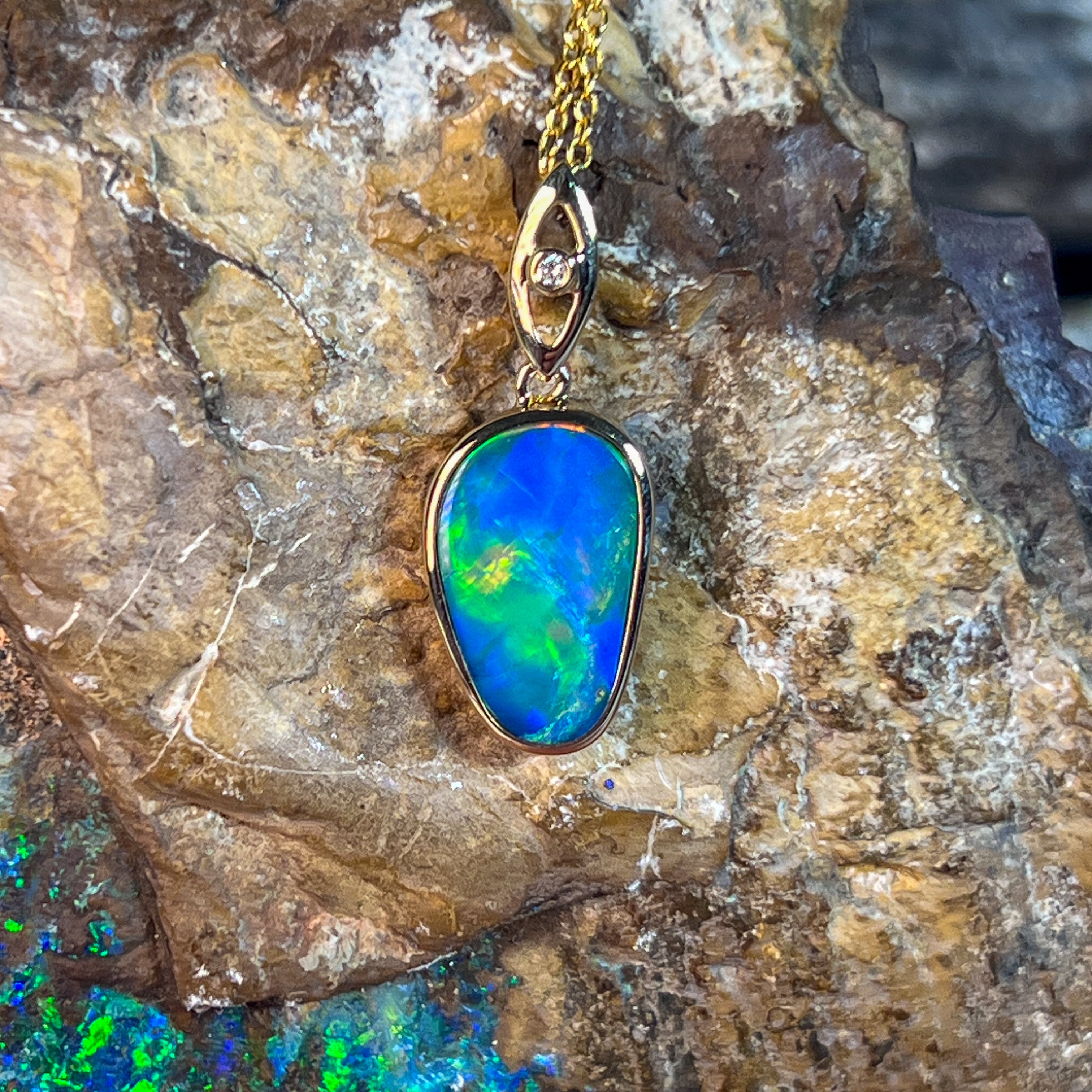 Elevate your elegance with this 14kt Yellow Gold drop style Opal doublet pendant, showcasing a strong flash of colour that captivates at every angle. Its refined design pairs timeless gold with the vibrant play of opal, making it a stunning statement piece perfect for any occasion. Experience the allure of radiant hues and sophisticated craftsmanship in one exquisite pendant.