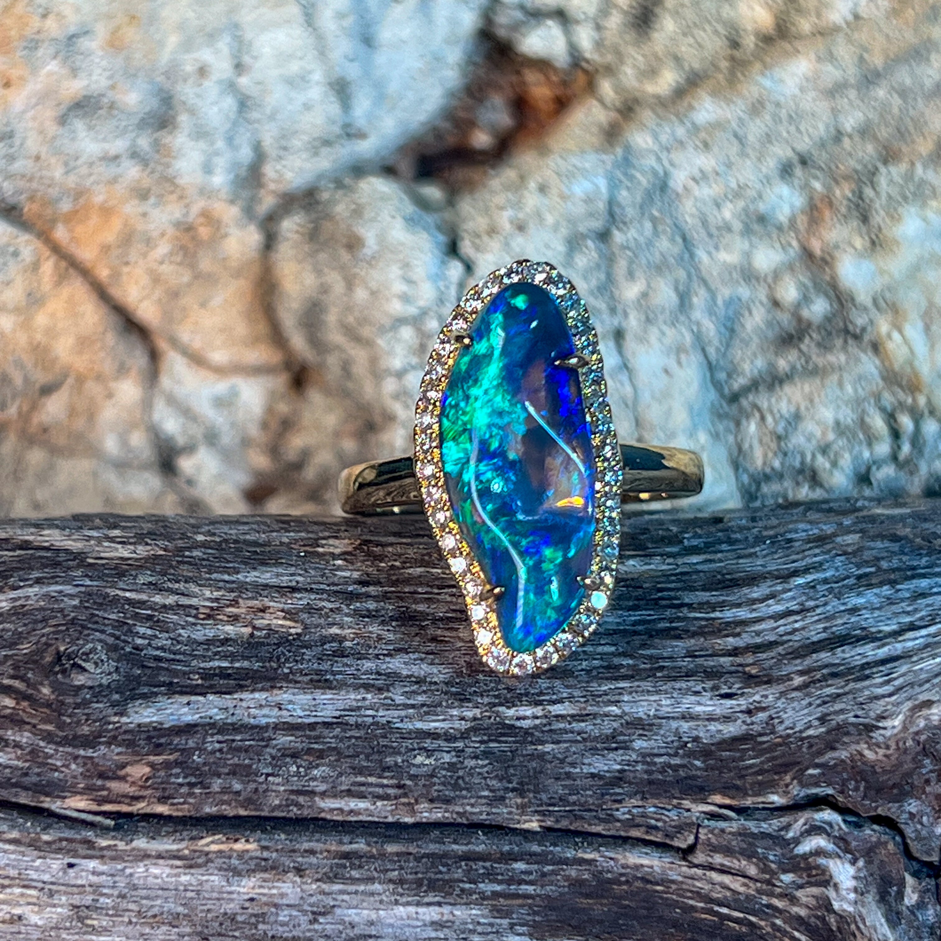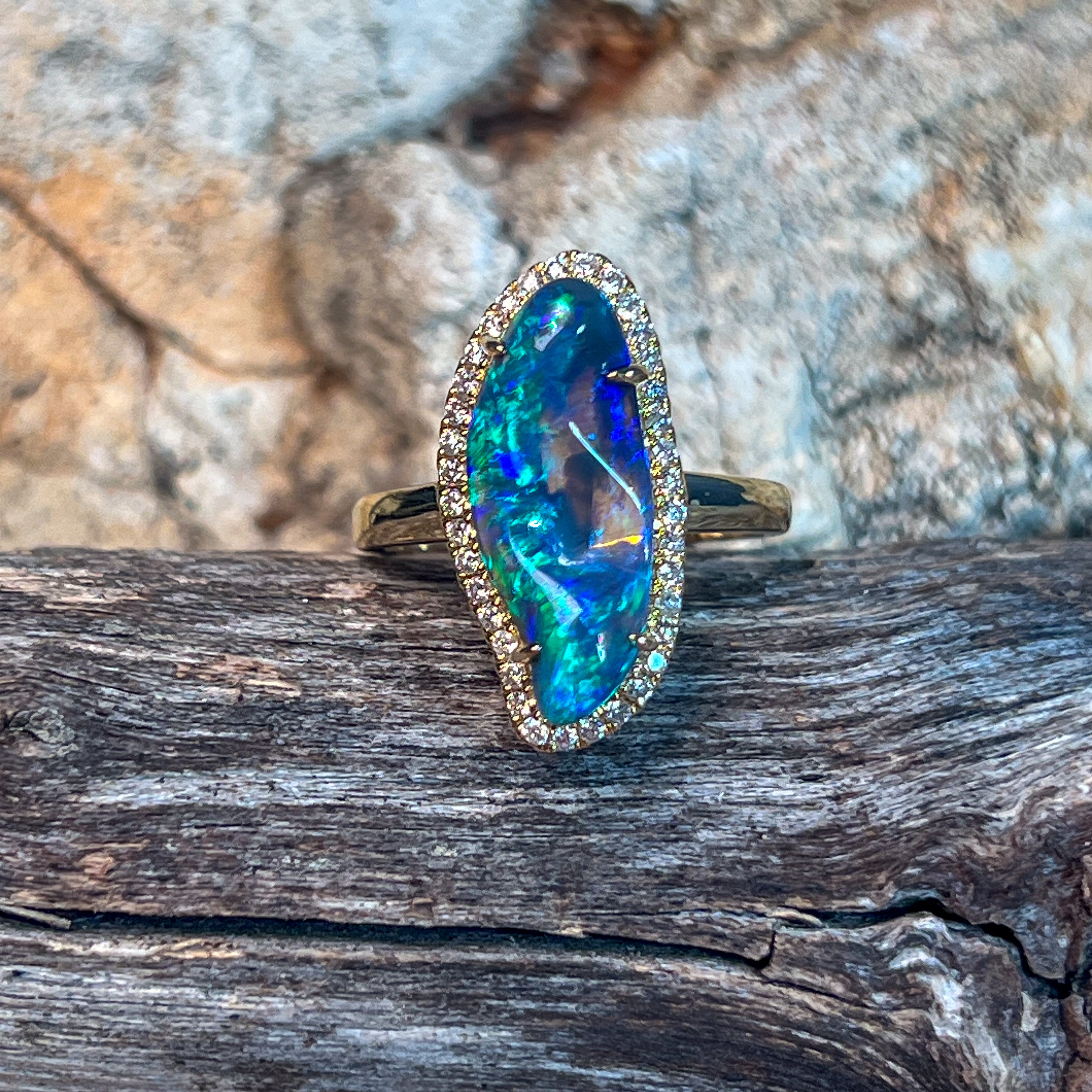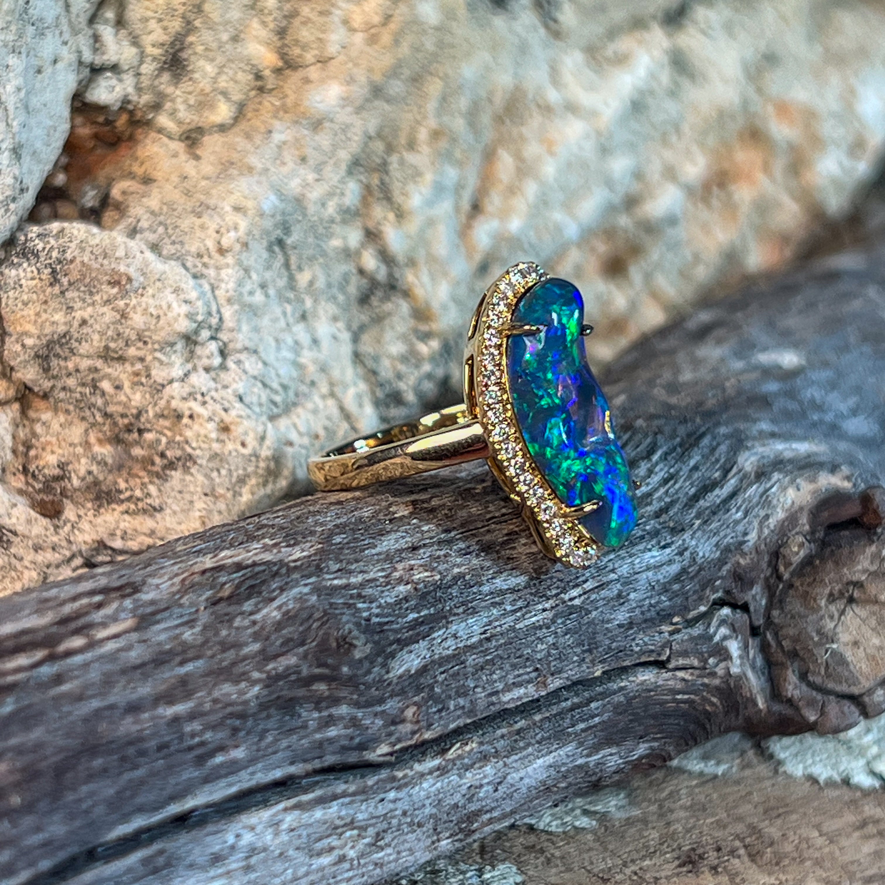 Experience the captivating allure of this 14kt yellow gold ring, featuring a stunning 2.73ct freeform black opal that showcases a natural 3D shape. Accented with sparkling diamonds, this unique piece combines organic beauty with elegant craftsmanship, making it a striking statement for any occasion. Embrace a design that highlights the opal’s vibrant play of colors and depth, ensuring you stand out with timeless sophistication.