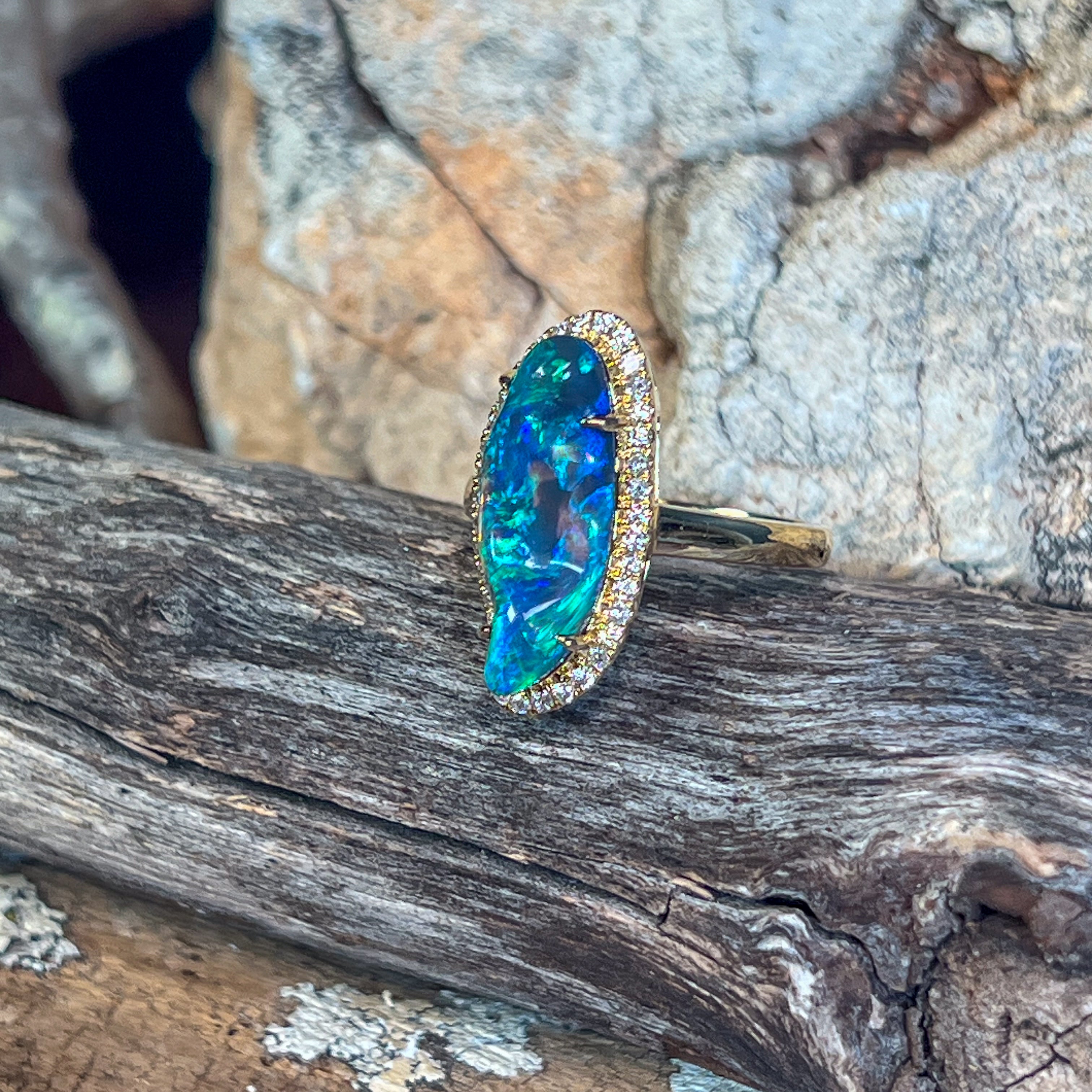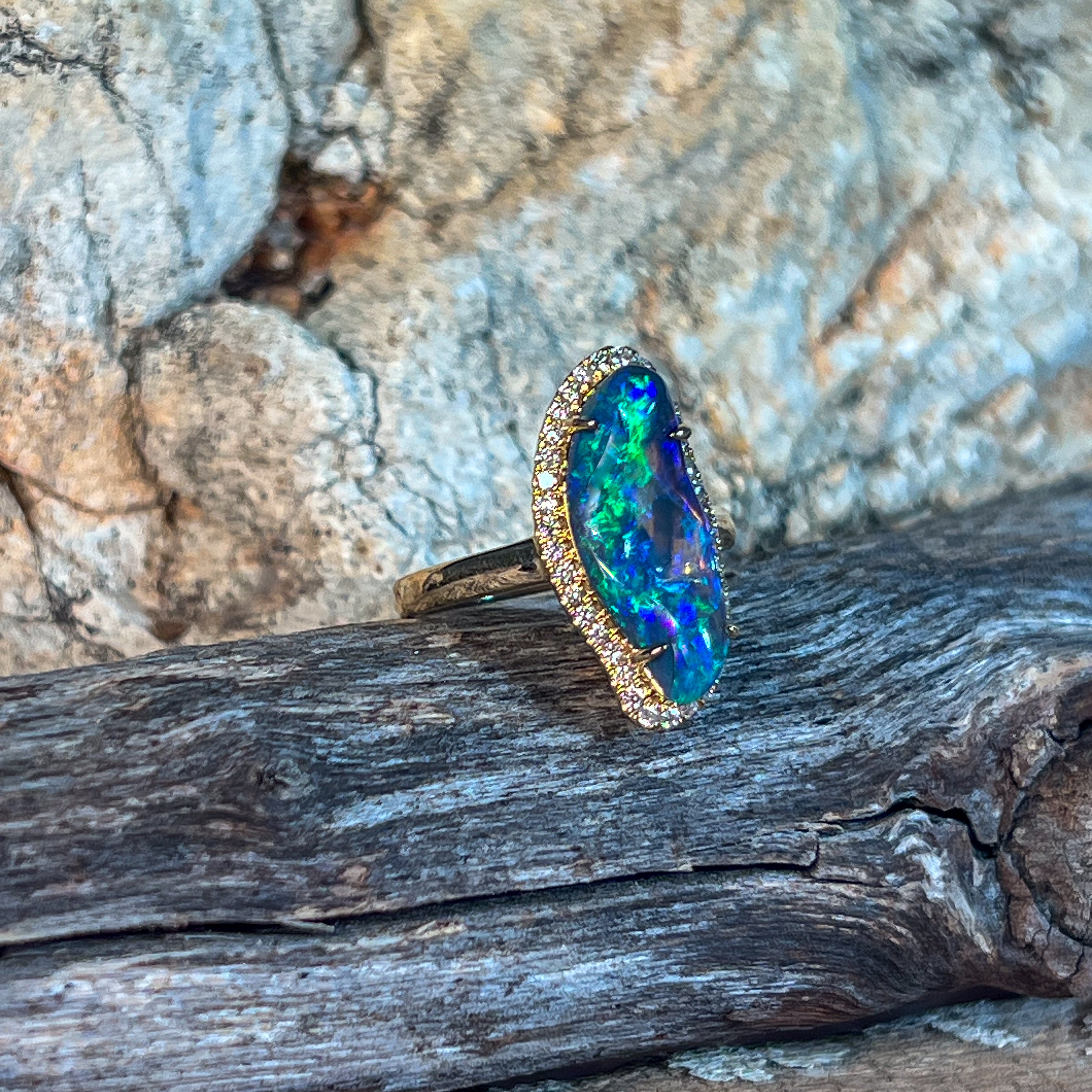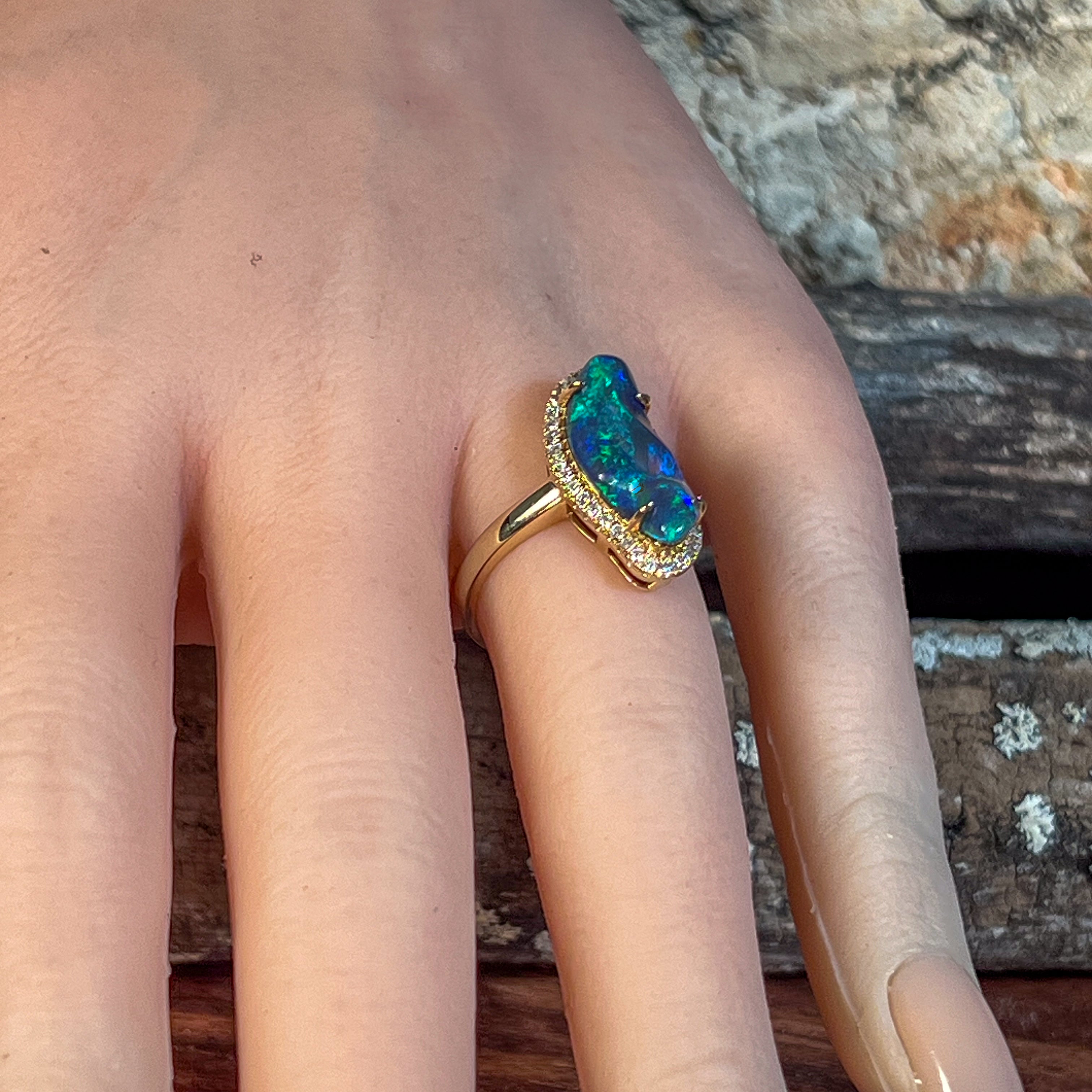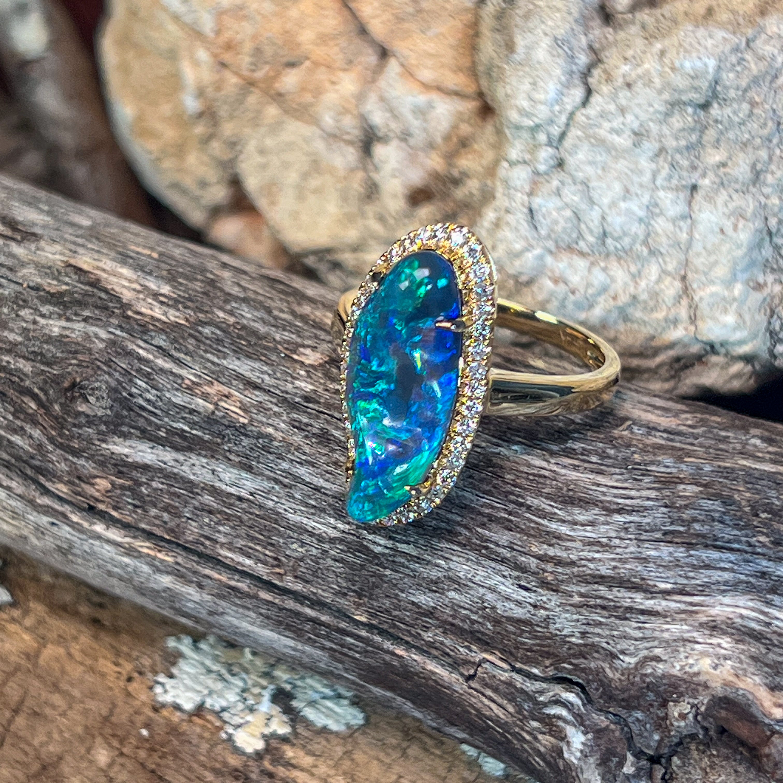 Experience the captivating allure of this 14kt yellow gold ring, featuring a stunning 2.73ct freeform black opal that showcases a natural 3D shape. Accented with sparkling diamonds, this unique piece combines organic beauty with elegant craftsmanship, making it a striking statement for any occasion. Embrace a design that highlights the opal’s vibrant play of colors and depth, ensuring you stand out with timeless sophistication.