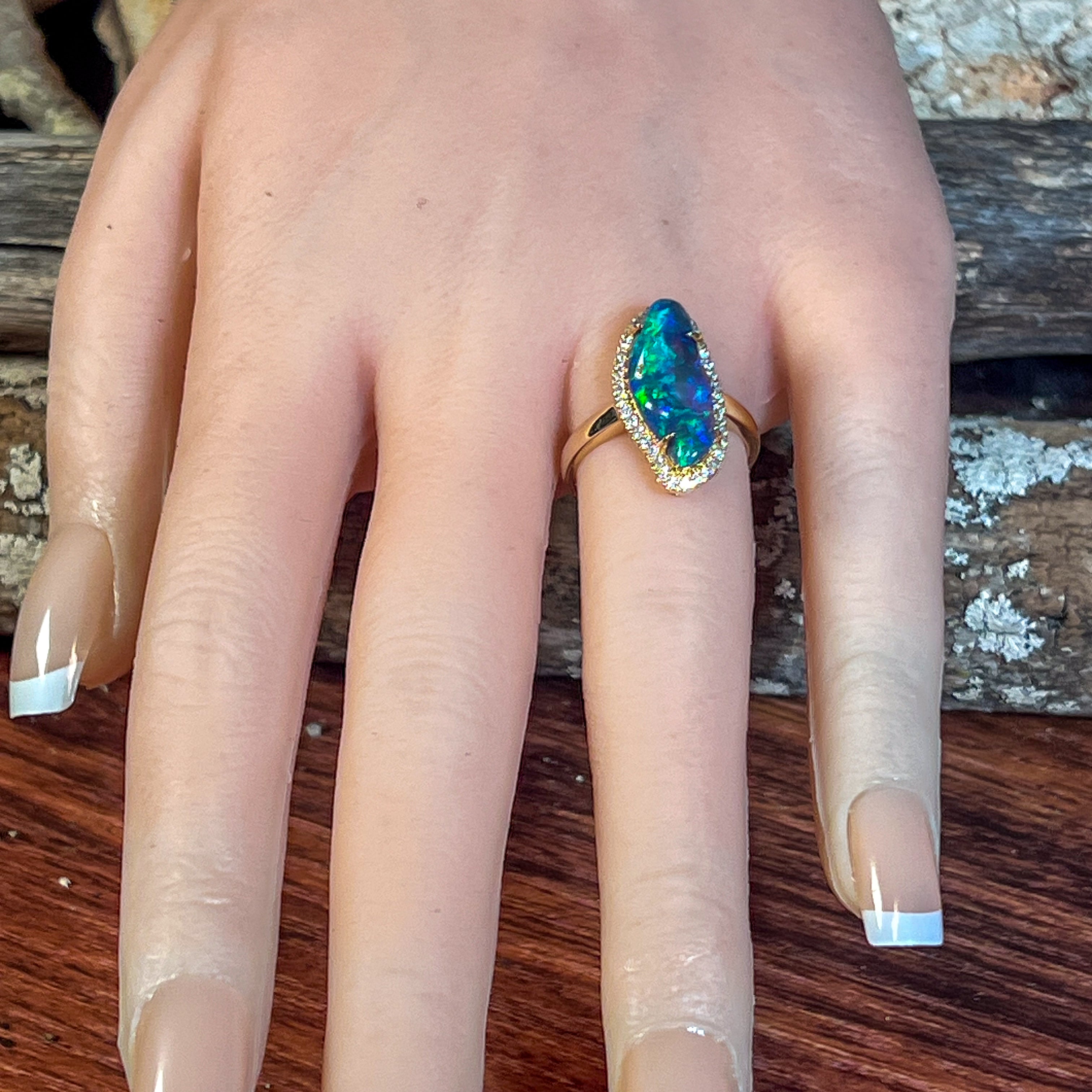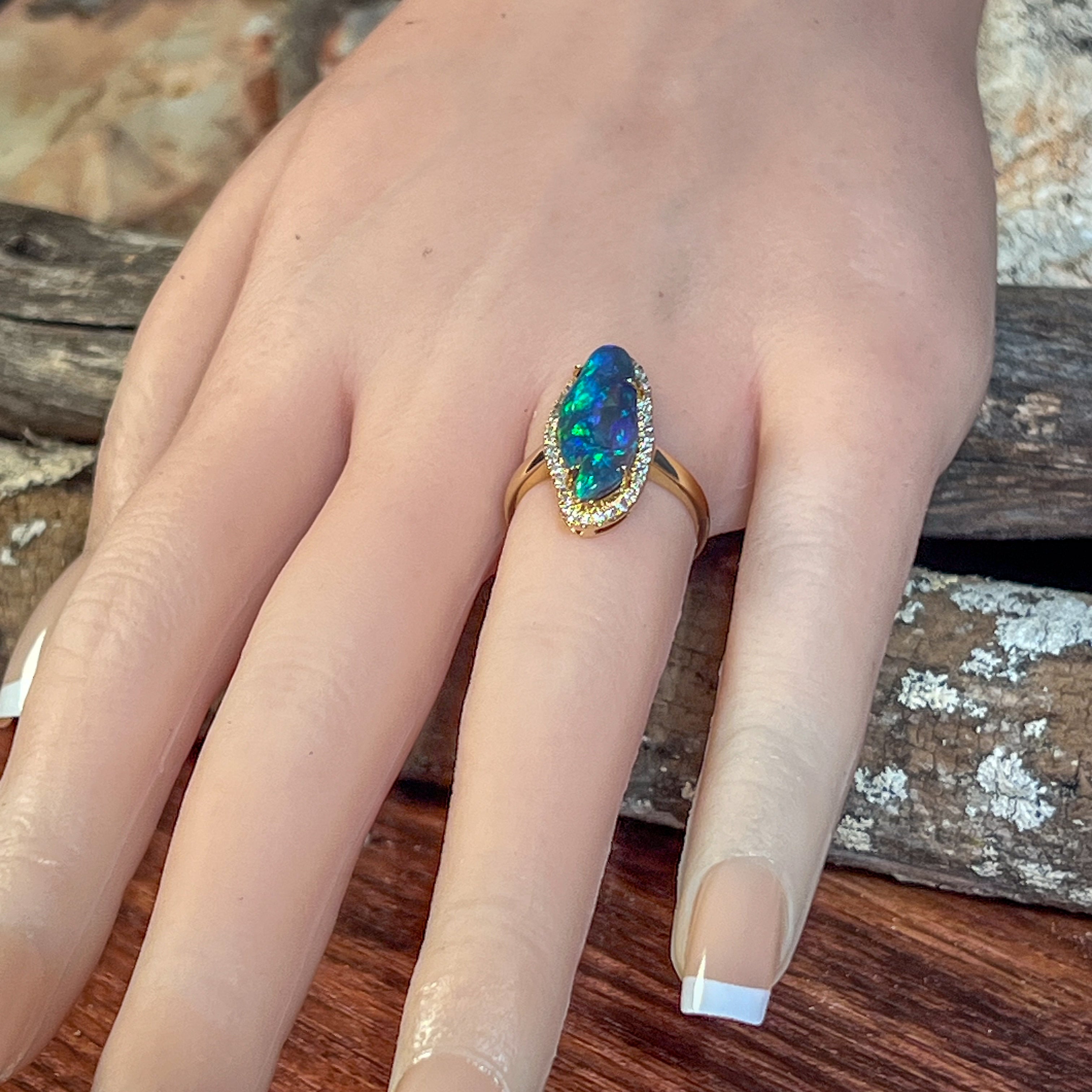 14kt Yellow Gold freeform Black Opal 2.73ct and diamond ring