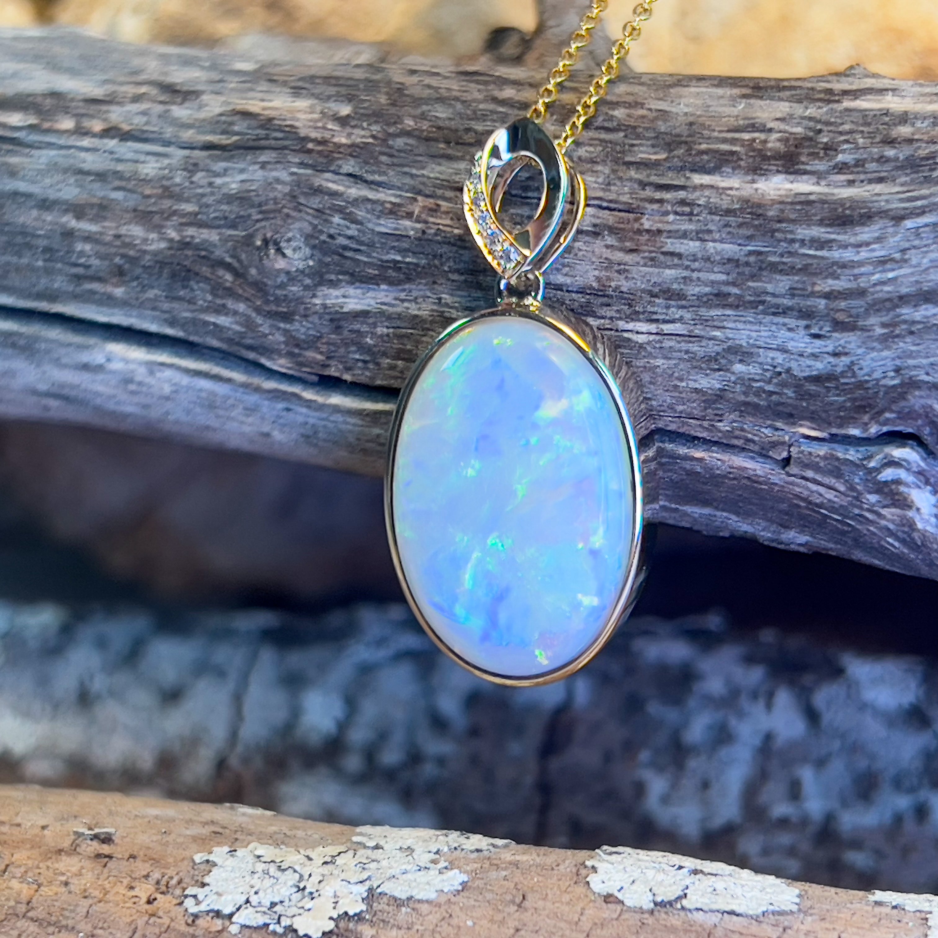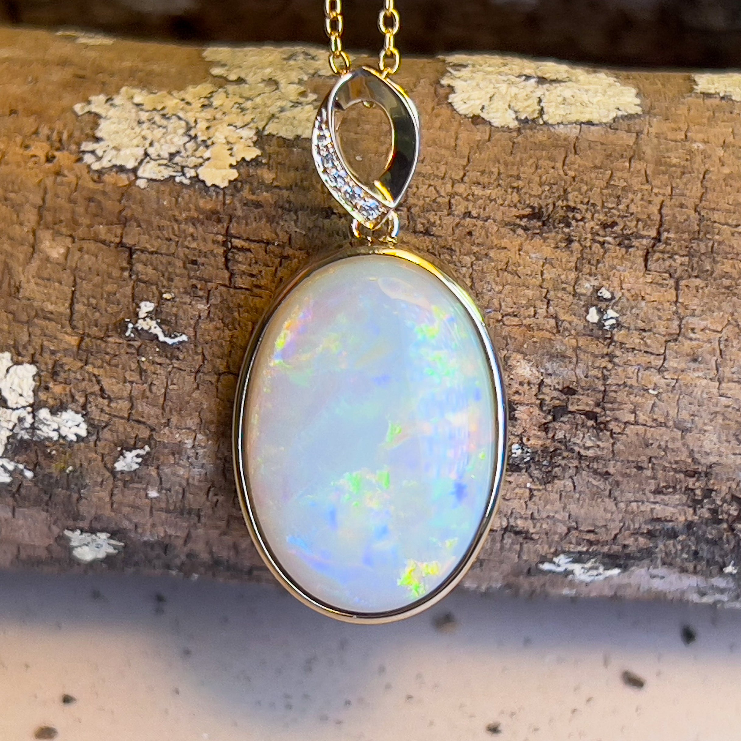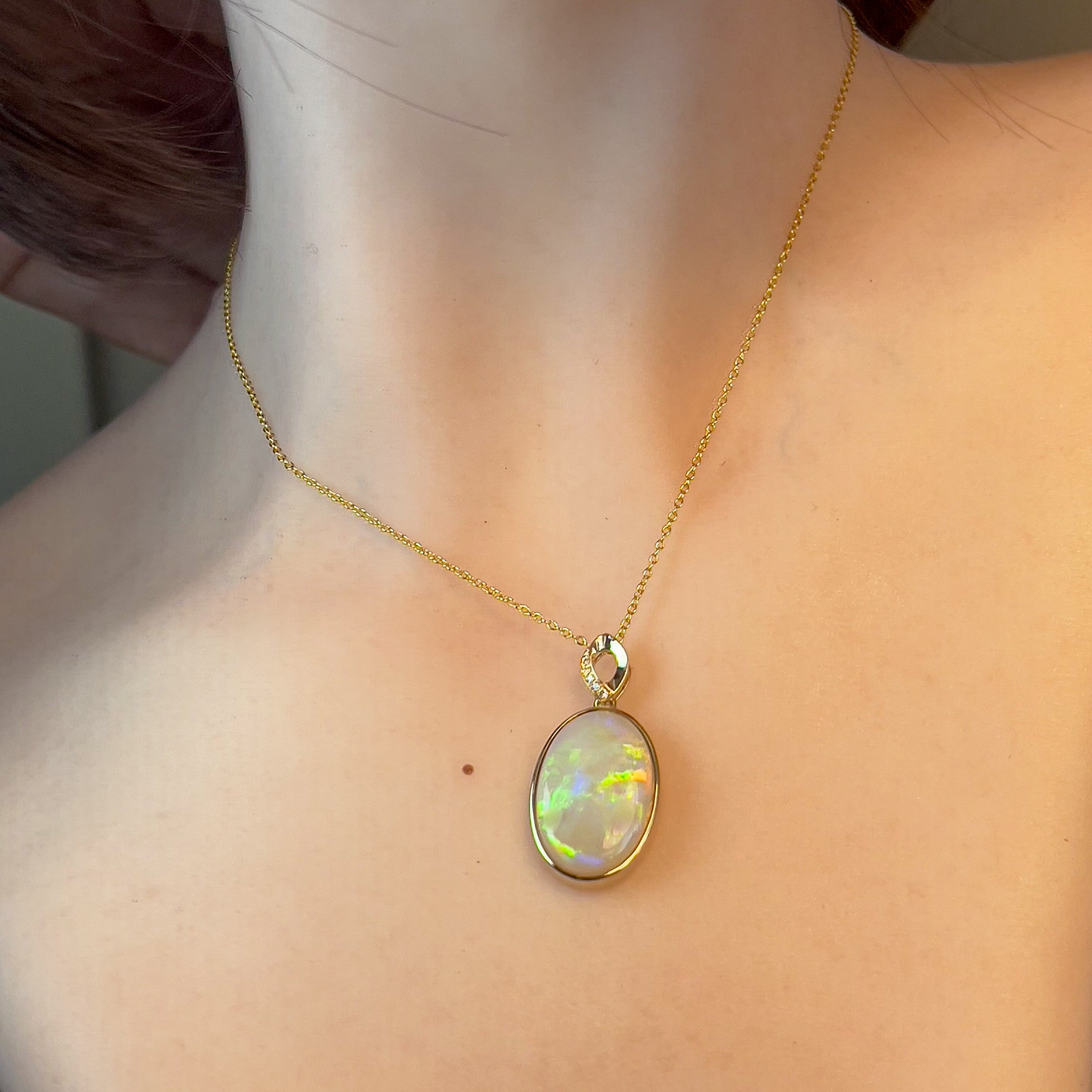 Shine bright with our 14kt Yellow Gold Large Opal Pendant. The 11.26ct oval shape opal showcases an array of stunning colors, perfect for adding a pop of fun to any outfit. Bezel set in yellow gold, this classic white opal pendant is a must-have addition to your jewelry collection.