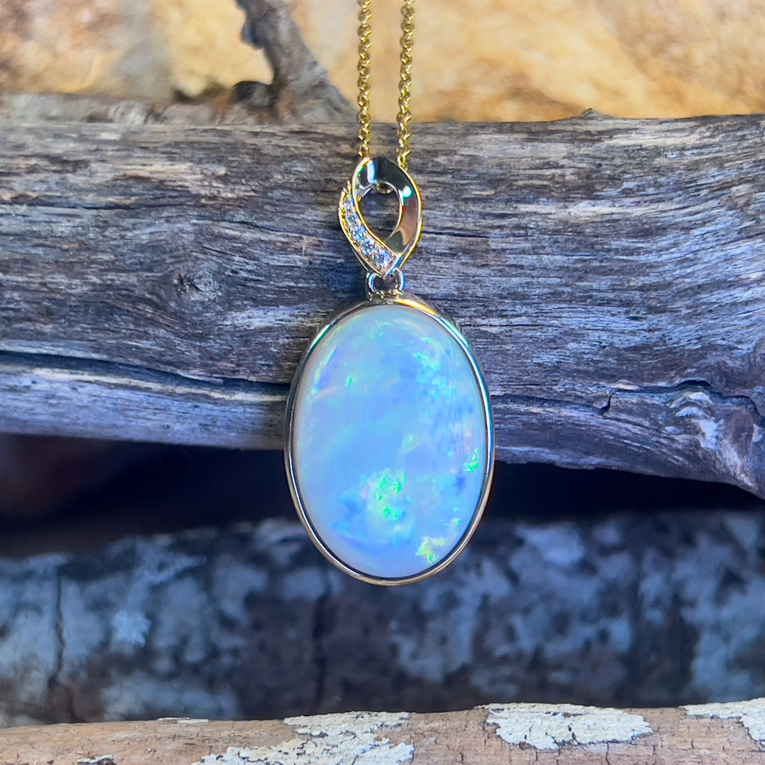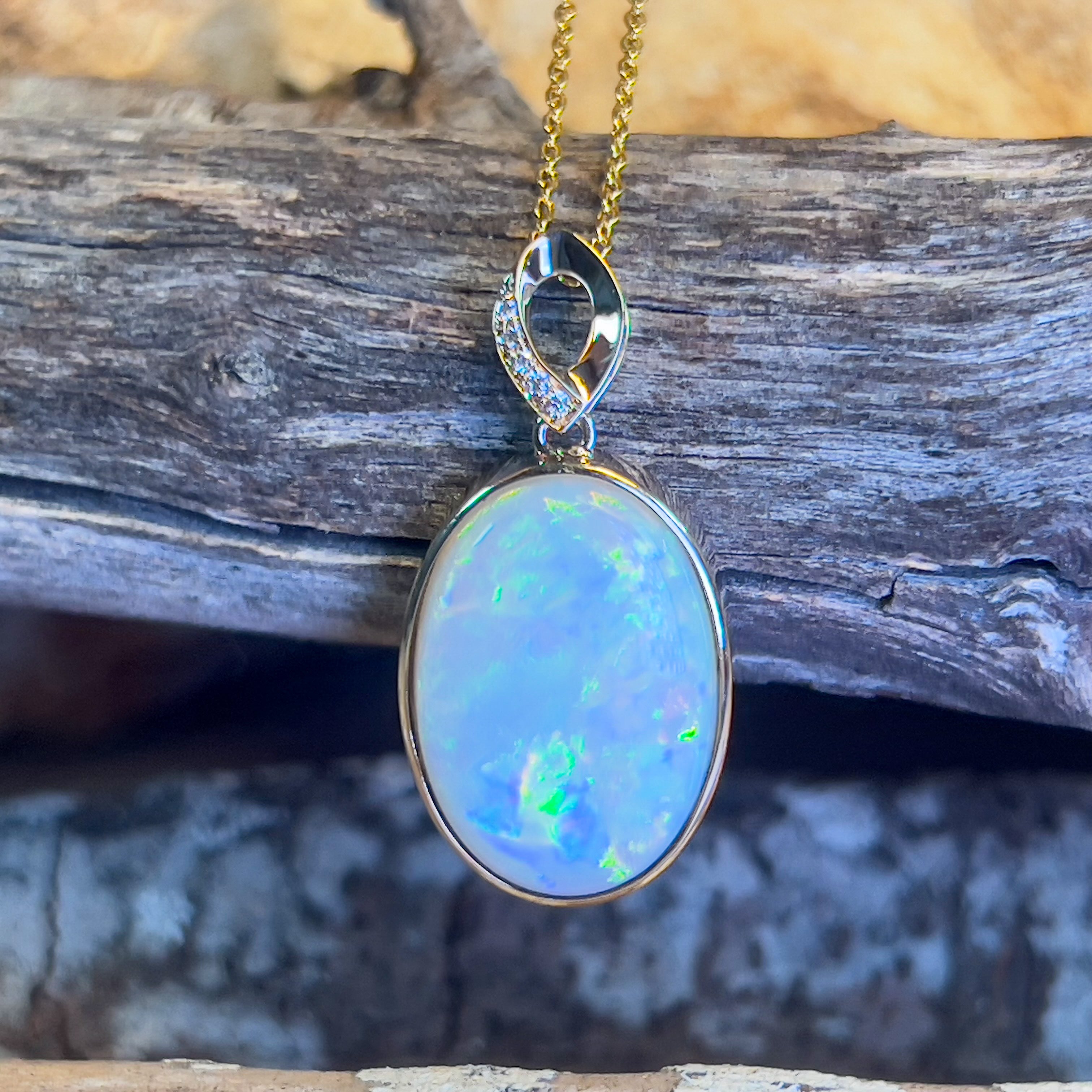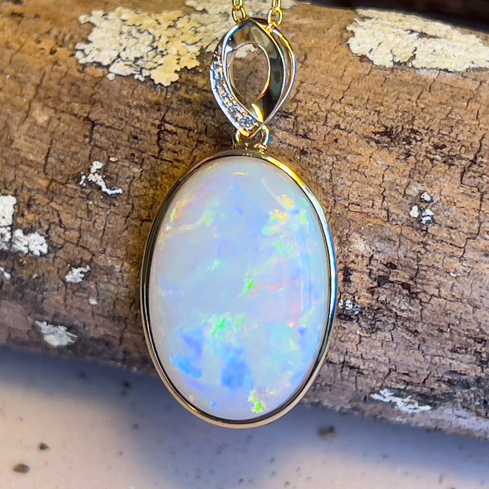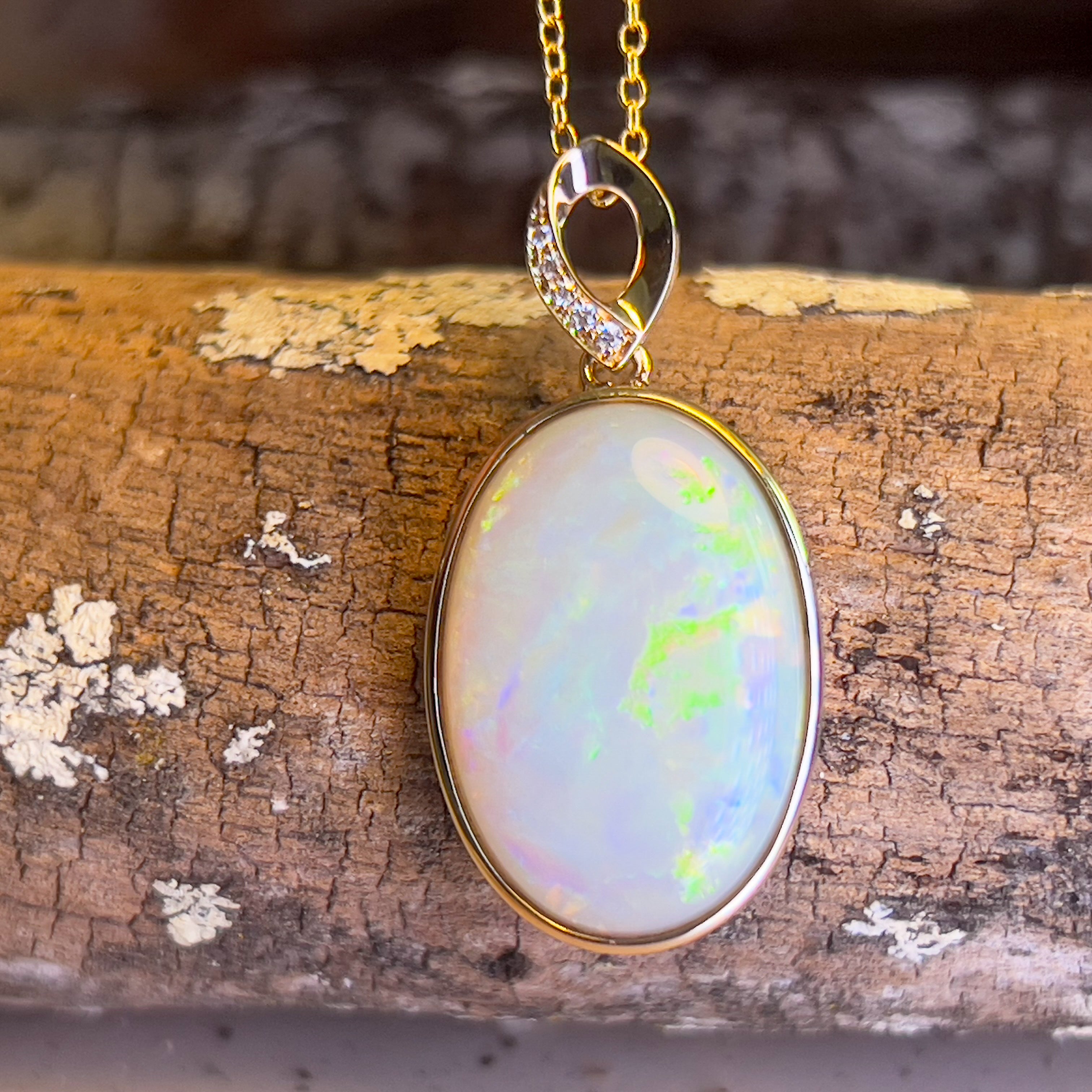 Shine bright with our 14kt Yellow Gold Large Opal Pendant. The 11.26ct oval shape opal showcases an array of stunning colors, perfect for adding a pop of fun to any outfit. Bezel set in yellow gold, this classic white opal pendant is a must-have addition to your jewelry collection.