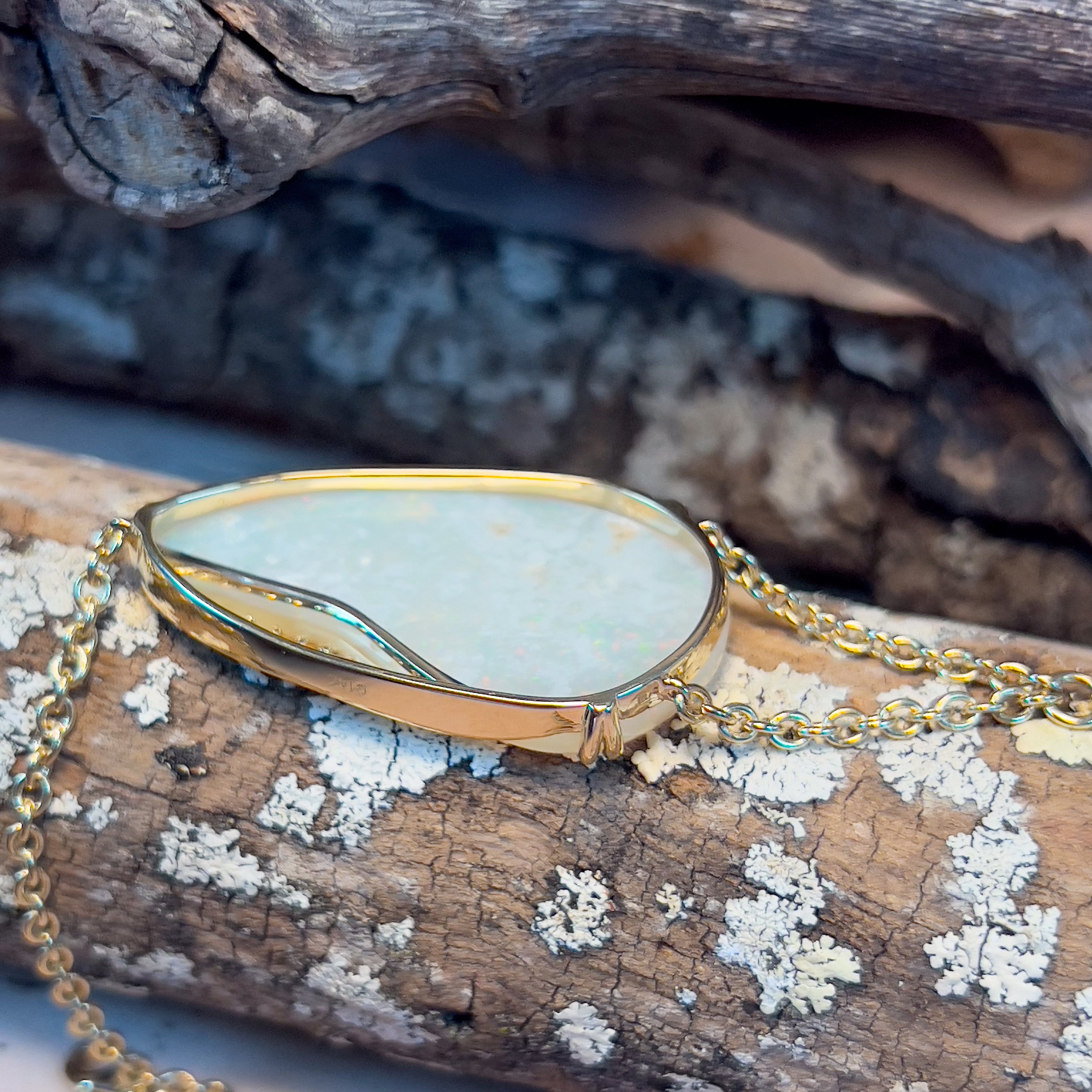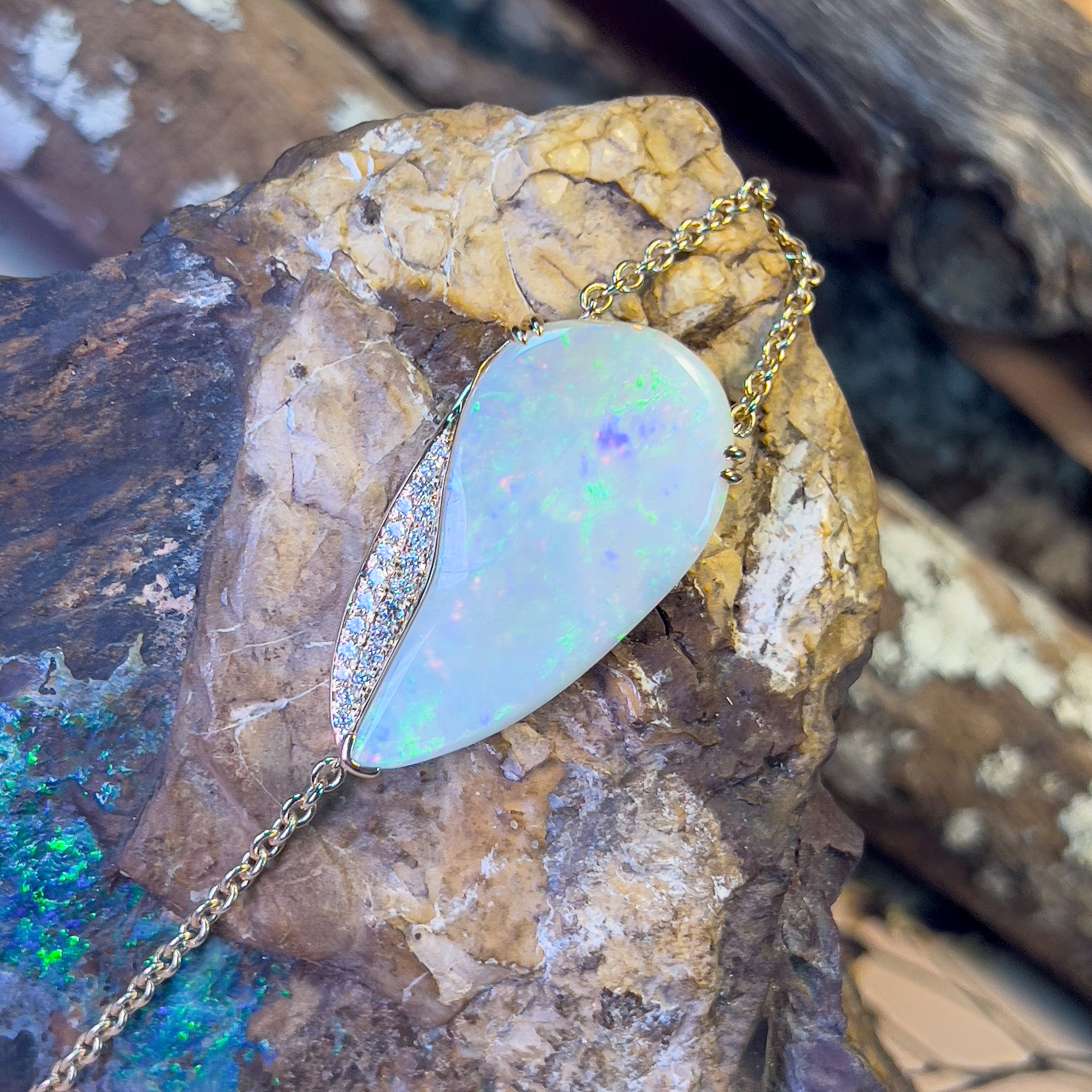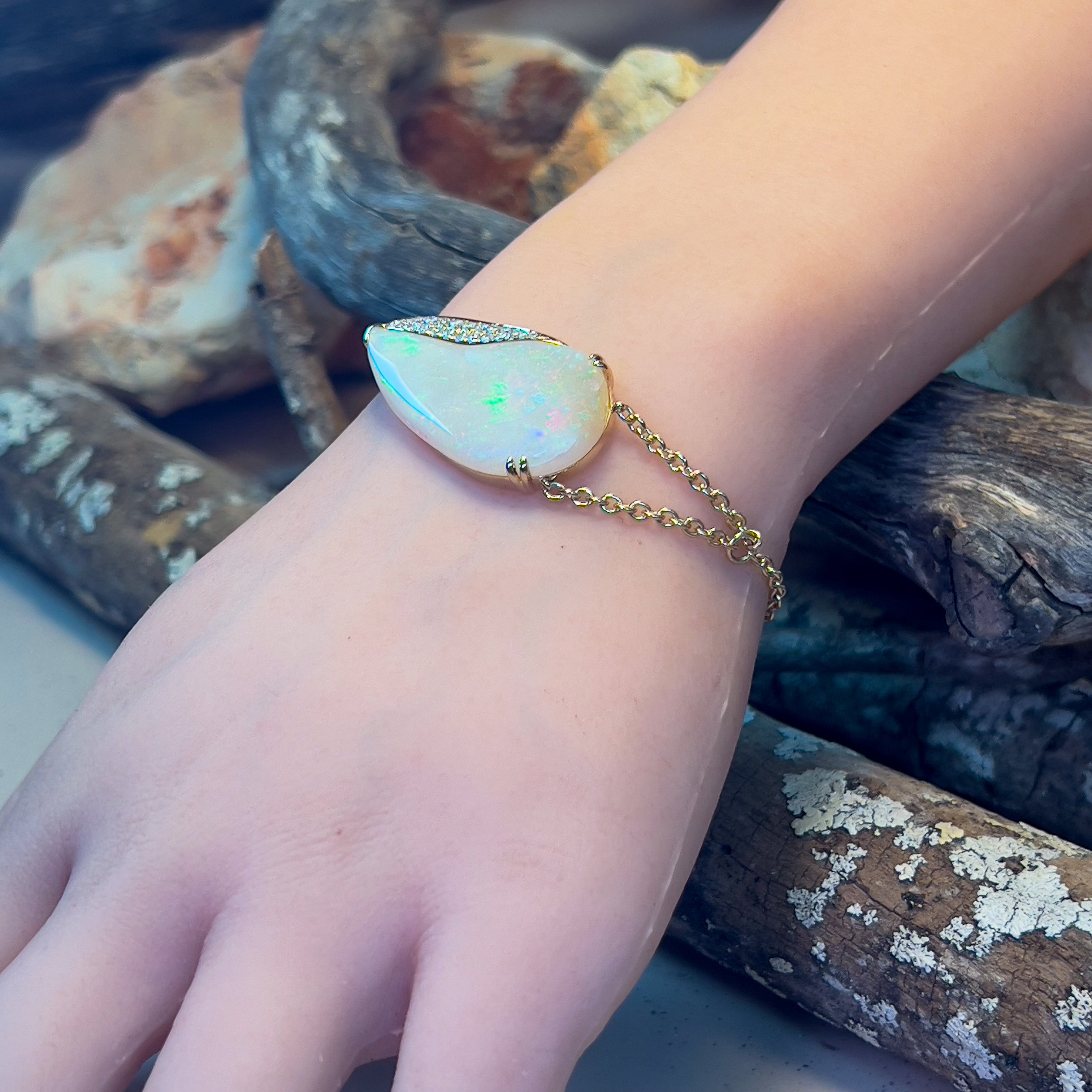 Elevate your look with our stunning 14KT Yellow Gold Large White Opal bracelet, adorned with sparkling diamonds. Perfect for any occasion, this opal bracelet adds a touch of elegance and sophistication to any outfit. Discover the timeless beauty and natural iridescence of opals with this must-have piece for women.