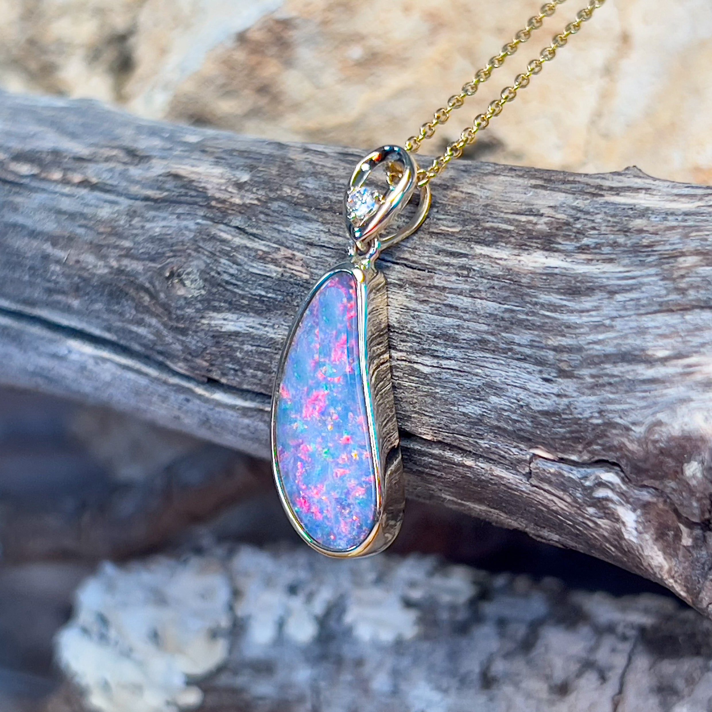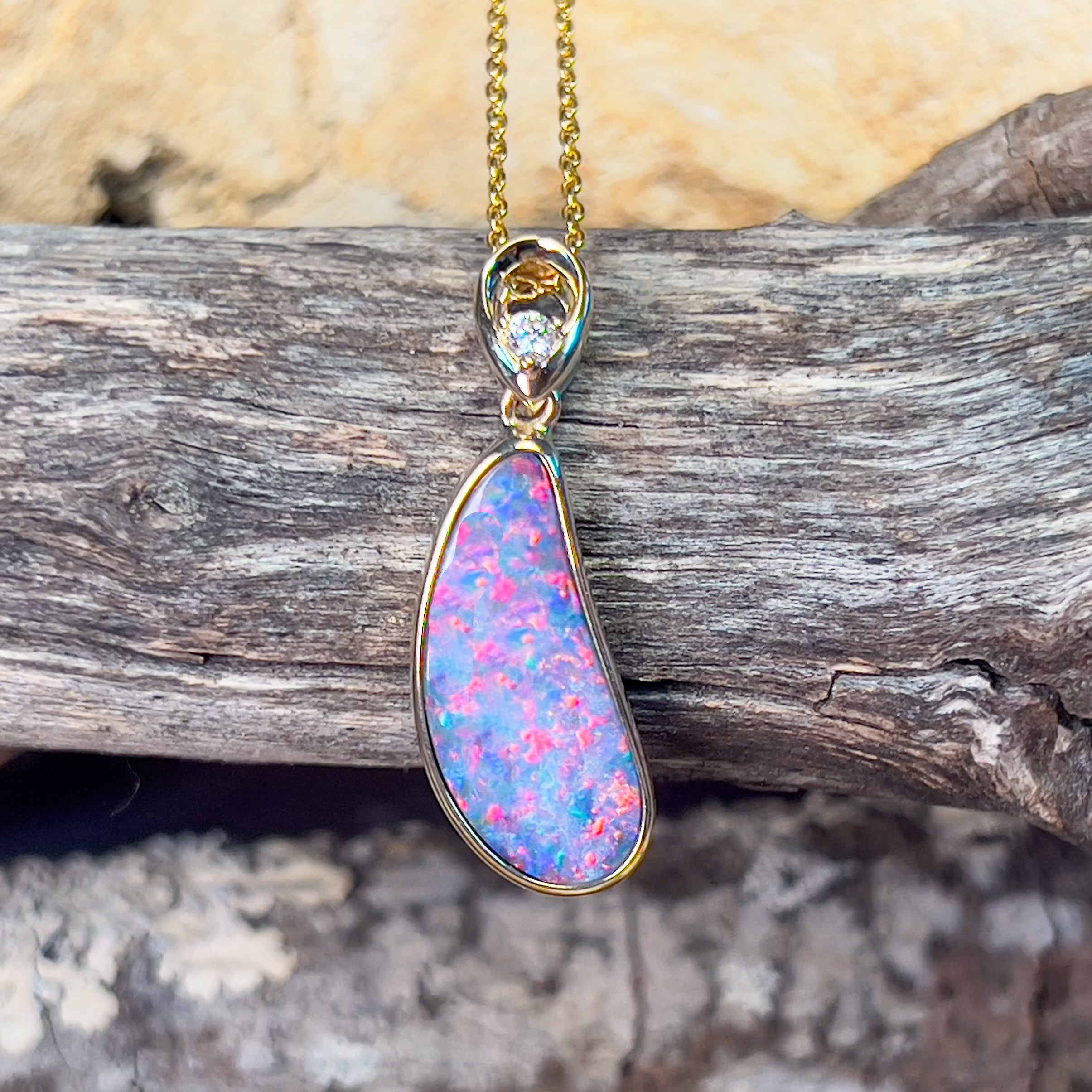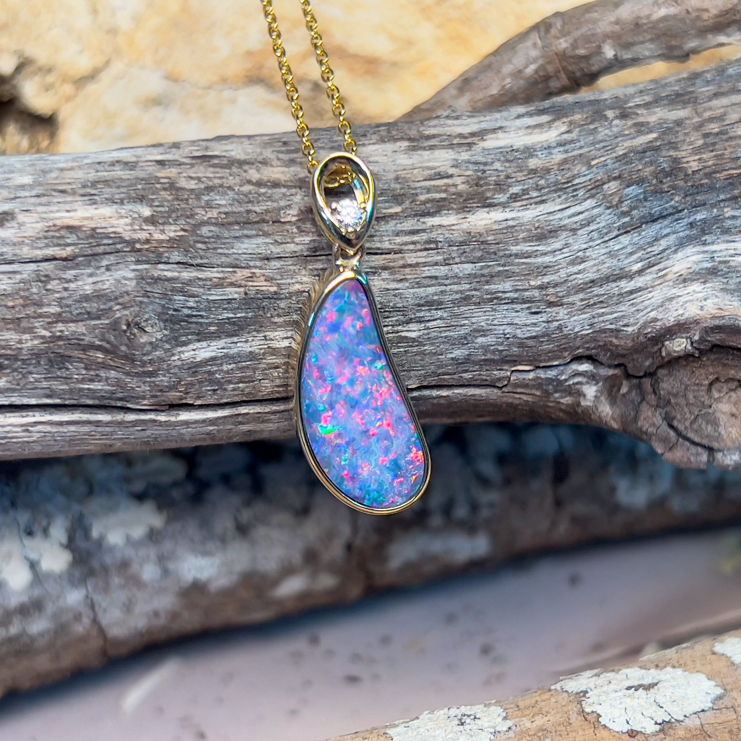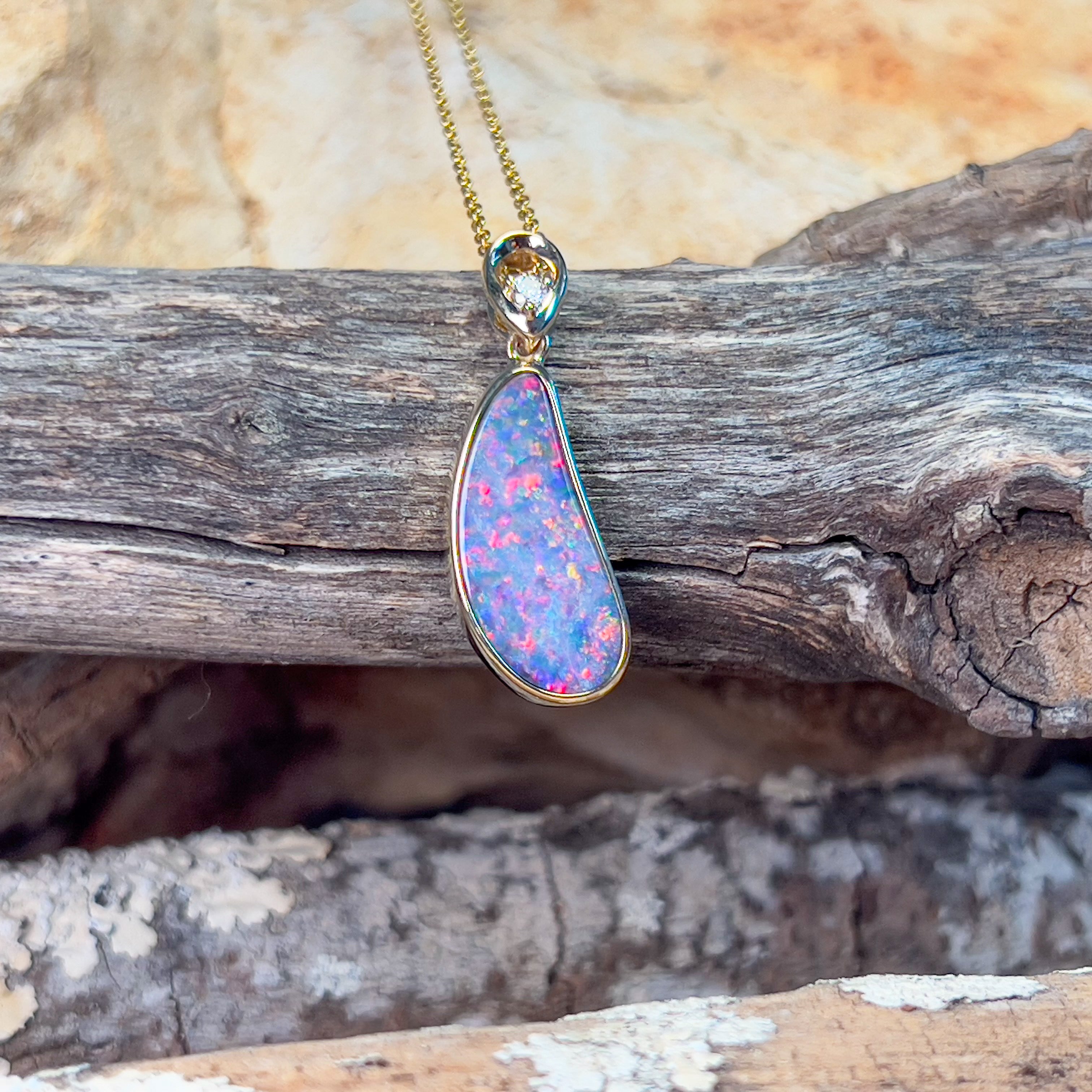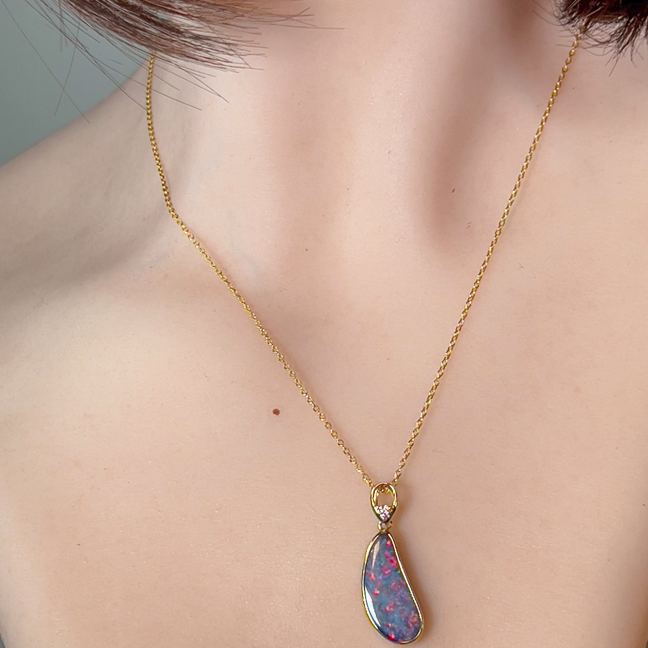 This 14kt Yellow Gold long shape Opal doublet 4.24ct pendant features a stunning freeform red multicolours opal necklace that will add a pop of color to any outfit. Let the fiery colors and unique shape inspire your sense of style and elevate your look. An eye-catching accessory that will not go unnoticed.
