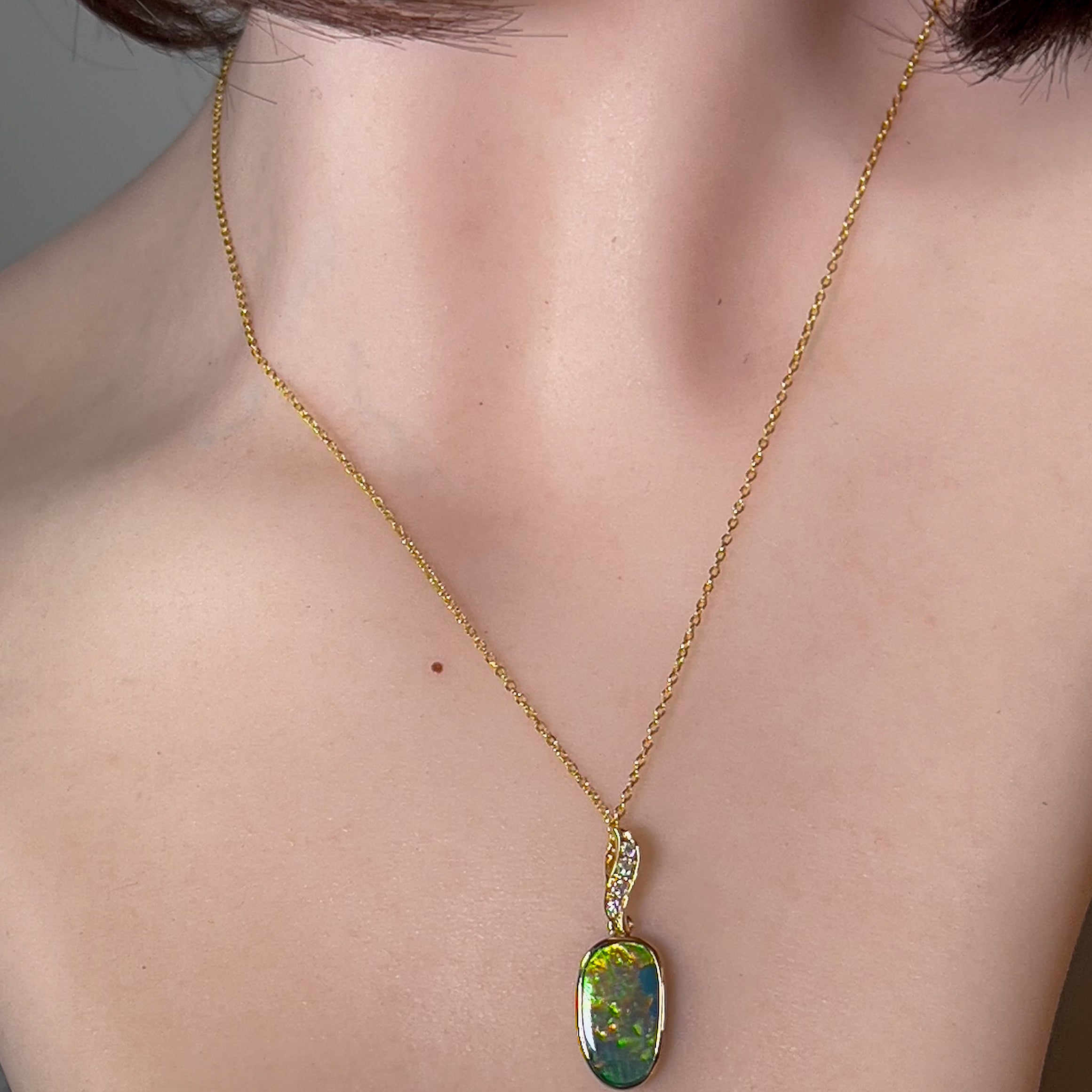 Sparkle and shine with this 14kt Yellow Gold Opal doublet pendant. The mesmerizing 3.1ct opal is set in glowing yellow gold and accented with dazzling diamonds. Elevate any outfit with this statement necklace that radiates both elegance and playfulness.