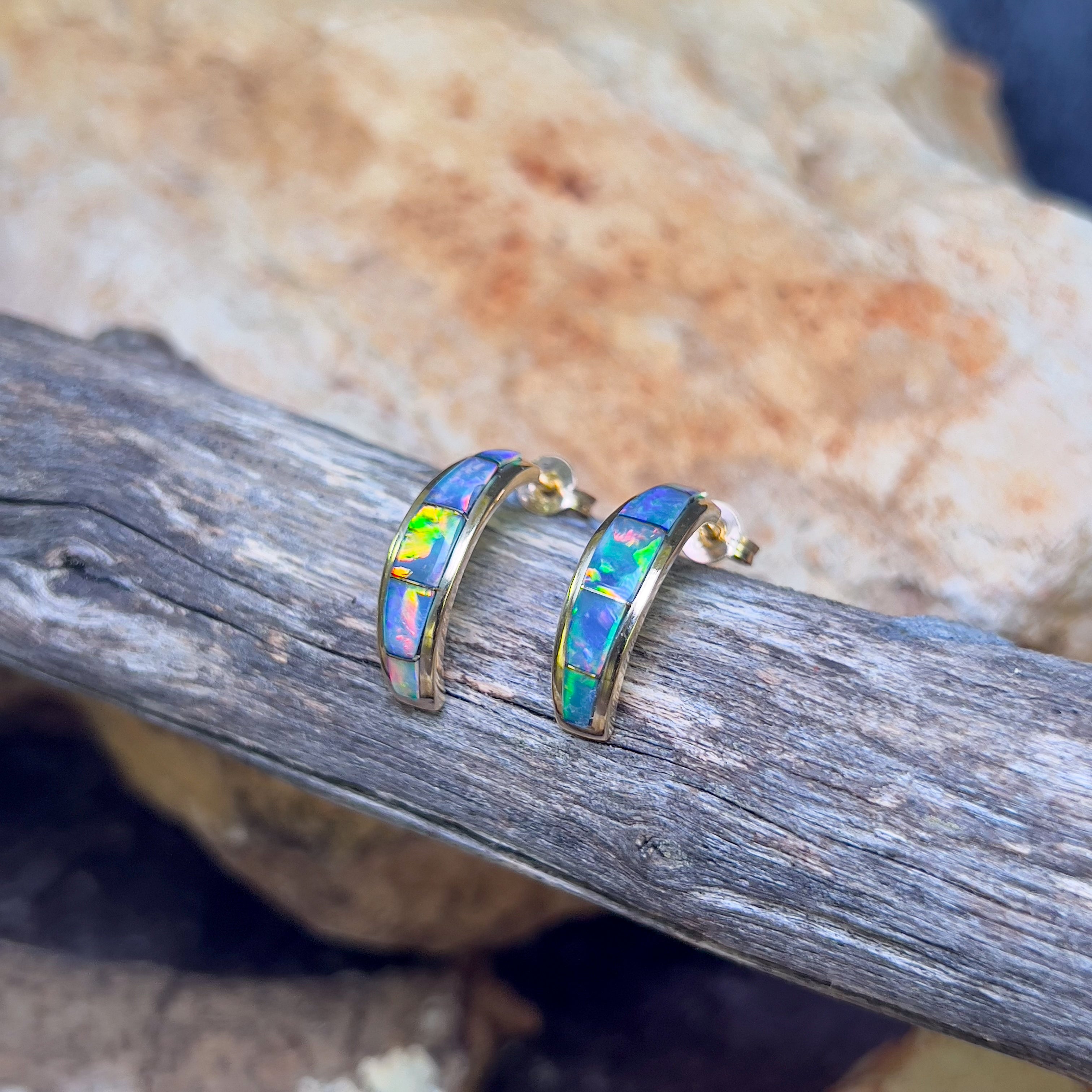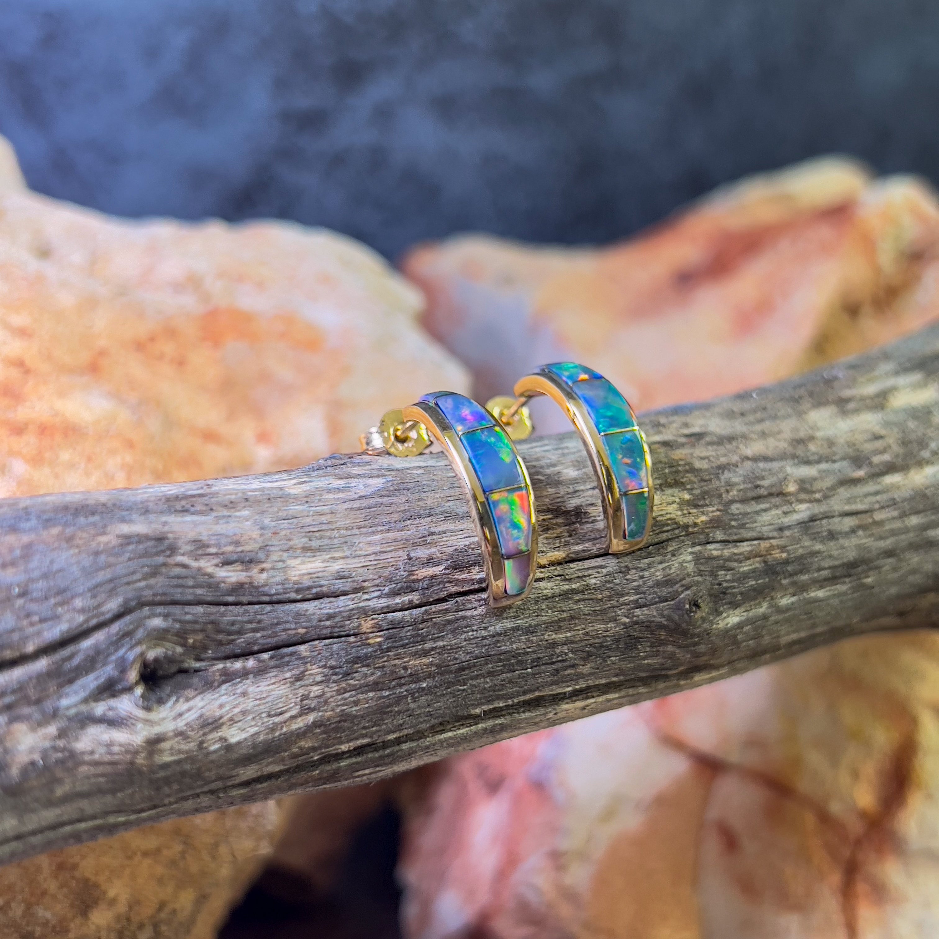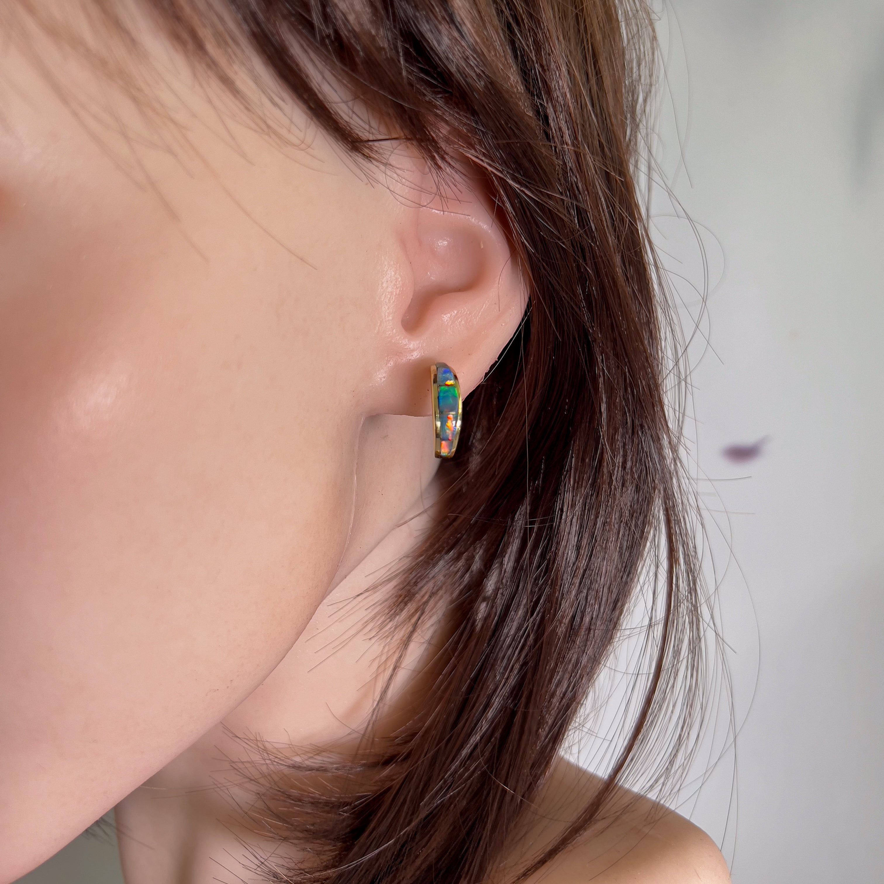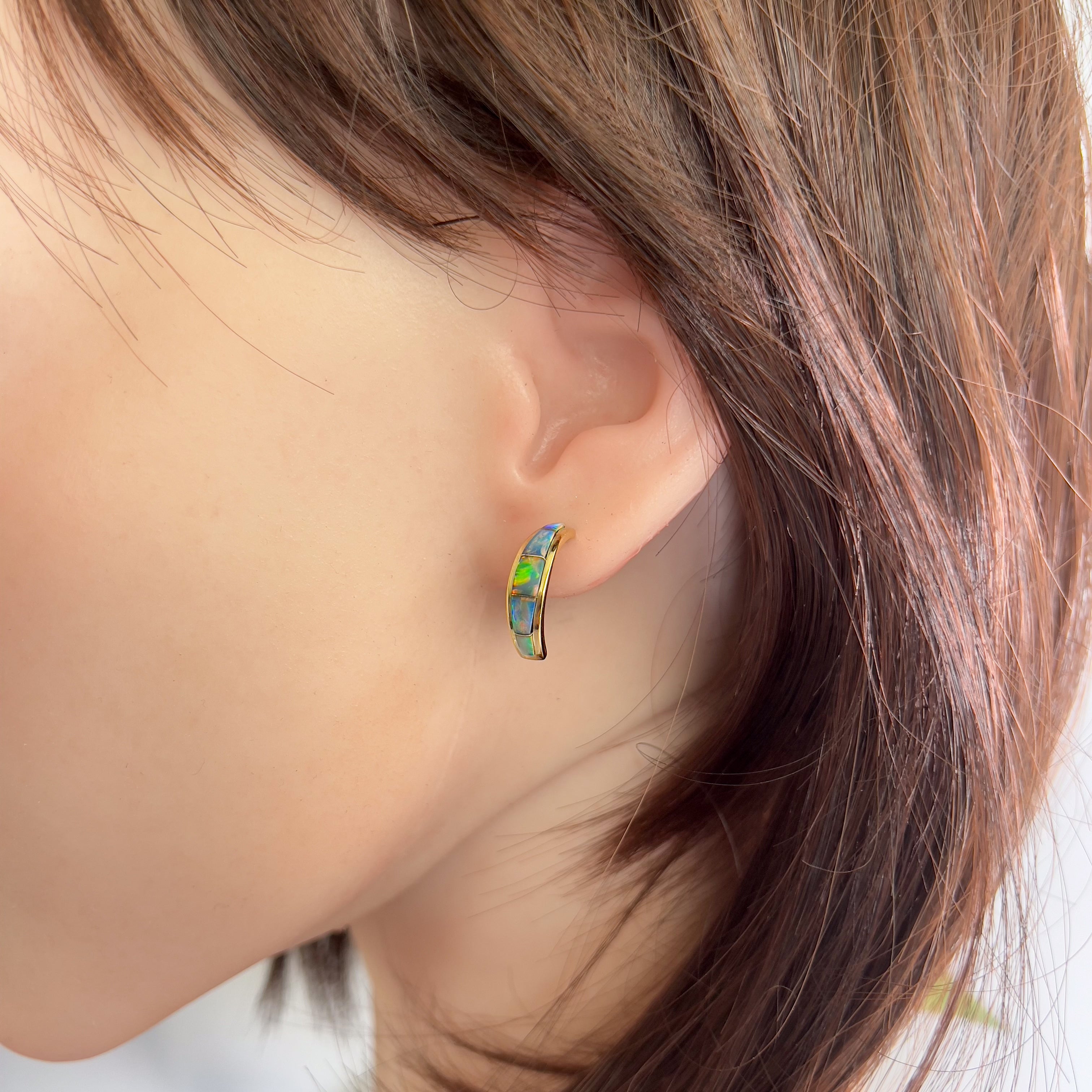 Add some playful charm to your look with our 14kt Yellow Gold Opal inlay huggie style earrings. The huggie hoop design adds a fun twist to these elegant earrings, making them perfect for any occasion. Elevate your style with a touch of whimsy!