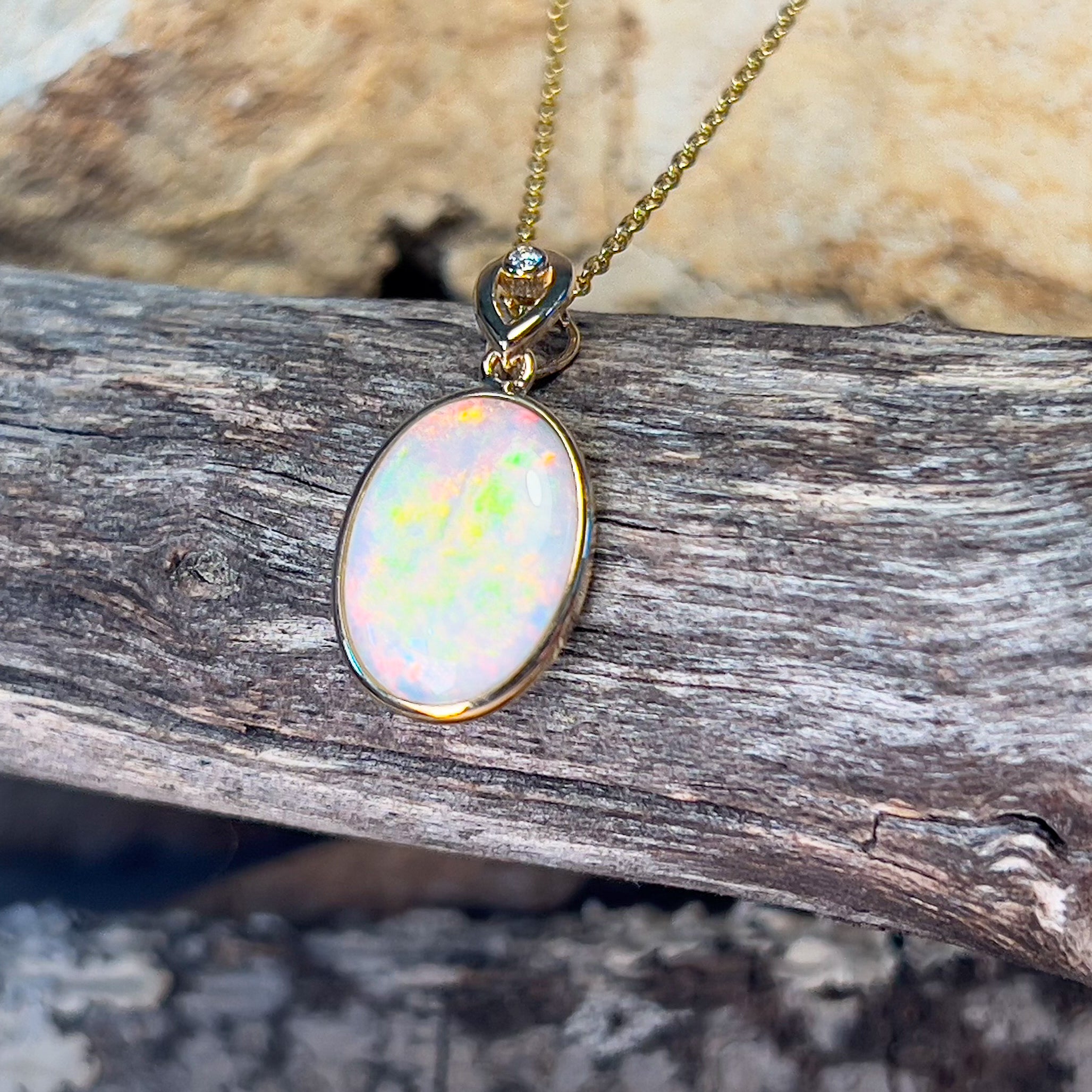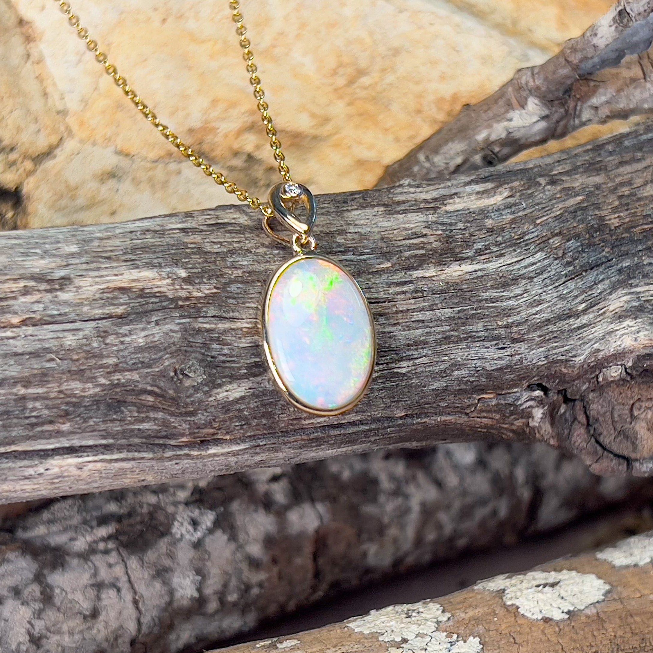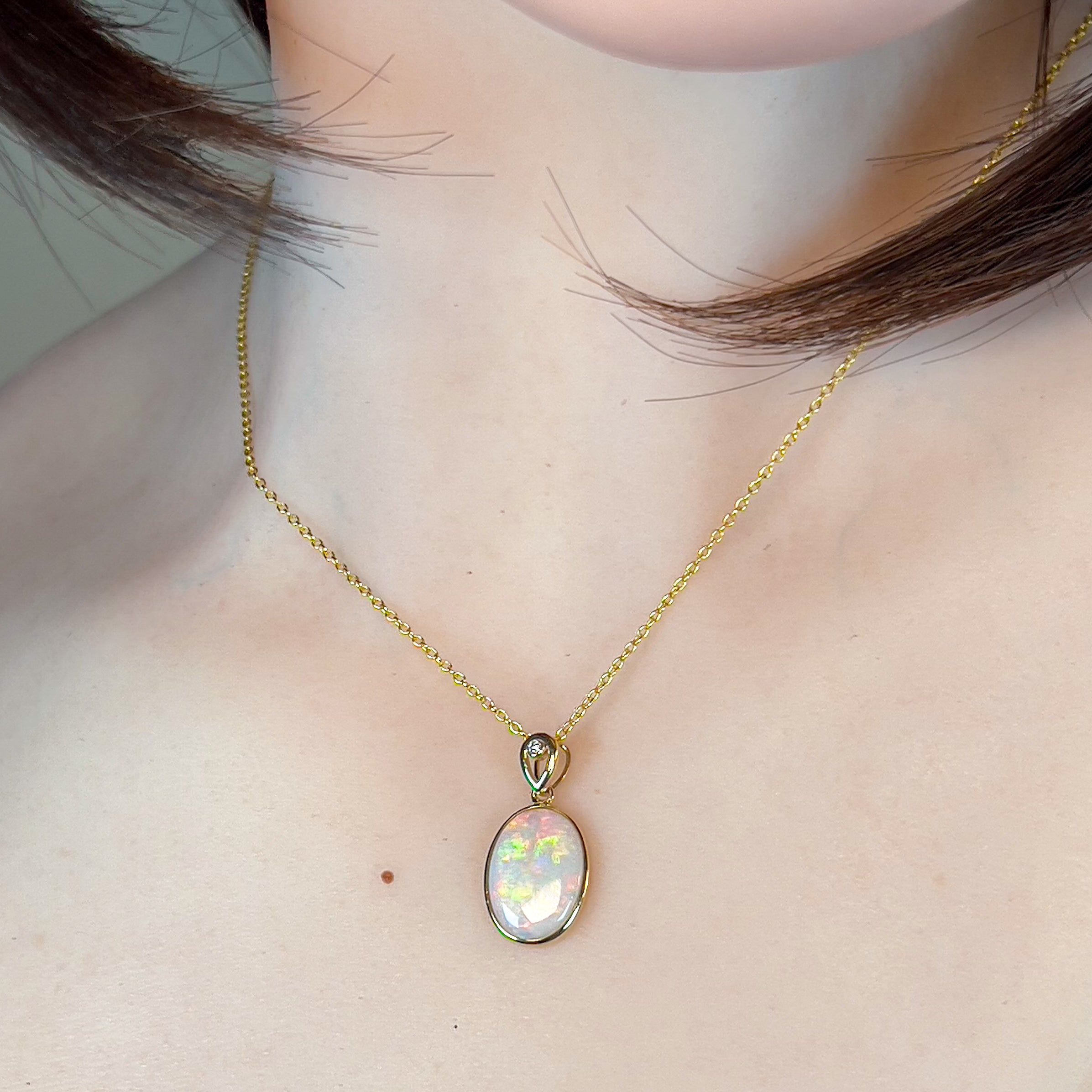 This 14kt yellow gold oval white opal red 2.25ct bezel set pendant is perfect for women who want to add a touch of elegance to their jewelry collection. The white opal stone is bezel set for a secure and stylish look. With its vibrant colors and quality materials, this necklace is a must-have for any fashion-forward individual.