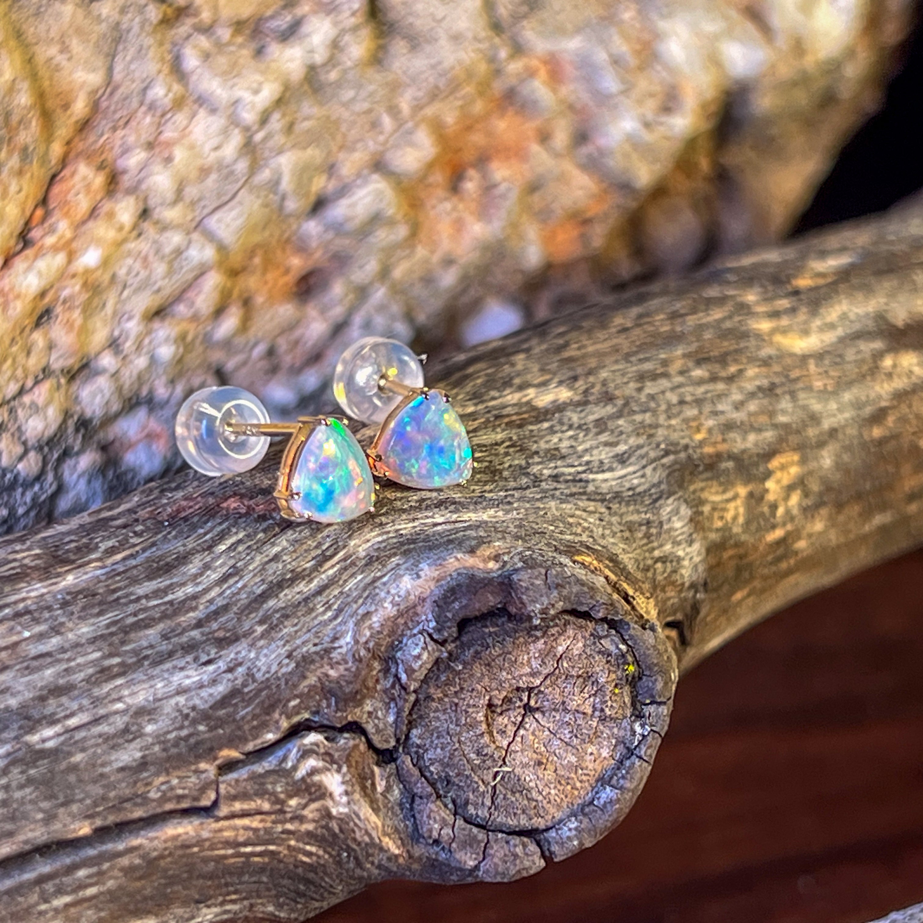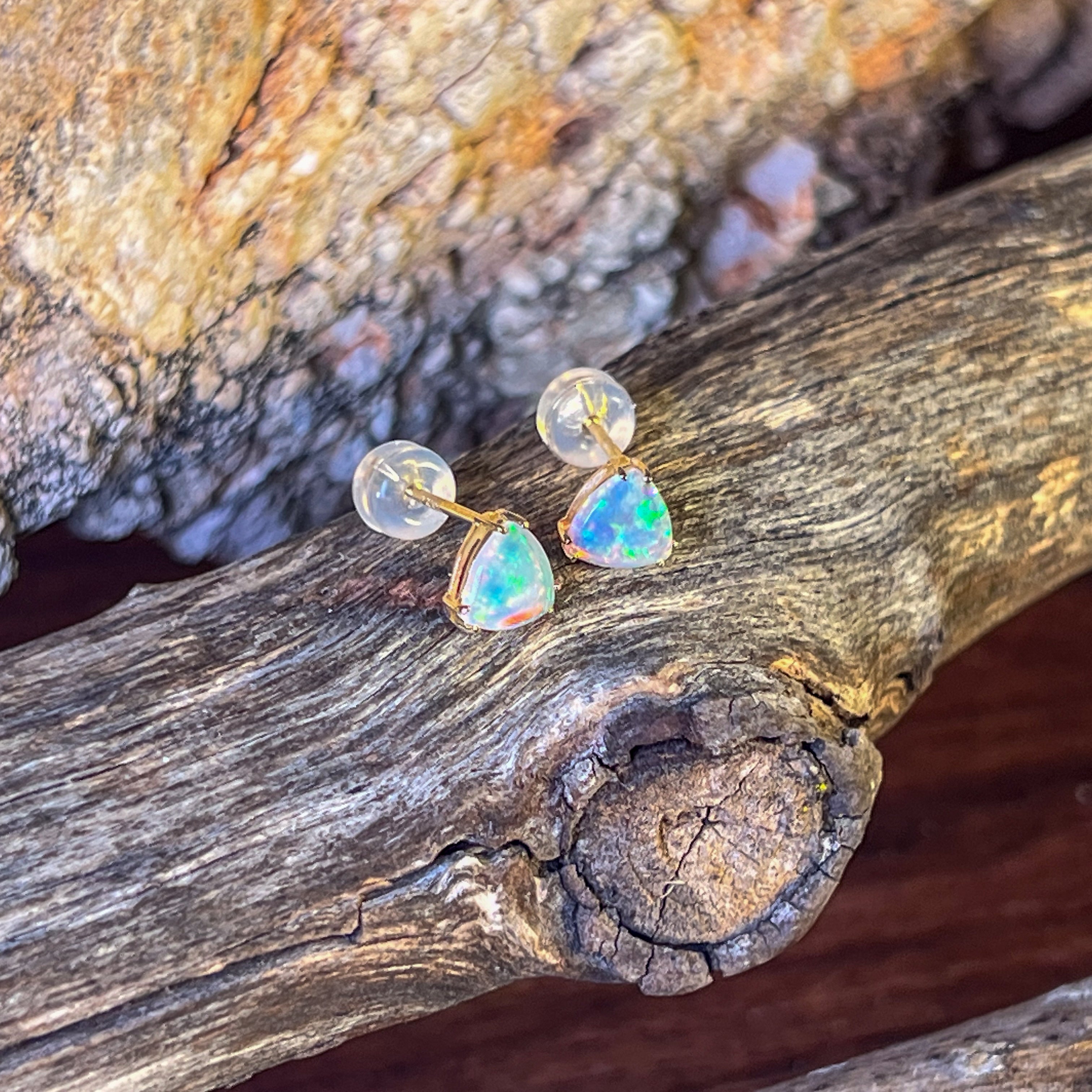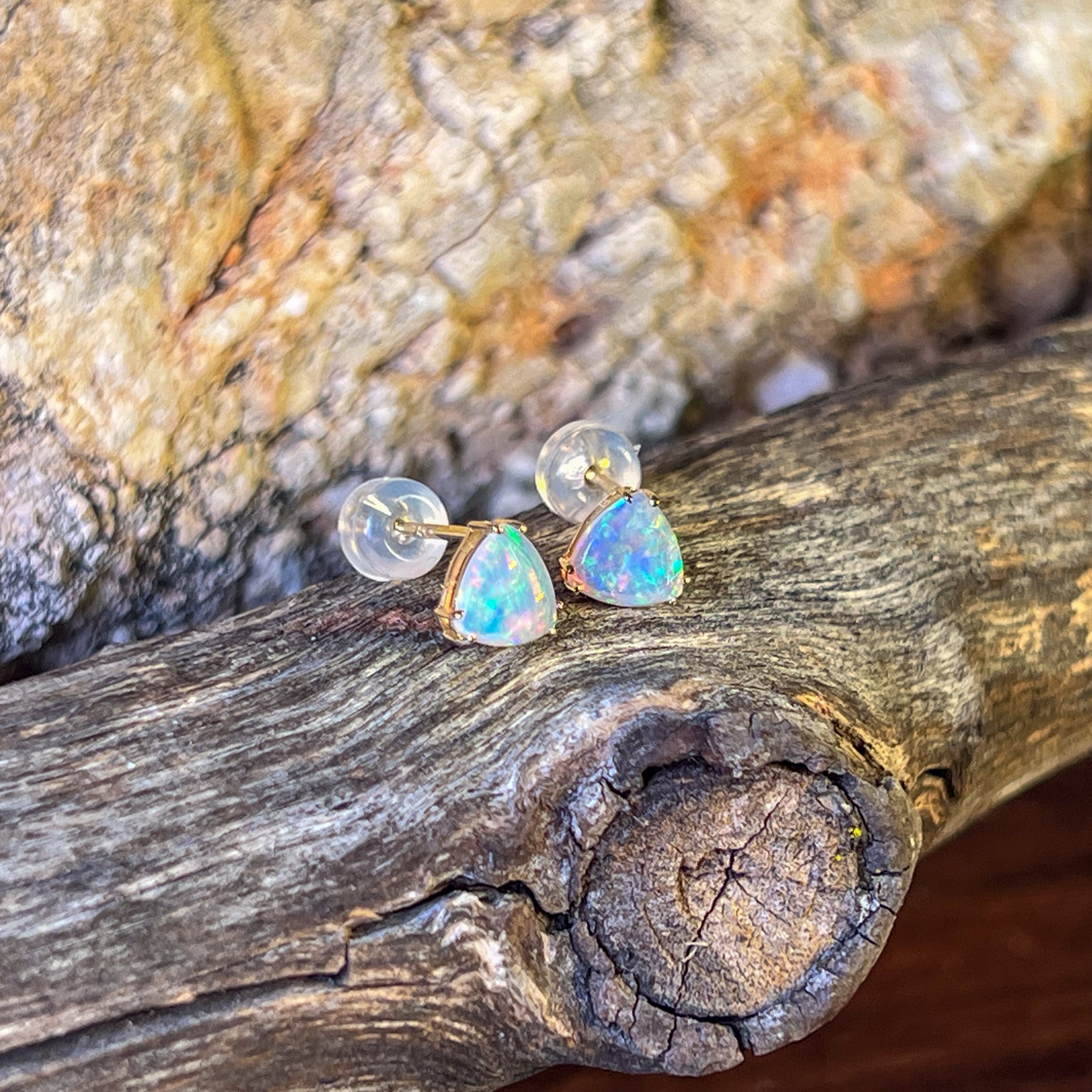 14kt Yellow Gold pair of Trillion cut Crystal Opals 0.83ct studs