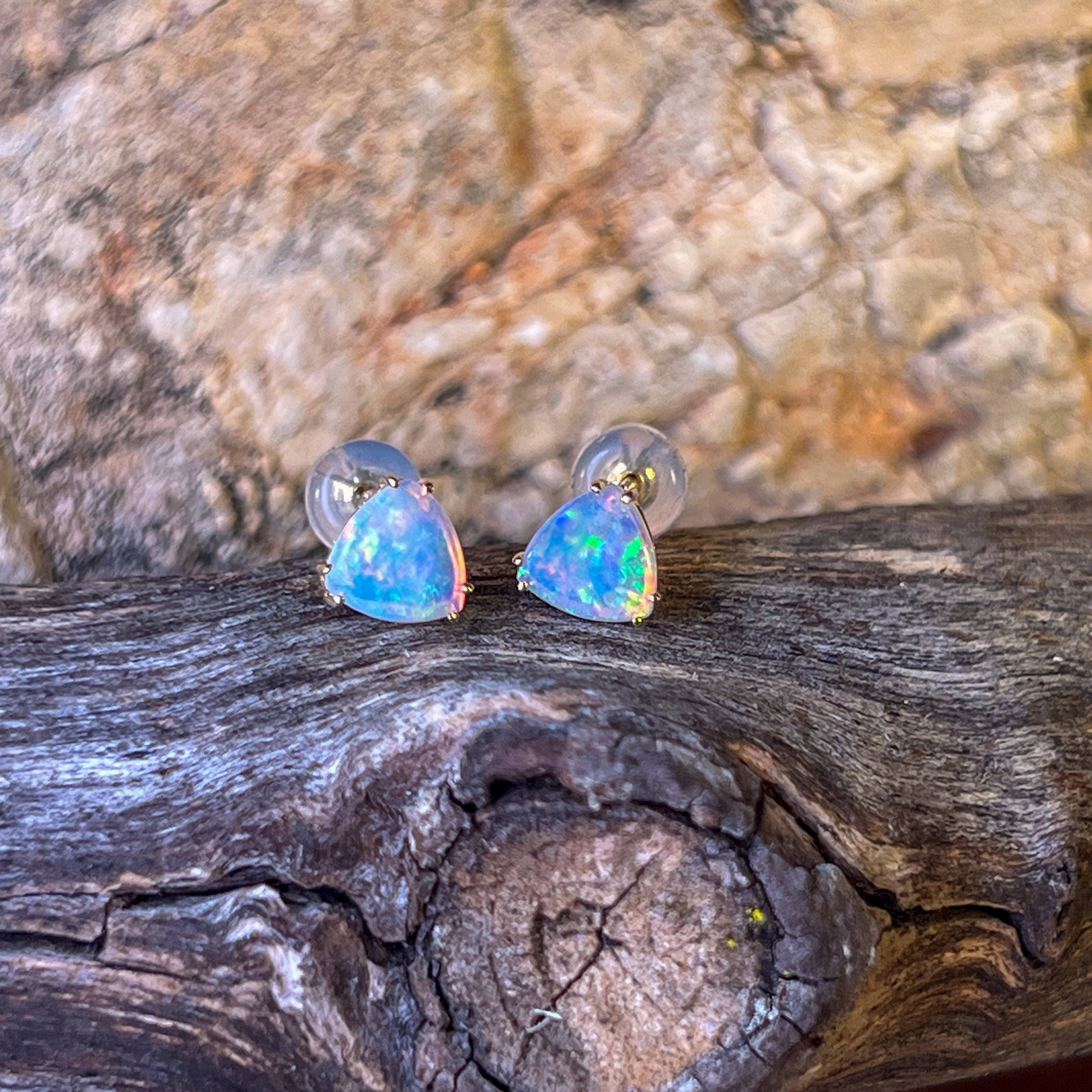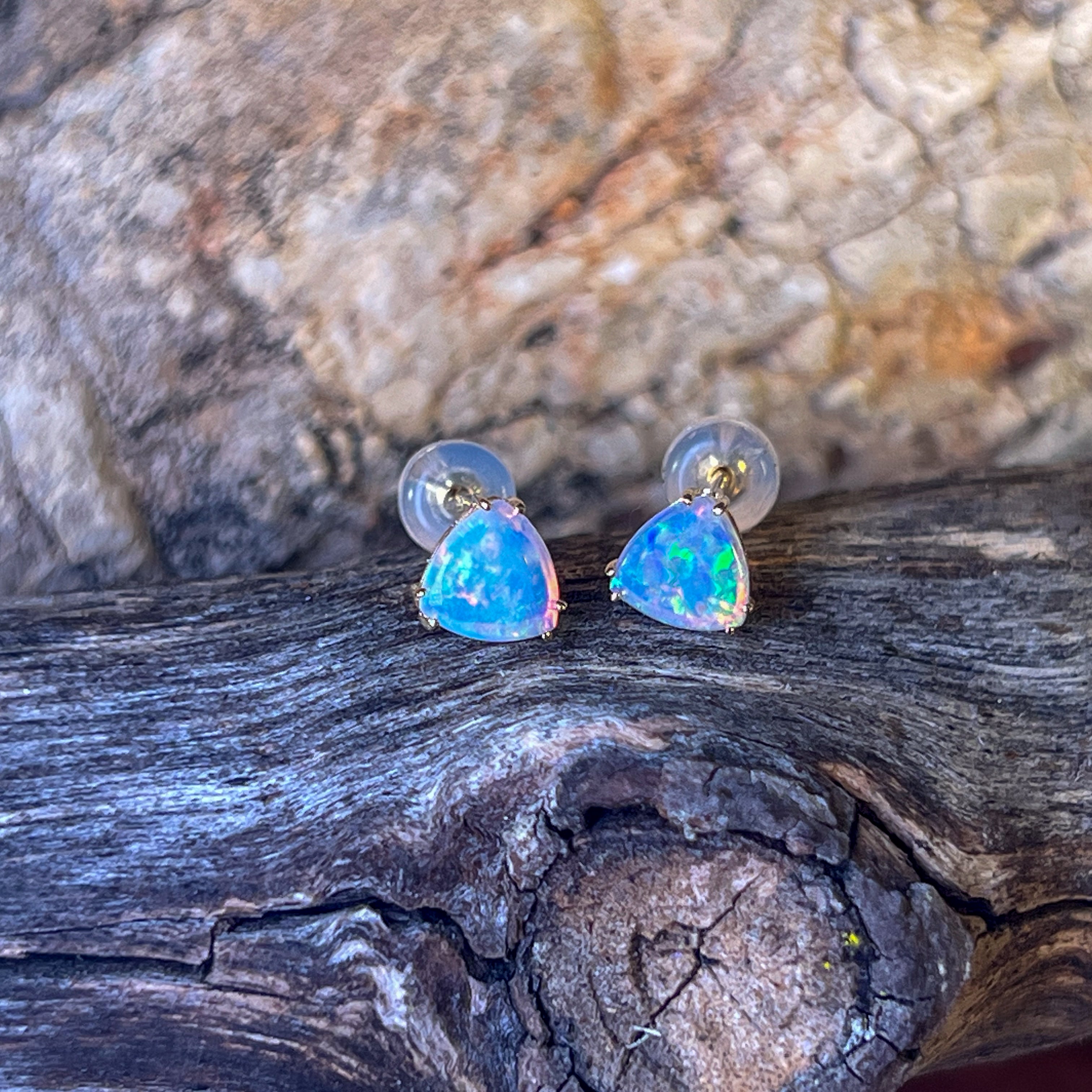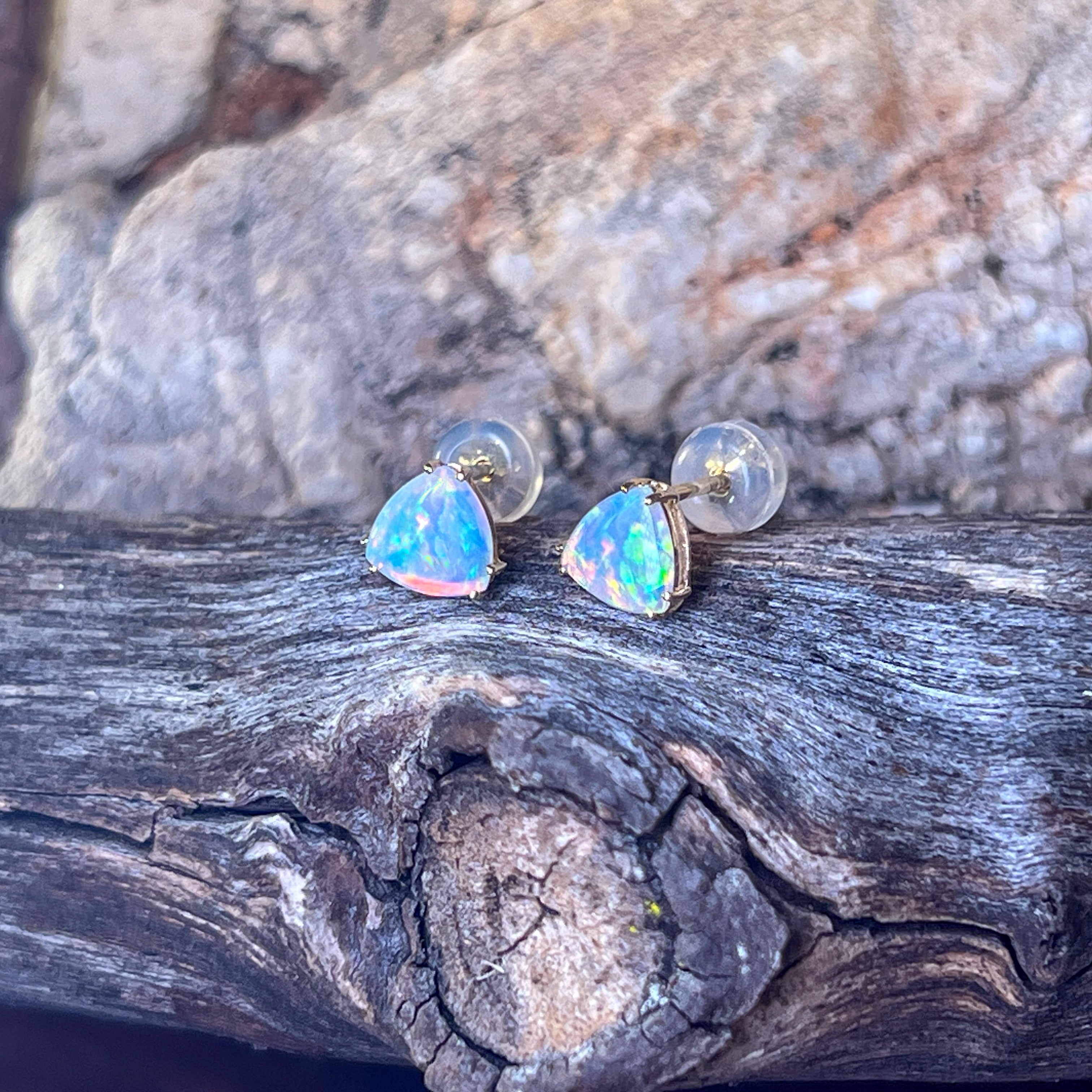 One pair of 14kt Yellow gold Opal Triangle cut shape claw studs
